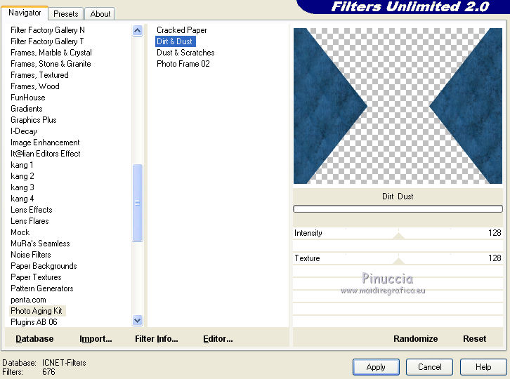 Effetti>Plugins>Filters Unlimited 2.0 - Photo Aging Kit - Dirt &Dust, con i settaggi standard.