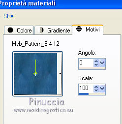 Passa il colore di primo piano a Motivi, e seleziona il motivo Msb_Pattern_9-4-12, con i seguenti settaggi.