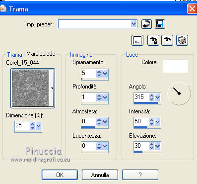 Effetti>Effetti di trama>Trama - seleziona la trama Marciapiede (Corel_15_044), con i seguenti settaggi.