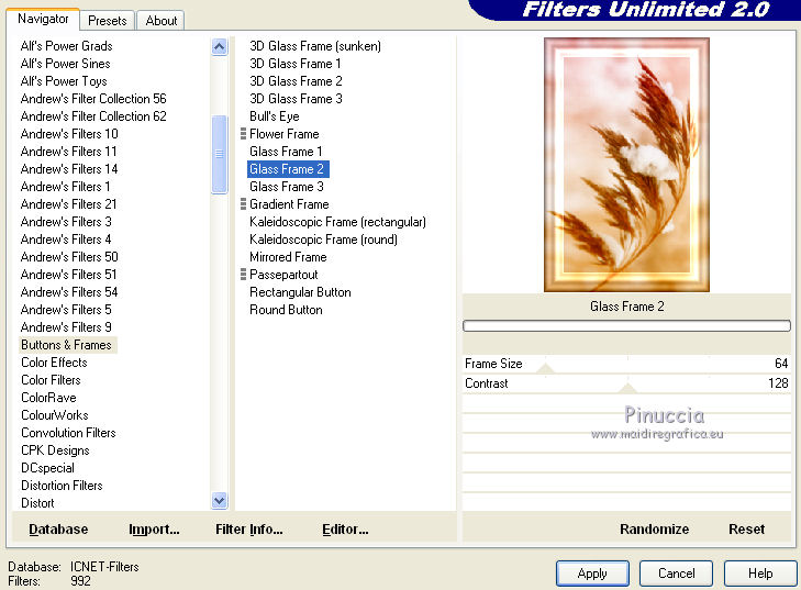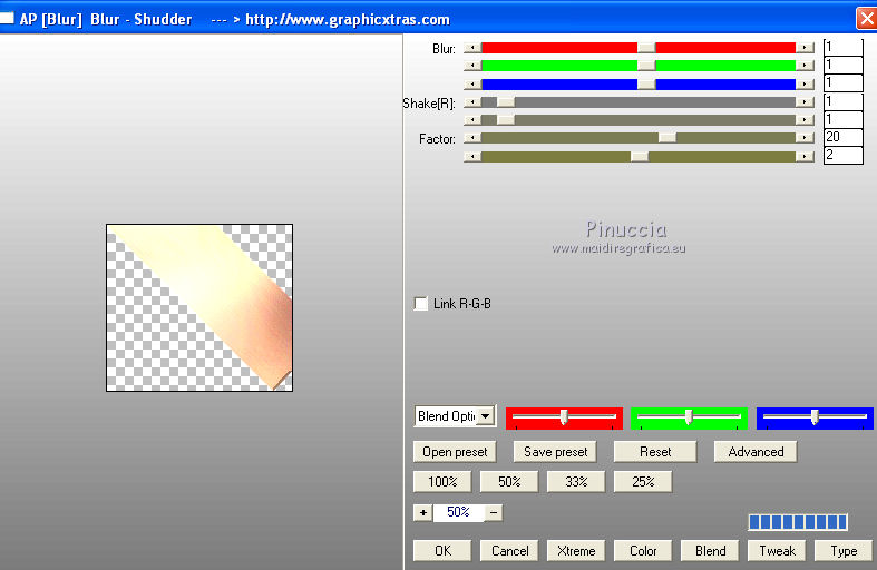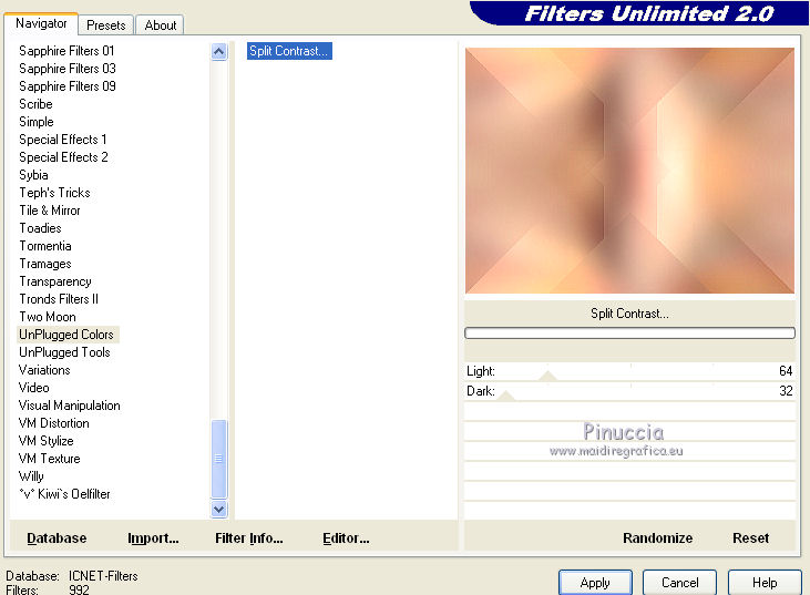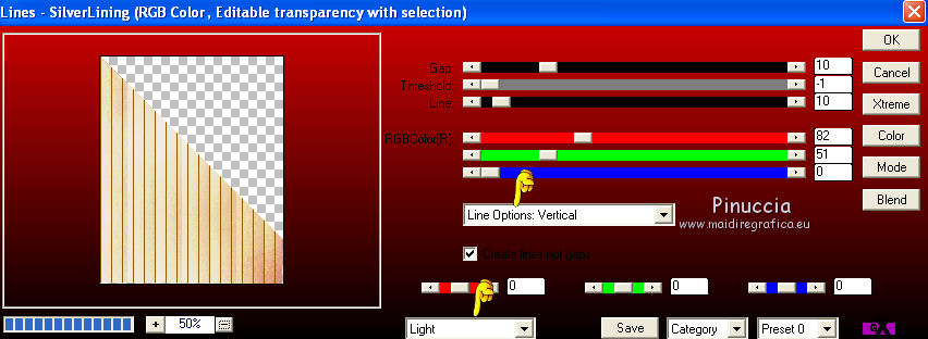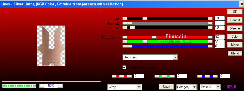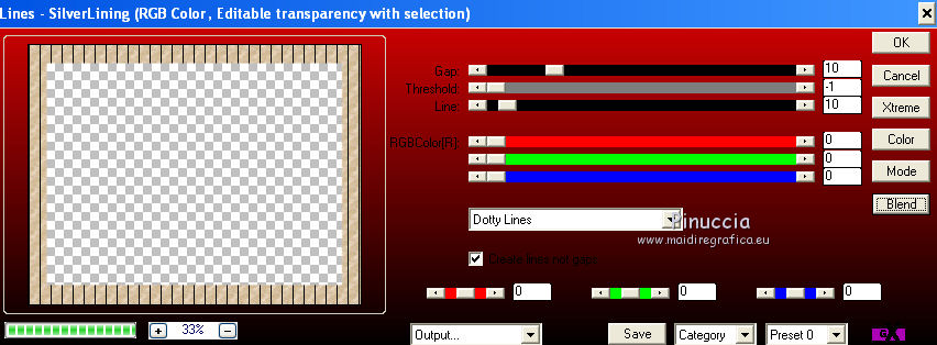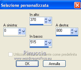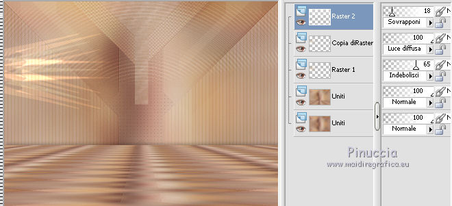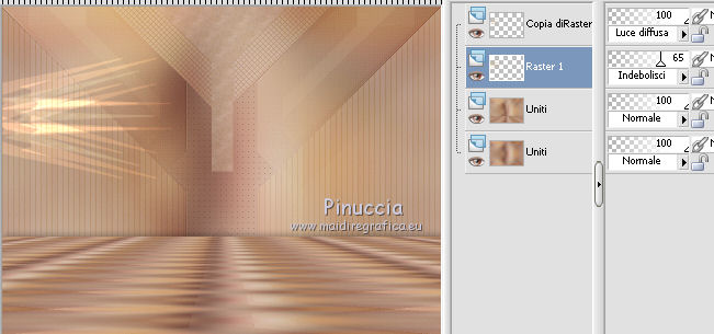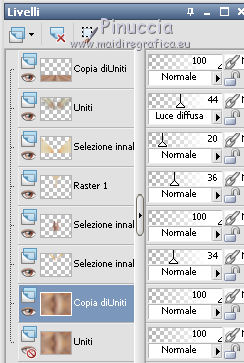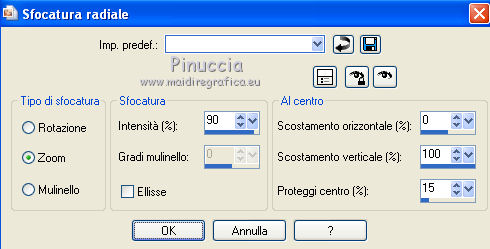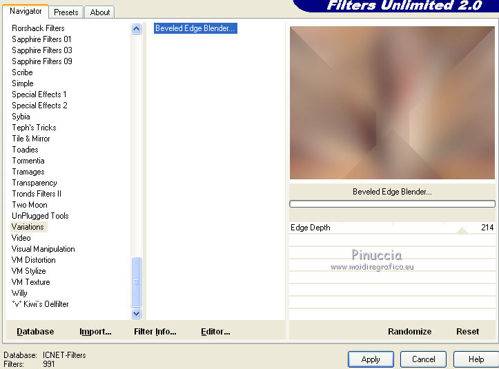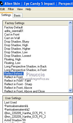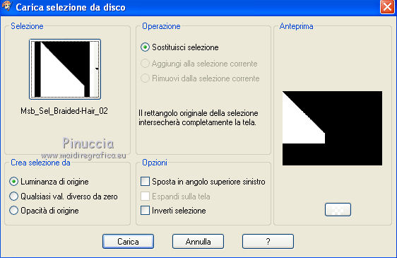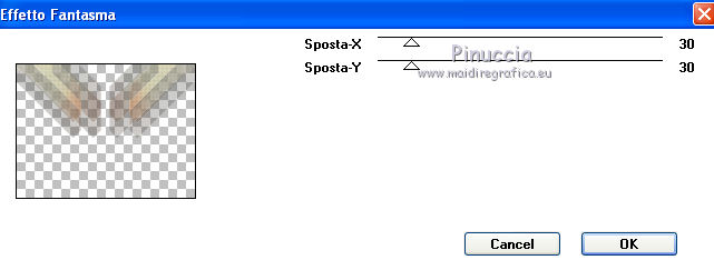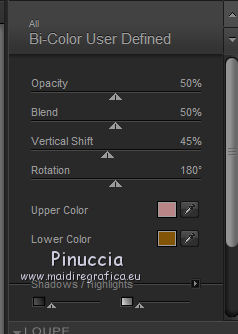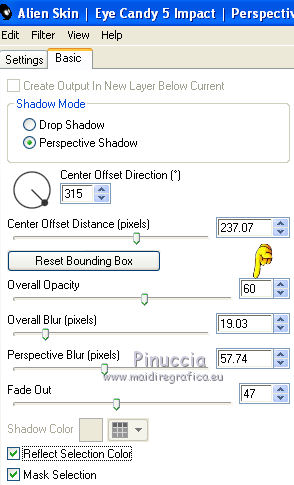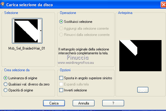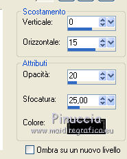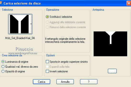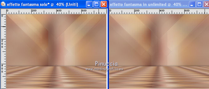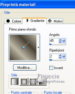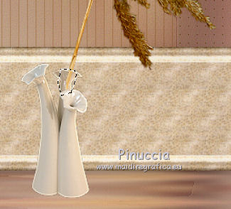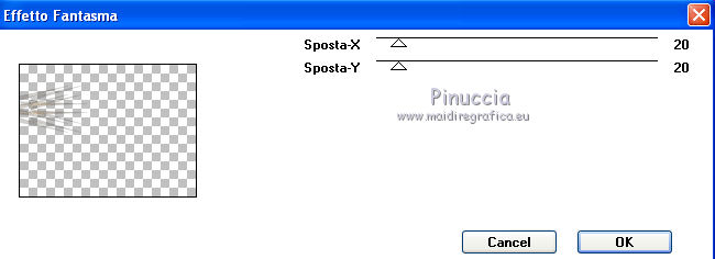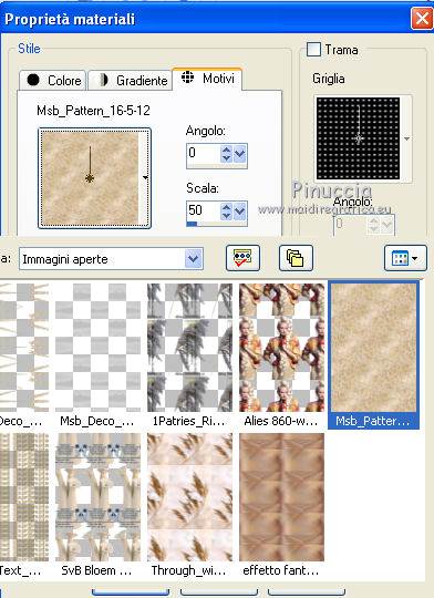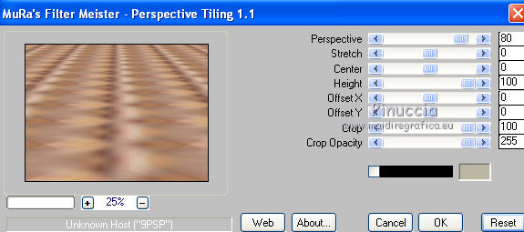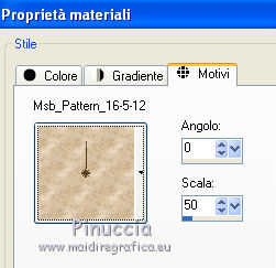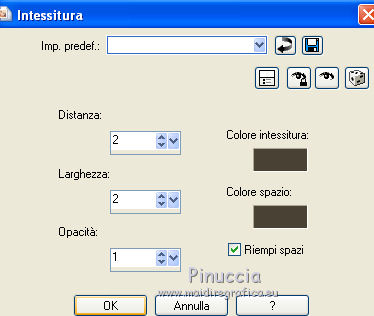 qui puoi trovare qualche risposta ai tuoi dubbi. Se l'argomento che ti interessa non è presente, ti prego di segnalarmelo. Per tradurre questo tutorial ho usato PSP X. Questo tutorial è una creazione ©Meetjesplekje e non può essere copiato su altri siti nè essere offerto per il download. Lo stesso vale per la mia traduzione. Il materiale viene da vari gruppi di condivisione. Il copyright appartiene ai rispettivi autori. Grazie ai creatori dei tubes che mettono a disposizione il loro lavoro in vari gruppi di condivisione. Occorrente: Materiale qui Il tube della donna è di Annelies Il tube della piuma è di Patries Il tube dei vasi è di Syl L'immagine invernale è di Monni. Grazie a tutti gli autori per i loro tubes. Filtri: consulta, se necessario, la mia sezione filtri qui Alien Skin Eye Candy 5 Impact qui Nik Software - Color Efex Pro qui Filters Unlimited 2.0 qui Variations - Beveled Edge Blender (da importare in Unlimited) qui Mura's Meister - Perspective Tiling qui AP [Innovations] - Blur Shudder, Lines SilverLining qui It@lian Editors Effect - Effetto Fantasma qui Unplugged Colors qui ![]() Metti le selezioni nella cartella Selezioni. 1. Imposta il colore di primo piano #4a4135, e il colore di sfondo con #bcb6a4. Passa il colore di primo piano a Gradiente, stile Lineare, con i seguenti settaggi. ![]() Apri una nuova immagine trasparente 800 x 600 pixels, e riempila con il gradiente.Selezione>Seleziona tutto. Livelli>Nuovo livello raster. Apri il tube Alies860-woman-26042012 e vai a Modifica>Copia. non chiuderlo perchè ti servirà ancora. Torna al tuo lavoro e vai a Modifica>Incolla nella selezione. Selezione>Deseleziona. Effetti>Effetti di immagine>Motivo unico, con i settaggi standard. ![]() Regola>Sfocatura>Sfocatura radiale. ![]() Regola>Sfocatura>Sfocatura gaussiana - raggio 30. ![]() Livelli>Unisci>Unisci giù. 2. Livelli>Duplica. Effetti>Plugins>Filters Unlimited 2.0 - Variations - Beveled Edge Blender, con i settaggti standard. ![]() Livelli>Duplica. Immagine>Capovolgi. Abbassa l'opacità di questo livello al 50%. Livelli>Unisci>Unisci giù. Effetti>Effetti di bordo>Aumenta di più. Livelli>Duplica. Effetti>Plugins>Filters Unlimited 2.0 - Unplugged Colors - Split Contrast, con i settaggi standard. ![]() Cambia la modalità di miscelatura di questo livello in Luce diffusa, e abbassa l'opacità al 50%. Livelli>Unisci>Unisci visibile. 3. Livelli>Duplica. Se non visualizzi i Righelli, vai a Visualizza>Righelli. Attiva lo strumento Puntatore ![]() deformazione se stai usando PSP 9,oppure premi sulla tastiera il tasto D (valido per tutte le versioni), e - in modalità Scala - spingi in basso il nodo superiore centrale fino a 400 pixels. ![]() Effetti>Plugins>Mura's Meister - Perspective Tiling, con i settaggi standard. per impostare i settaggi standard clicca su Reset ![]() Attiva nuovamente lo strumento Puntatore ![]() e spingi il nodo superiore centrale in basso, fino a 420 pixels. ![]() Effetti>Effetti 3D>Sfalsa ombra, con il colore nero. ![]() 3. Attiva il livello inferiore. Selezione>Carica/Salva selezione>Carica selezione da disco. Cerca e carica la selezione Msb_Sel_Braided-Hair_01. ![]() Selezione>Innalza selezione a livello. Effetti>Plugins>AP [Blur] - Blur Shudder, con i settaggi standard. ![]() Selezione>Deseleziona. Livelli>Duplica. Immagine>Rifletti. Livelli>Unisci>Unisci giù. Cambia la modalità di miscelatura di questo livello in Luce diffusa, e abbassa l'opacità al 44%. Effetti>Effetti di trama>Intessitura - entrambi i colori impostati con il colore di primo piano. ![]() Livelli>Duplica, e attiva il livello sottostante dell'originale. Inverti i colori nella paletta dei materiali, in modo che il colore scuro passi a colore di sfondo (questo è necessario per l'applicazione del prossimo filtro). ![]() Effetti>Plugins>It@lian Editors Effect - Effetto Fantasma. ![]() in questo caso, usando il filtro in Unlimited si otterrà un risultato differente. Per il risultato dell'esempio finale, occorre usare il filtro da solo ![]() Attiva il livello superiore della copia. Livelli>Unisci>Unisci giù. Inverti nuovamente i colori nella paletta, per riportare il colore scuro a colore di primo piano. ![]() 4. Attiva ancora il livello inferiore. Selezione>Carica/Salva selezione>Carica selezione da disco. Cerca e carica la selezione Msb_Sel_Braided-Hair_02. ![]() Selezione>Innalza selezione a livello. Effetti>Effetti di trama>Veneziana - con il colore di primo piano. ![]() Effetti>Plugins>AP01 [Innovations] - Lines SilverLining. ![]() Selezione>Deseleziona. Livelli>Duplica. Immagine>Rifletti. Livelli>Unisci>Unisci giù. Abbassa l'opacità di questo livello al 20%. 5. Attiva ancora una volta il livello inferiore. Selezione>Carica/Salva selezione>Carica selezione da disco. Cerca e carica la selezione Msb_Sel_Braided-Hair_03. ![]() Selezione>Innalza selezione a livello. Effetti>Plugins>AP01 [Innovations] - Lines SilverLining. ![]() Selezione>Deseleziona. Abbassa l'opacità di questo livello al 34%. 6. Livelli>Nuovo livello raster. Apri il motivo Msb_Pattern_16-5-12 e minimizzalo. Passa il colore di primo piano a Motivi, cerca e seleziona il motivo nella categoria Immagini aperte, con i seguenti settaggi. ![]() Selezione>Carica/Salva selezione>Carica selezione da disco. Cerca e carica la selezione Msb_Sel_Braided-Hair_04. ![]() Riempi la selezione con il motivo.Abbassa l'opacità di questo livello al 36%. Attiva il livello sottostante, e premi sulla tastiera il tasto CANC. Selezione>Deseleziona. 7. Attiva nuovamente il livello di sfondo. Selezione>Carica/Salva selezione>Carica selezione da disco. Cerca e carica la selezione Msb_Sel_Braided-Hair_05. ![]() Selezione>Innalza selezione a livello. Livelli>Disponi>Sposta su. Effetti>Plugins>AP01 [Innovations] - Lines SilverLining. ![]() Selezione>Deseleziona. Ancora attiva il livello inferiore. Livelli>Duplica. Chiudi il livello inferiore rimanendo posizionato sul duplicato. ![]() Livelli>Unisci>Unisci visibile. Riapri il livello infer