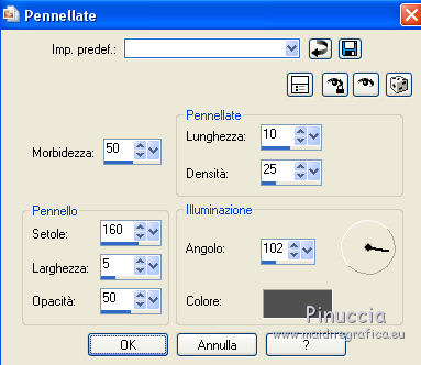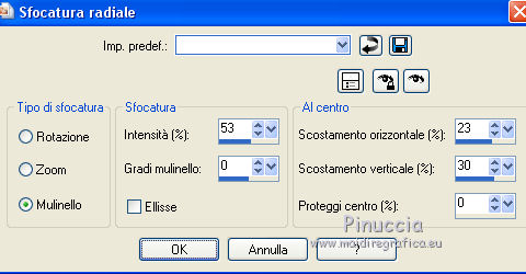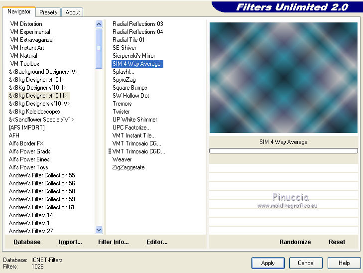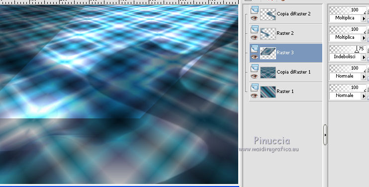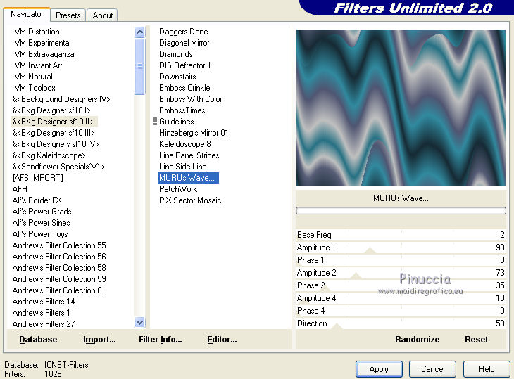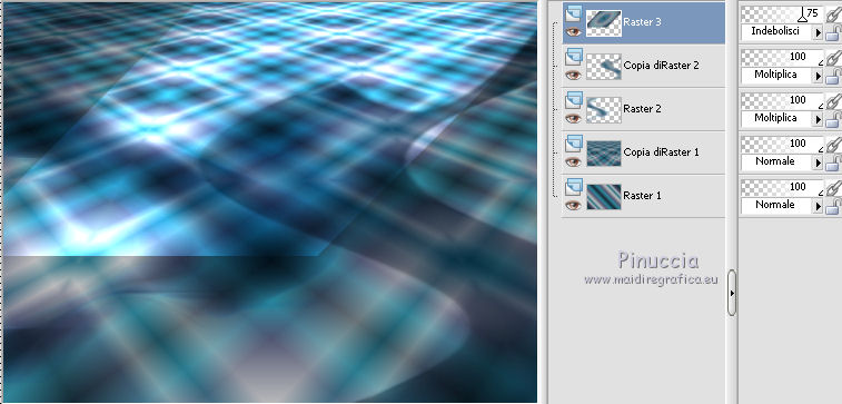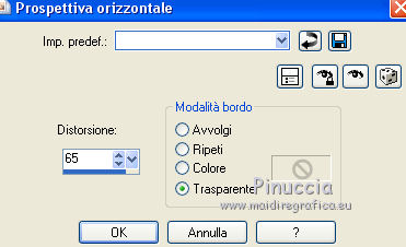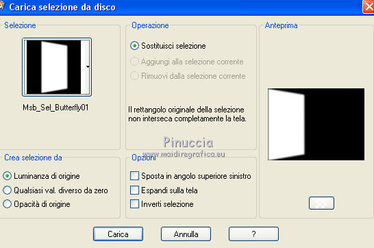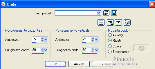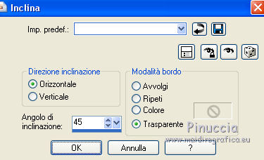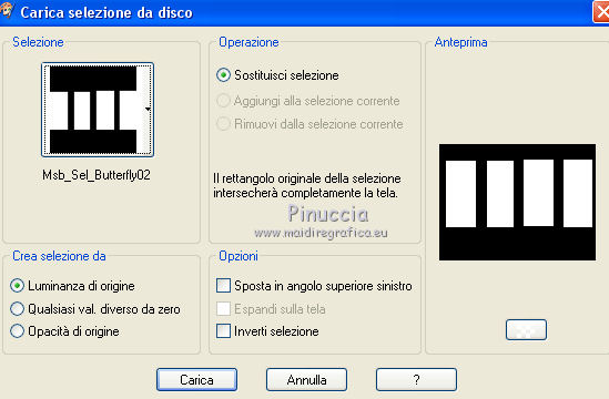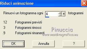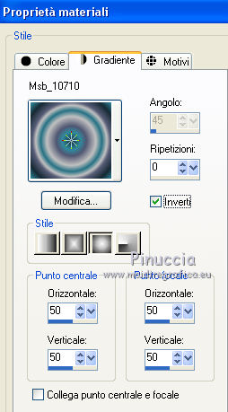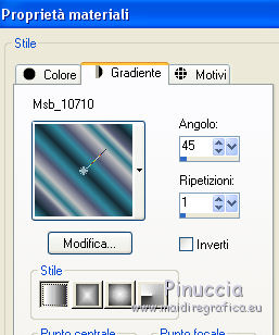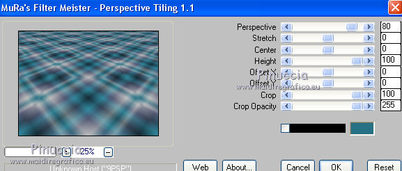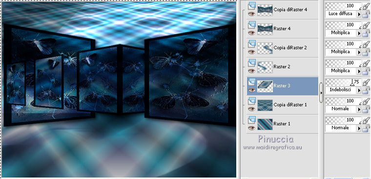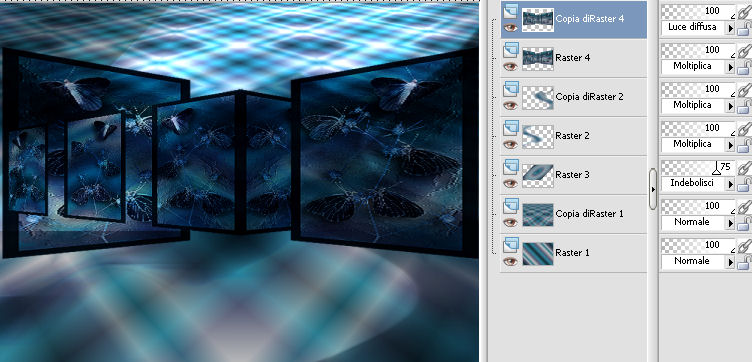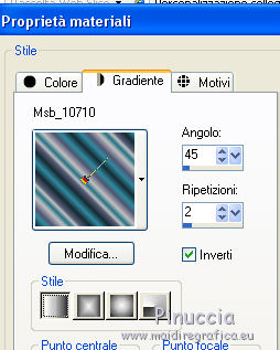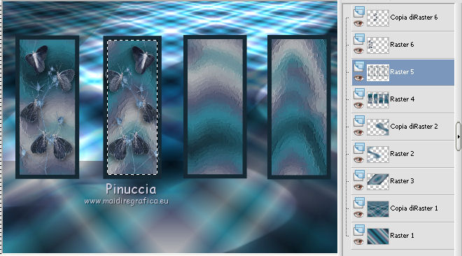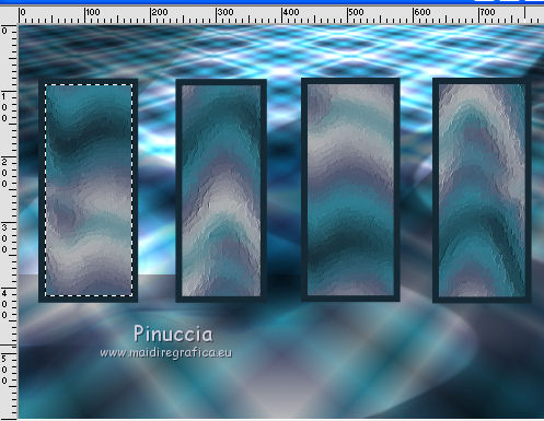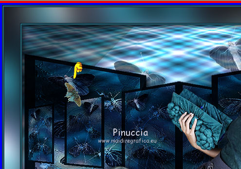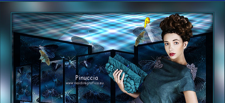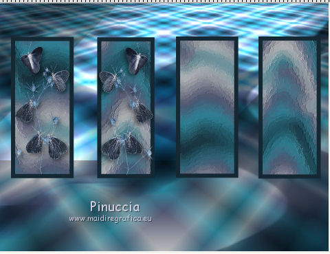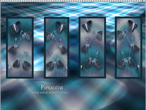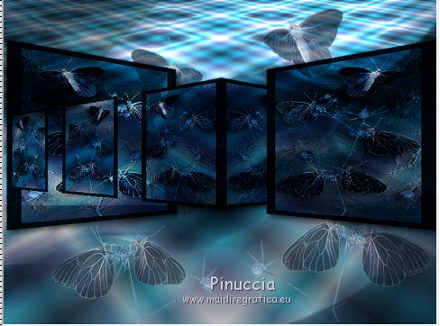qui puoi trovare qualche risposta ai tuoi dubbi. Se l'argomento che ti interessa non è presente, ti prego di segnalarmelo. Questo tutorial è una creazione ©Meetjesplekje e non può essere copiato su altri siti nè essere offerto per il download. Lo stesso vale per la mia traduzione. Il materiale viene da vari gruppi di condivisione. Il copyright appartiene ai rispettivi autori. Grazie ai creatori dei tubes che mettono a disposizione il loro lavoro in vari gruppi di condivisione. Per tradurre questo tutorial ho usato CorelX, ma può essere realizzato anche con le altre versioni di PSP. Dalla versione X4, il comando Immagine>Rifletti è stato sostituito con Immagine>Capovolgi in orizzontale, e il comando Immagine>Capovolgi con Immagine>Capovolgi in verticale. Nelle versioni X5 e X6, le funzioni sono state migliorate rendendo disponibile il menu Oggetti. Vedi la scheda sull'argomento qui Occorrente: Materiale qui Per i tubes donna grazie Maxyran, Senga e Flu. Filtri: consulta, se necessario, la mia sezione filtri qui Filters Unlimited 2.0 qui &<Bkg Designer sf10II> - MURUs Wave (da importare in Unlimited) qui &<Bkg Designer sf10IIU> - SIM 4 Way Average (da importare in Unlimited) qui FM Tile Tools - Blend Emboss qui Mura's Meister - Perspective Tiling qui Animation Shop qui ![]() Se stai usando altri colori puoi sperimentare le modalità di miscelatura e le opacità più adatte ai tuoi colori. Metti il gradiente nella cartella Gradienti. Metti le selezioni nella cartella Selezioni. 1. Imposta il colore di primo piano con #172a34, e il colore di sfondo con #267184. ![]() Passa il colore di primo piano a Gradiente di primo piano/sfondo, stile Lineare. ![]() Apri una nuova immagine trasparente 800 x 600 pixels, e riempila con il gradiente.Livelli>Duplica. Effetti>Plugins>Filters Unlimited 2.0 - &<Bkg Designer sf10II> - MURUs Wave. ![]() Effetti>Effetti di immagine>Motivo unico, con i settaggi standard. ![]() Effetti>Effetti tecniche di disegno>Pennellate - colore #505050. ![]() Effetti>Plugins>FM Tile Tools - Blend Emboss, con i settaggi standard. ![]() Modifica>Copia. Modifica>Incolla come nuova IMMAGINE, e minimizza questa immagine che ti servirà più tardi. Torna al tuo lavoro. Elimina il livello che hai appena copiato e che non ti serve più. 2. Livelli>Duplica. Effetti>Plugins>Filters Unlimited 2.0 - &<Bkg Designer sf10III> - SIM 4 Way Average. ![]() Effetti>Plugins>Mura's Meister - Perspective Tiling. ![]() 3. Livelli>Nuovo livello raster. Selezione>Carica/Salva selezione>Carica selezione da disco. Cerca e carica la selezione Msb_Sel_Butterfly01. ![]() Cambia i settaggi del gradiente in Stile Sprazzo di luce. ![]() Riempi la selezione con il gradiente.Regola>Sfocatura>Sfocatura gaussiana - raggio 40. ![]() Selezione>Deseleziona. Cambia la modalità di miscelatura di questo livello in Moltiplica. Effetti>Effetti di distorsione>Onda. ![]() Livelli>Duplica. Immagine>Rifletti. Immagine>Capovolgi. Attiva il livello sottostante. Effetti>Effetti di distorsione>Vento - da sinistra, intensità 100. ![]() Attiva nuovamente il livello superiore. 4. Livelli>Nuovo livello raster. Riempi il livello con il gradiente.Regola>Sfocatura>Sfocatura radiale. ![]() Immagine>Ridimensiona, al 70%, tutti i livelli non selezionato. Effetti>Effetti geometrici>Inclina. ![]() Effetti>Effetti di immagine>Scostamento. ![]() Cambia la modalità di miscelatura di questo livello in Indebolisci, e abbassa l'opacità al 75%. ![]() Livelli>Disponi>Sposta giù - 2 volte. ![]() Attiva nuovamente il livello superiore. 5. Livelli>Nuovo livello raster. Selezione>Carica/Salva selezione>Carica selezione da disco. Cerca e carica la selezione Msb_Sel_Butterfly02. ![]() Attiva l'immagine che hai minimizzato al punto 1. ![]() Modifica>Copia. Torna al tuo lavoro e vai a Modifica>Incolla nella selezione. Mantieni selezionato. 6. Livelli>Nuovo livello raster. Imposta il colore di primo piano con il colore iniziale, e riempi la selezione con il colore di primo piano.Selezione>Modifica>Contrai - 10 pixels. Premi sulla tastiera il tasto CANC ![]() Selezione>Deseleziona. Attiva lo strumento Bacchetta magica ![]() e clicca al centro della prima cornice a sinistra. ![]() Livelli>Nuovo livello raster. Apri il tube Senga-07-11-08_butterfly_001 e vai a Modifica>Copia. non chiuderlo perchè ti servirà ancora Torna al tuo lavoro e vai a Modifica>Incolla nella selezione. Immagine>Immagine negativa. Se stai usando PSP 9: Regola>Bilanciamento colore>Immagine negativa Selezione>Deseleziona. Effetti>Effetti 3D>Sfalsa ombra, colore nero. ![]() Livelli>Duplica. Immagine>Rifletti. Posiziona il tube nella seconda cornice a sinistra.![]() il riquadro è leggermente più piccolo degli altri. Se vuoi, attiva il livello dei quadri e clicca al centro del quadro per selezionarlo. ![]() Selezione>Inverti. Attiva il livello del duplicato e premi sulla tastiera il tasto CANC. Selezione>Deseleziona Livelli>Unisci>Unisci giù. Livelli>Duplica. Immagine>Rifletti. Sposta le farfalle sulle cornici a destra.![]() Livelli>Unisci>Unisci giù. Livelli>Disponi>Sposta giù. Attiva il livello superiore. Livelli>Unisci>Unisci giù - 2 volte. Effetti>Effetti geometrici>Prospettiva orizzontale. ![]() Livelli>Duplica Immagine>Rifletti. Effetti>Effetti di immagine>Scostamento. ![]() Livelli>Unisci>Unisci giù. Immagine>Ridimensiona, al 110%, tutti i livelli non selezionato. Effetti>Effetti di immagine>Scostamento. ![]() Cambia la modalità di miscelatura di questo livello in Moltiplica. Regola>Messa a fuoco>Metti a fuoco. Livelli>Duplica. Cambia la modalità di miscelatura di questo livello in Luce diffusa. ![]() Effetti>Effetti 3D>Sfalsa ombra, colore nero. ![]() Attiva il livello sottostante. Ripeti Effetti>Effetti 3D>Sfalsa ombra, con i settaggi precedenti. Attiva il terzo livello dal basso. ![]() 7. Attiva nuovamente il tube Senga-07-11-08_butterfly_001, e vai a Modifica>Copia. Torna al tuo lavoro e vai a Modifica>Incolla come nuovo livello. Immagine>Ridimensiona, al 70%, tu