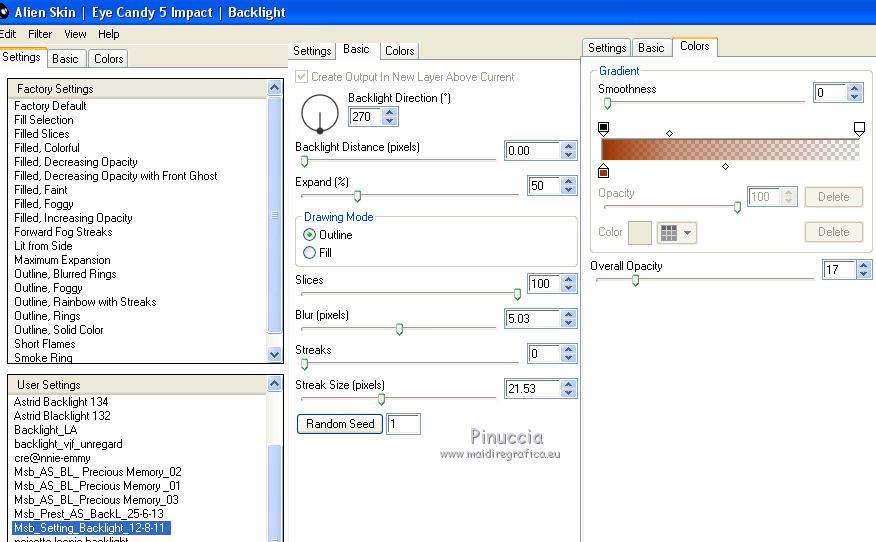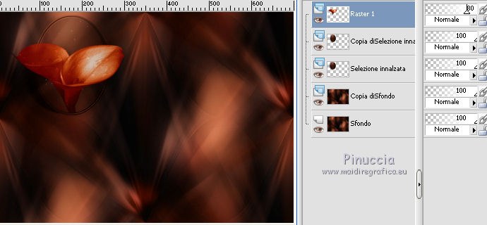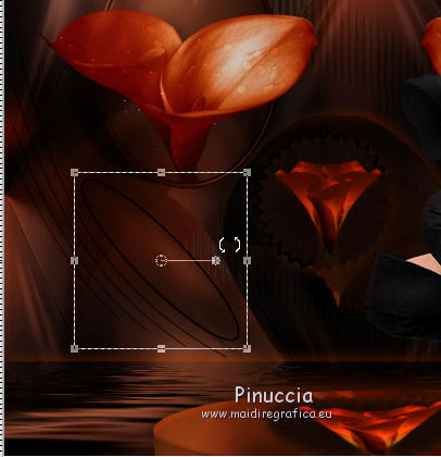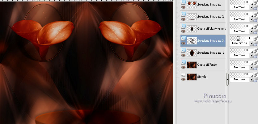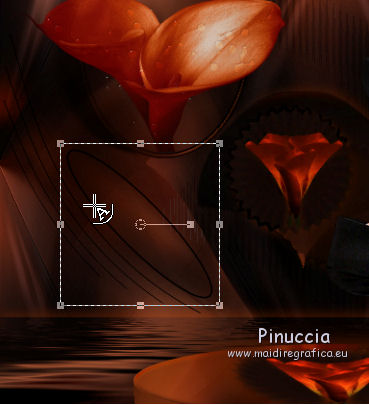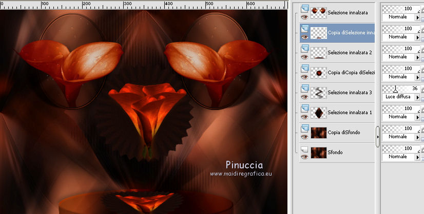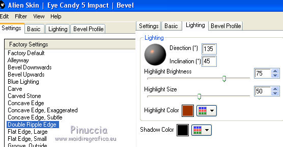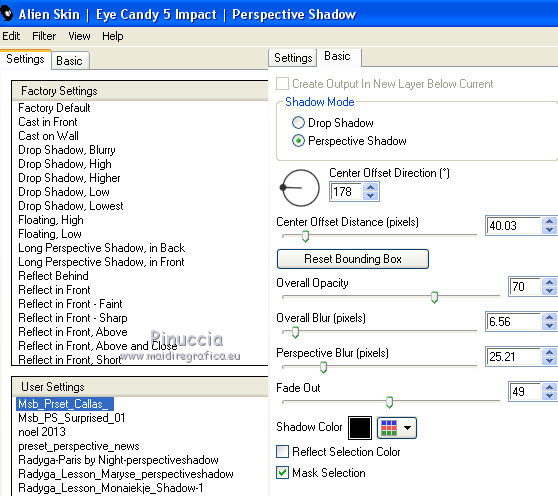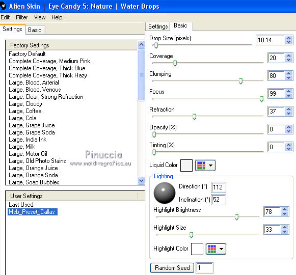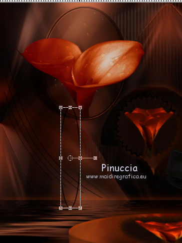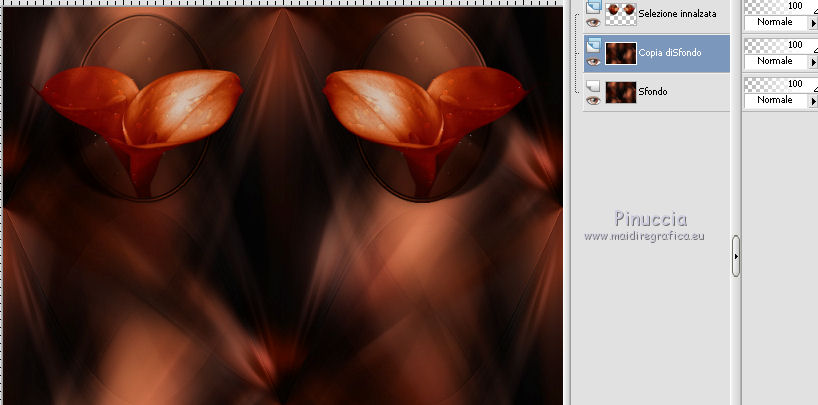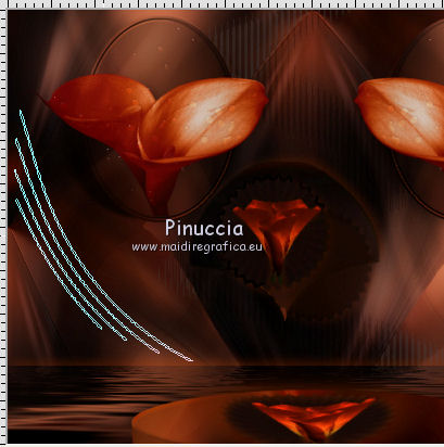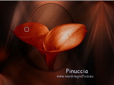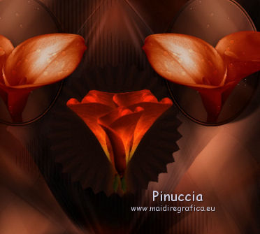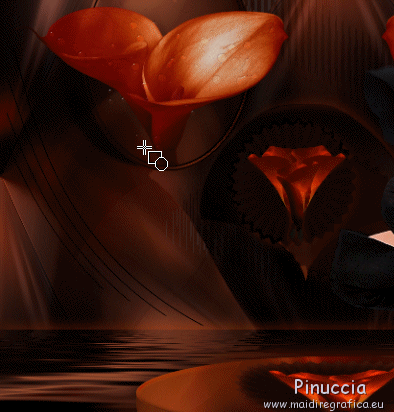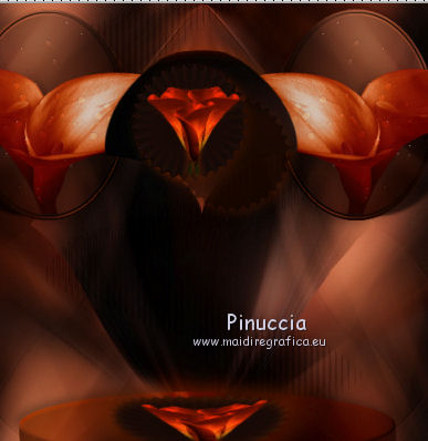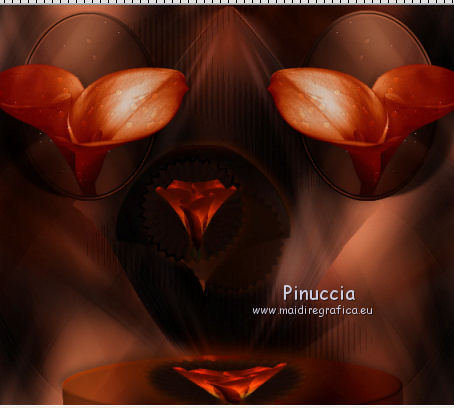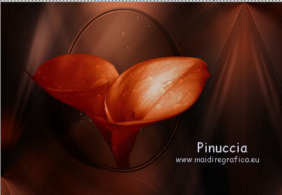 qui puoi trovare qualche risposta ai tuoi dubbi. Se l'argomento che ti interessa non è presente, ti prego di segnalarmelo. Questo tutorial è una creazione ©Meetjesplekje e non può essere copiato su altri siti nè essere offerto per il download. Lo stesso vale per la mia traduzione. Il materiale viene da vari gruppi di condivisione. Il copyright appartiene ai rispettivi autori. Grazie ai creatori dei tubes che mettono a disposizione il loro lavoro in vari gruppi di condivisione. Per tradurre questo tutorial ho usato CorelX, ma può essere realizzato anche con le altre versioni di PSP. Dalla versione X4, il comando Immagine>Rifletti è stato sostituito con Immagine>Capovolgi in orizzontale, e il comando Immagine>Capovolgi con Immagine>Capovolgi in verticale. Nelle versioni X5 e X6, le funzioni sono state migliorate rendendo disponibile il menu Oggetti. Vedi la scheda sull'argomento qui Occorrente: Materiale qui Per i tubes utilizzati grazie Kitty, Guismo e Extrame. Filtri: consulta, se necessario, la mia sezione filtri qui Filters Unlimited 2.0 qui &<Bkg Designer sf10II> - Kaleidoscope 8 (da importare in Unlimited) qui &<Bkg Kaleidoscope; - Flip SideLsf (da importare in Unlimited) qui Alien Skin Eye Candy 5 Impact - Bevel, Perspective Shadow, Extrude, Backlight qui Alien Skin Eye Candy 5 Nature - Water Drops qui Flaming Pear - Flood qui Toadies - Black Shadow qui I filtri Toadies si possono usare da soli o importati in Filters Unlimited (come fare vedi qui) Se un filtro fornito appare con questa icona ![]() Se stai usando altri colori puoi sperimentare le modalità di miscelatura e le opacità più adatte ai tuoi colori. Apri il font e minimizzalo. Lo troverai nella lista dei font disponibili quando ti servirà. Con i nuovi sistemi operativi questo non è più possibile. Per usare un font, occorre copiarlo nella cartella Font di Windows. Metti i preset Cliccando sul file una o due volte (a seconda delle tue impostazioni), automaticamente il preset si installerà nella cartella corretta. perchè uno o due clic vedi qui Metti il pennello nella cartella Pennelli. Attenzione, il pennello è composto da due files che non devono essere separati. Se hai problemi con il pennello, apri il file jpg in PSP ed esportalo come pennello personalizzato. Vedi gli appunti sui pennelli qui Metti le selezioni nella cartella Selezioni. Imposta il colore di primo piano con #000000, e il colore di sfondo con #9e3300. ![]() Passa il colore di primo piano a Gradiente di primo piano/sfondo, stile Sprazzo di luce. ![]() 1. Apri una nuova immagine trasparente 700 x 500 pixels, e riempila con il gradiente.Livelli>Nuovo livello raster. Selezione>Seleziona tutto. Apri il tube kittys-Short-Cuts, e vai a Modifica>Copia. non chiuderlo perchè ti servirà ancora Torna al tuo lavoro e vai a Modifica>Incolla nella selezione. Selezione>Deseleziona. Livelli>Unisci>Unisci tutto. Effetti>Effetti di immagine>Motivo unico, con i settaggi standard. ![]() Regola>Sfocatura>Sfocatura radiale. ![]() Livelli>Duplica. 2. Effetti>Effetti di distorsione>Onda. ![]() Effetti>Plugins>Filters Unlimited 2.0 - &<Bkg Kaleidoscope> - Flip SidesLsf. ![]() Livelli>Duplica. Immagine>Capovolgi. Abbassa l'opacità di questo livello al 50%. Livelli>Unisci>Unisci giù. Cambia la modalità di miscelatura di questo livello in Luce diffusa. Livelli>Unisci>Unisci tutto. Effetti>Effetti di immagine>Motivo unico, con i settaggi standard. ![]() Effetti>Effetti di bordo>Aumenta. Livelli>Duplica. 3. Selezione>Carica/Salva selezione>Carica selezione da disco. Cerca e carica la selezione Msb_Callas_01- ![]() Selezione>Innalza selezione a livello. Effetti>Plugins>Alien Skin – Eyecandy 5 – Impact - Bevel. Settings: Double Ripple Edge, e cambia i colori sotto la linguetta Lightning. Highlight color: colore di sfondo - Shadow colore: nero. ![]() Selezione>Modifica>Contrai - 5 pixels. ![]() Effetti>Plugins>Alien Skin Eye Candy 5 Nature - Water Drop. Seleziona il preset Msb_Preset_Callas e ok. in caso di problemi con il preset, puoi copiare i settaggi che vedi nella schermata. ![]() Selezione>Deseleziona. Livelli>Duplica. Attiva il livello sottostante dell'originale. Effetti>Plugins>Alien Skin Eye Candy 5 – Impact - Perspective Shadow. Seleziona il preset Msb_Preset_Callas e ok. ![]() Attiva il livello soprastante della copia. Effetti>Effetti 3D>Sfalsa ombra, colore nero. ![]() 4. Apri il tube Xtreme-Flower-20_Calla-Heart-01-06-08, e vai a Modifica>Copia. Torna al tuo lavoro e vai a Modifica>Incolla come nuovo livello. Immagine>Ridimensiona, al 45%, tutti i livelli non selezionato. Effetti>Effetti di immagine>Scostamento. ![]() Effetti>Plugins>Alien Skin Eye Candy 5 Nature - Water Drops, con i settaggi precedenti. Effetti>Effetti 3D>Sfalsa ombra, colore nero. ![]() Abbassa l'opacità di questo livello all'80%. ![]() Attiva lo strumento Gomma , dimensione 15,attiva il secondo e il terzo livello dall'alto cancella le tracce del bordo dell'ovale visibili sul fiore. ![]() Quando hai fatto, attiva il livello superiore. Livelli>Unisci>Unisci giù - 2 volte. Livelli>Duplica. Immagine>Rifletti. Livelli>Unisci>Unisci giù. 5. Attiva il secondo livello dal basso. ![]() Selezione>Carica/Salva selezione>Carica selezione da disco. Cerca e carica la selezione Msb_Callas_02. ![]() Selezione>Innalza selezione a livello. Selezione>Deseleziona. Effetti>Effetti di distorsione>Allarga (nelle versioni più recenti di PSP Espansione). ![]() 6. Attiva il secondo livello dal basso. Selezione>Carica/Salva selezione>Carica selezione da disco. Cerca e carica la selezione Msb_Callas_03. ![]() Selezione>Innalza selezione a livello. Livelli>Disponi>Sposta su. Effetti>Plugins>Alien Skin Eye Candy 5 Impact - Extrude. Settings: Large Offset,45 Degrees - Basic: ![]() Effetti>Plugins>Alien Skin Eye Candy 5 Bevel, con i settaggi precedenti. Effetti>Effetti 3D>Sfalsa ombra, colore nero. ![]() Selezione>Deseleziona. Regola>Tonalità e saturazione>Vivacità. ![]() Nelle versioni meno recenti di PSP n
