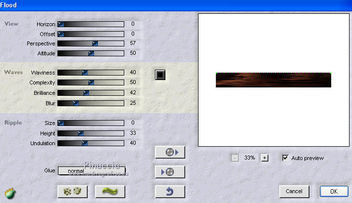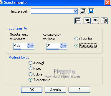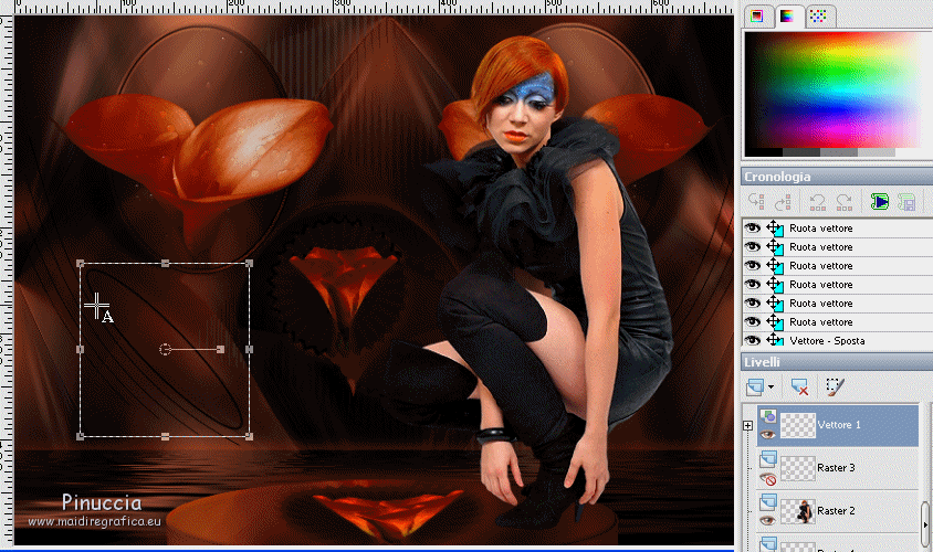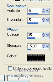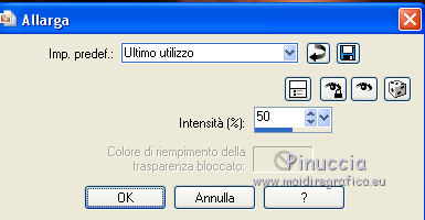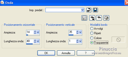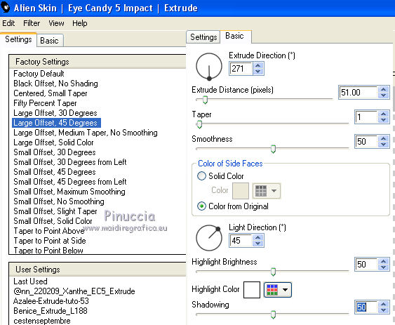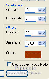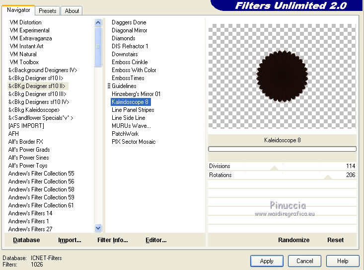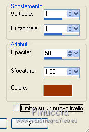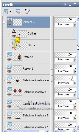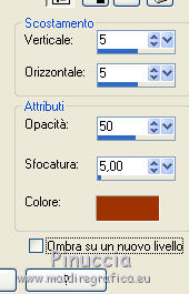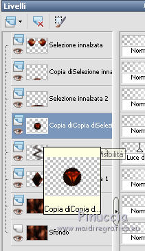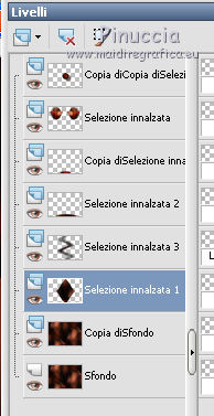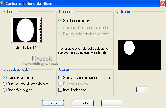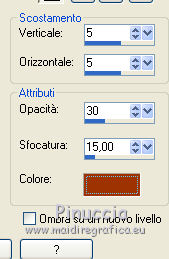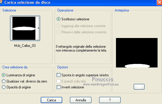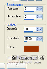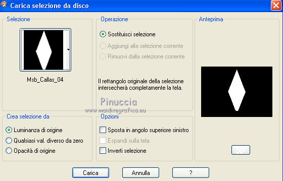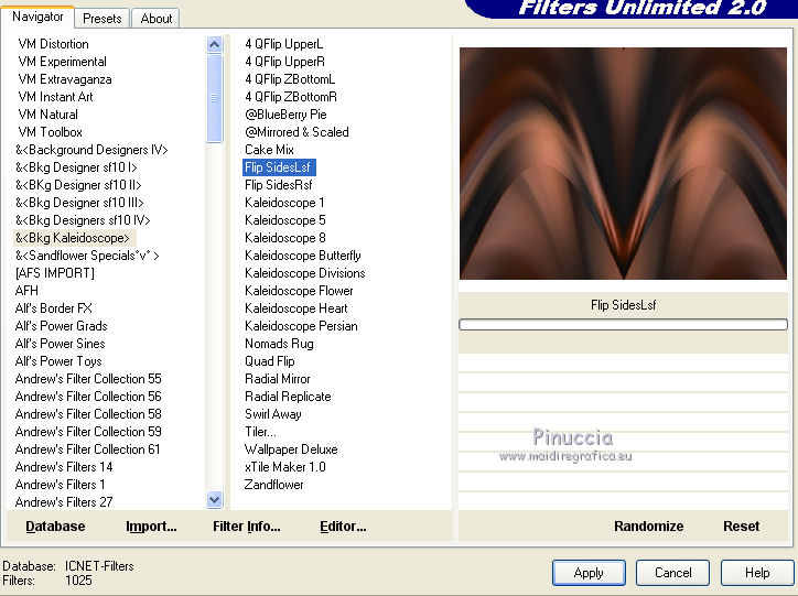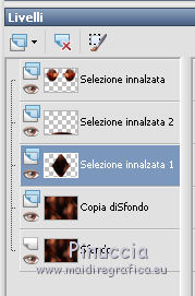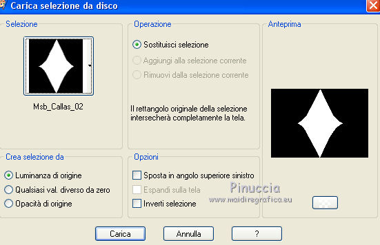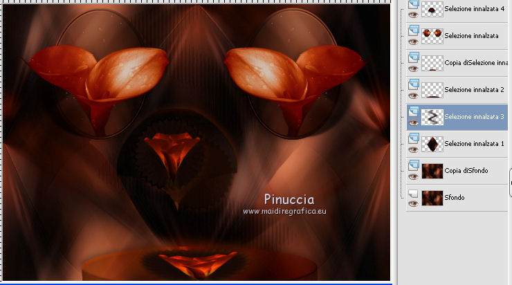 qui puoi trovare qualche risposta ai tuoi dubbi. Se l'argomento che ti interessa non è presente, ti prego di segnalarmelo. Questo tutorial è una creazione ©Meetjesplekje e non può essere copiato su altri siti nè essere offerto per il download. Lo stesso vale per la mia traduzione. Il materiale viene da vari gruppi di condivisione. Il copyright appartiene ai rispettivi autori. Grazie ai creatori dei tubes che mettono a disposizione il loro lavoro in vari gruppi di condivisione. Per tradurre questo tutorial ho usato CorelX, ma può essere realizzato anche con le altre versioni di PSP. Dalla versione X4, il comando Immagine>Rifletti è stato sostituito con Immagine>Capovolgi in orizzontale, e il comando Immagine>Capovolgi con Immagine>Capovolgi in verticale. Nelle versioni X5 e X6, le funzioni sono state migliorate rendendo disponibile il menu Oggetti. Vedi la scheda sull'argomento qui Occorrente: Materiale qui Per i tubes utilizzati grazie Kitty, Guismo e Extrame. Filtri: consulta, se necessario, la mia sezione filtri qui Filters Unlimited 2.0 qui &<Bkg Designer sf10II> - Kaleidoscope 8 (da importare in Unlimited) qui &<Bkg Kaleidoscope; - Flip SideLsf (da importare in Unlimited) qui Alien Skin Eye Candy 5 Impact - Bevel, Perspective Shadow, Extrude, Backlight qui Alien Skin Eye Candy 5 Nature - Water Drops qui Flaming Pear - Flood qui Toadies - Black Shadow qui I filtri Toadies si possono usare da soli o importati in Filters Unlimited (come fare vedi qui) Se un filtro fornito appare con questa icona ![]() Se stai usando altri colori puoi sperimentare le modalità di miscelatura e le opacità più adatte ai tuoi colori. Apri il font e minimizzalo. Lo troverai nella lista dei font disponibili quando ti servirà. Con i nuovi sistemi operativi questo non è più possibile. Per usare un font, occorre copiarlo nella cartella Font di Windows. Metti i preset Cliccando sul file una o due volte (a seconda delle tue impostazioni), automaticamente il preset si installerà nella cartella corretta. perchè uno o due clic vedi qui Metti il pennello nella cartella Pennelli. Attenzione, il pennello è composto da due files che non devono essere separati. Se hai problemi con il pennello, apri il file jpg in PSP ed esportalo come pennello personalizzato. Vedi gli appunti sui pennelli qui Metti le selezioni nella cartella Selezioni. Imposta il colore di primo piano con #000000, e il colore di sfondo con #9e3300. ![]() Passa il colore di primo piano a Gradiente di primo piano/sfondo, stile Sprazzo di luce. ![]() 1. Apri una nuova immagine trasparente 700 x 500 pixels, e riempila con il gradiente.Livelli>Nuovo livello raster. Selezione>Seleziona tutto. Apri il tube kittys-Short-Cuts, e vai a Modifica>Copia. non chiuderlo perchè ti servirà ancora Torna al tuo lavoro e vai a Modifica>Incolla nella selezione. Selezione>Deseleziona. Livelli>Unisci>Unisci tutto. Effetti>Effetti di immagine>Motivo unico, con i settaggi standard. ![]() Regola>Sfocatura>Sfocatura radiale. ![]() Livelli>Duplica. 2. Effetti>Effetti di distorsione>Onda. ![]() Effetti>Plugins>Filters Unlimited 2.0 - &<Bkg Kaleidoscope> - Flip SidesLsf. ![]() Livelli>Duplica. Immagine>Capovolgi. Abbassa l'opacità di questo livello al 50%. Livelli>Unisci>Unisci giù. Cambia la modalità di miscelatura di questo livello in Luce diffusa. Livelli>Unisci>Unisci tutto. Effetti>Effetti di immagine>Motivo unico, con i settaggi standard. ![]() Effetti>Effetti di bordo>Aumenta. Livelli>Duplica. 3. Selezione>Carica/Salva selezione>Carica selezione da disco. Cerca e carica la selezione Msb_Callas_01- ![]() Selezione>Innalza selezione a livello. Effetti>Plugins>Alien Skin – Eyecandy 5 – Impact - Bevel. Settings: Double Ripple Edge, e cambia i colori sotto la linguetta Lightning. Highlight color: colore di sfondo - Shadow colore: nero. ![]() Selezione>Modifica>Contrai - 5 pixels. ![]() Effetti>Plugins>Alien Skin Eye Candy 5 Nature - Water Drop. Seleziona il preset Msb_Preset_Callas e ok. in caso di problemi con il preset, puoi copiare i settaggi che vedi nella schermata. ![]() Selezione>Deseleziona. Livelli>Duplica. Attiva il livello sottostante dell'originale. Effetti>Plugins>Alien Skin Eye Candy 5 – Impact - Perspective Shadow. Seleziona il preset Msb_Preset_Callas e ok. ![]() Attiva il livello soprastante della copia. Effetti>Effetti 3D>Sfalsa ombra, colore nero. ![]() 4. Apri il tube Xtreme-Flower-20_Calla-Heart-01-06-08, e vai a Modifica>Copia. Torna al tuo lavoro e vai a Modifica>Incolla come nuovo livello. Immagine>Ridimensiona, al 45%, tutti i livelli non selezionato. Effetti>Effetti di immagine>Scostamento. ![]() Effetti>Plugins>Alien Skin Eye Candy 5 Nature - Water Drops, con i settaggi precedenti. Effetti>Effetti 3D>Sfalsa ombra, colore nero. ![]() Abbassa l'opacità di questo livello all'80%. ![]() Attiva lo strumento Gomma , dimensione 15,attiva il secondo e il terzo livello dall'alto cancella le tracce del bordo dell'ovale visibili sul fiore. ![]() Quando hai fatto, attiva il livello superiore. Livelli>Unisci>Unisci giù - 2 volte. Livelli>Duplica. Immagine>Rifletti. Livelli>Unisci>Unisci giù. 5. Attiva il secondo livello dal basso. ![]() Selezione>Carica/Salva selezione>Carica selezione da disco. Cerca e carica la selezione Msb_Callas_02. ![]() Selezione>Innalza selezione a livello. Selezione>Deseleziona. Effetti>Effetti di distorsione>Allarga (nelle versioni più recenti di PSP Espansione). ![]() 6. Attiva il secondo livello dal basso. Selezione>Carica/Salva selezione>Carica selezione da disco. Cerca e carica la selezione Msb_Callas_03. ![]() Selezione>Innalza selezione a livello. Livelli>Disponi>Sposta su. Effetti>Plugins>Alien Skin Eye Candy 5 Impact - Extrude. Settings: Large Offset,45 Degrees - Basic: ![]() Effetti>Plugins>Alien Skin Eye Candy 5 Bevel, con i settaggi precedenti. Effetti>Effetti 3D>Sfalsa ombra, colore nero. ![]() Selezione>Deseleziona. Regola>Tonalità e saturazione>Vivacità. ![]() Nelle versioni meno recenti di PSP n