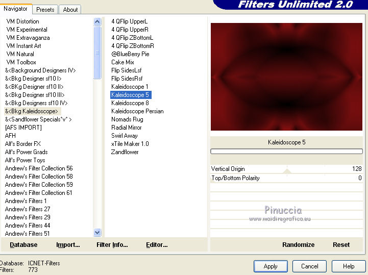 Effetti>Plugins>Filters Unlimited 2.0 - &<Bkg Kaleidoscope> Kaleidoscope 5, con i settaggi standard.