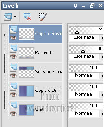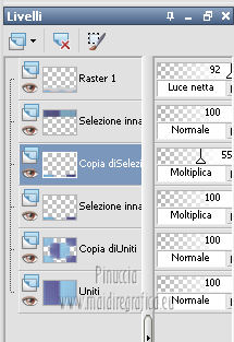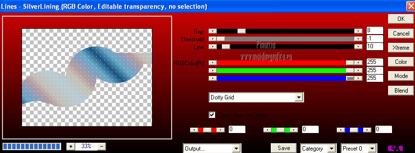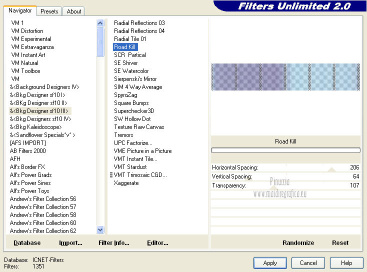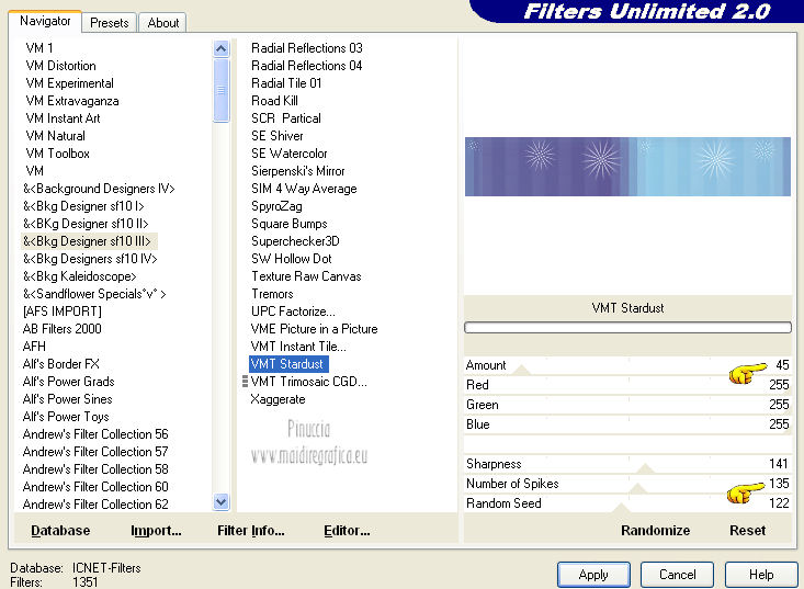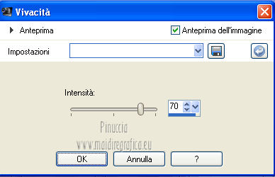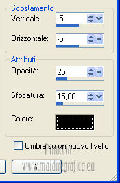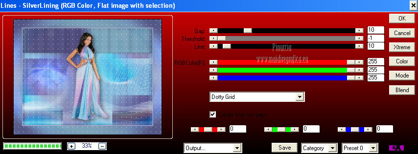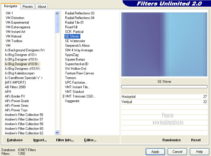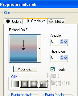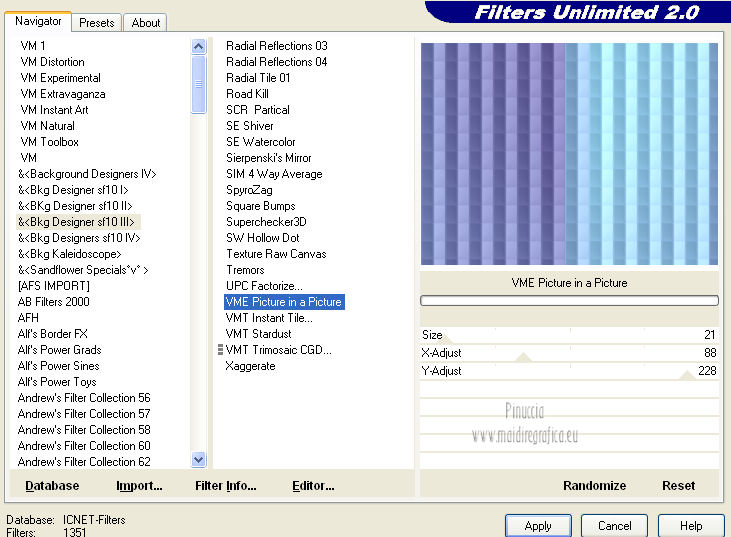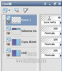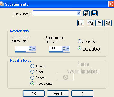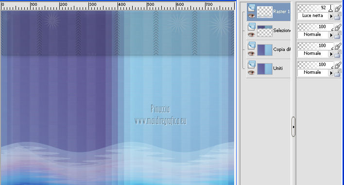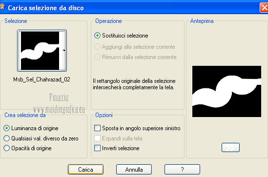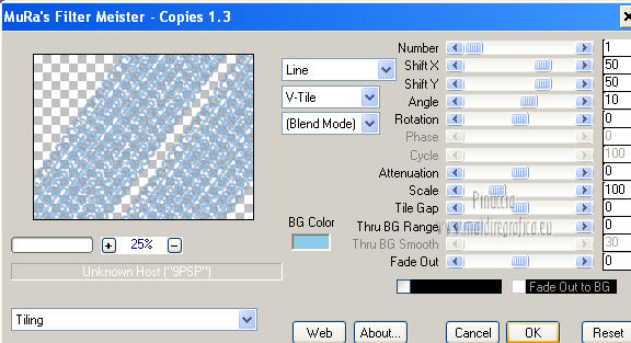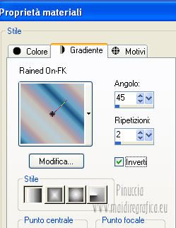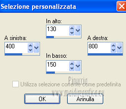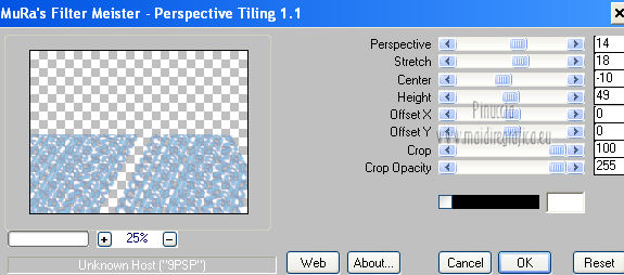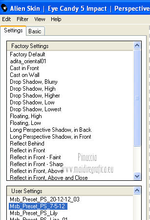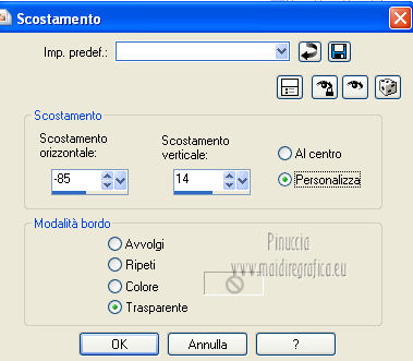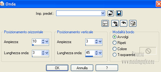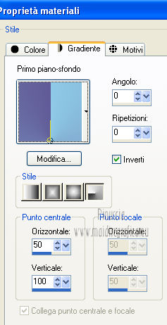 qui puoi trovare qualche risposta ai tuoi dubbi. Se l'argomento che ti interessa non è presente, ti prego di segnalarmelo. Per tradurre questo tutorial ho usato PSP X. Questo tutorial è una creazione ©Meetjesplekje e non può essere copiato su altri siti nè essere offerto per il download. Lo stesso vale per la mia traduzione. Il materiale viene da vari gruppi di condivisione. Il copyright appartiene ai rispettivi autori. Grazie ai creatori dei tubes che mettono a disposizione il loro lavoro in vari gruppi di condivisione. Occorrente: Materiale qui Per il tube della donna grazie Bianca Per il tube dei fiori grazie Luna. Filtri: consulta, se necessario, la mia sezione filtri qui Alien Skin Eye Candy 5 Impact - Perspective Shadow qui Simple - Horizontal Grain qui Filters Unlimited 2.0 qui &<Bkg Designer sf10III> (da importare in Unlimited) qui AP 01 [Innovations] - Lines SilverLining qui Adjust - Variations qui Mura's Meister - Perspective Tiling qui Mura's Meister - Copies qui ![]() Metti il preset nella cartella del filtro Alien Skin Eye Candy 5 Impact>Settings>Shadow. Cliccando sul file una o due volte (a seconda delle tue impostazioni), automaticamente il preset si installerà nella cartella corretta. perchè uno o due clic vedi qui Metti i pennelli nella cartella Pennelli. Attenzione, ogni pennello è composto da due files che non devono essere separati. Vedi gli appunti sui pennelli qui Metti il gradiente nella cartella Gradienti. Metti le selezioni nella cartella Selezioni. 1. Imposta il colore di primo piano #615b98, e il colore di sfondo con #8ecae7. ![]() Passa il colore di primo piano a Gradiente, stile Radiale, con i seguenti settaggi. ![]() Apri una nuova immagine trasparente 800 x 600 pixels, e riempila con il gradiente.Effetti>Plugins>Filters Unlimited 2.0 - &<Bkg Designer sf10 III> - SE Shiver, con i settaggi standard. ![]() Livelli>Duplica. Effetti>Plugins>Filters Unlimited 2.0 - &<Bkg Designer sf10 III>Bkg Designer sf10 III> - VME Picture in a Picture, con i settaggi standard. ![]() Effetti>Plugins>Simple – Horizontal Grain. Cambia la modalità di miscelatura di questo livello in Luce diffusa, e abbassa l'opacità al 42%. ![]() Livelli>Unisci>Unisci visibile. Regola>Messa a fuoco>Metti a fuoco. Finestra>Duplica (o, sulla tastiera, premi la combinazione di tasti maiuscola+D), per fare una copia. Minimizza la copia che userai più tardi. Torna al tuo lavoro originale. 2. Livelli>Duplica. Attiva lo strumento Selezione ,clicca sull'icona Selezione personalizzata ![]() e imposta i seguenti settaggi: ![]() Selezione>Innalza selezione a livello. Effetti>Plugins>Filters Unlimited 2.0 – &<Bkg Designer sf10 III>Bkg Designer sf10 III> - Roadkill, con i settaggi standard. ![]() Attiva il livello sottostante. Selezione>Innalza selezione a livello. Effetti>Plugins>Filters Unlimited 2.0 – &<Bkg Designer sf10 III>Bkg Designer sf10 III> - VMT Stardust. ![]() Selezione>Deseleziona. Attiva il livello superiore. Effetti>Effetti 3D>Sfalsa ombra, con il colore nero. ![]() Abbassa l'opacità di questo livello all'84%. Effetti>Effetti 3D>Sfalsa ombra, con il colore nero. ![]() Livelli>Unisci>Unisci giù. 2. I colori della tua paletta sono sempre: primo piano #615b98 - sfondo #8ecae7. ![]() Passa il colore di primo piano a Gradiente, e seleziona il gradiente Rained on-FK con i seguenti settaggi. ![]() Livelli>Nuovo livello raster. Selezione personalizzata ![]() ![]() Riempi la selezione con il gradiente.Selezione>Deseleziona. Effetti>Effetti di distorsione>Onda. ![]() Effetti>Effetti di immagine>Scostamento. ![]() Cambia la modalità di miscelatura di questo livello in Luce netta, e abbassa l'opacità al 40%. ![]() Livelli>Duplica. Effetti>Effetti geometrici>Sfera. ![]() Lascia la modalità di miscelatura di questo livello in Luce netta, ma abbassa l'opacità al 24%. ![]() Livelli>Unisci>Unisci giù. Lascia la modalità di miscelatura di questo livello in Luce netta, ma porta l'opacità al 60%. ![]() Livelli>Duplica. Effetti>Effetti di immagine>Scostamento. ![]() Effetti>Effetti di distorsione>Onda, con i settaggi precedenti. Effetti>Effetti di immagine>Scostamento. ![]() Livelli>Unisci>Unisci giù. Lascia la modalità di miscelatura di questo livello in Luce netta, ma porta l'opacità al 92%. ![]() 4. Attiva il secondo livello dal basso. ![]() Immagine>Ridimensiona, al 62%, tutti i livelli non selezionato. Effetti>Effetti di immagine>Motivo unico, con i settaggi standard. ![]() 5. Selezione>Carica/Salva selezione>Carica Selezione da disco. Cerca e carica la selezione Msb_Sel_Chahrazad_01. ![]() Selezione>Innalza selezione a livello. Effetti>Plugins>Adjust - Variatons. Clicca su Original, per annullare eventuali precedenti settaggi memorizzati dal filtro. 2 clic su Darker e ok. ![]() Cambia la modalità di miscelatura di questo livello in Moltiplica. Selezione>Deseleziona. Livelli>Duplica. Cambia la modalità di miscelatura di questo livello in Moltiplica, e abbassa l'opacità al 55%. ![]() Livelli>Unisci>Unisci giù. Effetti>Effetti di distorsione>Onda. ![]() 6. La tua paletta è sempre colore di primo piano #615b98. Colore di sfondo #8ecae7. ![]() Cambia i settaggi del gradiente Rained On-FK in stile Lineare: ![]() Livelli>Nuovo livello raster. Selezione>Carica/Salva selezione>Carica selezione da disco. Cerca e carica la selezione Msb_Sel_ Chahrazad_02. ![]() Riempi la selezione con il gradiente.Selezione>Deseleziona. Cambia la modalità di miscelatura di questo livello in Luce diffusa. Effetti>Plugins>AP 01 [Innovations] - Lines SilverLining. ![]() Regola>Tonalità e saturazione>Vivacità ![]() Nelle versioni precedenti di PSP non troverai questo effetto. Puoi sostituirlo con Regola>Luminosità e contrasto>Nitidezza. 7. Apri il tube lunaflores433 e vai a Modifica>Copia. Torna al tuo lavoro e vai a Modifica>Incolla come nuovo livello. Immagine>Ridimensiona, al 40%, tutti i livelli non selezionato. Effetti>Effetti di immagine>Scostamento. ![]() Cambia la modalità di miscelatura di ques