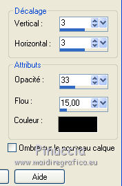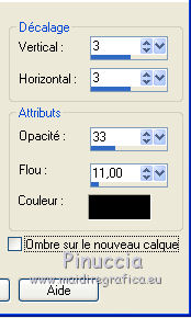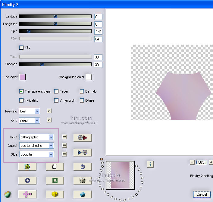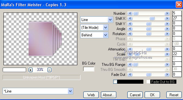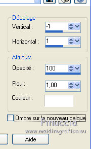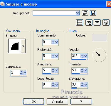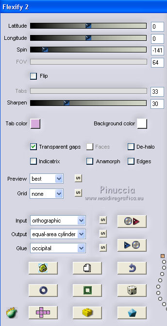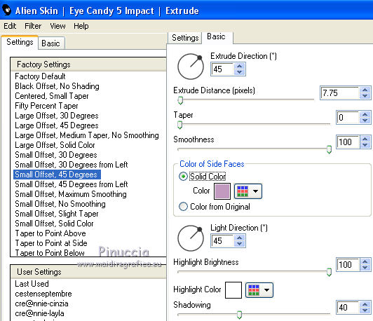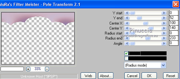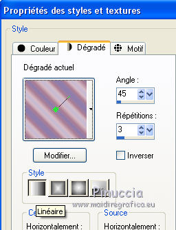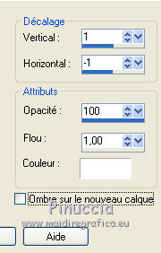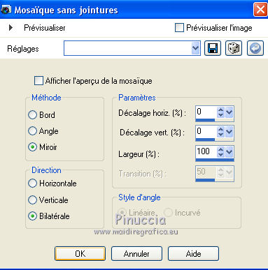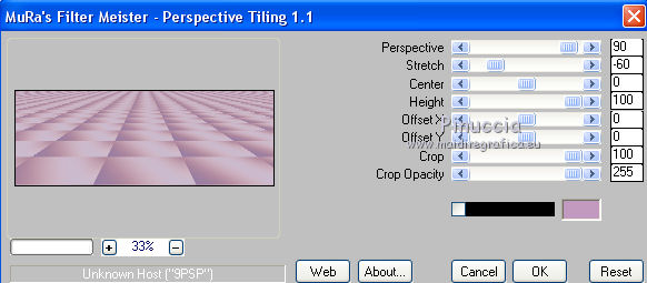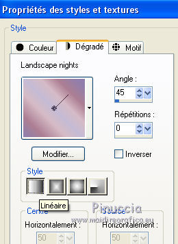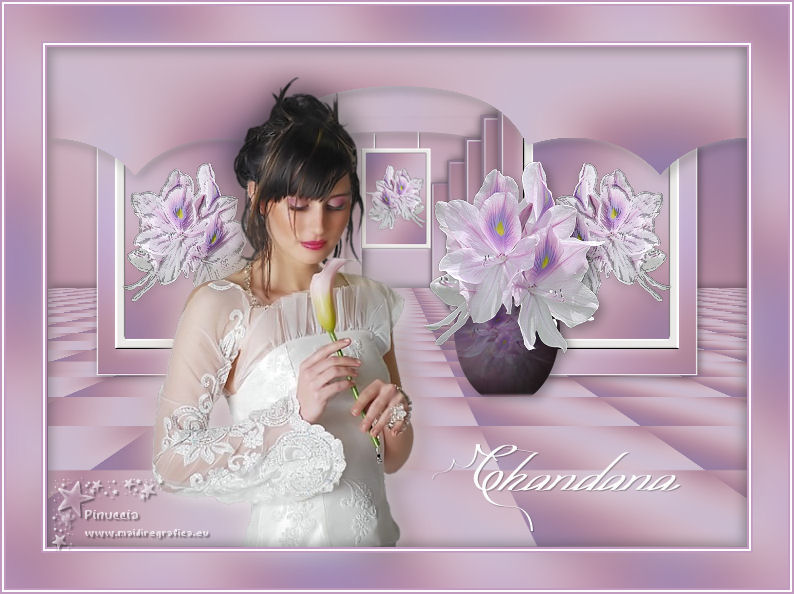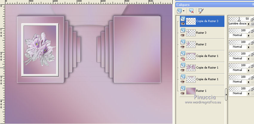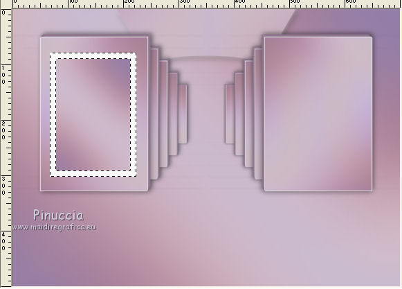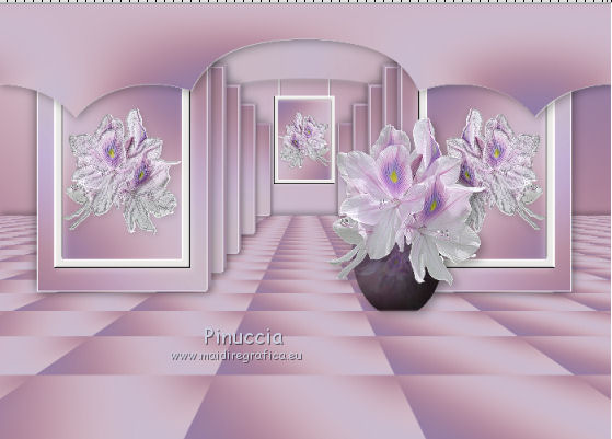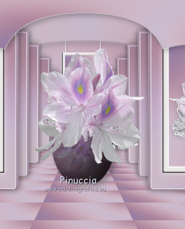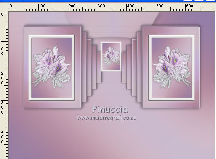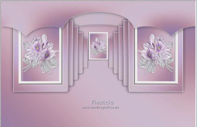 Pour traduire ce tutoriel j'ai utilisé Corel X7 e CorelX2 mais il peut également être exécuté avec les autres versions. Suivant la version utilisée, vous pouvez obtenir des résultats différents. Depuis la version X4, la fonction Image>Miroir a été remplacée par Image>Renverser hhorizontalement, et Image>Renverser avec Image>Renverser verticalement. Dans les versions X5 et X6, les fonctions ont été améliorées par la mise à disposition du menu Objets. Avec la nouvelle version X7, nous avons à nouveau Miroir/Retourner, mais avec nouvelles différences. Consulter, si vouz voulez, mes notes ici Certaines dénominations ont changées entre les versions de PSP. Les plus frequentes dénominations utilisées: ![]() traduction italienne ici vos versions ici Nécessaire pour réalise le tutoriel: Matériel ici Merci pour tube Maxyran (les liens des sites des tubeuses ici) Modules Externes. consulter, si nécessaire, ma section de filtre ici Filters Unlimited 2.0 ici Flaming Pear - Flexify 2 ici Mura's Meister - Copies ici Mura's Meister - Perspective Tiling ici Muras's Meister - Pole Transform ici Alien Skin Eye Candy 5 Impact - Extrude ici ![]() N'hésitez pas à changer le mode mélange des calques et leur opacité selon les couleurs que vous utiliserez Dans les plus récentes versions de PSP, vous ne trouvez pas le dégradé d'avant plan/arrière plan ou Corel_06_029. Vous pouvez utiliser le dégradé des versions antérieures. Ici le dossier Dégradés de CorelX. Ouvrez la police et la minimiser. Vous les trouverez dans la liste des polices disponibles lorsque vous en avez besoin. Avec les nouveaux s.o. ce n'est plus possible. Pour utiliser une police, vous devez la copier dans le dossier Fonts de Windows. Placer le dégradé dans le dossier Dégradés. Placer les sélections dans le dossier Sélections. 1. Placer en avant plan la couleur #c29ac0, et en arrière plan la couleur #fbfbfb. ![]() Passa il couleur d'avant plan a Gradiente, e seleziona il gradiente Landscape Nights, avec ces réglages. ![]() Ouvrir une nouvelle image transparente 700 x 500 pixels, et remplir du dégradéRéglage>Flou>Flou radial. ![]() Calques>Dupliquer. Effets>Modules Externes>Flaming Pear – Flexify 2: ![]() malheureusement les effets sont nombreux et ils ne sont pas en ordre alphabétique. Un petit truc consiste à vous positionner en haut de la liste et à cliquer sur la lettre initiale de l'effet, jusqu'à ce que vous voyez l'effet qui doit être appliqué ![]() Image>Redimensionner, à 65%, redimensionner tous les calques décoché. Effets>Effets 3D>Ombre portée, couleur blanche. ![]() Répéter l'Effet Ombre portée, mais vertical et horizontal 1/-1 ![]() Effets>Modules Externes>Alien Skin Eyecandy 5 – Extrude Settings: Small Offset,45 Degrees Basic: Solid Color couleur d'avant plan et garder Hightlight Color avec la couleur blanche. ![]() Effets>Effets 3D>Ombre portée, couleur noire. ![]() Effets>Modules Externes>Mura's Meister - Copies. ![]() Image>Redimensionner, à 85%, redimensionner tous les calques décoché. Si vous ne visualisez pas les règles: Affichage>Règles Positionner l'image en haut à gauche,à 50 pixels en horizontal et 50 pixels en vertical ![]() Calques>Dupliquer. Image>Miroir. Calques>Fusionner>Fusionner le calque de dessous. Effets>Effets 3D>Ombre portée, couleur noire. ![]() 2. Vous positionner sur le calque du bas de la pile. Calques>Dupliquer. Calques>Agencer>Placer en haut de la pile. Effets>Modules Externes>Flaming Pear - Flexify 2. ![]() Image>Renverser. Effets>Effets d'image>Décalage. ![]() Effets>Effets 3D>Ombre portée, couleur blanche. ![]() Effets>Effets 3D>Ombre portée, couleur noire. ![]() Calques>Agencer>Déplacer vers le bas. Vous positionner à nouveau sur le calque du bas de la pile. 3. Calques>Dupliquer. Calques>Agencer>Placer en haut de la pile. Effets>Modules Externes>Mura’s Meister – Pole Transform. ![]() Effets>Effets 3D>Ombre portée, couleur blanche. ![]() Effets>Effets 3D>Ombre portée, couleur noire. ![]() Fermer ce calque. 4.Calques>Nouveau calque raster. Sélections>Charger/Enregistrer une sélection>Charger à partir du disque. Chercher et charger la sélection Msb_Sel_Chandana_01. ![]() Remplir la sélection avec la couleur d'arrière plan.Sélections>Modifier>Contracter - 10 pixels. Remplir la sélection du dégradé.Réglage>Flou>Flou gaussien - rayon 25. ![]() Sélections>Désélectionner tout. Positionner bien le cadre au centre de la figureactiver l'outil Baguette magique ![]() et cliquer dans le cadre blanc pour le sélectionner ![]() Effets>Effets 3D>Biseautage intérieur, colore #e4e3e1. ![]() Sélections>Désélectionner tout. Effets>Effets 3D>Ombre portée, couleur blanche. ![]() Ouvrir le tube White-irises-gcw - Édition>Copier. ne pas fermer le tube; on va s'en servir plus tard Revenir sur votre travail et Édition>Coller comme nouveau calque. Image>Redimensionner, à 30%, redimensionner tous les calques décoché. Déplacer la fleur sur le cadre à gauche.Réglage>Netteté>Netteté. Sélections>Désélectionner tout. Calques>Dupliquer. Vous positionner sur le calque de dessous de l'original. Effets>Effets de traits>Fusain ![]() Vous positionner sur le calque du haut de la pile de la copie. Effets>Effets 3D>Ombre portée, couleur noire. ![]() Placer le calque en mode Lumière douce, et réduire l'opacité à 50%. ![]() Calques>Fusionner>Fusionner le calque de dessous - 2 fois. Calques>Dupliquer. Image>Miroir. Édition>Copier. Édition>Coller comme nouveau calque. Image>Redimensionner, à 45%, redimensionner tous les calques décoché. Positionner bien le cadre au centre![]() Vous positionner sur le calque de dessous (le cadre à droite). Calques>Fusionner>Fusionner le calque de dessous. Re-ouvrir et vous positionner sur le calque fermé à l'étape 3. Calques>Agencer>Placer en haut de la pile. Vous devriez avoir ce-ci. ![]() 5. Inverser les couleurs de la palette: couleur claire en avant plan. ![]() Vous positionner s