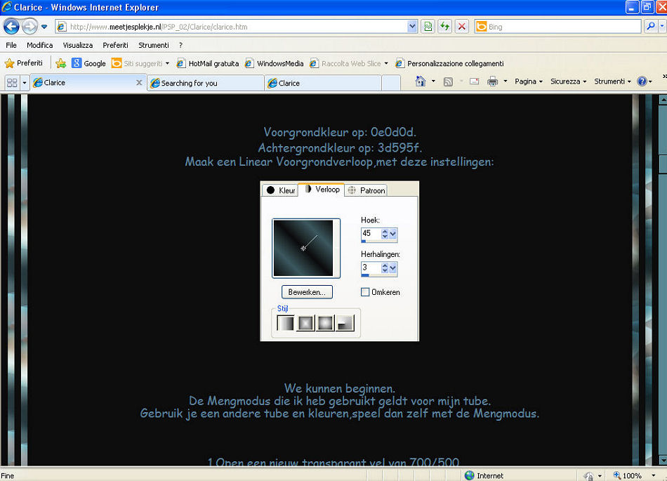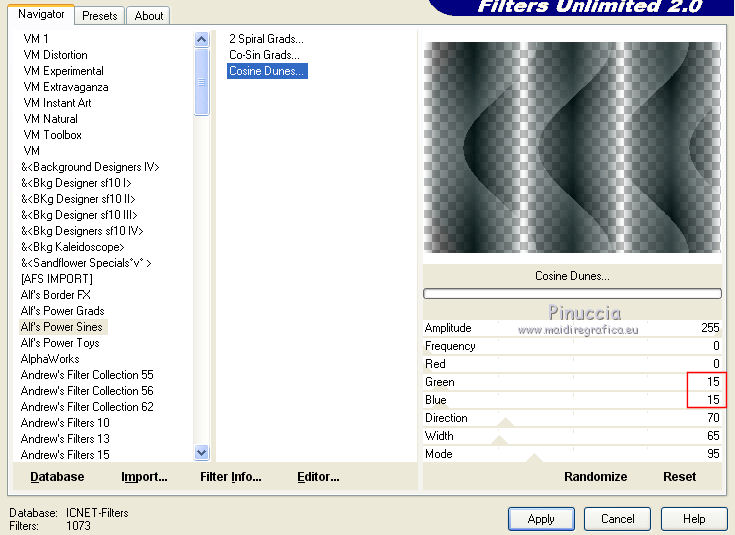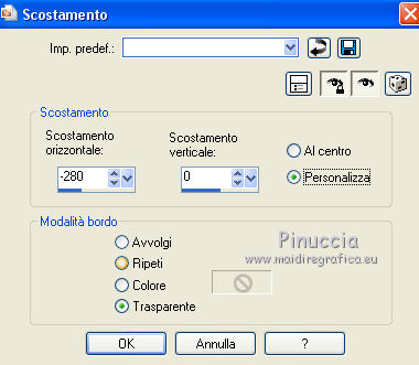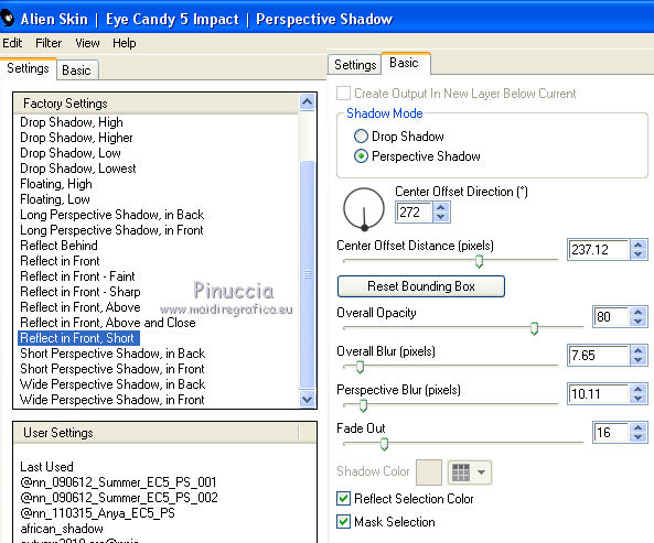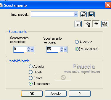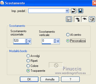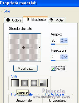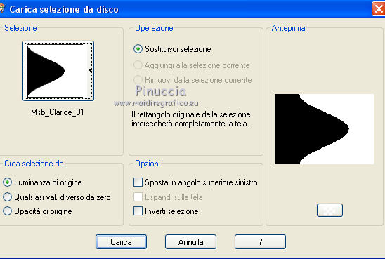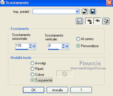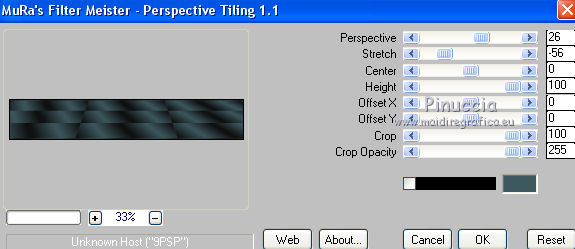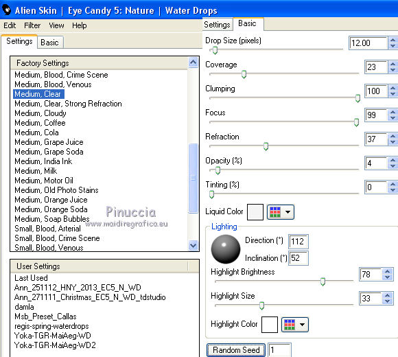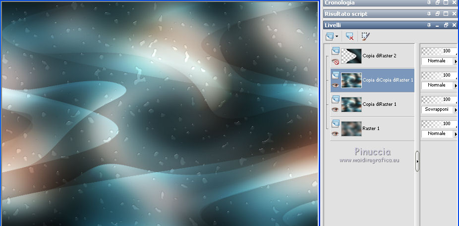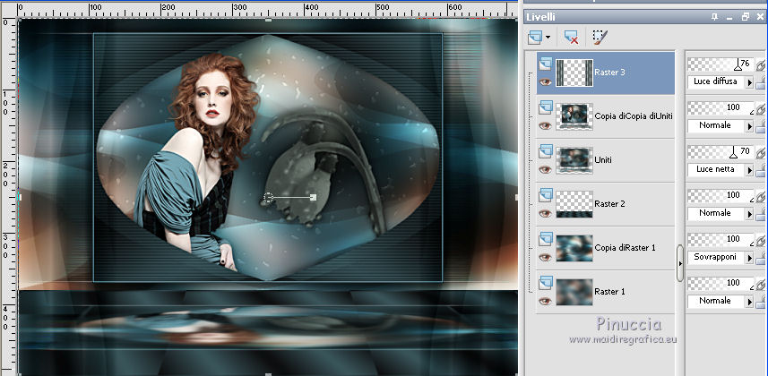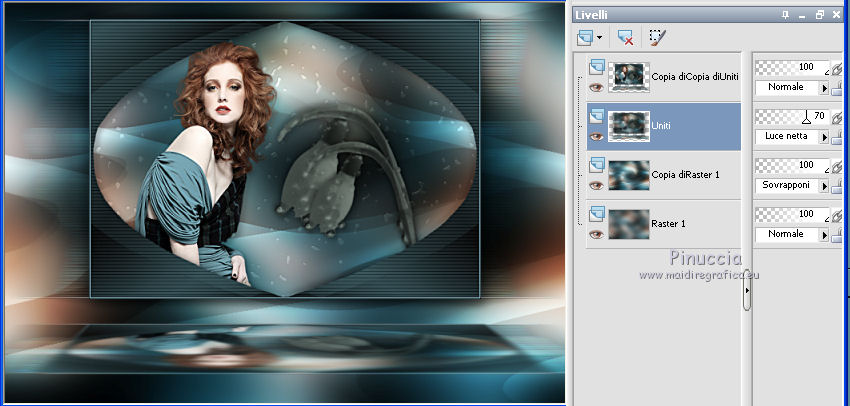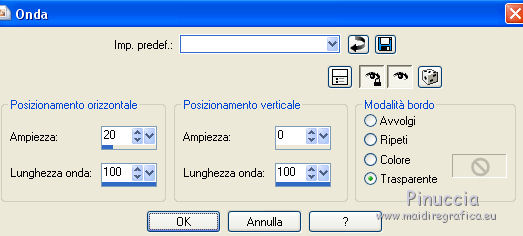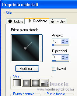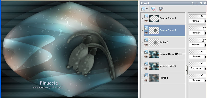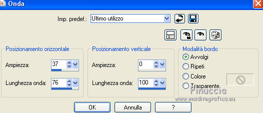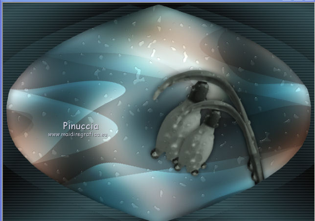 qui puoi trovare qualche risposta ai tuoi dubbi. Se l'argomento che ti interessa non è presente, ti prego di segnalarmelo. Questo tutorial è una creazione ©Meetjesplekje e non può essere copiato su altri siti nè essere offerto per il download. Lo stesso vale per la mia traduzione. Il materiale viene da vari gruppi di condivisione. Il copyright appartiene ai rispettivi autori. Grazie ai creatori dei tubes che mettono a disposizione il loro lavoro in vari gruppi di condivisione. Per tradurre questo tutorial ho usato CorelX, ma può essere realizzato anche con le altre versioni di PSP. Dalla versione X4, il comando Immagine>Rifletti è stato sostituito con Immagine>Capovolgi in orizzontale, e il comando Immagine>Capovolgi con Immagine>Capovolgi in verticale. Nelle versioni X5 e X6, le funzioni sono state migliorate rendendo disponibile il menu Oggetti. Vedi la scheda sull'argomento qui traduzione francese qui Vos versions qui Occorrente: Materiale qui Per il tube grazie Alies. (in questa pagina trovi i links ai siti dei creatori di tubes) Filtri: consulta, se necessario, la mia sezione filtri qui Filters Unlimited 2.0 qui Alf's Power Sines - Cosine Dunes qui Mura's Meister - Perspective Tiling qui Alien Skin Eye Candy 5 Impact - Perspective Shadow qui Alien Skin Eye Candy 5 Nature - Water Drops qui Carolaine and Sensibility - CS_Halloween 2 qui I filtri Alf's Power Sines si possono usare da soli o importati in Filters Unlimited (come fare vedi qui) Se un filtro fornito appare con questa icona ![]() Se stai usando altri colori puoi sperimentare le modalità di miscelatura e le opacità più adatte ai tuoi colori. Nelle ultime versioni di PSP non c'è il gradiente di primo piano/sfondo (Corel_06_029) Puoi usare i gradienti delle versioni precedenti. Trovi qui i gradienti Corel X. Apri il font e minimizzalo. Lo troverai nella lista dei font disponibili quando ti servirà. Con i nuovi sistemi operativi questo non è più possibile. Per usare un font, occorre copiarlo nella cartella Font di Windows. Metti la selezione nella cartella Selezioni. Imposta il colore di primo piano con #0e0d0d, e il colore di sfondo con #3d595f. ![]() Passa il colore di primo piano a Gradiente di primo piano/sfondo, stile Lineare. ![]() 1. Apri una nuova immagine trasparente 700 x 500 pixels. Riempi con il gradiente.Selezione>Seleziona tutto. Apri il tube Alies 433-vrouw-06032011 e vai a Modifica>Copia. Minimizza il tube. Torna al tuo lavoro e vai a Modifica>Incolla nella selezione. Selezione>Deseleziona. Effetti>Effetti di immagine>Motivo unico, con i settaggi standard. ![]() Regola>Sfocatura>Sfocatura gaussiana, raggio 40. ![]() Livelli>Duplica. 2. Livelli>Nuovo livello raster. Selezione>Carica/Salva selezione>Carica selezione da disco. Cerca e carica la selezione Msb_Clarice_01 ![]() Riempi la selezione con il gradiente.Selezione>Deseleziona. Livelli>Duplica. Chiudi questo livello e attiva il livello sottostante dell'originale. Effetti>Effetti di distorsione>Onda, ![]() Cambia la modalità di miscelatura di questo livello in Indebolisci. Livelli>Unisci>Unisci giù. Cambia la modalità di miscelatura di questo livello in Moltiplica. Livelli>Duplica. Effetti>Effetti di distorsione>Mulinello. ![]() Cambia la modalità di miscelatura di questo livello in Luce netta. Livelli>Unisci>Unisci giù. Cambia la modalità di miscelatura di questo livello in Sovrapponi. Livelli>Duplica. Effetti>Plugins>Alien Skin Eye Candy 5 Nature – Water Drops. ![]() Riporta la modalità di miscelatura a Normale. ![]() 3. Riapri e attiva il livello superiore. Effetti>Effetti geometrici>Cilindro orizzontale. ![]() Effetti>Effetti di immagine>Scostamento. ![]() Livelli>Duplica. Immagine>Rifletti. Livelli>Unisci>Unisci giù. Effetti>Plugins>Carolaine and Sensibility – CS_Halloween 2, con i settaggi standard. ![]() Livelli>Duplica. Immagine>Rifletti. Abbassa l'opacità di questo livello al 50%. Livelli>Unisci>Unisci giù. Effetti>Effetti 3D>Sfalsa ombra, colore nero. ![]() Ripeti l'Effetto Sfalsa ombra, verticale e orizzontale -5. 4.Apri il tube BdB-sneeuwklokje-09022011 e vai a Modifica>Copia. Torna al tuo lavoro e vai a Modifica>Incolla come nuovo livello. Livelli>Disponi>Sposta giù. Immagine>Ridimensiona, all'80%, tutti i livelli non selezionato. Posiziona correttamente il tube.Regola>Tonalità e saturazione>Tonalità/Saturazione/Luminosità. ![]() Ripeti l'Effetto con gli stessi settaggi. Effetti>Effetti 3D>Sfalsa ombra, colore nero. ![]() Livelli>Duplica. Immagine>Ridimensiona, all'80%, tutti i livelli non selezionato. Sposta il tube un po' più in basso.![]() Livelli>Unisci>Unisci giù. Immagine>Ridimensiona, all'80%, tutti i livelli non selezionato. Posiziona correttamente i fiori![]() Livelli>Duplica. Attiva il livello sottostante dell'originale. Regola>Sfocatura>Sfocatura gaussiana, raggio 40. ![]() Regola>Tonalità e saturazione>Tonalità/Saturazione/Luminosità, con i settaggi precedenti. ![]() Cambia la modalità di miscelatura di questo livello in Moltiplica, e abbassa l'opacità all'80%. Attiva il livello soprastante. Effetti>Effetti 3D>Sfalsa ombra, colore nero. ![]() Abbassa l'opacità di questo livello all'80%. ![]() 5. Attiva nuovamente il tube Alies 433-vrouw-06032011. Attiva lo strumento Selezione , rettangolo,e seleziona la parte superiore del tube ![]() Modifica>Copia. Selezione>Deseleziona, e minimizza nuovamente il tube. Torna al tuo lavoro e vai a Modifica>Incolla come nuovo livello. Effetti>Effetti di immagine>Scostamento. ![]() Regola>Messa a fuoco>Metti a fuoco. Livelli>Duplica. Attiva il livello sottostante dell'originale. Regola>Sfocatura>Sfocatura gaussiana, raggio 40. ![]() Regola>Tonalità e saturazione>Tonalità/Saturazione/Luminosità, con i settaggi precedenti. ![]() Cambia la modalità di miscelatura di questo livello in Luce netta. Attiva il livello soprastante della copia. Effetti>Effetti 3D>Sfalsa ombra, colore nero. ![]() Attiva il livello superiore. 6. Livelli>Nuovo livello raster. Selezione>Sele