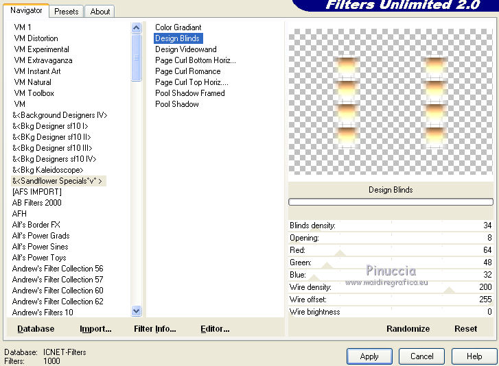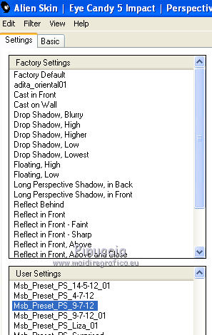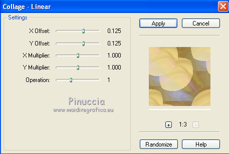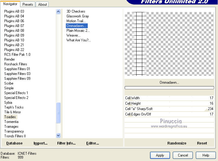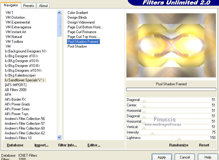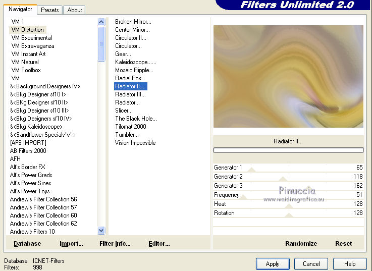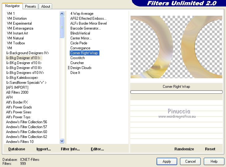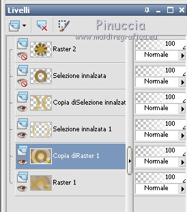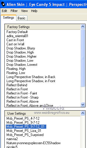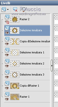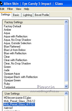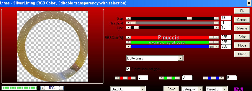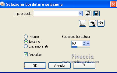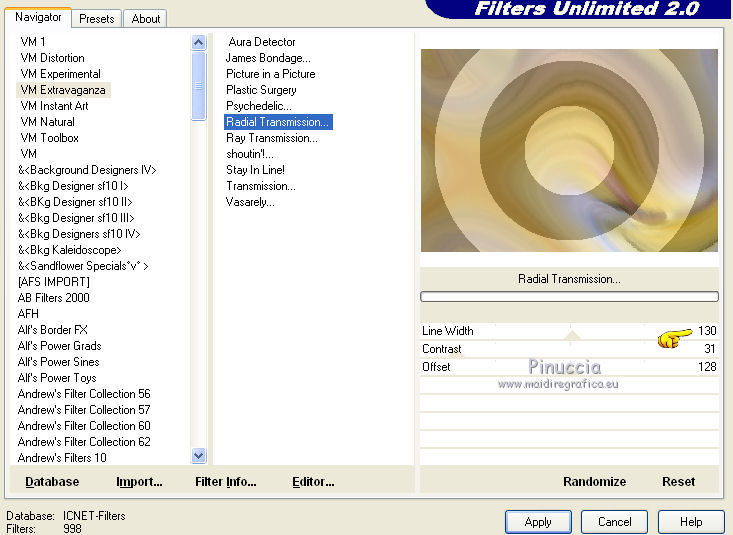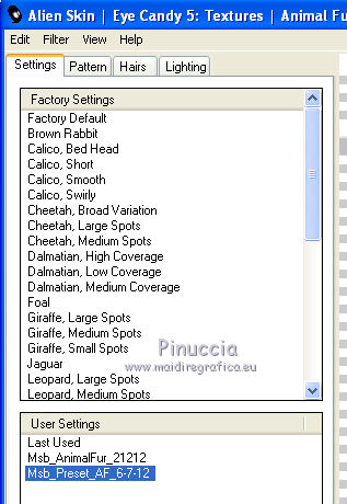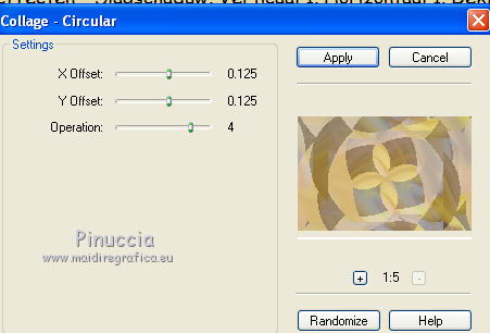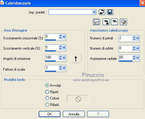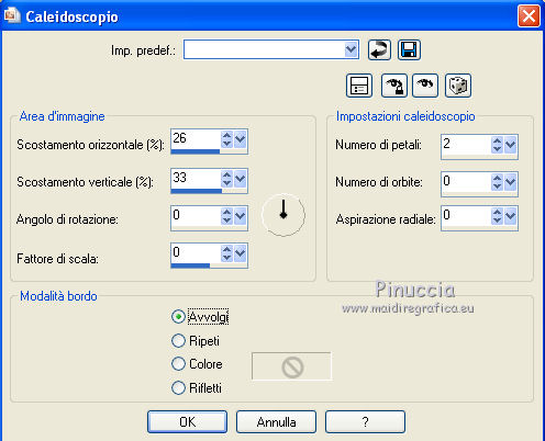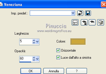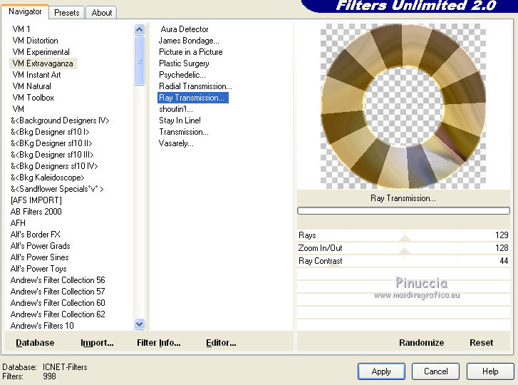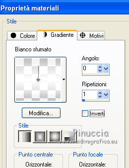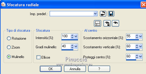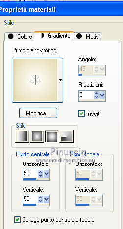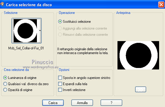 qui puoi trovare qualche risposta ai tuoi dubbi. Se l'argomento che ti interessa non è presente, ti prego di segnalarmelo. Questo tutorial è una creazione ©Meetjesplekje e non può essere copiato su altri siti nè essere offerto per il download. Lo stesso vale per la mia traduzione. Il materiale viene da vari gruppi di condivisione. Il copyright appartiene ai rispettivi autori. Grazie ai creatori dei tubes che mettono a disposizione il loro lavoro in vari gruppi di condivisione. Per tradurre questo tutorial ho usato PSP X. Occorrente: Materiale qui Per il tube della donna grazie Bianca. Filtri: consulta, se necessario, la mia sezione filtri qui Filters Unlimited 2.0 qui VM Distortion - Radiator II qui VM Extravaganza - Radial Transmission, Ray Transmission qui &<Bkg Designer sf10I> - Corner Right Wrap qui &<Sandflower Specials> - Design Blinds, Pool Shadow Framed qui Toadies - Ommadawn qui FM Tile Tools - Collage Circular, Collage Linear qui Transparency - Eliminate White qui Simple - Top Left Mirror qui Cybia Screenworks qui Alien Skin Eye Candy 5 Impact qui Alien Skin Eye Candy 5 Textures qui AP 01 [Innovations] - Lines Silverlining qui I filtri della serie Visman (VM Toolbox, VM Natural...) e Toadies si possono usare da soli e anche importati in Unlimited. A volte vi sono delle differenze nei risultati, ma non ci sono regole fisse e pertanto queste differenze si possono riscontrare soltanto "sul campo" ![]() Apri il font e minimizzalo. Lo troverai nella lista dei font disponibili quando ti servirà. Metti i preset nelle rispettive cartelle del filtro Alien Skin Eye Candy 5 Impact>Settings>Glass--Shadow, e Alien Skin Eye Candy 5 Textures>Settings>Animal Fur. Con un doppio clic sul file avrai il preset automaticamente installato nelle cartelle corrette. Metti la selezione nella cartella Selezioni. Se stai usando altri colori puoi sperimentare le modalità di miscelatura e le opacità più adatte ai tuoi colori. Imposta il colore di primo piano con #e2d9ab, e il colore di sfondo con #ffffff (bianco). Passa il colore di primo piano a Gradiente, stile Lineare, con i seguenti settaggi. ![]() 1. Apri una nuova immagine trasparente 800 x 550 pixels, e riempila con il gradiente.Selezione>Seleziona tutto. Apri il tube BdB-vrouw38-27052012 e vai a Modifica>Copia. non chiudere il tube perchè ti servirà ancora. Torna al tuo lavoro e vai a Modifica>Incolla nella selezione. Selezione>Deseleziona. Effetti>Effetti di immagine>Motivo unico, con i settaggi standard. ![]() Regola>Sfocatura>Sfocatura radiale. ![]() Effetti>Plugins>Filters Unlimited 2.0 - VM Distortion - Radiator II, con i settaggi standard. ![]() Effetti>Plugins>Filters Unlimited 2.0 - VM Extravaganza - Radial Transmission. ![]() Attiva lo strumento Bacchetta magica , tolleranza 20,e clicca al centro del cerchio per selezionarlo. Clicca più volte, finchè il cerchio sarà completamente selezionato. ![]() Selezione>Modifica>Contrai - 5 pixels. Selezione>Modifica>Seleziona bordature selezione. ![]() Selezione>Innalza selezione a livello. Livelli>Duplica. Chiudi il livello sottostante dell'originale, e rimani posizionato sul livello superiore. ![]() Effetti>Plugins>Filters Unlimited 2.0 - VM Extravaganza - Ray Transmission, con i settaggi standard. ![]() Selezione>Modifica>Contrai - 5 pixels. Selezione>Inverti. Premi sulla tastiera il tasto CANC. Selezione>Deseleziona. Effetti>Effetti 3D>Sfalsa ombra, con il colore nero. ![]() Ripeti l'Effetto Sfalsa ombra, cambiando verticale e orizzontale con -5. 3. Attiva lo strumento Bacchetta magica , tolleranza 0,e clicca al centro del cerchio per selezionarlo. Selezione>Modifica>Espandi - 19 pixels. Livelli>Nuovo livello raster. Effetti>Plugins>Alien Skin Eye Candy 5 Textures - Animal Fur. Seleziona il preset Msb_Preset_AF_6-7-12 e ok. ![]() Effetti>Plugins>Alien Skin Eye Candy 5 Impact - Glass. Seleziona il preset Msb_Preset_Glass_4-7-12 e ok. ![]() Livelli>Disponi>Sposta giù. Attiva il livello superiore. Livelli>Unisci>Unisci giù. Selezione>Deseleziona. Chiudi i due livelli superiori e attiva il secondo livello dal basso. ![]() 4. Selezione>Carica/Salva selezione>Carica selezione da disco. Cerca e carica la selezione Msb_Sel_Collar-of-Fur_01. ![]() Selezione>Innalza selezione a livello. Livelli>Duplica. Selezione>Deseleziona. Effetti>Plugins>Filters Unlimited 2.0 - &<Bkg Designer sf10 I> - Corner Right Wrap. ![]() Effetti>Effetti di trama>Veneziana - colore #cca73c. ![]() Effetti>Effetti di bordo>Aumenta. Selezione>Seleziona tutto. Selezione>Mobile. Selezione>Immobilizza. Selezione>Modifica>Contrai - 3 pixels. Selezione>Inverti. Premi sulla tastiera il tasto CANC. Selezione>Deseleziona. Immagine>Ridimensiona, al 101%, tutti i livelli non selezionato. Effetti>Effetti 3D>Sfalsa ombra, con il colore nero. ![]() Ripeti l'Effetto Sfalsa ombra, cambiando verticale e orizzontale con -5. 5. Attiva il livello sottostante (selezione innalzata 1). ![]() Effetti>Pugins>FM Tile Tools – Collage - Circular, con i settaggi standard. ![]() Effetti>Plugins>Transparency – Eliminate White. Effetti>Effetti 3D>Sfalsa ombra, con il colore bianco. ![]() Ripeti l'Effetto Sfalsa ombra cambiando verticale e orizzontale con -1. Di nuovo Effetti>Effetti 3D>Sfalsa ombra, con il colore #e2d9ab. ![]() Ripeti l'Effetto Sfalsa ombra, cambiando verticale e orizzontale con -1. 6. Attiva nuovamente il secondo livello dal basso. I due livelli superiori sono sempre chiusi. ![]() Attiva lo strumento Bacchetta magica , tolleranza 20,e clicca al centro del cerchio per selezionarlo. Clicca più volte per selezionarlo completamente. ![]() Selezione>Modifica>Seleziona bordature selezione. ![]() Selezione>Innalza selezione a livello. Effetti>Plugins>FM Tile Tools – Collage - Linear, con i settaggi standard. ![]() Selezione>Deseleziona. Effetti>Effetti 3D>Sfalsa ombra, con il colore nero. ![]() Ripeti l'Effetto Sfalsa ombra, cambiando verticale e orizzontale con -5. 7. Attiva nuovamente il secondo livello dal basso (i due livelli s