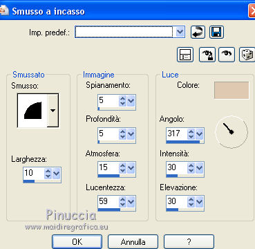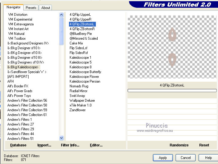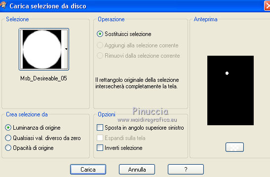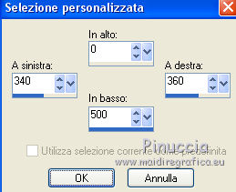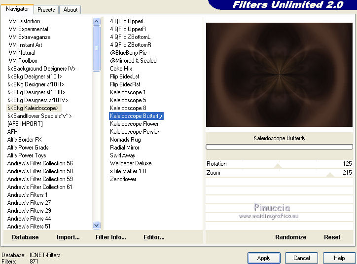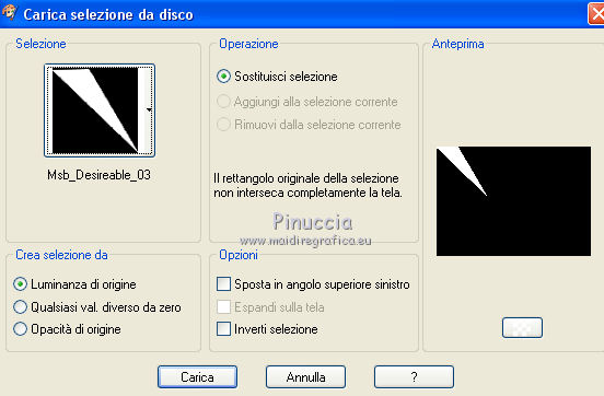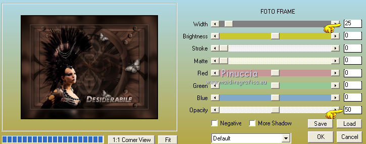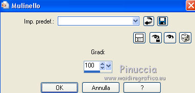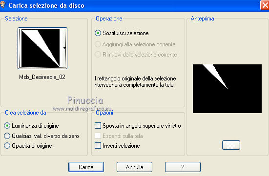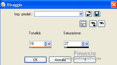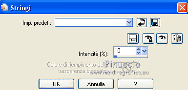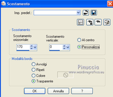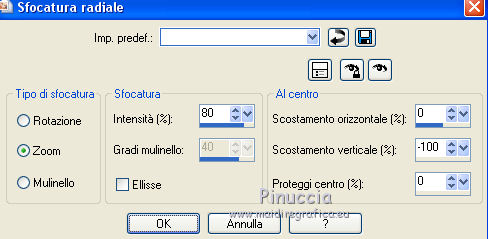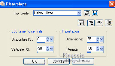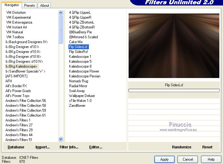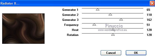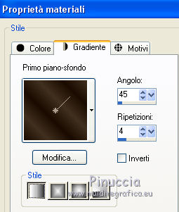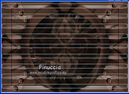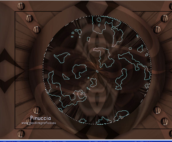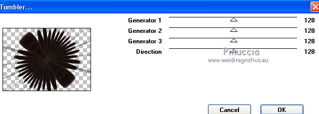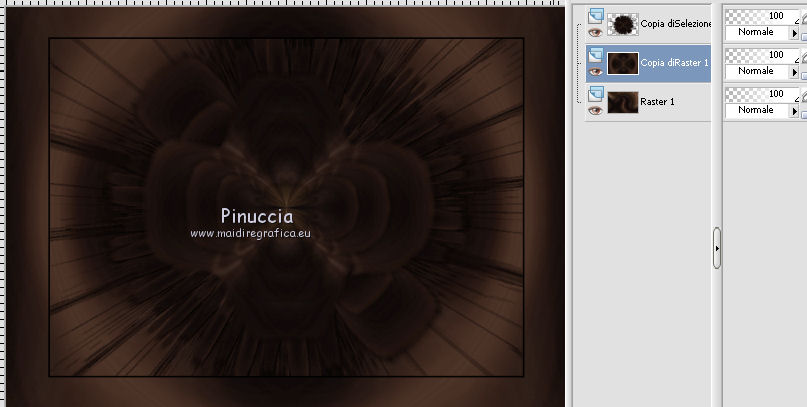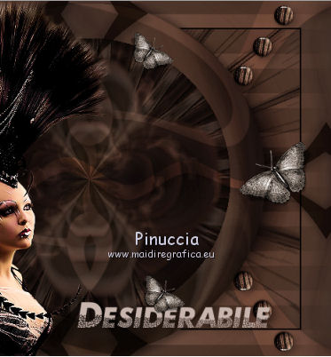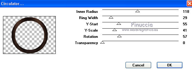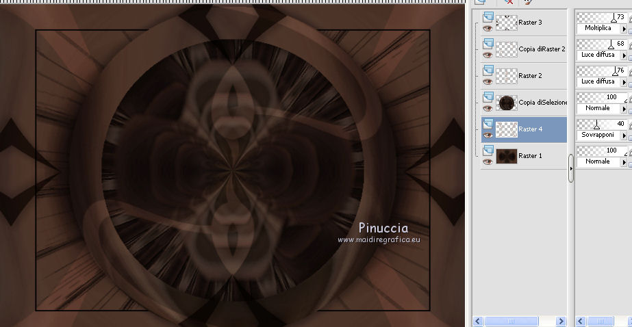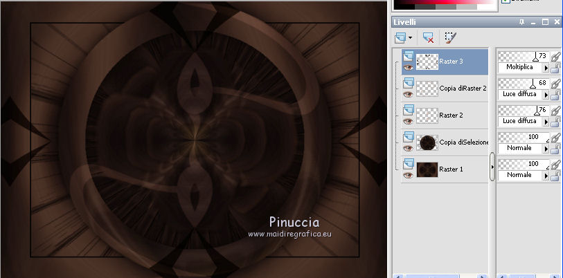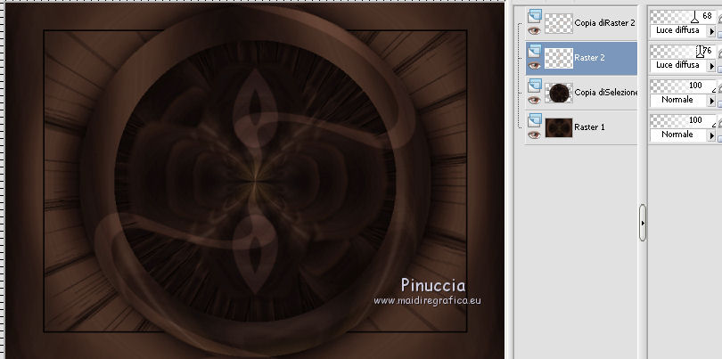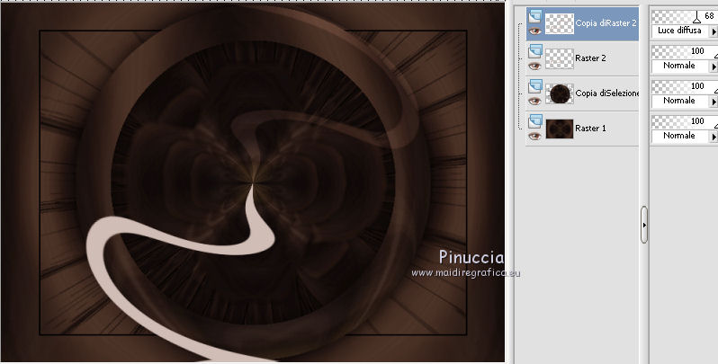 qui puoi trovare qualche risposta ai tuoi dubbi. Se l'argomento che ti interessa non è presente, ti prego di segnalarmelo. Questo tutorial è una creazione ©Meetjesplekje e non può essere copiato su altri siti nè essere offerto per il download. Lo stesso vale per la mia traduzione. Il materiale viene da vari gruppi di condivisione. Il copyright appartiene ai rispettivi autori. Grazie ai creatori dei tubes che mettono a disposizione il loro lavoro in vari gruppi di condivisione. Per tradurre questo tutorial ho usato PSP X3 per l'immagine in alto e PSP X per l'immagine in fondo al tutorial. Occorrente: Materiale qui Per il tube della donna grazie Macha Filtri: consulta, se necessario, la mia sezione filtri qui Filters Unlimited 2.0 qui &<Bkg Kaleidoscope> (da importare in Unlimited) qui VM Distortion - Radiator II, Tumbler, Circulator qui Simple - Top Left Mirror qui Greg's Factory Output 2 - Pool Shadow qui AAA Frames - Foto Frame qui Alien Skin Eye Candy 5 Impact - Glass qui I filtri VM Distortion, Simple, Greg's Factory e Simple si possono usare da soli o importati in Filters Unlimited (come fare vedi qui) Se un filtro fornito appare con questa icona ![]() Se stai usando altri colori puoi sperimentare le modalità di miscelatura e le opacità più adatte ai tuoi colori. Apri il font e minimizzalo. Lo troverai nella lista dei font disponibili quando ti servirà. Con i nuovi sistemi operativi questo non è più possibile. Per usare un font, occorre copiarlo nella cartella Font di Windows. Metti i pennelli nella cartella Pennelli. Attenzione, ogni pennello è composto da due files che non devono essere separati. Vedi gli appunti sui pennelli qui Metti le selezioni nella cartella Selezioni. Imposta il colore di primo piano con #1a0c02, e il colore di sfondo con #41301f. ![]() Passa il colore di primo piano a Gradiente di primo piano/sfondo, stile Lineare: ![]() 1. Apri una nuova immagine trasparente 700 x 500 pixels, e riempila con il gradiente.Livelli>Nuovo livello raster. Selezione>Seleziona tutto. Apri il tube Macha_120911_plumes2 e vai a Modifica>Copia. non chiuderlo, perchè ti servirà ancora Torna al tuo lavoro e vai a Modifica>Incolla nella selezione. Selezione>Deseleziona. Livelli>Unisci>Unisci giù. Effetti>Effetti di immagine>Motivo unico, con i settaggi standard. ![]() Regola>Sfocatura>Sfocatura radiale. ![]() Effetti>Plugins>Filters Unlimited 2.0 - &<Bkg Kaleidoscope> - Flip SidesLsf. ![]() Effetti>Plugins>VM Distortion - Radiator II, con i settaggi standard. ![]() Livelli>Duplica. 2. Effetti>Plugins>Unlimited 2.0 - &<Bkg Kaleidoscope> – Kaleidoscope Butterfly, con i settaggi standard. ![]() Selezione>Carica/Salva selezione>Carica selezione da disco. Cerca e carica la selezione Msb_Desireable_01. ![]() Selezione>Innalza selezione a livello. Selezione>Modifica>Sfuma - 15 pixels. Selezione>Inverti. Premi alcune volte sulla tastiera il tasto CANC ![]() Io ho cliccato tre volte. Selezione>Deseleziona. Effetti>Effetti 3D>Sfalsa ombra, colore nero. ![]() Ripeti l'Effetto Sfalsa ombra, cambiando verticale e orizzontale con -5. Livelli>Duplica. Immagine>Ridimensiona, al 70%, tutti i livelli non selezionato. Livelli>Duplica. Immagine>Ridimensiona, al 70%, tutti i livelli non selezionato. Livelli>Unisci>Unisci giù - 2 volte. Livelli>Duplica. Effetti>Plugins>VM Distortion – Tumbler, con i settaggi standard. ![]() Effetti>Effetti 3D>Sfalsa ombra, colore nero. ![]() 3. Livelli>Duplica. Attiva il livello sottostante dell'originale. Effetti>Plugins>VM Distortion – Tumbler, con i settaggi standard. Attiva il livello superiore della copia. Livelli>Unisci>Unisci giù. Livelli>Disponi>Sposta giù. Attiva nuovamente il livello superiore. Immagine>Ridimensiona, all'80%, tutti i livelli non selezionato. Livelli>Unisci>Unisci giù. Livelli>Nuovo livello raster. Imposta il colore di primo piano con il colore nero, e riempi il livello con questo colore.Selezione>Seleziona tutto. Selezione>Modifica>Contrai - 2 pixels. Premi sulla tastiera il tasto CANC. Livelli>Unisci>Unisci giù. Immagine>Ridimensiona, all'85%, tutti i livelli non selezionato. 4. Attiva il livello centrale. ![]() Livelli>Unisci>Unisci giù. Livelli>Duplica. Effetti>Plugins>VM Distortion – Circulator. ![]() Livelli>Disponi>Porta in alto. Effetti>Effetti 3D>Sfalsa ombra, colore nero. ![]() Ripeti l'Effetto Sfalsa ombra, cambiando verticale e orizzontale con -5. Livelli>Unisci>Unisci giù. 5. Livelli>Nuovo livello raster. Attiva lo strumento Selezione ![]() clicca sull'icona Selezione personalizzata ![]() e imposta i seguenti settaggi. ![]() Imposta il colore di primo piano con #c8b5ae, e riempi la selezione con questo colore.Selezione>Deseleziona. Effetti>Effetti di distorsione>Distorsione. ![]() Effetti>Effetti di immagine>Scostamento. ![]() Effetti>Effetti di distorsione>Mulinello. ![]() Effetti>Effetti di distorsione>Coordinate polari. ![]() Livelli>Duplica. Di nuovo Livelli>Duplica. Immagine>Rifletti. Immagine>Capovolgi. Livelli>Unisci>Unisci giù. Cambia la modalità di miscelatura di questo livello in Luce diffusa, e abbassa l'opacità al 68%. ![]() Effetti>Effetti di distorsione>Stringi (nelle versioni più recenti di PSP è Compressione). ![]() Attiva il livello sottostante dell'originale. Effetti>Effetti di immagine>Scostamento. ![]() Effetti>Plugins>Unlimited 2.0 - &<Bkg Kaleidoscope> – 4 QFlip ZBottomL. ![]() Cambia la modalità di miscelatura di questo livello in Luce diffusa, e abbassa l'opacità al 76%. ![]() Selezione>Seleziona tutto. Selezione>Mobile. Selezione>Immobilizza. Attiva il livello superiore. Premi sulla tastiera il tasto CANC. Effetti>Effetti 3D>Sfalsa ombra, colore nero. ![]() 6. Livelli>Nuovo livello raster. Selezione>Carica/Salva selezione>Carica selezione da disco. Cerca e carica la selezione Msb_Desireable_02. ![]() Imposta nuovamente il colore di primo piano con #1a0c02, e riempi la selezione con il colore di primo piano.Selezione>Deseleziona. Effetti>Effetti di distorsione>Distorsione. ![]
