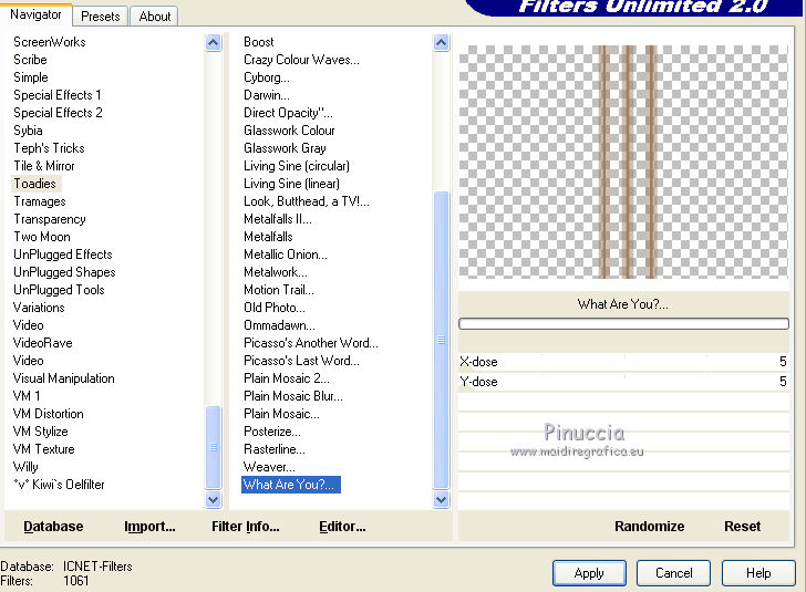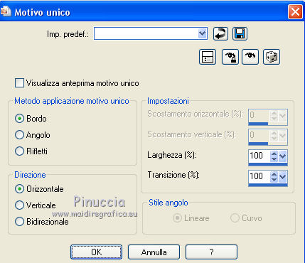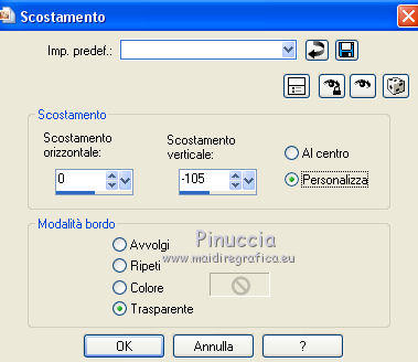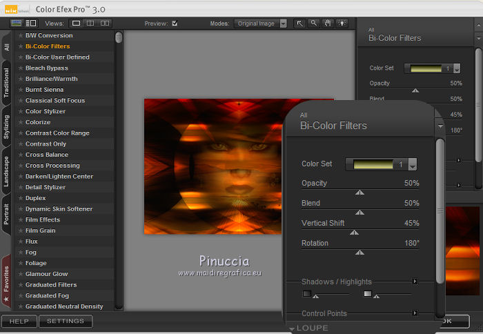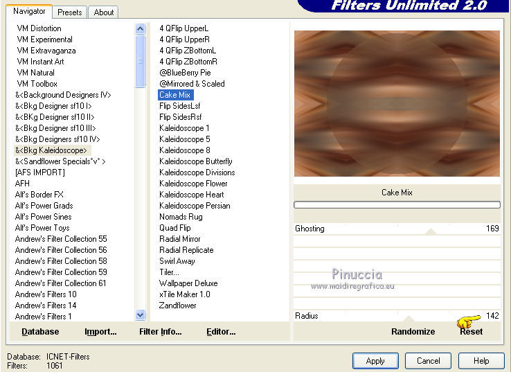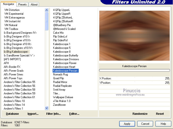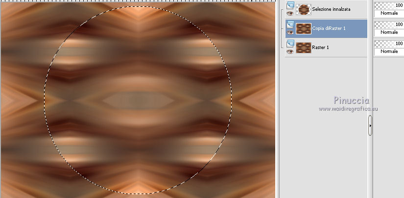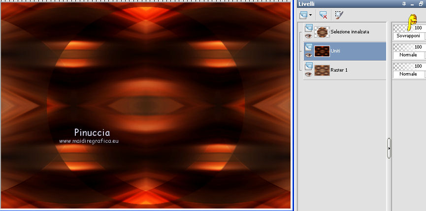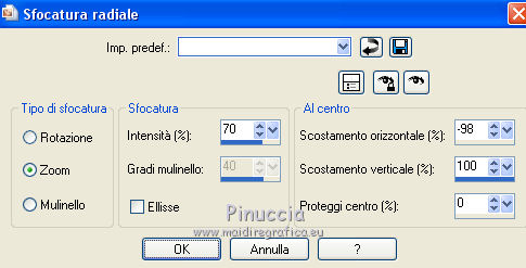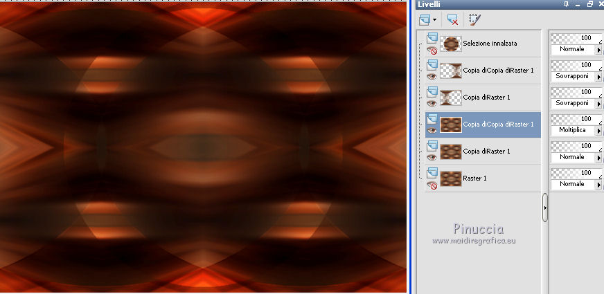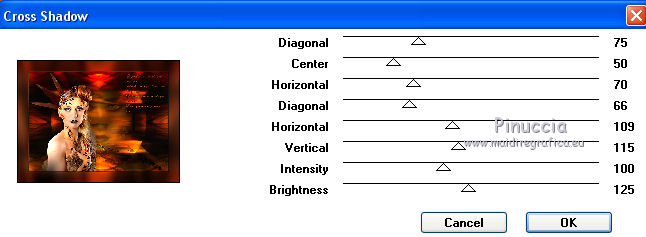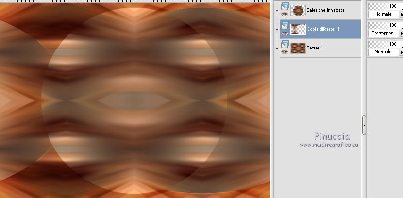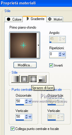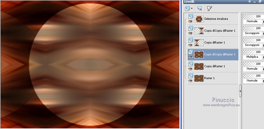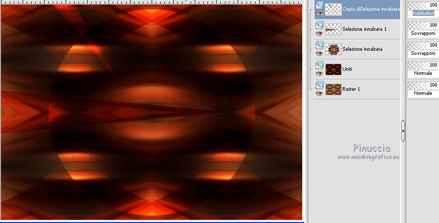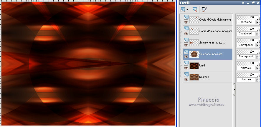 qui puoi trovare qualche risposta ai tuoi dubbi. Se l'argomento che ti interessa non è presente, ti prego di segnalarmelo. Questo tutorial è una creazione ©Meetjesplekje e non può essere copiato su altri siti nè essere offerto per il download. Lo stesso vale per la mia traduzione. Il materiale viene da vari gruppi di condivisione. Il copyright appartiene ai rispettivi autori. Grazie ai creatori dei tubes che mettono a disposizione il loro lavoro in vari gruppi di condivisione. Per tradurre questo tutorial ho usato CorelX, ma può essere realizzato anche con le altre versioni di PSP. Dalla versione X4, il comando Immagine>Rifletti è stato sostituito con Immagine>Capovolgi in orizzontale, e il comando Immagine>Capovolgi con Immagine>Capovolgi in verticale. Nelle versioni X5 e X6, le funzioni sono state migliorate rendendo disponibile il menu Oggetti. Vedi la scheda sull'argomento qui Occorrente: Materiale qui Per il tubes della donna grazie Syl Per il tube del viso grazie Gina Per la trama grazie Winnie. Filtri: consulta, se necessario, la mia sezione filtri qui Filters Unlimited 2.0 qui &<Bkg Kaleidoscope> - Kaleidoscope Persian, Cake mix (da importare in Unlimited) qui Toadies - What are you qui Nik software - Color Efex Pro qui Graphics Plus - Cross Shadow qui I filtri Toadies e Graphics Plus si possono usare da soli o importati in Filters Unlimited (come fare vedi qui) Se un filtro fornito appare con questa icona ![]() Se stai usando altri colori puoi sperimentare le modalità di miscelatura e le opacità più adatte ai tuoi colori. Apri il font e minimizzalo. Lo troverai nella lista dei font disponibili quando ti servirà. Con i nuovi sistemi operativi questo non è più possibile. Per usare un font, occorre copiarlo nella cartella Font di Windows. Metti i pennelli nella cartella Pennelli. Attenzione, ogni pennello è composto da due files che non devono essere separati. Vedi gli appunti sui pennelli qui E' possibile che i pennelli non funzionino con la tua versione di PSP. In questo caso, apri il file jpg in PSP ed esporta il pennello con un nuovo pennello personalizzato Metti la trama nella cartella Trame. Metti le selezioni nella cartella Selezioni. Imposta il colore di primo piano con #271a18, e il colore di sfondo con #9e7f63. ![]() Passa il colore di primo piano a Gradiente di primo piano/sfondo, stile Sprazzo di luce. ![]() 1. Apri una nuova immagine trasparente 700 x 500 pixels, e riempila con il gradiente.Selezione>Seleziona tutto. Apri il tube @SvB (29) Beauty e vai a Modifica>Copia. non chiuderlo perchè ti servirà ancora Torna al tuo lavoro e vai a Modifica>Incolla nella selezione. Selezione>Deseleziona. Effetti>Effetti di immagine>Motivo unico, con i settaggi standard. ![]() Regola>Sfocatura>Sfocatura radiale. ![]() Effetti>Plugins>Filters Unlimited 2.0 - &<Bkg Kaleidoscope> - Kaleidoscope Persian, con i settaggi standard. ![]() Effetti>Plugins>Filters Unlimited 2.0 - &<Bkg Kaleidoscope> - Cake Mix. ![]() Livelli>Duplica. 2. Selezione>Carica/Salva selezione>Carica selezione da disco. Cerca e carica la selezione Msb_Dhanya_01. ![]() Selezione>Innalza selezione a livello. Attiva il livello sottostante. ![]() Premi sulla tastiera il tasto CANC ![]() Selezione>Deseleziona. Effetti>Effetti di immagine>Motivo unico. ![]() Cambia la modalità di miscelatura di questo livello in Sovrapponi. ![]() Livelli>Duplica. Immagine>Rifletti. Attiva il livello inferiore. Livelli>Duplica. Di nuovo Livelli>Duplica. Cambia la modalità di miscelatura di questo livello in Moltiplica. ![]() Chiudi i livelli inferiore e superiore. ![]() Livelli>Unisci>Unisci visibile. Livelli>Visualizza>Tutti. Cambia la modalità di miscelatura del livello superiore in Sovrapponi. e rimani posizionato sul livello Uniti. ![]() 3. Selezione>Carica/Salva selezione>Carica selezione da disco. Cerca e carica la selezione Msb_ Dhanya _02. ![]() Selezione>Innalza selezione a livello. Selezione>Deseleziona. Livelli>Disponi>Porta in alto. Effetti>Effetti geometrici>Prospettiva orizzontale. ![]() Cambia la modalità di miscelatura di questo livello in Sovrapponi. Livelli>Duplica. Immagine>Ridimensiona, al 55%, tutti i livelli non selezionato. Immagine>Ruota per gradi - 55 gradi a destra. ![]() Effetti>Effetti di immagine>Scostamento. ![]() Cambia la modalità di miscelatura di questo livello in Indebolisci. ![]() Livelli>Duplica. Immagine>Rifletti. 4. Attiva il quarto livello dall'alto, che è quello della selezione innalzata. ![]() Livelli>Duplica. Immagine>Rifletti. Immagine>Ridimensiona, al 70%, tutti i livelli non selezionato. Effetti>Effetti di immagine>Scostamento. ![]() Lascia la modalità di miscelatura del livello in Sovrapponi. Livelli>Duplica. Immagine>Capovolgi. Livelli>Unisci>Unisci giù - 2 volte. Effetti>Effetti 3D>Sfalsa ombra, colore nero. ![]() 5. Attiva il secondo livelo dal basso. Selezione>Carica/Salva selezione>Carica selezione da disco. Cerca e carica la selezione Msb_ Dhanya _03. ![]() Selezione>Innalza selezione a livello. Selezione>Disponi>Sposta su. Effetti>Effetti di trama>Trama - seleziona la trama winni.texture.039, con i seguenti settaggi. ![]() Effetti>Effetti di bordo>Aumenta. Selezione>Deseleziona. Effetti>Effetti 3D>Sfalsa ombra, colore nero. ![]() Livelli>Duplica. Immagine>Rifletti. Livelli>Unisci>Unisci giù. Cambia la modalità di miscelatura di questo livello in Moltiplica. Attiva il livello superiore. 6. Livelli>Nuovo livello raster. Selezione>Carica/Salva selezione>Carica selezione da disco. Cerca e carica la selezione Msb_ Dhanya _04. ![]() Riempi la selezione con il colore di sfondo #9e7f63.Selezione>Deseleziona. Effetti>Plugins>Filters Unlimited 2.0 - – Toadies – What are You?. ![]() Ripeti il filtro una seconda volta, con gli stessi settaggi. Effetti>Effetti di distorsione>Coordinate polari. ![]() Cambia la modalità di miscelatura di questo livello in Sovrapponi. Effetti>Effetti di bordo>Aumenta. Effetti>Effetti di immagine>Scostamento. ![]() 7. Attiva il quarto livel