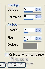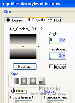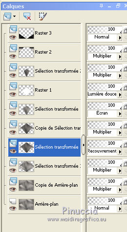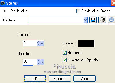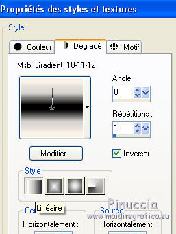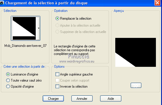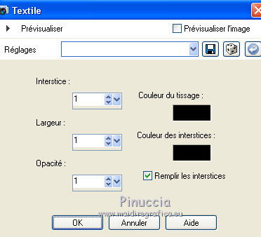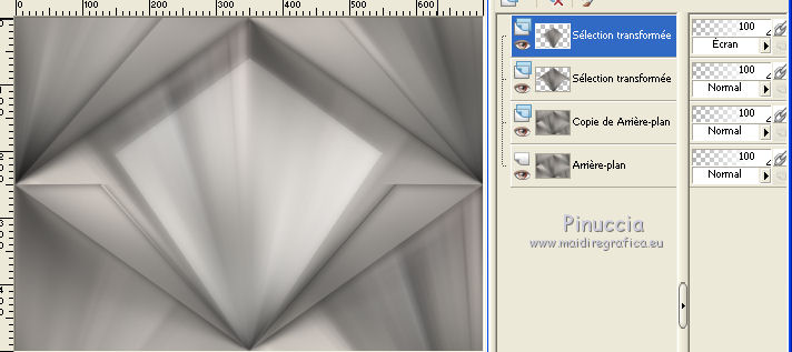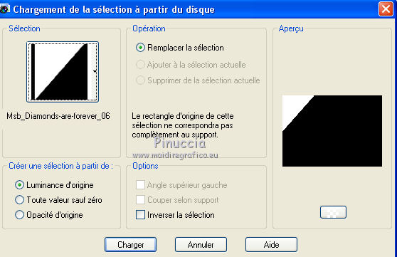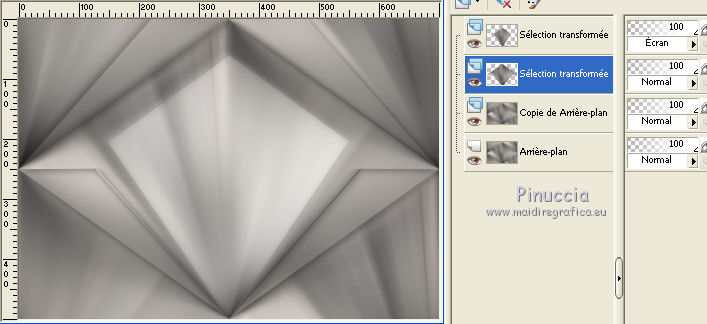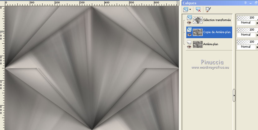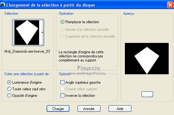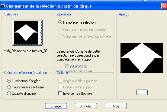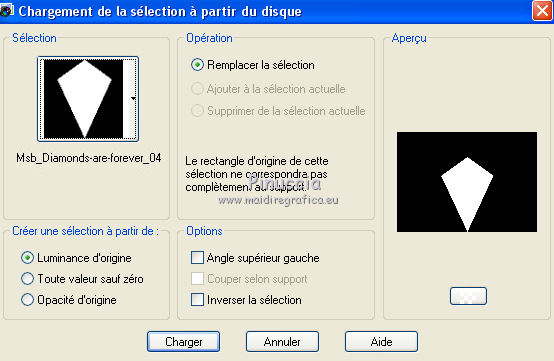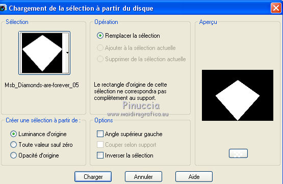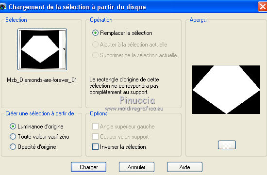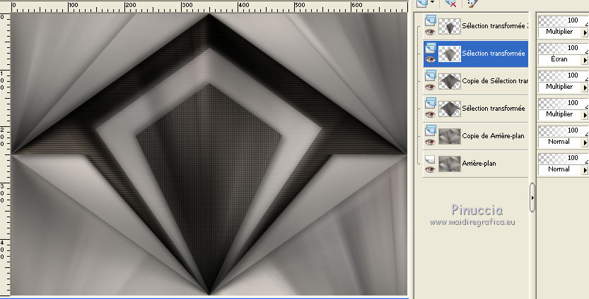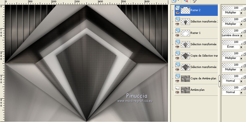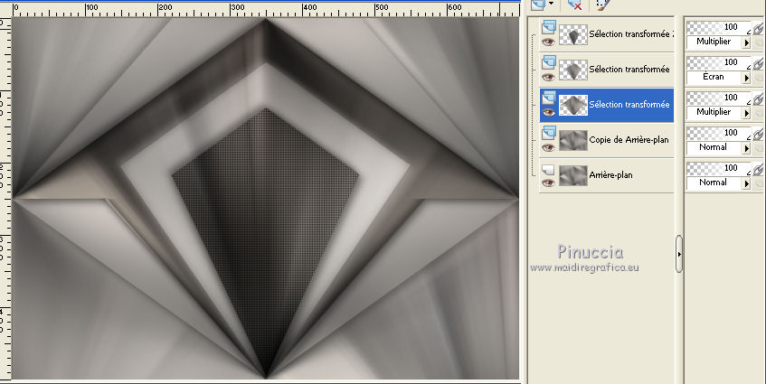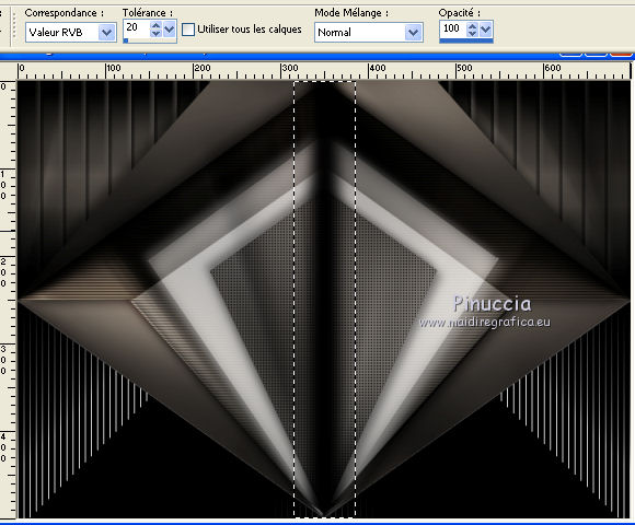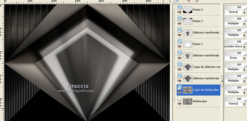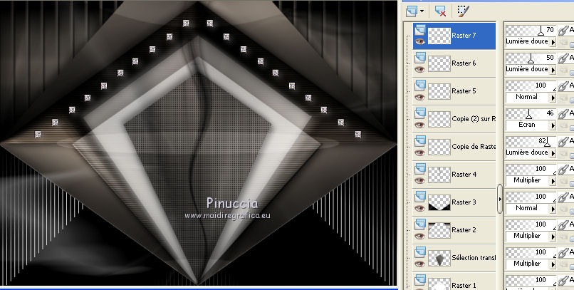 Pour traduire ce tutoriel j'ai utilisé Corel X7 e CorelX2 mais il peut également être exécuté avec les autres versions. Suivant la version utilisée, vous pouvez obtenir des résultats différents. Depuis la version X4, la fonction Image>Miroir a été remplacée par Image>Renverser horizontalement, et Image>Renverser avec Image>Renverser verticalement. Dans les versions X5 et X6, les fonctions ont été améliorées par la mise à disposition du menu Objets. Avec la nouvelle version X7, nous avons à nouveau Miroir/Retourner, mais avec nouvelles différences. Consulter, si vouz voulez, mes notes ici Certaines dénominations ont changées entre les versions de PSP. Les plus frequentes dénominations utilisées: ![]() traduction italienne ici vos versions ici Nécessaire pour réalise le tutoriel: Matériel ici Merci: pour les tubes Annelies et Patries, pour le fractal Sylke. (les liens des sites des tubeuses ici) Modules Externes. consulter, si nécessaire, ma section de filtre ici Filters Unlimited 2.0 ici Tramages - Panel Stripesn Tow the line ici It@lian Editors - Effetto Fantasma ici Simple - Half Wrap (bonus) ici Toadies - Ommadawn ici Graphics Plus - Cross Shadow ici Filtres Tramages, Italian Editors, Simple, Toadies et Graphics Plus peuvent être utilisés seuls ou importés dans Filters Unlimited. voir comment le faire ici). Si un filtre est fourni avec cette icône, ![]() N'hésitez pas à changer le mode mélange des calques et leur opacité selon les couleurs que vous utiliserez Ouvrez les polices et les minimiser. Vous les trouverez dans la liste des polices disponibles lorsque vous en avez besoin. Avec les nouveaux s.o. ce n'est plus possible. Pour utiliser une police, vous devez la copier dans le dossier Fonts de Windows. Placer le dégradé dans le dossier Dégrades. Placer les sélections dans le dossier Sélections. si vous ne voulez pas écouter la musique, presser ESC sur le clavier Placer en avant plan la couleur noire #000000, et en arrière plan la couleur #888784. ![]() Placer en avant plan Dégradé et Sélectionner le dégradé Msb_Gradient_18-6-11-01, style Linéaire. ![]() 1. Ouvrir une nouvelle image transparente 700 x 500 pixels, et remplir du dégradé.Calques>Nouveau calque raster. Sélections>Sélectionner tout. Ouvrir le tube Alies 537-vrouw-17062011 - Édition>Copier. Minimiser le tube: on va s'en servir plus tard Revenir sur votre travail et Édition>Coller dans la sélection. Sélections>Désélectionner tout. Effets>Effets d'image>Mosaïque sans jointures, par défaut. ![]() Calques>Fusionner>Tous. Réglage>Flou>Flou radial. ![]() Effets>Effets d'image>Mosaïque sans jointures, par défaut. Calques>Dupliquer. 2. Sélections>Charger/Enregistrer une sélection>Charger à partir du disque. Chercher et charger la sélection Msb_Diamonds-are-forever_01. ![]() Sélections>Transformer la sélection en calque. Réglage>Flou>Flou gaussien - rayon 25. ![]() Effets>Effets 3D>Ombre portée, couleur noire. ![]() Répéter Ombre portée, mais vertical et horizontal -5. Calques>Fusionner>Fusionner le calque de dessous. Effets>Modules Externes>Filters Unlimited 2.0 - Simple – Half Wrap. Sélections>Désélectionner tout. 3. Sélections>Charger/Enregistrer une sélection>Charger à partir du disque. Chercher et charger la sélection Msb_ Diamonds-are-forever _02. ![]() Sélections>Transformer la sélection en calque. Effets>Effets 3D>Ombre portée, couleur noire. ![]() Répéter Ombre portée, mais vertical et horizontal -5. Sélections>Désélectionner tout. 4. Vous positionner sur le calque central. ![]() Sélections>Charger/Enregistrer une sélection>Charger à partir du disque. Chercher et charger la sélection Msb_ Diamonds-are-forever _03. ![]() Sélections>Transformer la sélection en calque. Calques>Agencer>Placer en haut de la pile. Réglage>Flou>Flou gaussien - rayon 10. ![]() Effets>Effets 3D>Ombre portée, couleur #888784. ![]() Répéter Ombre portée, mais vertical et horizontal -5. Sélections>Désélectionner tout. Changer le calque en mode Écran. ![]() 5. Vous positionner sur le deuxième calque du haut. ![]() Sélections>Charger/Enregistrer une sélection>Charger à partir du disque. Chercher et charger la sélection Msb_ Diamonds-are-forever _04. ![]() Sélections>Transformer la sélection en calque. Calques>Agencer>Placer en haut de la pile. Effets>Effets de textures>Textile. Les deux couleurs: couleur noire. ![]() Sélections>Modifier>Contracter - 1 pixel. Sélections>Inverser. Presser CANC sur le clavier ![]() Sélections>Inverser. Effets>Effets 3D>Ombre portée, couleur noire. ![]() Répéter Ombre portée, mais vertical et horizontal -5. Sélections>Désélectionner tout. Changer le calque en mode Multiplier. Vous positionner sur le calque central. Changer le calque en mode Multiplier. ![]() Rester positionné sur ce calque. Sélections>Charger/Enregistrer une sélection>Charger à partir du disque. Chercher et charger à nouveau la sélection Msb_ Diamonds-are-forever _02. ![]() Effets>Effets de textures>Stores - Couleur noire. ![]() Sélections>Désélectionner tout. Calques>Dupliquer. Sélections>Sélectionner tout. Sélections>Flottante. Sélections>Statique. Sélections>Inverser. Presser 2 fois CANC sur le clavier. Sélections>Désélectionner tout. 6. Vous positionner sur le deuxième calque du haut. ![]() Calques>Nouveau calque raster. Sélections>Charger/Enregistrer une sélection>Charger à partir du disque. Chercher et charger la sélection Msb_ Diamonds-are-forever _05. ![]() Placer en avant plan la couleur blanche #ffffff. Remplir la sélection avec la couleur blanche.Effets>Effets 3D>Ombre portée, couleur noire. ![]() Répéter Ombre portée, mais vertical et horizontal -5. Sélections>Désélectionner tout. Changer le calque en mode Lumière douce. Vous positionner sur le calque du haut de la pile. 7. Placer à nouveau en avant plan la couleur noire. Garder en arrière plan #888784. ![]() Placer en avant plan le dégradé