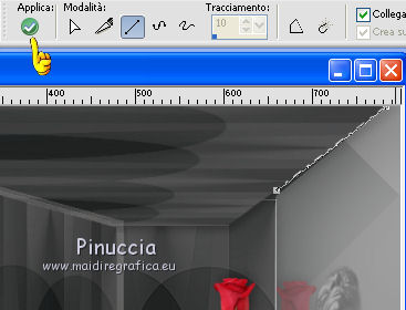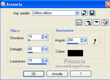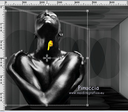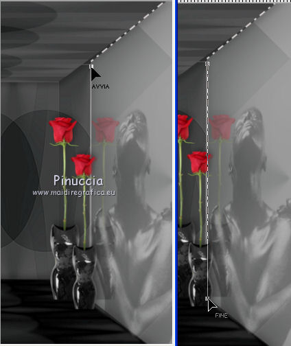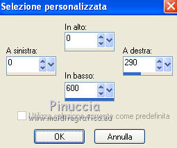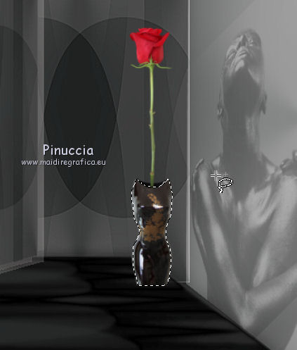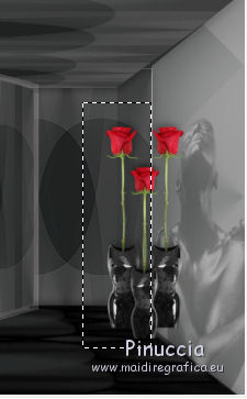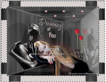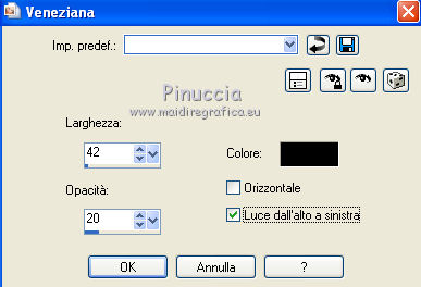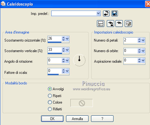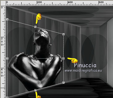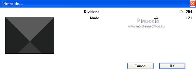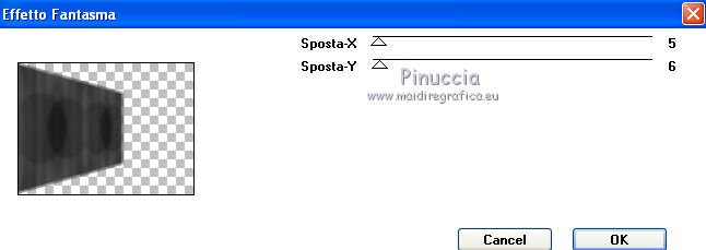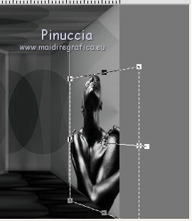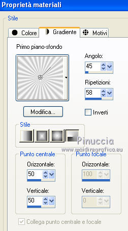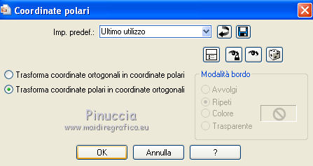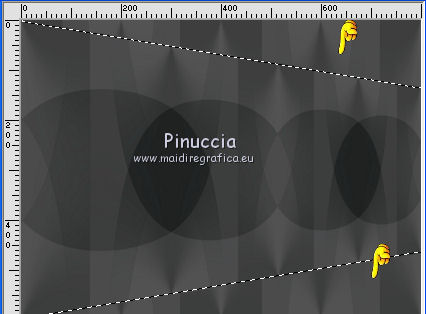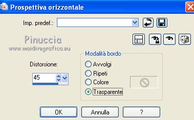 qui puoi trovare qualche risposta ai tuoi dubbi. Se l'argomento che ti interessa non è presente, ti prego di segnalarmelo. Questo tutorial è una creazione ©Meetjesplekje e non può essere copiato su altri siti nè essere offerto per il download. Lo stesso vale per la mia traduzione. Il materiale viene da vari gruppi di condivisione. Il copyright appartiene ai rispettivi autori. Grazie ai creatori dei tubes che mettono a disposizione il loro lavoro in vari gruppi di condivisione. Questo tutorial è stato tradotto con Corel X, ma può essere realizzato anche con le altre versioni di PSP. Dalla versione X4, il comando Immagine>Rifletti è stato sostituito con Immagine>Capovolgi in orizzontale, e il comando Immagine>Capovolgi con Immagine>Capovolgi in verticale. Nelle versioni X5 e X6, le funzioni sono state migliorate rendendo disponibile il menu Oggetti. Con la nuova versione X7, sono tornati Rifletti>Capovolgi, ma con nuove varianti. Vedi la scheda sull'argomento qui traduzione in francese/traduction en français qui/ici le vostre versioni/vos versions qui/ici Occorrente: Materiale qui Per i bei tubes grazie Annelies (in questa pagina trovi i links ai siti dei creatori di tubes) Filtri: consulta, se necessario, la mia sezione filtri qui Filters Unlimited 2.0 qui VM Toolbox - Trimosaic qui It@lian Editors Effect - Effetto Fantasma qui I filtri VM Toolbox e Italian Editors si possono usare da soli o importati in Filters Unlimited (come fare vedi qui) Se un filtro fornito appare con questa icona ![]() non esitare a cambiare modalità di miscelatura e opacità secondo i colori utilizzati. Nelle ultime versioni di PSP non c'è il gradiente di primo piano/sfondo (Corel_06_029) Puoi usare i gradienti delle versioni precedenti. Trovi qui i gradienti Corel X. Metti la selezione nella cartella Selezioni. 1. Imposta il colore di primo piano #000000 (nero), e il colore di sfondo con #c0c0c0. Passa il colore di primo piano a Gradiente, stile Lineare, con i seguenti settaggi. ![]() Se usi altri colori, sperimenta le modalità di miscelatura adatte ai tuoi colori. Apri una nuova immagine trasparente 800 x 600 pixels, e riempila con il gradiente.Selezione>Seleziona tutto. Apri il tube Alies737-man-0412012 e vai a Modifica>Copia. non chiuderlo perchè ti servirà ancora. Torna al tuo lavoro e vai a Modifica>Incolla nella selezione. Selezione>Deseleziona. Effetti>Effetti di immagine>Motivo unico, con i settaggi standard. ![]() Regola>Sfocatura>Sfocatura gaussiana - raggio 50. ![]() 2. Livelli>Duplica. Effetti>Plugins>VM Toolbox - Trimosaic. ![]() Livelli>Duplica. Immagine>Capovolgi. Abbassa l'opacità di questo livello al 50%. Livelli>Unisci>Unisci giù. Di nuovo: Effetti>Effetti di immagine>Motivo unico, con i settaggi standard. ![]() 3. Livelli>Duplica. Effetti>Effetti di distorsione>Coordinate polari. ![]() Livelli>Duplica. Immagine>Capovolgi. Abbassa l'opacità di questo livello al 50%. Livelli>Unisci>Unisci giù. Livelli>Duplica. Effetti>Effetti geometrici>Prospettiva orizzontale. ![]() Se i colori ti sembrano abbastanza trasparenti, puoi saltare il prossimo passaggio. Seleziona le parti in alto e in basso con la bacchetta magica ![]() ![]() Selezione>Modifica>Espandi - 3 pixels. Premi sulla tastiera il tasto CANC. Selezione>Deseleziona. Adesso i colori dovrebbero essere più trasparenti. Se non visualizzi i righelli, vai a Visualizza>Righelli. Attiva lo strumento Puntatore (tasto K)deformazione se stai usando PSP 9,oppure premi sulla tastiera il tasto D, valido per tutti gli strumenti e - in modalità Scala - spingi il nodo centrale a destra all'interno fino a 480 pixels. ![]() 4. Livelli>Duplica. Immagine>Ruota per gradi - 90 gradi a destra. ![]() Attiva nuovamente lo strumento Puntatore o Deformazione (D), passa il mouse sull'immagine e, quando vedi l'icona dello strumento Spostamento, sposta l'immagine contro il bordo. ![]() in modalità Scala tira il nodo centrale a destra, fino al bordo. ![]() Sempre in modalità scala, spingi in alto il nodo inferiore centrale fino a 135 pixels. ![]() Effetti>Effetti 3D>Sfalsa ombra, con il colore nero. ![]() Livelli>Disponi>Sposta giù. Livelli>Duplica. Immagine>Capovolgi. Effetti>Effetti di trama>Arenaria, colore nero. ![]() Livelli>Unisci>Unisci giù. 5. Attiva il livello centrale. ![]() Immagine>Ridimensiona, al 65%, tutti i livelli non selezionato. Lascialo come sta. Non spostarlo. Effetti>Effetti di bordo>Aumenta. Effetti>Effetti 3D>Sfalsa ombra, con il colore nero. ![]() Attiva nuovamente il livello superiore. Effetti>Effetti di trama>Veneziana, colore nero. ![]() Regola>Messa a fuoco>Metti a fuoco. Livelli>Duplica. Imposta il colore di sfondo con #d7d1cf (il colore di sfondo influenza il risultato del filtro Effetto Fantasma). Effetti>Plugins>It@lian Editors Effect - Effetto Fantasma. ![]() Regola>Messa a fuoco>Metti a fuoco. Livelli>Disponi>Sposta giù. Attiva il livello superiore. Livelli>Unisci>Unisci giù. 6. Colore di primo piano bianco #ffffff, imposta nuovamente il colore di sfondo con #c0c0c0. Passa il colore di primo piano a Gradiente, stile Radiale, ![]() Livelli>Nuovo livello raster. Selezione>Carica/Salva selezione>Carica selezione da disco. Cerca e carica la selezione Msb_Sel_dreaming-of-you01. ![]() Riempi la selezione con il gradiente.Regola>Sfocatura>Sfocatura gaussiana - raggio 50. ![]() Selezione>Deseleziona. Abbassa l'opacità di questo livello al 53%. 7. Attiva nuovamente il tube Alies737-man-04012012 e vai a Modifica>Copia. Torna al tuo lavoro e vai a Modifica>Incolla come nuovo livello. Immagine>Ridimensiona, all'85%, tutti i livelli non selezionato. Attiva nuovamente lo strumento Puntatore o Deformazione (D), passa il mouse sull'immagine e, quando vedi l'icona dello strumento Spostamento, posiziona l'immagine a sinistra. ![]() In modalità Prospettiva, spingi verso l'interno uno dei due nodi esterni (il nodo opposto si sposterà simmetricamente). ![]() In modalità Scala, usa i nodi centrali per adattare l'immagine allo spazio 