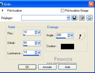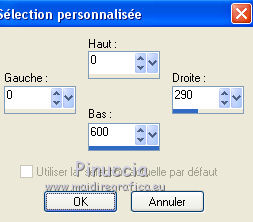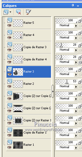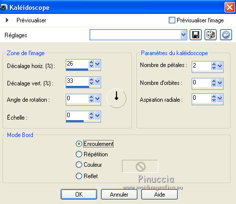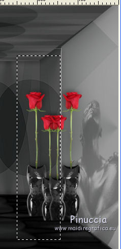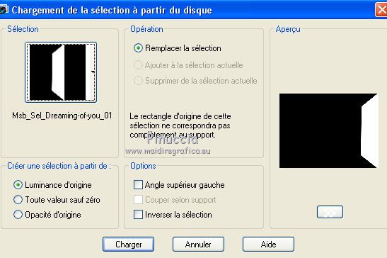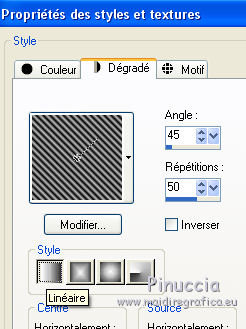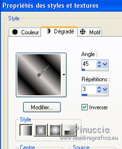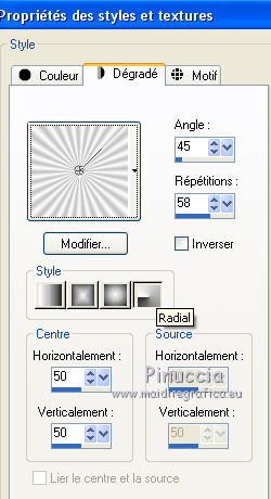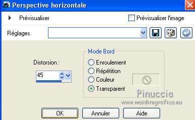 qui puoi trovare qualche risposta ai tuoi dubbi. Se l'argomento che ti interessa non è presente, ti prego di segnalarmelo. Ce tutoriel a été créé avec Corel X3 et traduit avec Corel X2, mais il peut également être exécuté avec les autres versions. Suivant la version utilisée, vous pouvez obtenir des résultats différents. Depuis la version X4, la fonction Image>Miroir a été remplacée par Image>Renverser horizontalment, et Image>Renverser avec Image>Renverser verticalemente. Dans les versions X5 et X6, les fonctions ont été améliorées par la mise à disposition du menu Objets. Avec la nouvelle version X7, nous avons à nouveau Miroir/Retourner, mais avec nouvelles différences. Consulter, si vouz voulez, mes notes ici Certaines dénominations ont changées entre les versions de PSP. Les plus frequentes dénominations utilisées: ![]() traduction italienne ici vos versions ici Nécessaire pour réaliser le tutoriel: Matériel ici Merci pour les tubes Annelies (les liens des sites des tubeuses ici) Modules Externes. consulter, si nécessaire, ma section de filtre ici Filters Unlimited 2.0 ici VM Toolbox - Trimosaic ici It@lian Editors Effect - Effetto Fantasma ici Filtres VM Toolbox et Italian Editors peuvent être utilisés seuls ou importés dans Filters Unlimited. voir comment le faire ici). Si un filtre est fourni avec cette icône, ![]() N'hésitez pas à changer le mode mélange des calques et leur opacité selon les couleurs que vous utiliserez. Dans les plus récentes versions de PSP, vous ne trouvez pas le dégradé d'avant plan/arrière plan ou Corel_06_029. Vous pouvez utiliser le dégradé des versions antérieures. Ici le dossier Dégradés de CorelX. Placer la sélection dans le dossier Sélections. 1. Placer en avant plan la couleur #000000 (noir), et en arrière plan la couleur #c0c0c0. ![]() Préparer en avant plan un dégradé de premier plan/arrière plan, style Linéaire, avec ces réglages. ![]() Ouvrir une nouvelle image transparente 800 x 600 pixels, et remplir du dégradéSélections>Sélectionner tout. Ouvrir le tube Alies737-man-0412012 - Édition>Copier. ne pas fermer le tube; on va s'en servir plus tard. Revenir sur votre travail et Édition>Coller dans la sélection. Sélections>Désélectionner tout. Effets>Effets d'image>Mosaïque sans jointures, par défaut. ![]() Réglage>Flou>Flou gaussien - rayon 50. ![]() 2. Calques>Dupliquer. Effets>Modules Externes>VM Toolbox - Trimosaic. ![]() Calques>Dupliquer. Image>Renverser. Réduire l'opacité de ce calque à 50%. Calques>Fusionner>Fusionner le calque de dessous. À nouveau: Effets>Effets d'image>Mosaïque sans jointures, par défaut. ![]() 3. Calques>Dupliquer. Effets>Effets de distorsion>Coordonnées polaires. ![]() Calques>Dupliquer. Image>Renverser. Réduire l'opacité de ce calque à 50%. Calques>Fusionner>Fusionner le calque de dessous. Calques>Dupliquer. Effets>Effets géométriques>Perspective horizontale. ![]() Si vous voyez vos couleur assez transparentes, vous pouvez sauter la prochaine étape. Activer l'outil baguette magique ![]() et cliquer sur les parties en haut et en bas pour les sélectionner. ![]() Sélections>Modifier>Agrandir - 3 pixels. Presser CANC sur le clavier .Sélections>Désélectionner tout. Et maintenant les couleurs devraient être plus transparentes. Si vous ne visualisez pas les réglage: Affichage>Régles. Touche K pour activer l'outil Sélecteur ![]() si vous utiliser PSP 9, touche D pour activer l'outil Déformation ![]() en mode Échelle ![]() pousser le noeud central à droite vers la gauche, jusqu'à 480 pixels. ![]() 4. Calques>Dupliquer. Image>Rotation libre - 90 degrés à droite. ![]() Activer à nouveau l'outil Sélecteur (K) ou Déformation (D), glisser la sourir sur l'image et, lorsque vous voyez l'icone de l'outil Déplacement, déplacer l'image contre le bord. ![]() en mode Échelle pousser le noeud central à droite jusqu'au bord. ![]() Enfin, toujours en mode Échelle, pousser le noeud inférieur central vers le haut, jusqu'à 135 pixels. ![]() Effets>Effets 3D>Ombre portée, couleur noire. ![]() Calques>Agencer>Déplacer vers le bas. Calques>Dupliquer. Image>Renverser. Effets>Effets de textures>Grès, couleur noire. ![]() Calques>Fusionner>Fusionner le calque de dessous. 5. Vous positionner sur le calque centrale. ![]() Image>Redimensionner, à 65%, redimensionner tous les calques décoché. Ne pas déplacer. Effets>Effets de bords>Accentuer. Effets>Effets 3D>Ombre portée, couleur noire. ![]() Vous positionner à nouveau sur le calque du haut de la pile. Effets>Effets de textures>Stores, couleur noire. ![]() Réglage>Netteté>Netteté. Calques>Dupliquer. Placer en arrière plan la couleur #d7d1cf Effets>Modules Externes>It@lian Editors Effect - Effetto Fantasma. ![]() Réglage>Netteté>Netteté. Calques>Agencer>Déplacer vers le bas. Vous positionner sur le calque du haut de la pile. Calques>Fusionner>Fusionner le calque de dessous. 6. Placer en avant plan la couleur blanche #ffffff, et en arrière plan à nouveau la couleur #c0c0c0. ![]() Préparer en avant plan un dégradé de premier plan/arrière plan, style Radial, ![]() Calques>Nouveau calque raster. Sélections>Charger/Enregistrer une sélection>Charger à partir du disque. Chercher et charger la sélection Msb_Sel_dreaming-of-you01. ![]() Remplir la sélection du dégradé.Réglage>Flou>Flou gaussien - rayon 50. ![]() Sélections>Désélectionner tout. Réduire l'opacité de ce calque à 53%. 7. Activer à nouveau le tube Alies737-man-04012012 - Édition>Copier. Revenir sur votre travail et Édition>Coller comme nouveau calque. Image>Redimensionner, à 85%, redimensionner tous les calques décoché. Touche K/D pour activer l'outil Sélecteur/Déformation, déplacer l'image à gauche ![]() en mode Perspective ![]() pousser vers l'intérieur un des deux noeuds extérieurs (le noeud contraire se déplacera symétriquement) ![]() En mode Échelle ![]() utiliser les noeuds centraux pour adap