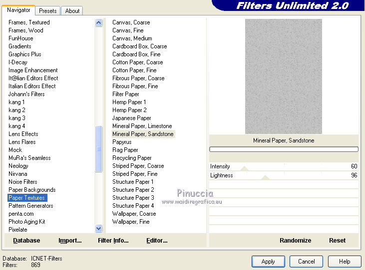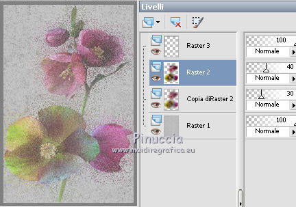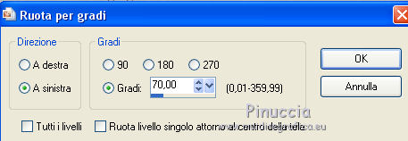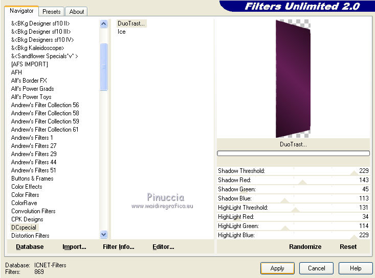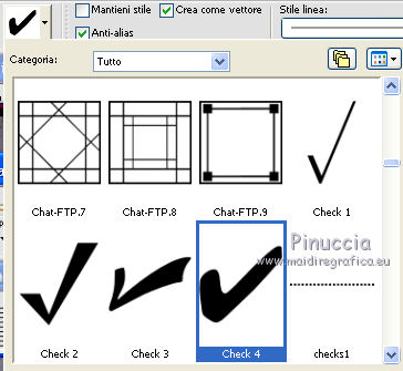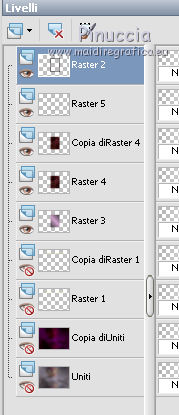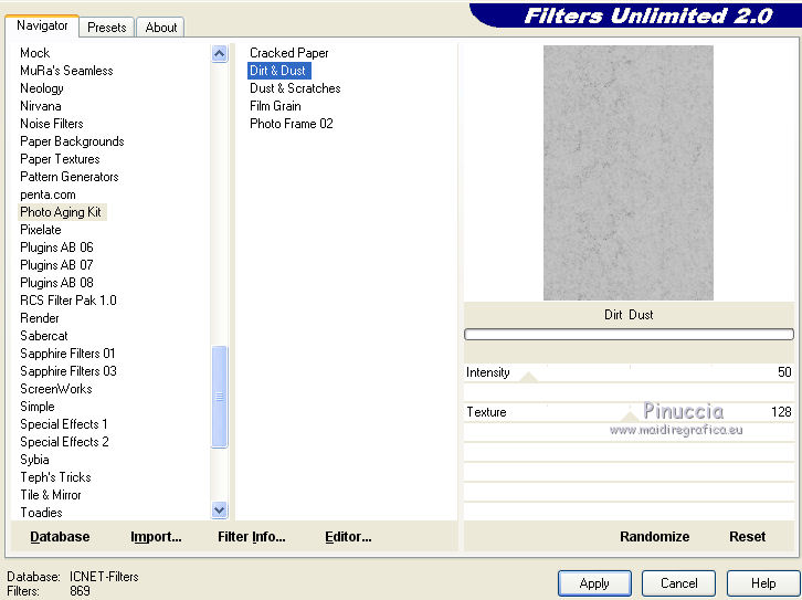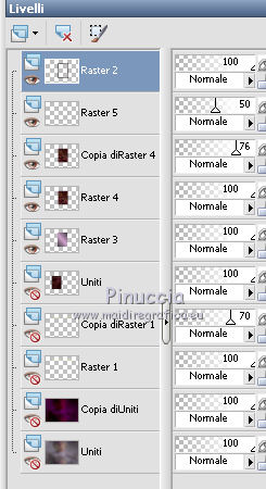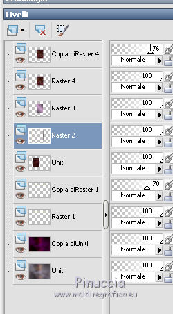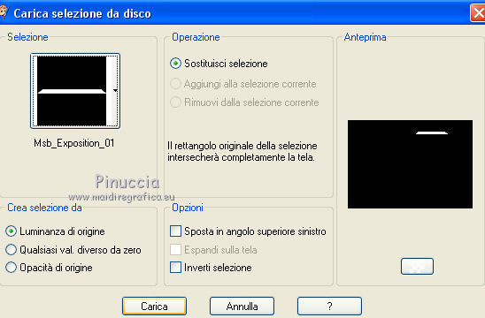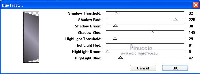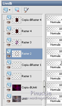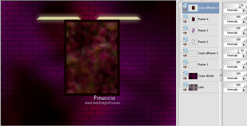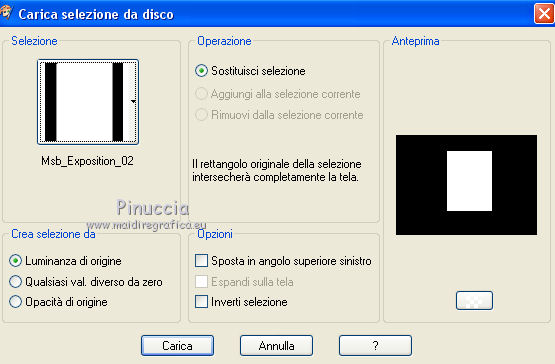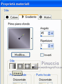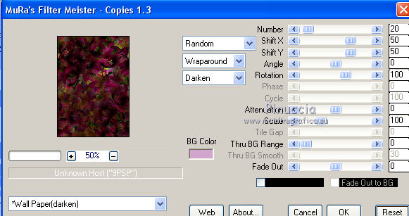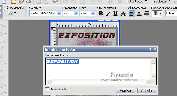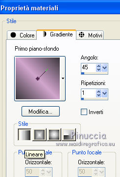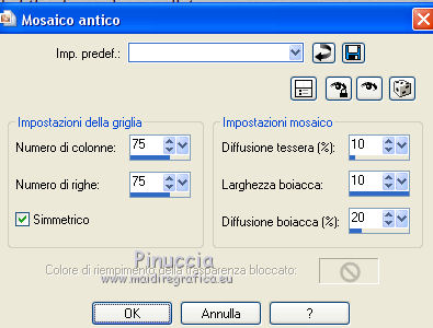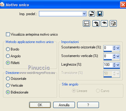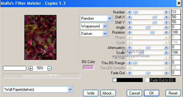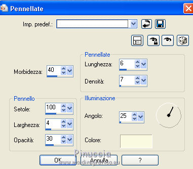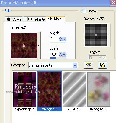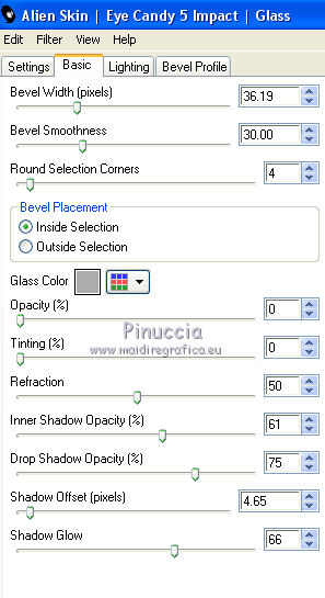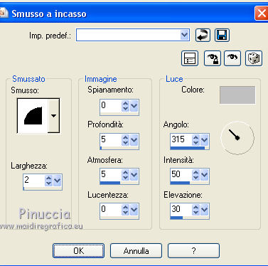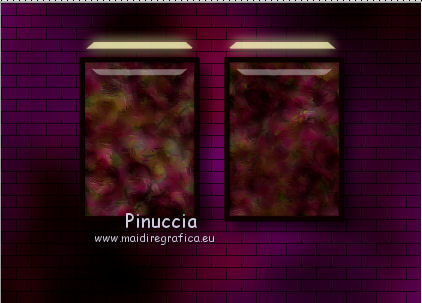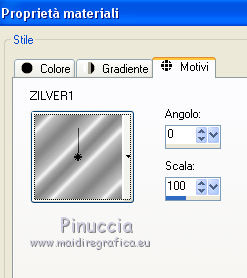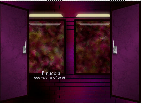 qui puoi trovare qualche risposta ai tuoi dubbi. Se l'argomento che ti interessa non è presente, ti prego di segnalarmelo. Questo tutorial è una creazione ©Meetjesplekje e non può essere copiato su altri siti nè essere offerto per il download. Lo stesso vale per la mia traduzione. Il materiale viene da vari gruppi di condivisione. Il copyright appartiene ai rispettivi autori. Grazie ai creatori dei tubes che mettono a disposizione il loro lavoro in vari gruppi di condivisione. Per tradurre questo tutorial ho usato PSP X3 per l'immagine in alto e PSP X per l'immagine in fondo al tutorial. Occorrente: Materiale qui Per il tube della donna grazie Maxyran Per il tube del fiore grazie Judy. Filtri: consulta, se necessario, la mia sezione filtri qui Filters Unlimited 2.0 qui DC Special qui Photo Aging Kit - Dirt and Dust qui Mura's Meister - Copies qui Alien Skin Eye Candy 5 Impact - Glass qui Graphics Plus - Cross Shadow qui I filtri DC Special e Graphics Plus si possono usare da soli o importati in Filters Unlimited (come fare vedi qui) Se un filtro fornito appare con questa icona ![]() Se stai usando altri colori puoi sperimentare le modalità di miscelatura e le opacità più adatte ai tuoi colori. Apri i font e minimizzali. Li troverai nella lista dei font disponibili quando ti servirà. Con i nuovi sistemi operativi questo non è più possibile. Per usare un font occorre copiarlo nella cartella Fonts di Windows. Metti le forme objecten.jsl nella cartella Forme predefinite. Metti il motivo ZILVER1 nella cartella Motivi. Se preferisci, puoi aprirlo in PSP e minimizzarlo. Quando ti servirà impostarlo, lo troverai nel menu dei Motivi sotto la categoria "Immagini aperte". Metti le selezioni nella cartella Selezioni. 1. Imposta il colore di primo piano con #3d383d, e il colore di sfondo con #a19caf. ![]() Passa il colore di primo piano a Gradiente di primo piano/sfondo, stile Lineare. ![]() Apri una nuova immagine trasparente 700 x 500 pixels, e riempila con il gradiente.Regola>Sfocatura>Sfocatura gaussiana - raggio 25. ![]() 3. Livelli>Nuovo livello raster. Selezione>Seleziona tutto. Apri il tube Maxyran_17_01_010 Woman182 e vai a Modifica>Copia. non chiuderlo perchè ti servirà ancora Torna al tuo lavoro e vai a Modifica>Incolla nella selezione. Selezione>Deseleziona. Effetti>Effetti di immagine>Motivo unico. ![]() Regola>Sfocatura>Sfocatura gausisana - raggio 25. Livelli>Unisci>Unisci visibile. 4. Livelli>Duplica. Effetti>Plugins>DC Special - Brix. ![]() 5. Livelli>Nuovo livello raster. Selezione>Carica/Salva selezione>Carica selezione da disco. Cerca e carica la selezione Msb_Exposition_01. ![]() Imposta il colore di primo piano con #ffffc0, e riempi la selezione con questo colore.Selezione>Deseleziona. Livelli>Duplica. Immagine>Rifletti. Livelli>Unisci>Unisci giù. Livelli>Duplica. Attiva il livello sottostante dell'originale. Regola>Sfocatura>Sfocatura gaussiana - raggio 10. ![]() Attiva il livello superiore. Abbassa l'opacità di questo livello al 70%. Effetti>Effetti 3D>Sfalsa ombra, colore nero. ![]() 6. Livelli>Nuovo livello raster. Selezione>Carica/Salva selezione>Carica selezione da disco. Cerca e carica la selezione Msb_Exposition_02. ![]() Imposta il colore di primo piano con #160003, e riempi la selezione con questo colore.Selezione>Modifica>Contrai - 10 pixels. Premi sulla tastiera il tasto CANC ![]() Livelli>Nuovo livello raster. Imposta nuovamente il colore di primo piano con #3d383d, e il colore di sfondo con #d2a5ce. ![]() Passa il colore di primo piano a Gradiente, con i settaggi precedenti. ![]() Riempi la selezione con il gradiente.Livelli>Nuovo livello raster. Apri il tube JB_Flower e vai a Modifica>Copia. non chiuderlo perchè ti servirà ancora Torna al tuo lavoro e vai a Modifica>Incolla nella selezione. Mantieni selezionato. Effetti>Plugins>Mura's Meister - Copies. ![]() ricorda che "random" significa "casuale". Per questo il tuo risultato potrebbe essere non esattamente uguale al mio Mantieni sempre selezionato. Livelli>Duplica. Effetti>Effetti tecniche di disegno>Pennellate - colore #f9f9e1. ![]() Abbassa l'opacità di questo livello al 76%. Regola>Messa a fuoco>Metti a fuoco. Selezione>Deseleziona. ![]() 7. Attiva il livello della cornice (il quarto livello dall'alto). ![]() Attiva lo strumento Bacchetta magica ![]() e clicca al centro della cornice per selezionarla. Dovrai cliccare due volte per eliminare la piccola selezione visibile dopo il primo clic. Selezione>Inverti. Selezione>Mobile. Selezone>Immobilizza. Effetti>Effetti 3D>Smusso a incasso, colore #c0c0c0. ![]() Selezione>Deseleziona. Clicca nuovamente nella cornice per selezionarla con la bacchetta magica ![]() (come prima dovrai cliccare due volte per selezionarla completamente) Attiva il livello superiore. Livelli>Nuovo livello raster. Effetti>Plugins>Alien Skin Eye Candy 5 Impact - Glass. Settings: Clear - Basic: ![]() Abbassa l'opacità di questo livello al 50%. Attiva il livello della cornice. Livelli>Disponi>Porta in alto. Selezione>Deseleziona. Chiudi i livelli inferiori e lascia visibili i livelli interessati alla cornice ![]() Livelli>Unisci>Unisci visibile. Livelli>Visualizza>Tutto e rimani posizionato sul livello Uniti. Immagine>Ridimensiona, al 90%, tutti i livelli non selezionato. Sposta la cornice in alto a destra, sotto la striscia gialla. 8. Livelli>Nuovo livello raster. Selezione>Carica/Salva selezione>Carica selezione da disco. Carica nuovamente la selezione Msb_Exposition_02. ![]() Imposta il colore di primo piano con #160003, e riempi la selezione con questo colore.Selezione>Modifica>Contrai - 10 pixels. Premi sulla tastiera il tasto CANC. Livelli>Nuovo livello raster. Imposta il colore di primo piano con #3d383d, e il colore di sfondo con #d2a5ce. Passa il colore di primo piano a Gradiente di primo piano/sfondo, stile Lineare. ![]() Riempi la selezione con il gradiente.Livelli>Nuovo livello raster. Attiva nuovamente il tube JB_Flower e vai a Modifica>Copia. Torna al tuo lavor