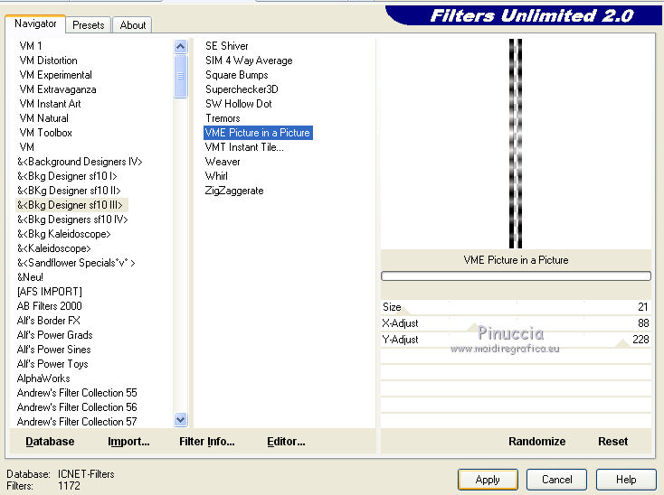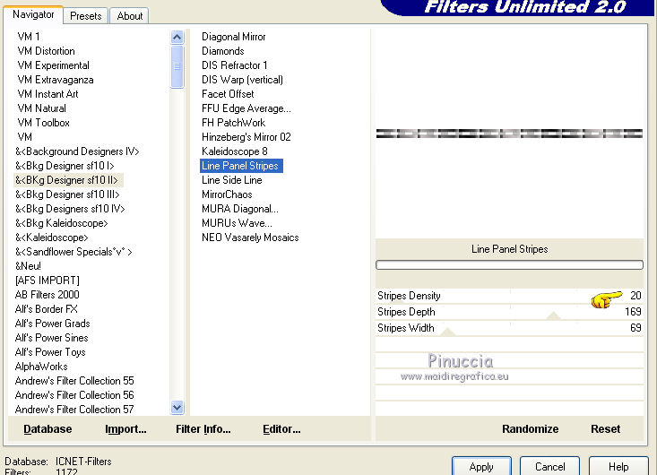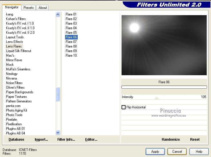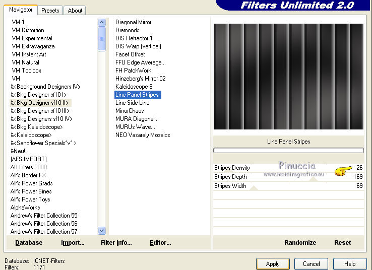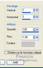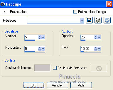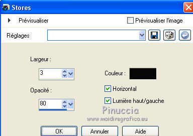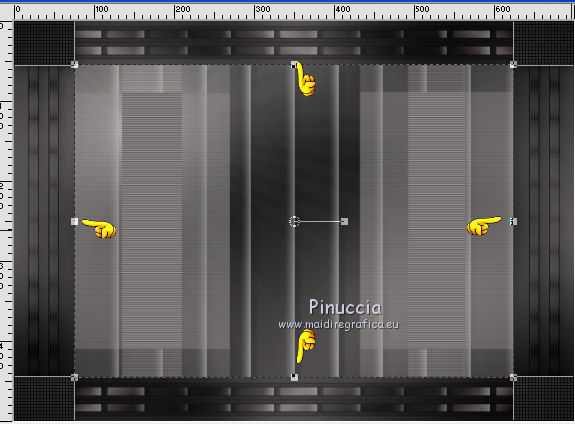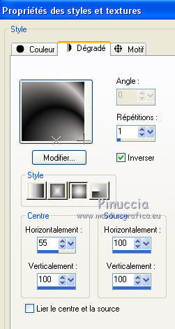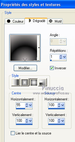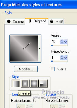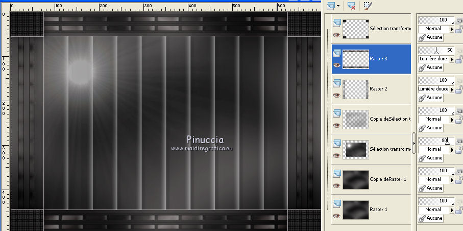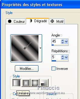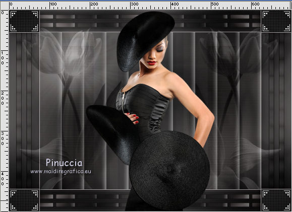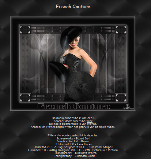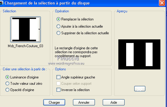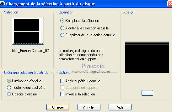 qui puoi trovare qualche risposta ai tuoi dubbi. Se l'argomento che ti interessa non è presente, ti prego di segnalarmelo. Pour traduire ce tutoriel j'ai utilisé Corel X2, mais il peut également être exécuté avec les autres versions. Suivant la version utilisée, vous pouvez obtenir des résultats différents. Depuis la version X4, la fonction Image>Miroir a été remplacée par Image>Renverser horizontalement, et Image>Renverser avec Image>Renverser verticalement. Dans les versions X5 et X6, les fonctions ont été améliorées par la mise à disposition du menu Objets. Avec la nouvelle version X7, nous avons à nouveau Miroir/Retourner, mais avec nouvelles différences. Consulter, si vouz voulez, mes notes ici Certaines dénominations ont changées entre les versions de PSP. Les plus frequentes dénominations utilisées: ![]() traduction italienne ici vos versions iciNécessaire pour réalise le tutoriel: Matériel ici Pour les tubes merci Alies et H@nne. (les liens des sites des tubeuses ici) Modules Externes. consulter, si nécessaire, ma section de filtre ici Filters Unlimited 2.0 ici Cybia - Screenworks ici Simple - top Left Mirror ici &<Bkg Designer sf10II> - Line Panel Stripes (da importare in Unlimited) ici &<Bkg Designer sf10III> - WME Picture in a Picture (da importare in Unlimited) ici Transparency - Eliminate White ici Transparency - Eliminate Black ici I filtri Screenworks, Simple et Transparency peuvent être utilisés seuls ou importés dans Filters Unlimited. voir comment le faire ici). Si un filtre est fourni avec cette icône, ![]() N'hésitez pas à changer le mode mélange des calques et leur opacité selon les couleurs que vous utiliserez Dans les plus récentes versions de PSP, vous ne trouvez pas le dégradé d'avant plan/arrière plan ou Corel_06_029. Vous pouvez utiliser le dégradé des versions antérieures. Ici le dossier Dégradés de CorelX. Ouvrez la police et la minimiser. Vous la trouverez dans la liste des polices disponibles lorsque vous en avez besoin. Avec les nouveaux s.o. ce n'est plus possible. Pour utiliser une police, vous devez la copier dans le dossier Fonts de Windows. Placer les sélections dans le dossier Sélections. Placer en avant plan la couleur #080808, et en arrière plan la couleur #cbc4c4. ![]() Préparer en avant plan un dégradé de premier plan/arrière plan, style Halo. ![]() Ne vous inquiètez pas si le dégradé vous semble différent; vous pouvez vérifier le bon dégradé dans la palette. ![]() 1. Ouvrir une nouvelle image transparente 700 x 500 pixels. Remplir l'image transparente du dégradé.Effets>Effets d'image>Mosaïque sans jointures, par défaut. ![]() Réglage>Flou>Flou gaussien, rayon 40. ![]() Calques>Dupliquer. 2. Activer l'outil Sélection ![]() (peu importe le type de sélection, parce que avec la sélection personnalisée vous obtenez toujours un rectangle), cliquer sur Sélection personnalisée ![]() et setter ces paramètres. ![]() Sélections>Transformer la sélection en calque. Effets>Modules Externes>Screenworks - Boxed Dot. ![]() Sélections>Désélectionner tout. Effets>Effets 3D>Ombre portée, couleur d'arrière plan. ![]() Effets>Effets 3D>Ombre portée, couleur noire. ![]() Effets>Modules Externes>Simple - Top Left Mirror. ![]() 3. Vous positionner sur le calque de dessous. Sélection personnalisée ![]() ![]() Sélections>Transformer la sélection en calque. Calques>Dupliquer. Vous positionner sur le calque de dessous de l'original. Effets>Modules Externes>Filters Unlimited 2.0 - Lens Flares - Flare 6. ![]() Réduire l'opacité de ce calque à 80%. 4. Vous positionner sur le calque de dessus de la copie. Effets>Modules Externes>Filters Unlimited 2.0 - &<Bkg Designer sf10II> – Line Panel Stripes. ![]() Effets>Modules Externes>Transparency - Eliminate Black. Effets>Effets 3D>Ombre portée, couleur d'arrière plan. ![]() Répéter Ombre portée, vertical et horizontal -1. Sélections>Désélectionner tout. Effets>Effets 3D>Ombre portée, couleur noire. ![]() Vous positionner sur le calque du haut de la pile. 5. Calques>Nouveau calque raster. Sélections>Charger/Enregistrer une sélection>Charger à partir du disque. Chercher et charger la sélection Msb_French-Couture_01. ![]() Placer en avant plan la Couleur. Remplir la sélection avec la couleur d'avant plan.Sélections>Modifier>Contracter - 1 pixels. Préparer en avant plan un dégradé de premier plan/arrière plan, style Linéaire. ![]() Remplir la sélection du dégradé.Effets>Modules Externes>Filters Unlimited 2.0 - &<Bkg Designer sf10III> – VME Picture in a Picture, par défaut. ![]() Effets>Modules Externes>Transparency - Eliminate White. Sélections>Désélectionner tout. Calques>Dupliquer. Image>Miroir. Calques>Fusionner>Fusionner le calque de dessous. Placer le calque en mode Lumière douce. Effets>Effets 3D>Ombre portée, couleur noire. ![]() Calques>Agencer>Déplacer vers le bas. Vous positionner à nouveau sur le calque du haut de la pile. 6. Calques>Nouveau calque raster. Sélections>Charger/Enregistrer une sélection>Charger à partir du disque. Chercher et charger la sélection Msb_French-Couture_02. ![]() Placer en avant plan la Couleur. Remplir la sélection avec la couleur d'avant plan.Sélections>Modifier>Contracter - 1 pixels. Préparer en avant plan le dégradé de premier plan/arrière plan, style Linéaire. ![]() Remplir la sélection du dégradé.Effets>Modules Externes>Filters Unlimited 2.0 - &<Bkg Designer sf10II> – Line Panel Stripes. ![]() Sélections>Désélectionner tout. 7. Calques>Dupliquer. Vous positionner sur le calque de dessous de l'original. Effets>Modules Externes>Filters Unlimited 2.0 - Toadies What Are you. ![]() Effets>Effets 3D>Ombre portée, couleur noire. ![]() Répéter Ombre portée, vertical et horizontal -1. Vous positionner sur le calque du haut de la pile de la copie. Calques>Fusionner>Fusionner le calque de dessous. Calques>Agencer>Déplacer vers le bas (au dessous du calque des angles