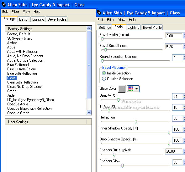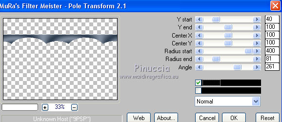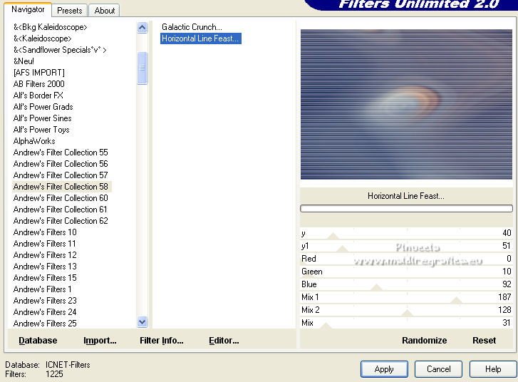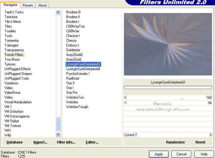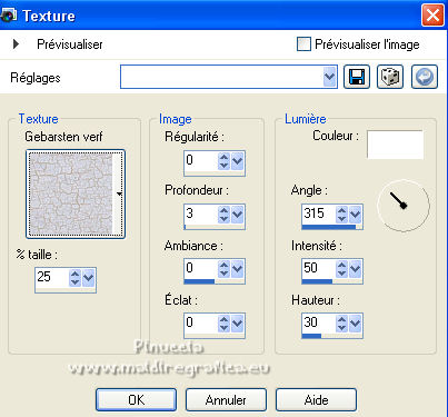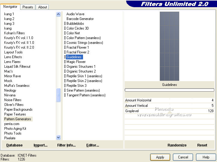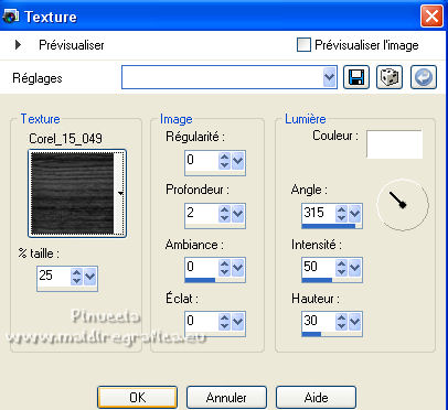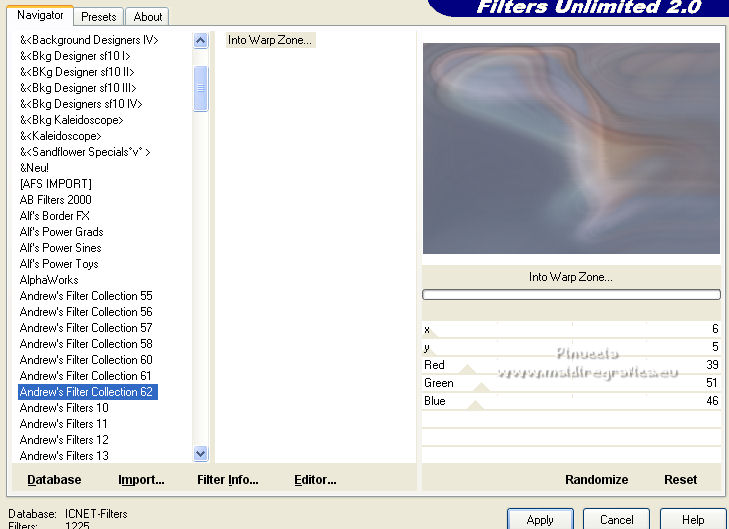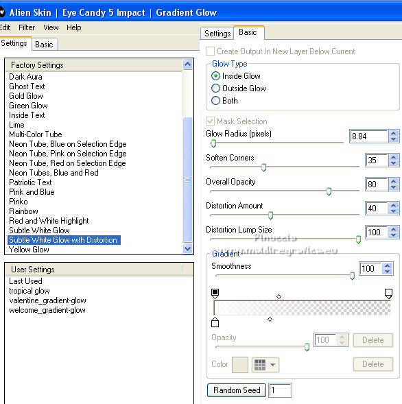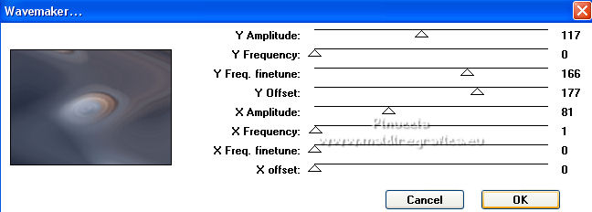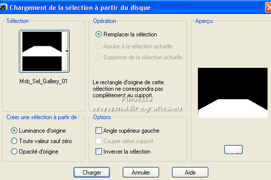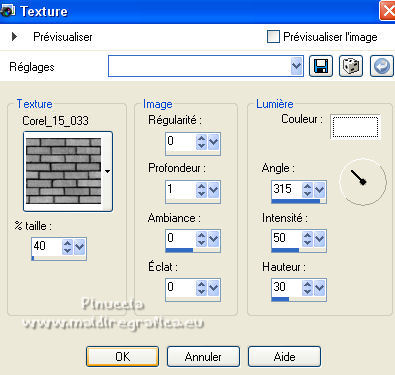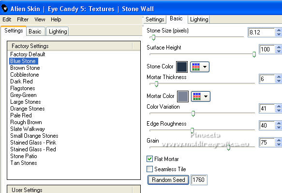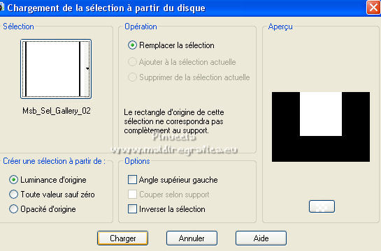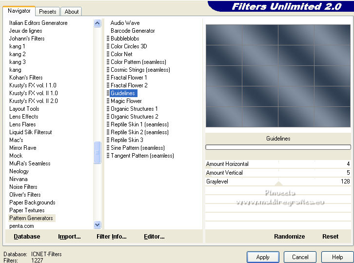 qui puoi trovare qualche risposta ai tuoi dubbi. Se l'argomento che ti interessa non è presente, ti prego di segnalarmelo. Pour traduire ce tutoriel j'ai utilisé Corel X2, mais il peut également être exécuté avec les autres versions. Suivant la version utilisée, vous pouvez obtenir des résultats différents. Depuis la version X4, la fonction Image>Miroir a été remplacée par Image>Renverser horizontalement, et Image>Renverser avec Image>Renverser verticalement. Dans les versions X5 et X6, les fonctions ont été améliorées par la mise à disposition du menu Objets. Avec la nouvelle version X7, nous avons à nouveau Miroir/Retourner, mais avec nouvelles différences. Consulter, si vouz voulez, mes notes ici Certaines dénominations ont changées entre les versions de PSP. Les plus frequentes dénominations utilisées: ![]() traduction italienne ici vos versions iciNécessaire pour réalise le tutoriel: Matériel ici Pour les tubes merci Liza et Nurso. (les liens des sites des tubeuses ici) Modules Externes. consulter, si nécessaire, ma section de filtre ici Filters Unlimited 2.0 ici Unplugged Tools - Lomo, Wavemaker ici Andrew's Filter Collection 58 - Horizontal Line Feast ici Andrew's Filter Collection 62 - Into Warp Zone ici Trond Filters - LyserginSyreDietylamid 3 ici Alien Skin Eye Candy 5 Texture - Stone Wall ici Alien Skin Eye Candy 5 Impact - Glass, Gradient Glow ici Mura's Meister - Pole Transform ici Graphics Plus - Cross Shadow ici I filtri Graphics Plus peuvent être utilisés seuls ou importés dans Filters Unlimited. voir comment le faire ici). Si un filtre est fourni avec cette icône, ![]() N'hésitez pas à changer le mode mélange des calques et leur opacité selon les couleurs que vous utiliserez Dans les plus récentes versions de PSP, vous ne trouvez pas le dégradé d'avant plan/arrière plan ou Corel_06_029. Vous pouvez utiliser le dégradé des versions antérieures. Ici le dossier Dégradés de CorelX. Ouvrez la police et la minimiser. Vous les trouverez dans la liste des polices disponibles lorsque vous en avez besoin. Avec les nouveaux s.o. ce n'est plus possible. Pour utiliser une police, vous devez la copier dans le dossier Fonts de Windows. Placer les sélection dans le dossier Sélections. Placer la texture Gebarsten verf dans le dossier Textures. Les textures Briques ou Corel_15_033 et Grain de bois ou Corel_15_049 sont standard dans PSP. Si vous ne les trouvez pas dans votre PSP, placer les tectures fournies dans le dossier Textures. Placer en avant plan la couleur #233245, et en arrière plan la couleur #7c8497. ![]() Préparer en avant plan un dégradé de premier plan/arrière plan, style Linéaire. ![]() 1. Ouvrir une nouvelle image transparente 700 x 500 pixels. Remplir l'image transparente du dégradé.Calques>Nouveau calque raster. Sélections>Sélectionner tout. Ouvrir le tube Lady with blue hat et Édition>Copier. Revenir sur votre travail et Édition>Coller dans la sélection. Sélections>Désélectionner tout. Réglage>Flou>Flou radial. ![]() Réglage>Flou>Flou gaussien - rayon 5. ![]() Calques>Fusionner>Calques visibles. 2. Calques>Dupliquer. Effets>Modules Externes>Unplugged Tools - Lomo. ![]() Effets>Modules Externes>Unplugged Tools - Wavemaker. ![]() Effets>Modules Externes>Filters Unlimited 2.0 - Andrew's Filter Collection 58 - Horizontal Line Feast. ![]() Vous positionner sur le calque du bas de la pile. 3. Calques>Dupliquer. Calques>Agencer>Placer en haut de la pile. Effets>Effets de distorsion>Vagues. ![]() Effets>Modules Externes>Filters Unlimited 2.0 - Andrew's Filter Collection 62 - Into Warp Zone. ![]() Effets>Modules Externes>Filters Unlimited 2.0 - Trondfilters - LyserginSyreDietylamid 3. ![]() Placer le calque en mode Lumière douce. ![]() 4. Ouvrir le tube NS_19_0509 et Édition>Copier. Revenir sur votre travail et Édition>Coller comme nouveau calque. Image>Redimensionner, à 80%, redimensionner tous les calques décoché. Déplacer le tube à gauche, un peu au dehors du bord.Réduire l'opacité de ce calque à 60%. Calques>Dupliquer. Image>Miroir. 5. Calques>Nouveau calque raster. Sélections>Charger/Enregistrer une sélection>Charger à partir du disque. Chercher et charger la sélection Msb_Gallery_01. ![]() Changer les réglages du dégradé, Répétitions 1. ![]() Remplir la sélection du dégradé.Effets>Modules Externes>Alien Skin Eye Candy 5 Textures - Stone Wall Settings: Blue Stone Basic: Stone color: couleur d'avant plan #233245 - Mortar color: couleur d'arrière plan #7c8497 ![]() Réduire l'opacité de ce calque à 86%. Sélections>Désélectionner tout. Effets>Effets 3D>Ombre portée, couleur noire. ![]() 6. Calques>Nouveau calque raster. Changer à nouveau les réglages du dégradé, Répétitions 0. ![]() Sélections>Charger/Enregistrer une sélection>Charger à partir du disque. Chercher et charger la sélection Msb_Gallery_02. ![]() Effets>Effets de textures>Texture - Texture Briques ou Corel_15_033 ![]() Sélections>Désélectionner tout. 7. Calques>Nouveau calque raster. Sélections>Charger/Enregistrer une sélection>Charger à partir du disque. Chercher et charger la sélection Msb_Gallery_03. ![]() Remplir la sélection du dégradé.Effets>Modules Externes>Pattern Generators - Guidelines. ![]() Sélections>Modifier>Sélectionner les bordures de la sélection. ![]() 8. Placer en avant plan la Couleur. Calques>Nouveau calque raster. Remplir la sélection avec la couleur d'avant plan.Sélections>Désélectionner tout. Vous positionner sur le calque de dessous. Activer l'outil Baguette magique ![]() et cliquer dans la ligne grise des bords pour les sélectionner. ![]() Calques>Nouveau calque raster. Remplir la sélection avec la couleur d'avant plan.Sélections>Inverser. Vous positionner sur le calque de dessous (le troisième du haut) Presser CANC sur le clavier ![]() Sélections>Désélectionner tout. Vous positionner sur le calque du haut de la pile. Calques>Fusionner>Fusionner le calque de desso
