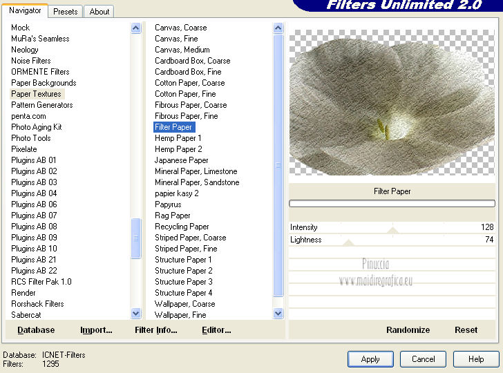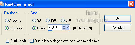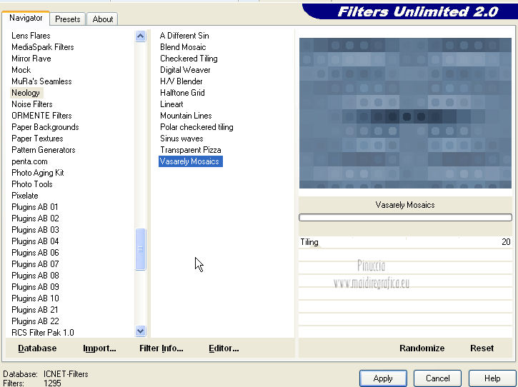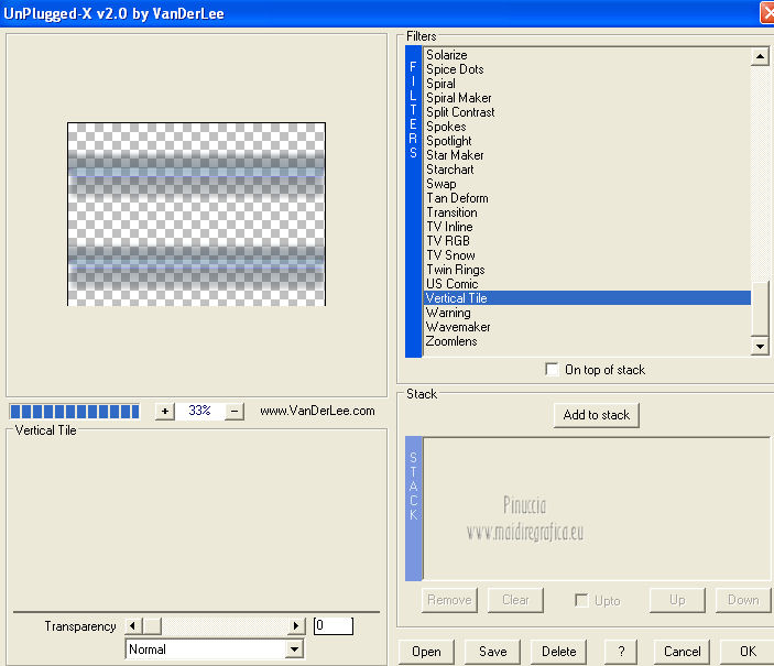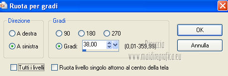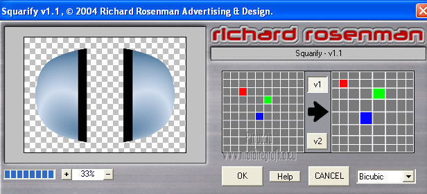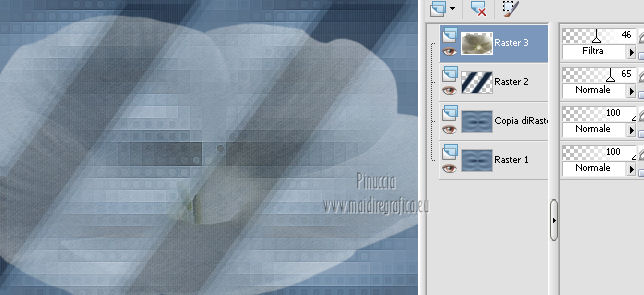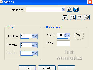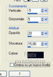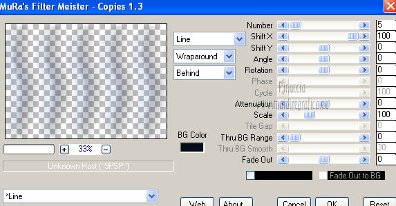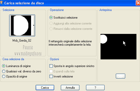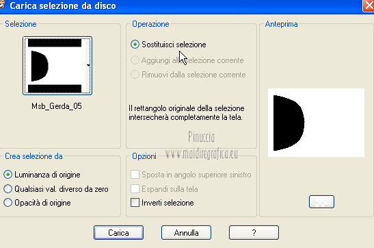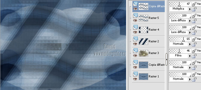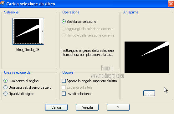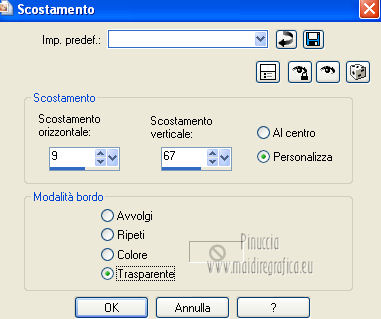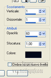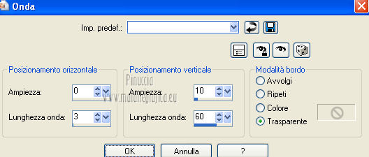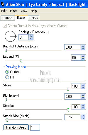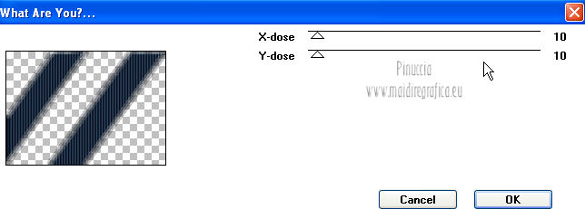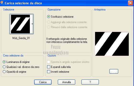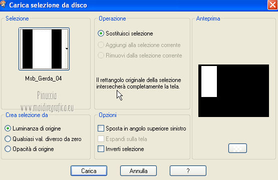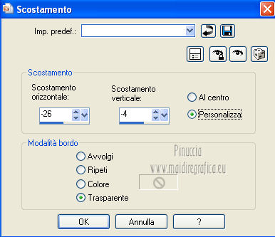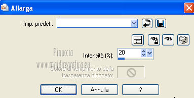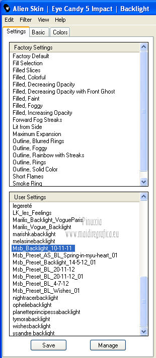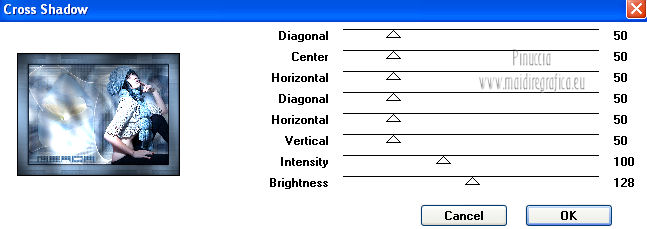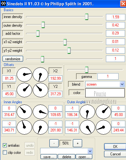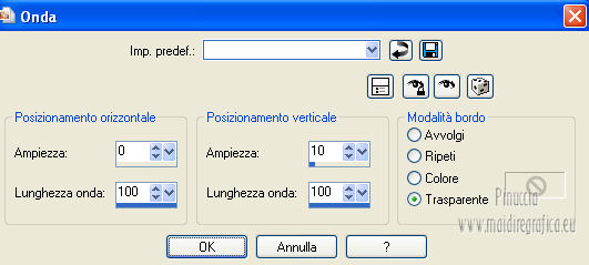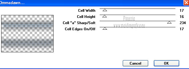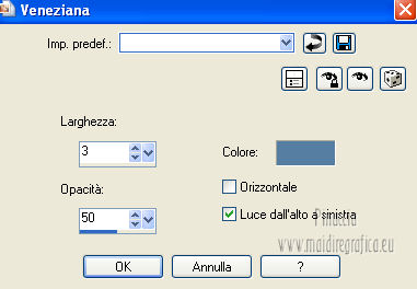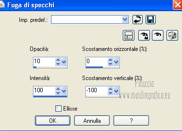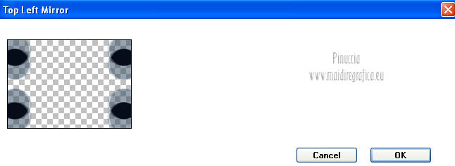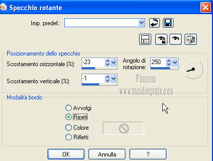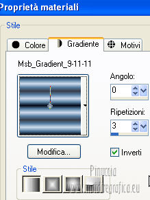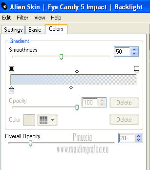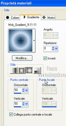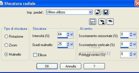 qui puoi trovare qualche risposta ai tuoi dubbi. Se l'argomento che ti interessa non è presente, ti prego di segnalarmelo. Questo tutorial è una creazione ©Meetjesplekje e non può essere copiato su altri siti nè essere offerto per il download. Lo stesso vale per la mia traduzione. Il materiale viene da vari gruppi di condivisione. Il copyright appartiene ai rispettivi autori. Grazie ai creatori dei tubes che mettono a disposizione il loro lavoro in vari gruppi di condivisione. Per tradurre questo tutorial ho usato PSP X. Occorrente: Materiale qui Per i tubes utilizzati grazie Liza (donna) e Syl (fiore) Filtri: consulta, se necessario, la mia sezione filtri qui Filters Unlimited 2.0 qui Toadies - What are you, Ommadawn qui VanDerLee - Unplugged-X qui Simple - Top Left Mirror qui Richard Rosenman - Spherical Mapping Corrector qui Richard Rosenman - Squarify qui Dragonfly - Sinedots II qui Graphics Plus - Cross Shadow qui Mura's Meister - Copies qui Alien Skin Eye Candy 5 Impact - Backlight qui Neology - Vasarely Mosaic qui I filtri Toadies, Simple, Neology e Graphics Plus si possono usare da soli o importati in Filters Unlimited. (come fare vedi qui). A volte si possono riscontrare delle differenze nei risultati dei diversi usi, ma questo è possibile accertarlo caso per caso. ![]() Se stai usando altri colori puoi sperimentare le modalità di miscelatura e le opacità più adatte ai tuoi colori. Apri il font e minimizzalo. Lo troverai nella lista dei font disponibili quando ti servirà. Metti il preset nella cartella del filtro Alien Skin Eye Candy 5 Impact>Settings>Backlight. Cliccando sul file una o due volte (a seconda delle tue impostazioni), automaticamente il preset si installerà nella cartella corretta. perchè uno o due clic vedi qui Metti le selezioni nella cartella Selezioni. Metti il gradiente nella cartella Gradienti. Imposta il colore di primo piano con #060c1a, e il colore di sfondo con #567ea2. ![]() Passa il colore di primo piano a Gradiente, e seleziona il gradiente Msb_Gradient_9-11-11, stile Lineare, con i seguenti settaggi. ![]() 1. Apri una nuova immagine trasparente 700 x 500 pixels, e riempila con il gradiente.Regola>Sfocatura>Sfocatura radiale. ![]() Livelli>Duplica. Immagine>Rifletti. Abbassa l'opacità di questo livello al 50%. Livelli>Unisci>Unisci giù. Livelli>Duplica. Effetti>Plugins>Unlimited 2.0 – Neology – Vasaraly Mosaics, con i settaggi standard. ![]() Effetti>Effetti di bordo>Aumenta. Modifica>Copia. Modifica>Incolla come nuova immagine. Salva l'immagine per precauzione e minimizzala (la userai più tardi per i bordi). 2. Torna al tuo lavoro. Livelli>Nuovo livello raster. Selezione>Carica/Salva selezione>Carica selezione da disco. Cerca e carica la selezione Msb_Gerda_01. ![]() Riempi la selezione con il colore di primo piano.Selezione>Deseleziona. Effetti>Effetti di trama>Trama - Veneziana, con il colore di sfondo #567ea2. ![]() Abbassa l'opacità di questo livello al 65%. Effetti>Plugins>Toadies - What are you. ![]() 3. Livelli>Nuovo livello raster. Selezione>Seleziona tutto. Apri il tube SvB Delicate e vai a Modifica>Copia. non chiuderlo, perchè ti servirà ancora Torna al tuo lavoro e vai a Modifica>Incolla nella selezione. Mantieni selezionato. Immagine>Ridimensiona, al 120%, tutti i livelli non selezionato. Sposta il tube un po' più in basso,in modo che lo stelo non sia visibile. ![]() Selezione>Inverti. Premi sulla tastiera il tasto CANC ![]() Selezione>Deseleziona. Effetti>Plugins>Filters Unlimited 2.0 – Paper Textures – Filter Paper, con i settaggi standard. ![]() Cambia la modalità di miscelatura di questo livello in Filtra, e abbassa l'opacità al 46%. ![]() Livelli>Disponi>Sposta giù. 4. Attiva il livello superiore. Livelli>Nuovo livello raster. Selezione>Carica/Salva selezione>Carica selezione da disco. Cerca e carica la selezione Msb_Gerda_02. ![]() Riporta il colore di primo piano a Colore, e riempi la selezione con il colore di primo piano.Selezione>Deseleziona. Effetti>Plugins>Toadies – What Are You?. ![]() Effetti>Plugins>Simple – Top Left Mirror. ![]() Cambia la modalità di miscelatura di questo livello in Luce diffusa. 5. Livelli>Nuovo livello raster. Selezione>Carica/Salva selezione>Carica selezione da disco. Cerca e carica la selezione Msb_ Gerda_03. ![]() Riempi la selezione con il colore di sfondo #567ea2.la selezione è "sfumata"; dopo il riempimento avrai questo ![]() Selezione>Deseleziona. Effetti>Plugins>VanDerLee - Unplugged-X - Vertical Tile con i settaggi standard. ![]() Effetti>Plugins>Toadies – Ommadawn, con i settaggi standard. ![]() Effetti>Effetti di distorsione>Onda. ![]() Cambia la modalità di miscelatura di questo livello in Luce diffusa. Livelli>Duplica. Cambia la modalità di miscelatura di questo livello in Moltiplica, e abbassa l'opacità al 47%. ![]() 6. I tuoi colori sono sempre: primo piano #060c1a; sfondo #567ea2. ![]() Passa il colore di primo piano a Gradiente, e cambia i settaggi del gradiente Msb_Gradient_9-11-11 in Stile Sprazzo di luce. ![]() Livelli>Nuovo livello raster. Selezione>Carica/Salva selezione>Carica selezione da disco. Cerca e carica la selezione Msb_ Gerda_04. ![]() Riempi la selezione con il gradiente.Selezione>Deseleziona. Effetti>Plugins>Richard Rosenman – Spherical Mapping Corrector. ![]() Selezione>Carica/Salva selezione>Carica selezione da disco. Cerca e carica la selezione Msb_ Gerda_05. ![]() Premi sulla tastiera il tasto CANC. Selezione>Deseleziona. Effetti>Effetti di immagine>Scostamento. ![]() 7. Livelli>Duplica. Immagine>Rifletti. Livelli>Unisci>Unisci giù. Effetti>Plugins>Richard Rosenman – Squarify, con i settaggi standard. ![]() Effetti>Effetti di riflesso>Fuga di specchi. ![]() Effetti>Effetti 3D>Sfalsa ombra, con il colore di primo piano #060c1a. ![]() Abbassa l'opacità di questo livello all'82%. Effetti>Effetti di riflesso>Specchio rotante. ![]() Immagine>Ridimensiona, al 70 %, tutti i livelli non selezionato. Immagine>Ruota per gradi - 70