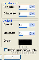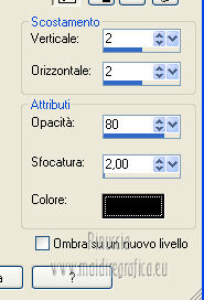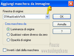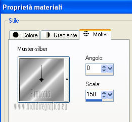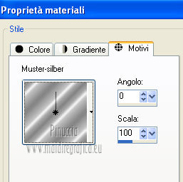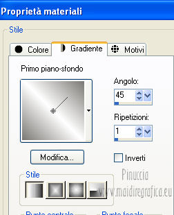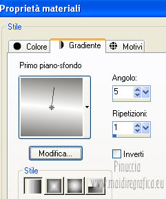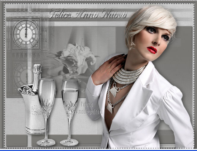 qui puoi trovare qualche risposta ai tuoi dubbi. Se l'argomento che ti interessa non è presente, ti prego di segnalarmelo. Questo tutorial è una creazione ©Meetjesplekje e non può essere copiato su altri siti nè essere offerto per il download. Lo stesso vale per la mia traduzione. Il materiale viene da vari gruppi di condivisione. Il copyright appartiene ai rispettivi autori. Grazie ai creatori dei tubes che mettono a disposizione il loro lavoro in vari gruppi di condivisione. Per tradurre questo tutorial ho usato PSP X. Occorrente: Materiale qui Per i tubes grazie Maxyran, Rose Passion e Kolejo. Filtri: consulta, se necessario, la mia sezione filtri qui Graphics Plus - Cross Shadow qui ![]() Apri la maschera o1MaskkelsWWa in PSP e minimizzala con il resto del materiale. Imposta il colore di primo piano con #7b7975, e il colore di sfondo con #ffffff (bianco). Passa il colore di primo piano a Gradiente, stile Lineare. ![]() 1. Apri una nuova immagine trasparente 800 x 600 pixels, e riempila con il gradiente.2. Livelli>Nuovo livello raster. Selezione>Seleziona tutto. Apri lo sfondo Jean_Silver-and-Pearls-Anniversary-Mat -1b e vai a Modifica>Copia. Torna al tuo lavoro e vai a Modifica>Incolla nella selezione. Selezione>Deseleziona. Livelli>Nuovo livello raster. Riempi con il colore di primo piano.3. Livelli>Nuovo livello maschera>Da immagine. Apri il menu sotto la finestra di origine e vedrai la lista dei files aperti. Seleziona la maschera o1MaskkelsWWa, con i seguenti settaggi. ![]() Livelli>Unisci>Unisci gruppo. Effetti>Effetti 3D>Sfalsa ombra, con il colore nero. ![]() 4. Livelli>Nuovo livello raster. Attiva lo strumento Selezione , rettangolo,e traccia una selezione come nell'esempio. ![]() 5. Apri il tube fleur_rose_passion _03 e vai a Modifica>Copia. Torna al tuo lavoro e vai a Modifica>Incolla nella selezione. Selezione>Deseleziona. Regola>Tonalità e saturazione>Viraggio. ![]() Cambia la modalità di miscelatura di questo livello in Luce diffusa. 6. Apri il tube LD-Bigbenklok e vai a Modifica>Copia. Torna al tuo lavoro e vai a Modifica>Incolla come nuovo livello. Spostalo nell'angolo in alto a sinistra.Regola>Tonalità e saturazione>Viraggio. ![]() Abbassa l'opacità di questo livello all'80%. 7. Apri il tube tube Cruch99_ChampagneIcebucket_Glasses. Attiva il livello Layer 2 e vai a Modifica>Copia. Torna al tuo lavoro e vai a Modifica>Incolla come nuovo livello. Spostalo in basso, come nel mio esempio.8. Attiva nuovamente il tube Cruch99_ChampagneIcebucket_Glasses. Copia il livello Layer 1. Torna al tuo lavoro e vai a Modifica>Incolla come nuovo livello. Spostalo in basso, come nel mio esempio.9. Livelli>Unisci>Unisci giù. Regola>Tonalità e Saturazione>Viraggio. ![]() Effetti>Effetti 3D>Sfalsa ombra, con il colore nero. ![]() Regola>Messa a fuoco>Metti a fuoco. 10. Apri il tube Maxyran_18_10_09_Woman109 Modifica>Copia. Torna al tuo lavoro e vai a Modifica>Incolla come nuovo livello. Spostalo nell'angolo in basso a destra.Effetti>Effetti 3D>Sfalsa ombra, con il colore nero. ![]() 11. Passa il colore di sfondo a Motivi e seleziona il motivo argento con i seguenti settaggi. ![]() Chiudi il colore di primo piano. Attiva lo strumento Testo , font Beurreregola la dimensione in base al tuo testo e alla versione di PSP che stai usando. ![]() Scrivi il tuo testo e posizionalo. Livelli>Converti in livello raster. Effetti>Effetti 3D>Sfalsa ombra, con il colore nero. ![]() Livelli>Duplica. Sposta questo testo un po' più in alto e a destra.Cambia la modalità di miscelatura di questo livello in Luce diffusa. ![]() 12. Livelli>Unisci>Unisci visibile. 13. Attiva lo strumento Selezione , rettangolo,e traccia una selezione entro il bordo bianco della maschera. ![]() Immagine>Ritaglia la selezione. 14. Selezione>Seleziona tutto. Immagine>Aggiungi bordatura, 2 pixels, simmetriche, con il colore di primo piano. Selezione>Inverti. Cambia i settaggi del motivo, scala 150. ![]() Riempi con il motivo argento, scala 150.Selezione>Seleziona tutto. Cambia i settaggi del gradiente. ![]() Immagine>Aggiungi bordatura, 25 pixels, simmetriche, con il colore bianco. Selezione>Inverti. Riempi con il gradiente.Effetti>Plugins>Graphics Plus - Cross Shadow. ![]() Selezione>Seleziona tutto. Immagine>Aggiungi bordatura, 2 pixels, simmetriche, con il colore di primo piano. Selezione>Inverti. Riempi con il motivo argento.Selezione>Deseleziona. Firma il tuo lavoro e salva in formato jpg. ![]() Le vostre versioni. Grazie ![]() Luisa ![]() Se hai problemi o dubbi, o trovi un link non funzionante, o anche soltanto per un saluto, scrivimi. 14 Dicembre 2012 |
