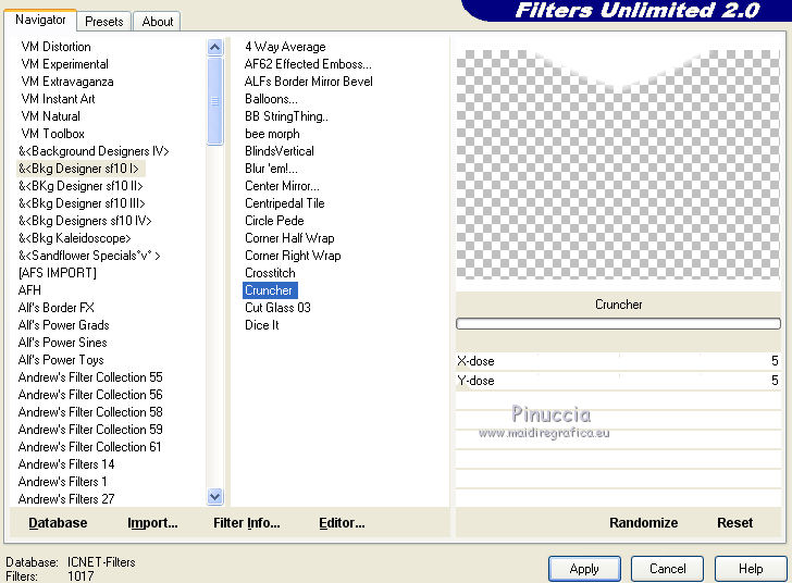 Effetti>Plugins>Filters Unlimited 2.0 – &<Bkg Designer sf10I> – Cruncher.
