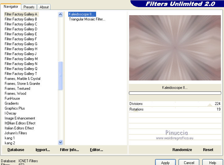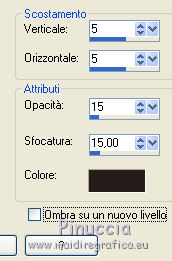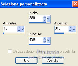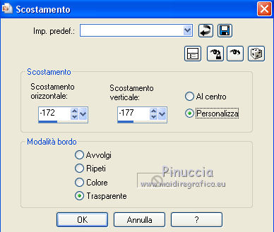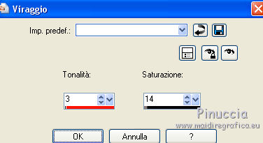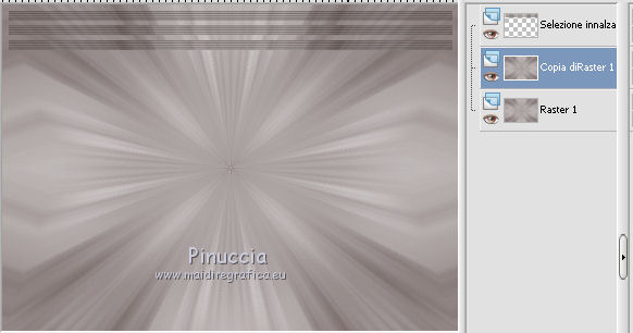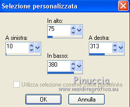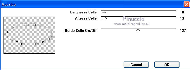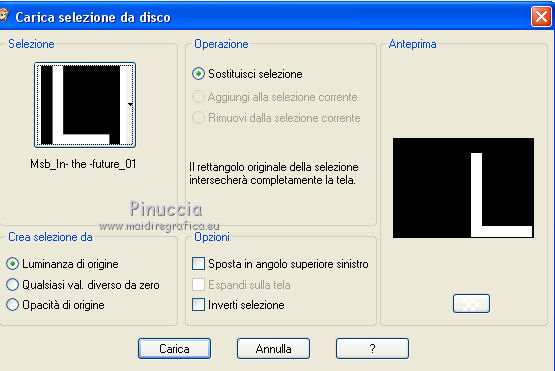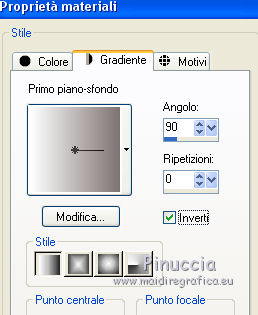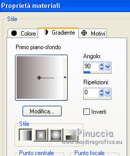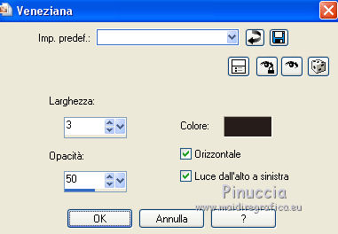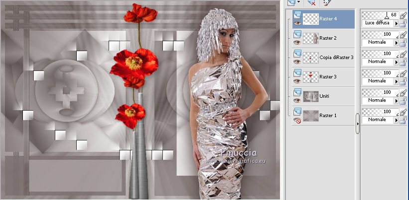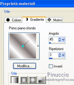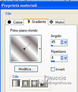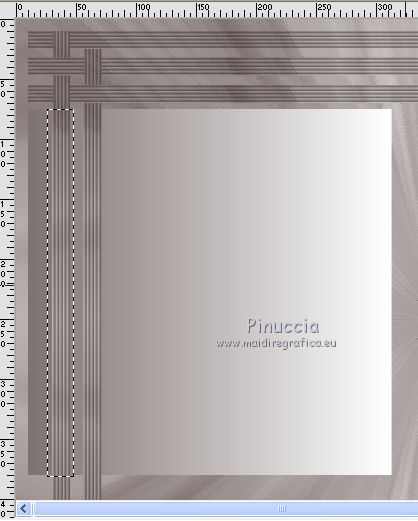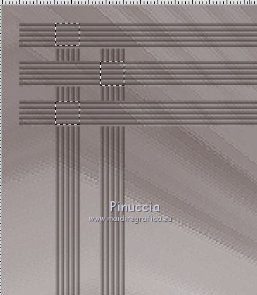 qui puoi trovare qualche risposta ai tuoi dubbi. Se l'argomento che ti interessa non è presente, ti prego di segnalarmelo. Questo tutorial è una creazione ©Meetjesplekje e non può essere copiato su altri siti nè essere offerto per il download. Lo stesso vale per la mia traduzione. Il materiale viene da vari gruppi di condivisione. Il copyright appartiene ai rispettivi autori. Grazie ai creatori dei tubes che mettono a disposizione il loro lavoro in vari gruppi di condivisione. Per tradurre questo tutorial ho usato PSP X. Occorrente: Materiale qui Per i tubes della donna e della mano grazie Liza Per il tube del fiore grazie Patries Filtri: consulta, se necessario, la mia sezione filtri qui Filters Unlimited 2.0 qui Filter Factory Gallery A - Kaleidoscope II qui Flaming Pear - Flexify 2 qui It@lian Editors - Mosaico qui Alien Skin Eye Candy 5 Impact - Bevel qui Graphics Plus - Cross Shadow qui I filtri Factory Gallery, Italian Editors e Graphics Plus si possono usare da soli o importati in Filters Unlimited. (come fare vedi qui) ![]() Se stai usando altri colori puoi sperimentare le modalità di miscelatura e le opacità più adatte ai tuoi colori. Metti il preset nella cartella del filtro Alien Skin Eye Candy 5 Impact>Settings>Brushed Metal. Cliccando sul file una o due volte (a seconda delle tue impostazioni), automaticamente il preset si installerà nella cartella corretta. perchè uno o due clic vedi qui Metti la selezione nella cartella Selezioni. Imposta il colore di primo piano con #7e7372, e il colore di sfondo con #ffffff. ![]() Passa il colore di primo piano a Gradiente di primo piano/sfondo, stile Lineare. ![]() 1. Apri una nuova immagine trasparente 700 x 500 pixels, e riempila con il gradiente.Selezione>Seleziona tutto. Livelli>Nuovo livello raster. Apri il tube Liza tube future 24-8-2011 e vai a Modifica>Copia. non chiuderlo perchè ti servirà ancora Torna al tuo lavoro e vai a Modifica>Incolla nella selezione. Selezione>Deseleziona. Effetti>Effetti di immagine>Motivo unico. ![]() Livelli>Unisci>Unisci giù. Regola>Sfocatura>Sfocatura radiale. ![]() Effetti>Plugins>Filters Unlimited 2.0 - Filter Factory Gallery A - Kaleidoscope II, con i settaggi standard. ![]() Regola>Tonalità e saturazione>Viraggio. ![]() Effetti>Effetti di bordo>Aumenta. Livelli>Duplica. 2. Attiva lo strumento Selezione ![]() clicca sull'icona Selezione personalizzata ![]() e imposta i seguenti settaggi. ![]() Selezione>Innalza selezione a livello. Effetti>Effetti di trama>Veneziana - colore #271d1b. ![]() Selezione>Deseleziona. Livelli>Duplica. Di nuovo Livelli>Duplica. Posiziona le tre strisce una sopra l'altra.![]() Quando hai fatto, assicurati di essere posizionato sul livello superiore. Livelli>Unisci>Unisci giù - 2 volte. 3. Attiva il livello centrale. ![]() Selezione personalizzata ![]() ![]() Selezione>Innalza selezione a livello. Effetti>Effetti di trama>Veneziana, colore #271d1b. ![]() Selezione>Deseleziona. Livelli>Duplica. Sposta la striscia un po' più a destra.![]() Attiva il livello sottostante (il secondo livello dall'alto). Livelli>Unisci>Unisci giù. Attiva lo strumento Selezione ![]() e traccia tre piccole selezioni come nell'esempio. ![]() Attiva il livello superiore. Premi sulla tastiera il tasto CANC ![]() Selezione>Deseleziona. Adesso le righe sembrano intrecciate. Questo naturalmente puoi farlo anche con lo strumento Gomma ![]() ![]() Livelli>Unisci>Unisci giù. 4. Cambia i settaggi del gradiente: ![]() Livelli>Nuovo livello raster. Selezione personalizzata ![]() ![]() Riempi la selezione con il gradiente.Selezione>Deseleziona. Abbassa l'opacità di questo livello al 75%. 5.Livelli>Nuovo livello raster. Selezione>Carica/Salva selezione>Carica selezione da disco. Cerca e carica la selezione Msb_In-the-future_01. ![]() Riporta il colore di primo piano a Colore e riempi la selezione con il colore di primo piano.Selezione>Deseleziona. Abbassa l'opacità di questo livello al 60%. Livelli>Unisci>Unisci giù. 6. Livelli>Nuovo livello raster. Selezione personalizzata ![]() ![]() Di nuovo passa il colore di primo piano a Gradiente, e togli la selezione a Inverti. ![]() Riempi la selezione con il gradiente.Selezione>Deseleziona. Livelli>Disponi>Sposta giù - 2 volte. Attiva lo strumento Selezione , rettangolo,e traccia una selezione come nell'esempio. ![]() Abbassa l'opacità di questo livello al 75%. Attiva il livello soprastante, e premi sulla tastiera il tasto CANC. Selezione>Deseleziona. 7. Livelli>Nuovo livello raster. Selezione personalizzata ![]() ![]() Di nuovo porta il colore di primo piano a Colore, e riempi la selezione con il colore di primo piano.Selezione>Deseleziona. Abbassa l'opacità di questo livello all'88%. Strumento Selezione , rettangolo,e traccia una selezione come nell'esempio. ![]() Premi sulla tastiera il tasto CANC. Selezione>Deseleziona. Attiva il livello superiore. 8. Passa nuovamente il colore di primo piano a Gradiente e cambia i settaggi. ![]() Livelli>Nuovo livello raster. Riempi la selezione con il gradiente.Effetti>Plugins>Flaming Pear – Flexify 2. ![]() Immagine>Ridimensiona, al 63%, tutti i livelli non selezionato. Effetti>Effetti di immagine>Scostamento. ![]() Livelli>Disponi>Sposta giù - 2 volte. ![]() Effetti>Effetti 3D>Sfalsa ombra, colore #271d1b. ![]() Ripeti l'Effetto Sfalsa ombra, cambiando verticale e orizzontale con -5. 9. Apri il tube Msb_Deco_2-10-11_02 e vai a Modifica>Copia. Torna al tuo lavoro e vai a Modifica>Incolla come nuovo livello. Immagine>Ridimensiona, al 50%, tutti i livelli non selezionato. Effetti>Effetti di immagine>Scostamento. ![]() Livelli>Unisci>Unisci giù. Cambia la modalità di miscelatura di questo livello in Moltiplica, e abbassa l'opacità al 70%. Livelli>Duplica. Immagine>Rifletti. Livelli>Disponi>Porta in alto. 10. Livelli>Nuovo livello raster. Selezione personalizzata ![]() ![]() Riempi la selezione con il colore bianco di sfondo.Selezione>Deseleziona. Effetti>Effetti di trama>Veneziana - colore #271d1b. !