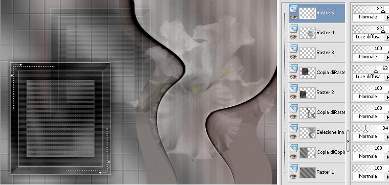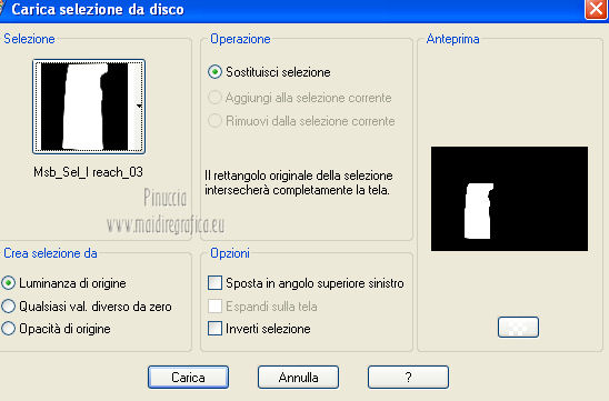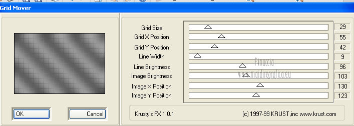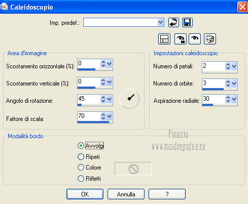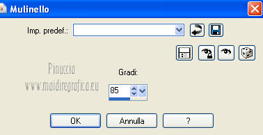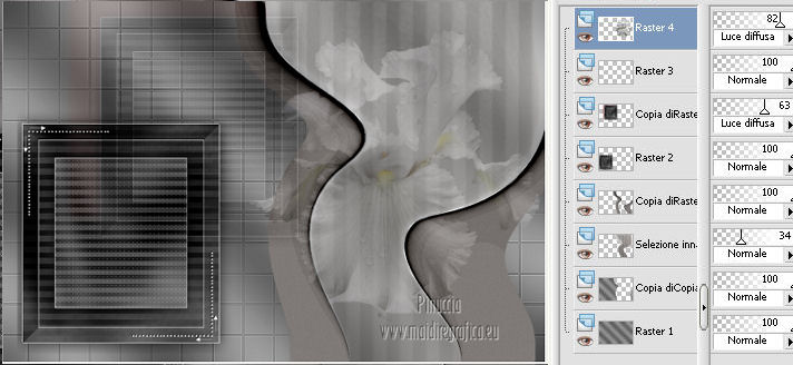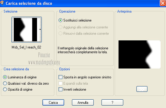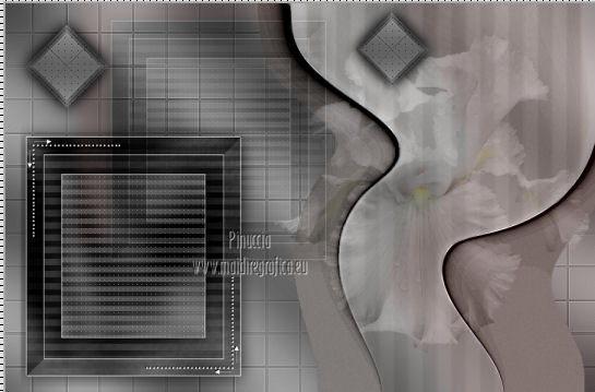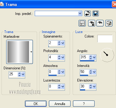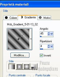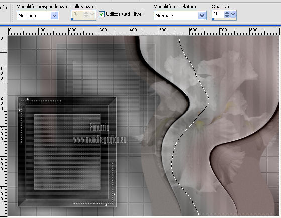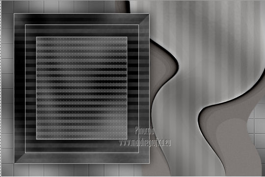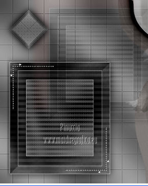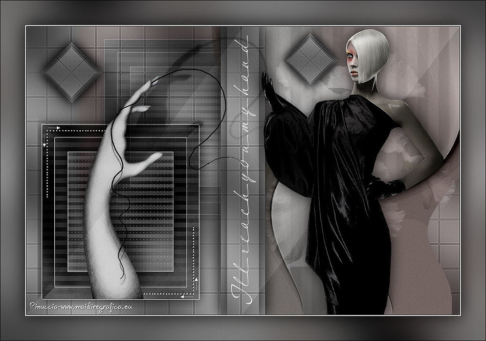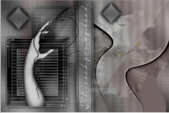 qui puoi trovare qualche risposta ai tuoi dubbi. Se l'argomento che ti interessa non è presente, ti prego di segnalarmelo. Questo tutorial è una creazione ©Meetjesplekje e non può essere copiato su altri siti nè essere offerto per il download. Lo stesso vale per la mia traduzione. Il materiale viene da vari gruppi di condivisione. Il copyright appartiene ai rispettivi autori. Grazie ai creatori dei tubes che mettono a disposizione il loro lavoro in vari gruppi di condivisione. Per tradurre questo tutorial ho usato PSP X, ma può essere realizzato anche con le altre versioni di PSP. Dalla versione X4, il comando Immagine>Rifletti è stato sostituito con Immagine>Capovolgi in orizzontale, e il comando Immagine>Capovolgi con Immagine>Capovolgi in verticale. Nelle versioni X5 e X6, le funzioni sono state migliorate rendendo disponibile il menu Oggetti. Con la nuova versione X7, sono tornati Rifletti>Capovolgi, ma con nuove varianti. Vedi la scheda sull'argomento qui Traduzione francese qui Le vostre versioni quiOccorrente: Materiale qui Per i tubes della donna e della mano grazie Guismo Per il tube del fiore grazie ClaudiaViza Filtri: consulta, se necessario, la mia sezione filtri qui Filters Unlimited 2.0 qui Krusty's FX vol. III 1.0 - Grid Mover qui Krusty's FX vol. II 2.0 - Generator M-1 (3D Patchwork) qui Toadies - Look,Butthead a TV, Sucking Toad Bevel qui AP 01 [Innovations] - Lines SilverLining qui Nik Software - Color Efex Pro qui Alien Skin Eye Candy 5 Impact - Bevel qui Graphics Plus - Cross Shadow qui I filtri Toadies, Krusty e Graphics Plus si possono usare da soli o importati in Filters Unlimited. (come fare vedi qui) ![]() Se stai usando altri colori puoi sperimentare le modalità di miscelatura e le opacità più adatte ai tuoi colori. Metti il preset nella cartella del filtro Alien Skin Eye Candy 5 Impact>Settings>Bevel. Cliccando sul file una o due volte (a seconda delle tue impostazioni), automaticamente il preset si installerà nella cartella corretta. perchè uno o due clic vedi qui Apri il font e minimizzalo. Lo troverai nella lista dei font disponibili quando ti servirà. Con i nuovi sistemi operativi, per usare un font occorre copiarlo nella cartella Font di Windows. Metti la trama Martiezilver nella cartella Trame. Metti il gradiente Msb_Gradient_5-01-13-02 nella cartella Gradienti. Metti le selezioni nella cartella Selezioni. Imposta il colore di primo piano con #202020, e il colore di sfondo con #808080. ![]() Passa il colore di primo piano a Gradiente, e seleziona il gradiente Msb_Gradient_5-1-13-02, stile Lineare, con i seguenti settaggi. ![]() 1. Apri una nuova immagine trasparente 900 x 600 pixels, e riempila con il gradiente.Regola>Sfocatura>Sfocatura gaussiana - raggio 50. ![]() Livelli>Duplica - 2 volte. Rimani posizionato sul livello superiore della seconda copia. Effetti>Plugins>Krusty’s FX vol III 1.0- Grid Mover. con i settaggi standard. ![]() Effetti>Effetti di bordo>Aumenta di più. 2. Attiva il livello sottostante della prima copia. ![]() Livelli>Disponi>Porta in alto. Effetti>Plugins>Krusty’s FX vol II 2.0- Generator M-1 (3DPatchwork), con i seguenti settaggi. ![]() Immagine>Ridimensiona, al 68%, tutti i livelli non selezionato. Immagine>Ruota per gradi - 90 gradi a sinistra. ![]() Effetti>Effetti di distorsione>Distorsione, con i seguenti settaggi. ![]() 3. Effetti>Effetti di distorsione>Mulinello. ![]() Effetti>Effetti di immagine>Scostamento. ![]() Attiva lo strumento Selezione ,clicca sull'icona Selezione personalizzata ![]() e imposta i seguenti settaggi: ![]() Immagine>Ritaglia la selezione. Selezione>Seleziona tutto. Selezione>Mobile. Selezione>Immobilizza. Attiva il livello centrale. ![]() Premi sulla tastiera il tasto CANC. Selezione>Deseleziona. 4. Attiva nuovamente il livello superiore. Selezione>Carica/Salva selezione>Carica selezione da disco. Cerca e carica la selezione Msb_Sel_I reach_01. ![]() Selezione>Inverti. Selezione>Innalza selezione a livello. Effetti>Effetti di trama>Trama - seleziona la trama Martie zilver, con i seguenti settaggi. ![]() Abbassa l'opacità di questo livello al 34%. Livelli>Disponi>Sposta giù. Attiva nuovamente il livello superiore. Premi sulla tastiera il tasto CANC. Selezione>Deseleziona. ![]() 5. Livelli>Nuovo livello raster. Selezione personalizzata ![]() ![]() Riempi la selezione con il gradiente.Regola>Sfocatura>Sfocatura gaussiana - raggio 50. ![]() Livelli>Duplica. Effetti>Plugins>Filters Unlimited 2.0 – Toadies – Look,Butthead,aTV…, con i settaggi standard. ![]() Effetti>Plugins>Filters Unlimited 2.0 – Toadies – *Sucking Toad* Bevel II.2, con i seguenti settaggi. ![]() Cambia la modalità di miscelatura di questo livello in Differenza, e abbassa l'opacità al 47%. Effetti>Plugins>Graphic Plus – Cross Shadow, con i settaggi standard. ![]() Livelli>Unisci>Unisci giù. Selezione>Deseleziona. ![]() 6. Selezione personalizzata ![]() ![]() Selezione>Innalza selezione a livello. Immagine>Ridimensiona, all'80%, tutti i livelli non selezionato. Selezione>Deseleziona. Effetti>Effetti di immagine>Scostamento. ![]() Effetti>Plugins>AP 01 [Innovations] – Lines Silverlining, con i seguenti settaggi. ![]() Effetti>Effetti 3D>Sfalsa ombra, con il colore nero. ![]() 7. Livelli>Nuovo livello raster. Selezione personalizzata con i settaggi precedenti![]() Imposta il colore di sfondo con il colore bianco #ffffff. Riempi la selezione con il colore bianco #ffffff.Selezione>Modifica>Contrai - 1 pixel. Premi sulla tastiera il tasto CANC. Selezione>Deseleziona. Livelli>Duplica. Immagine>Ridimensiona, all'80%, tutti i livelli non selezionato. Effetti>Effetti di immagine>Scostamento. ![]() Livelli>Unisci>Unisci giù - 2 volte. Attiva il livello sottostante. ![]() Livelli>Duplica. Effetti>Pugins>Alien Skin Eyecandy 5 Impact – Bevel. Seleziona il preset Msb_Preset_Bev_7-1-13_01 e ok. ![]() Cambia la modalità di miscelatura di questo livello in Luce diffusa. Livelli>Unisci>Unisci giù. Attiva il livello s