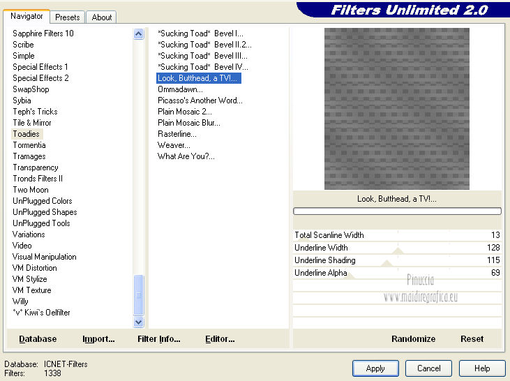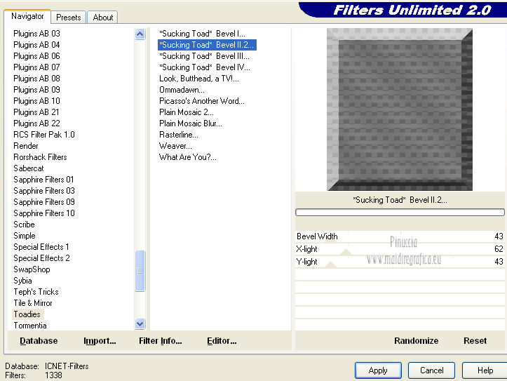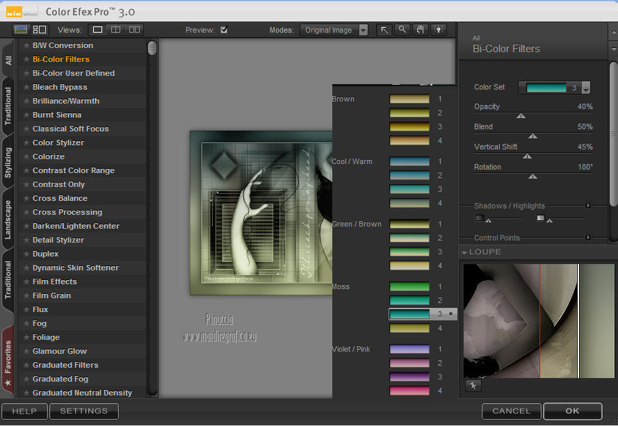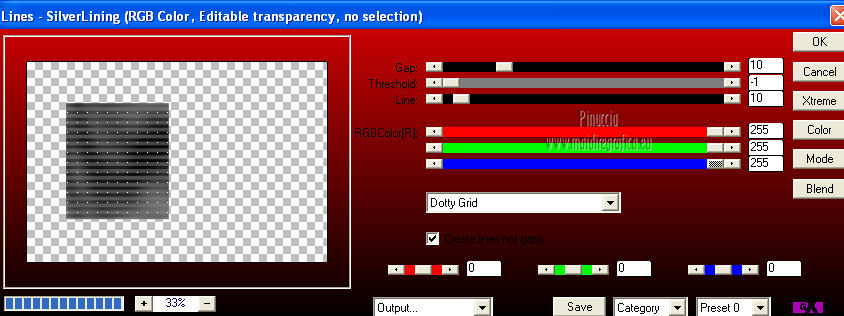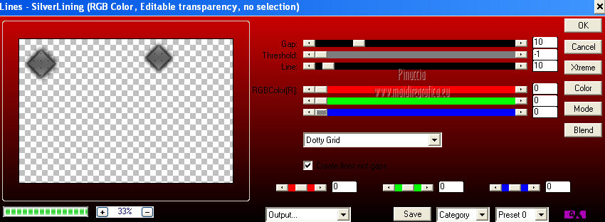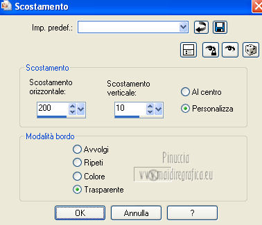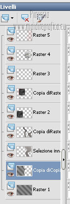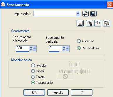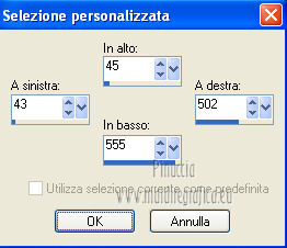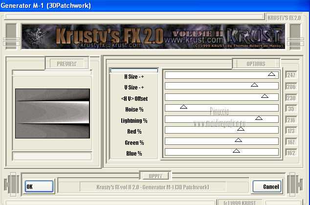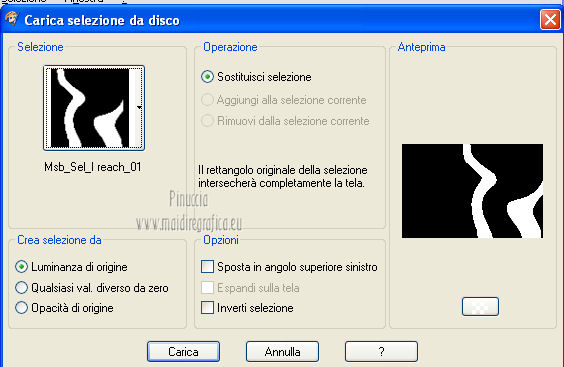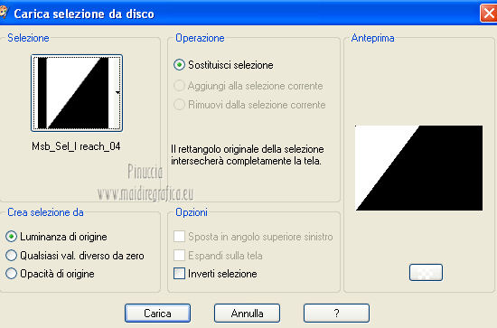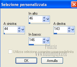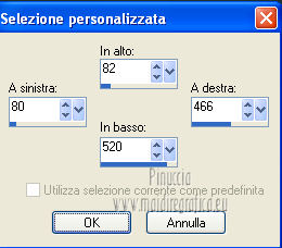 qui puoi trovare qualche risposta ai tuoi dubbi. Se l'argomento che ti interessa non è presente, ti prego di segnalarmelo. Questo tutorial è una creazione ©Meetjesplekje e non può essere copiato su altri siti nè essere offerto per il download. Lo stesso vale per la mia traduzione. Il materiale viene da vari gruppi di condivisione. Il copyright appartiene ai rispettivi autori. Grazie ai creatori dei tubes che mettono a disposizione il loro lavoro in vari gruppi di condivisione. Per tradurre questo tutorial ho usato PSP X, ma può essere realizzato anche con le altre versioni di PSP. Dalla versione X4, il comando Immagine>Rifletti è stato sostituito con Immagine>Capovolgi in orizzontale, e il comando Immagine>Capovolgi con Immagine>Capovolgi in verticale. Nelle versioni X5 e X6, le funzioni sono state migliorate rendendo disponibile il menu Oggetti. Con la nuova versione X7, sono tornati Rifletti>Capovolgi, ma con nuove varianti. Vedi la scheda sull'argomento qui Traduzione francese qui Le vostre versioni quiOccorrente: Materiale qui Per i tubes della donna e della mano grazie Guismo Per il tube del fiore grazie ClaudiaViza Filtri: consulta, se necessario, la mia sezione filtri qui Filters Unlimited 2.0 qui Krusty's FX vol. III 1.0 - Grid Mover qui Krusty's FX vol. II 2.0 - Generator M-1 (3D Patchwork) qui Toadies - Look,Butthead a TV, Sucking Toad Bevel qui AP 01 [Innovations] - Lines SilverLining qui Nik Software - Color Efex Pro qui Alien Skin Eye Candy 5 Impact - Bevel qui Graphics Plus - Cross Shadow qui I filtri Toadies, Krusty e Graphics Plus si possono usare da soli o importati in Filters Unlimited. (come fare vedi qui) ![]() Se stai usando altri colori puoi sperimentare le modalità di miscelatura e le opacità più adatte ai tuoi colori. Metti il preset nella cartella del filtro Alien Skin Eye Candy 5 Impact>Settings>Bevel. Cliccando sul file una o due volte (a seconda delle tue impostazioni), automaticamente il preset si installerà nella cartella corretta. perchè uno o due clic vedi qui Apri il font e minimizzalo. Lo troverai nella lista dei font disponibili quando ti servirà. Con i nuovi sistemi operativi, per usare un font occorre copiarlo nella cartella Font di Windows. Metti la trama Martiezilver nella cartella Trame. Metti il gradiente Msb_Gradient_5-01-13-02 nella cartella Gradienti. Metti le selezioni nella cartella Selezioni. Imposta il colore di primo piano con #202020, e il colore di sfondo con #808080. ![]() Passa il colore di primo piano a Gradiente, e seleziona il gradiente Msb_Gradient_5-1-13-02, stile Lineare, con i seguenti settaggi. ![]() 1. Apri una nuova immagine trasparente 900 x 600 pixels, e riempila con il gradiente.Regola>Sfocatura>Sfocatura gaussiana - raggio 50. ![]() Livelli>Duplica - 2 volte. Rimani posizionato sul livello superiore della seconda copia. Effetti>Plugins>Krusty’s FX vol III 1.0- Grid Mover. con i settaggi standard. ![]() Effetti>Effetti di bordo>Aumenta di più. 2. Attiva il livello sottostante della prima copia. ![]() Livelli>Disponi>Porta in alto. Effetti>Plugins>Krusty’s FX vol II 2.0- Generator M-1 (3DPatchwork), con i seguenti settaggi. ![]() Immagine>Ridimensiona, al 68%, tutti i livelli non selezionato. Immagine>Ruota per gradi - 90 gradi a sinistra. ![]() Effetti>Effetti di distorsione>Distorsione, con i seguenti settaggi. ![]() 3. Effetti>Effetti di distorsione>Mulinello. ![]() Effetti>Effetti di immagine>Scostamento. ![]() Attiva lo strumento Selezione ,clicca sull'icona Selezione personalizzata ![]() e imposta i seguenti settaggi: ![]() Immagine>Ritaglia la selezione. Selezione>Seleziona tutto. Selezione>Mobile. Selezione>Immobilizza. Attiva il livello centrale. ![]() Premi sulla tastiera il tasto CANC. Selezione>Deseleziona. 4. Attiva nuovamente il livello superiore. Selezione>Carica/Salva selezione>Carica selezione da disco. Cerca e carica la selezione Msb_Sel_I reach_01. ![]() Selezione>Inverti. Selezione>Innalza selezione a livello. Effetti>Effetti di trama>Trama - seleziona la trama Martie zilver, con i seguenti settaggi. ![]() Abbassa l'opacità di questo livello al 34%. Livelli>Disponi>Sposta giù. Attiva nuovamente il livello superiore. Premi sulla tastiera il tasto CANC. Selezione>Deseleziona. ![]() 5. Livelli>Nuovo livello raster. Selezione personalizzata ![]() ![]() Riempi la selezione con il gradiente.Regola>Sfocatura>Sfocatura gaussiana - raggio 50. ![]() Livelli>Duplica. Effetti>Plugins>Filters Unlimited 2.0 – Toadies – Look,Butthead,aTV…, con i settaggi standard. ![]() Effetti>Plugins>Filters Unlimited 2.0 – Toadies – *Sucking Toad* Bevel II.2, con i seguenti settaggi. ![]() Cambia la modalità di miscelatura di questo livello in Differenza, e abbassa l'opacità al 47%. Effetti>Plugins>Graphic Plus – Cross Shadow, con i settaggi standard. ![]() Livelli>Unisci>Unisci giù. Selezione>Deseleziona. ![]() 6. Selezione personalizzata ![]() ![]() Selezione>Innalza selezione a livello. Immagine>Ridimensiona, all'80%, tutti i livelli non selezionato. Selezione>Deseleziona. Effetti>Effetti di immagine>Scostamento. ![]() Effetti>Plugins>AP 01 [Innovations] – Lines Silverlining, con i seguenti settaggi. ![]() Effetti>Effetti 3D>Sfalsa ombra, con il colore nero. ![]() 7. Livelli>Nuovo livello raster. Selezione personalizzata con i settaggi precedenti![]() Imposta il colore di sfondo con il colore bianco #ffffff. Riempi la selezione con il colore bianco #ffffff.Selezione>Modifica>Contrai - 1 pixel. Premi sulla tastiera il tasto CANC. Selezione>Deseleziona. Livelli>Duplica. Immagine>Ridimensiona, all'80%, tutti i livelli non selezionato. Effetti>Effetti di immagine>Scostamento. ![]() Livelli>Unisci>Unisci giù - 2 volte. Attiva il livello sottostante. ![]() Livelli>Duplica. Effetti>Pugins>Alien Skin Eyecandy 5 Impact – Bevel. Seleziona il preset Msb_Preset_Bev_7-1-13_01 e ok. ![]() Cambia la modalità di miscelatura di questo livello in Luce diffusa. Livelli>Unisci>Unisci giù. Attiva il livello s