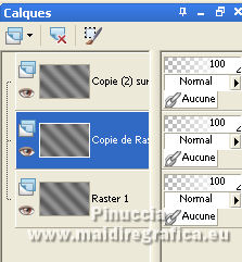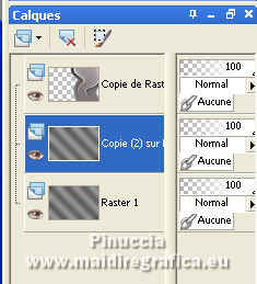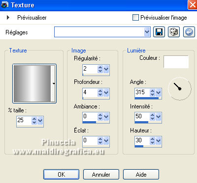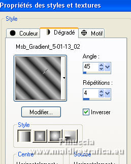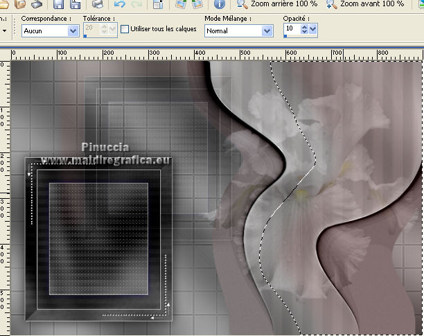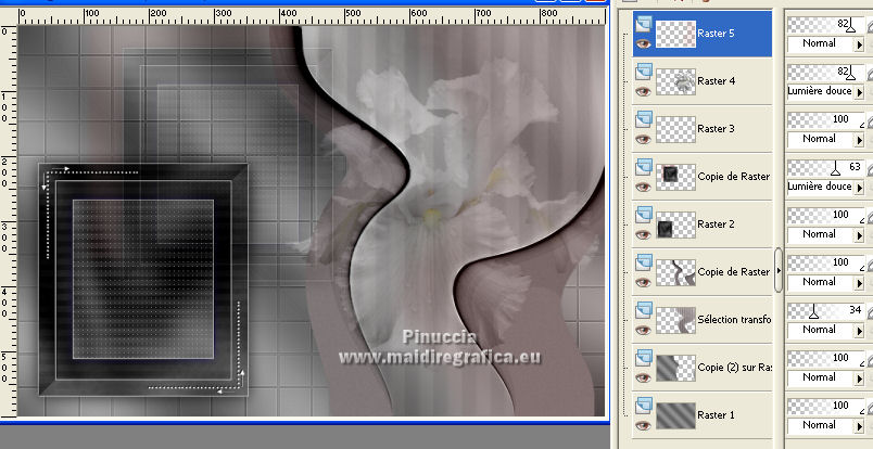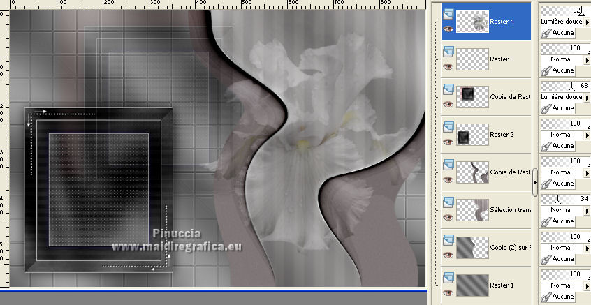 qui puoi trovare qualche risposta ai tuoi dubbi. Se l'argomento che ti interessa non è presente, ti prego di segnalarmelo. Pour traduire ce tutoriel j'ai utilisé Corel X2, mais il peut également être exécuté avec les autres versions. Suivant la version utilisée, vous pouvez obtenir des résultats différents. Depuis la version X4, la fonction Image>Miroir a été remplacée par Image>Renverser horizontalement, et Image>Renverser avec Image>Renverser verticalement. Dans les versions X5 et X6, les fonctions ont été améliorées par la mise à disposition du menu Objets. Avec la nouvelle version X7, nous avons à nouveau Miroir/Retourner, mais avec nouvelles différences. Consulter, si vouz voulez, mes notes ici Certaines dénominations ont changées entre les versions de PSP. Les plus frequentes dénominations utilisées: ![]() traduction italienne ici vos versions iciNécessaire pour réalise le tutoriel: Matériel ici Merci pour les tubes Guismo et ClaudiaViza. (les liens des sites des tubeuses ici) Modules Externes. consulter, si nécessaire, ma section de filtre ici Filters Unlimited 2.0 ici Krusty's FX vol. III 1.0 - Grid Mover ici Krusty's FX vol. II 2.0 - Generator M-1 (3D Patchwork) ici Toadies - Look,Butthead a TV, Sucking Toad Bevel ici AP 01 [Innovations] - Lines SilverLining ici Nik Software - Color Efex Pro ici Alien Skin Eye Candy 5 Impact - Bevel ici Graphics Plus - Cross Shadow ici Filtres Krusty, Toadies et Graphics Plus peuvent être utilisés seuls ou importés dans Filters Unlimited. voir comment le faire ici). Si un filtre est fourni avec cette icône, ![]() N'hésitez pas à changer le mode mélange des calques et leur opacité selon les couleurs que vous utiliserez Placer le preset En cliquant sur le preset une ou deux fois (selon vos réglages) automatiquement il se placera directement dans le dossier Settings de Alien Skin Eye Candy. pourquoi un ou deux clic voir ici Ouvrez la police et la minimiser. Vous la trouverez dans la liste des polices disponibles lorsque vous en avez besoin. Avec les nouveaux s.o. ce n'est plus possible. Pour utiliser une police, vous devez le copier dans le dossier Fonts de Windows. Placer la texture Martiezilver dans le dossier Textures. Placer le dégradé Msb_Gradient_5-01-13-02 dans le dossier Dégradés. Placer les sélections dans le dossier Sélections. Placer en avant plan la couleur #202020, et en arrière plan la couleur #808080. ![]() Placer en avant plan le dégradé et sélectionner le dégradé Msb_Gradient_5-1-13-02, style Linéaire. ![]() 1. Ouvrir une nouvelle image transparente 900 x 600 pixels, et remplir du dégradéRéglage>Flou>Flou gaussien - rayon 50. ![]() Calques>Dupliquer - 2 fois. Rester positionner sur le calque du haut de la deuxième copie. Effets>Modules Externes>Krusty’s FX vol III 1.0- Grid Mover. par défaut. ![]() Effets>Effets de bords>Accentuer davantage. 2. Vous positionner sur le calque de dessous de la première copie. ![]() Calques>Agencer>Placer en haut de la pile. Effets>Modules Externes>Krusty’s FX vol II 2.0- Generator M-1 (3DPatchwork). ![]() Image>Redimensionner, à 68%, redimensionner tous les calques décoché. Image>Rotation libre - 90 degrés à gauche. ![]() Effets>Effets de distorsion>Miroir déformant. ![]() 3. Effets>Effets de distorsion>Torsion. ![]() Effets>Effets d'image>Décalage. ![]() Activer l'outil Sélection ![]() (peu importe le type de sélection, parce que avec la sélection personnalisée vous obtenez toujours un rectangle), cliquer sur Sélection personnalisée ![]() et setter ces paramètres. ![]() Image>Recadrer sur la sélection. Sélections>Sélectionner tout. Sélections>Flottante. Sélections>Statique. Vous positionner sur le calque central. ![]() Presser CANC sur le clavier .Sélections>Désélectionner tout. 4. Vous positionner à nouveau sur le calque du haut de la pile. Sélections>Charger/Enregistrer une sélection>Charger à partir du disque. Chercher et charger la sélection Msb_Sel_I reach_01. ![]() Sélections>Inverser. Sélections>Transformer la sélection en calque. Effets>Effets de textures>Texture - sélectionner la texture Martie zilver, avec ces réglages. ![]() Réduire l'opacité de ce calque à 34%. Calques>Agencer>Déplacer vers le bas. Vous positionner à nouveau sur le calque du haut de la pile. Presser CANC sur le clavier .Sélections>Désélectionner tout. ![]() 5. Calques>Nouveau calque raster. Sélection personnalisée ![]() ![]() Remplir la sélection du dégradé.Réglage>Flou>Flou gaussien - rayon 50. ![]() Calques>Dupliquer. Effets>Modules Externes>Filters Unlimited 2.0 – Toadies – Look,Butthead,aTV…, par défaut. ![]() Effets>Modules Externes>Filters Unlimited 2.0 – Toadies – *Sucking Toad* Bevel II.2, avec ces réglages. ![]() Placer le calque en mode Différence et réduire l'opacité à 47%. Effets>Modules Externes>Graphic Plus – Cross Shadow, par défaut. ![]() Calques>Fusionner>Fusionner le calque de dessous. Sélections>Désélectionner tout. ![]() 6. Sélection personnalisée ![]() ![]() Sélections>Transformer la sélection en calque. Image>Redimensionner, à 80%, redimensionner tous les calques décoché. Sélections>Désélectionner tout. Effets>Effets d'image>Décalage. ![]() Effets>Modules Externes>AP 01 [Innovations] – Lines Silverlining, avec ces réglages. ![]() Effets>Effets 3D>Ombre portée, couleur noire. ![]() 7. Calques>Nouveau calque raster. Sélection personnalisée comme précédemment![]() Placer en arrière plan la couleur blanche #ffffff. Remplir la sélection avec la couleur blanche #ffffff.Sélections>Modifier>Contracter - 1 pixel. Presser CANC sur le clavier .Sélections>Désélectionner tout. Calques>Dupliquer. Image>Redimensionner, à 80%, redimensionner tous les calques décoché. Effets>Effets d'image>Décalage, comme précédemment. ![]() Calques>Fusionner>Fusionner le calque de dessous - 2 fois. Vous positionner sur le calque de dessous. ![]() Calques>Dupliquer. Effets>Modu