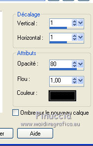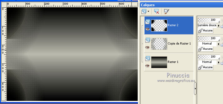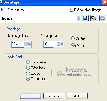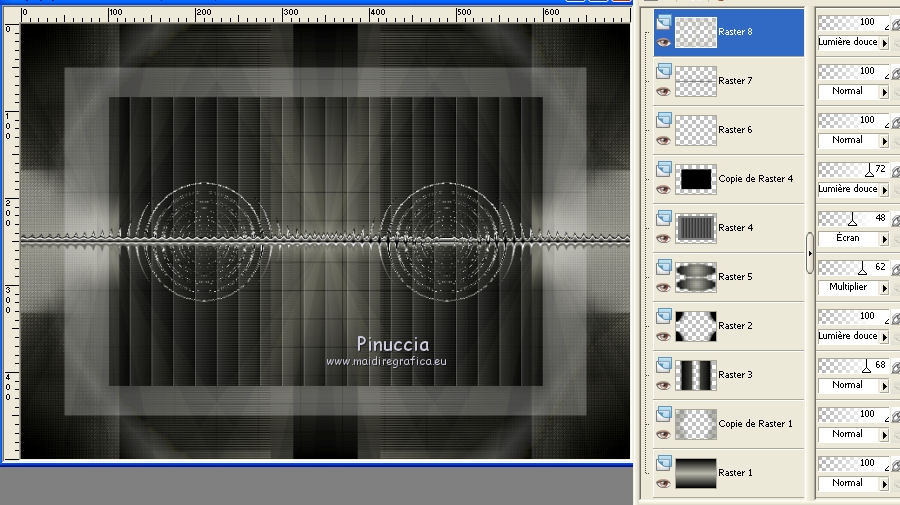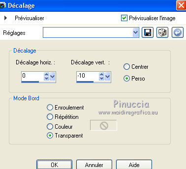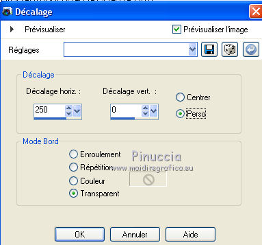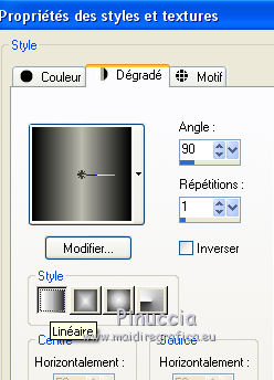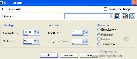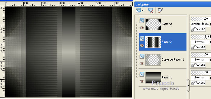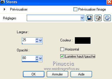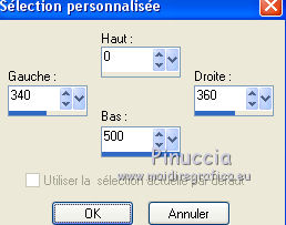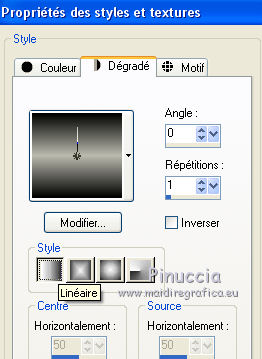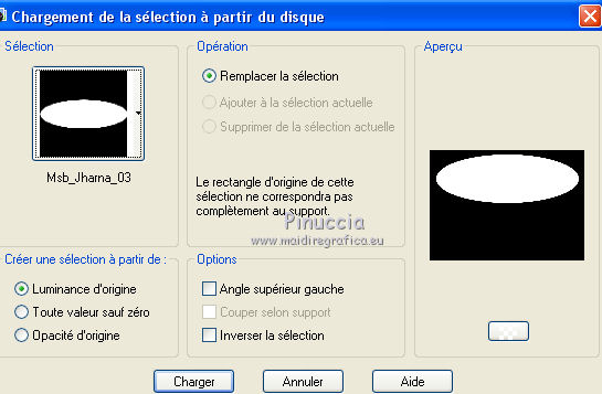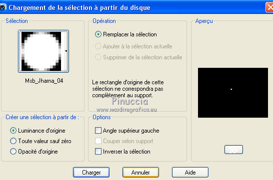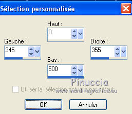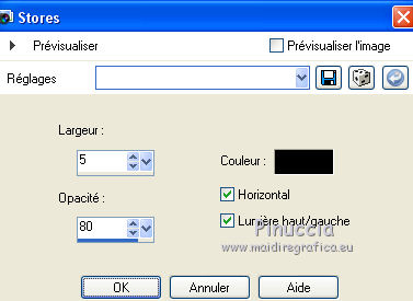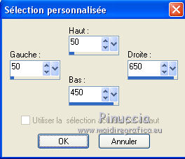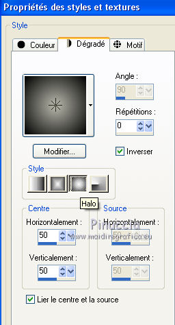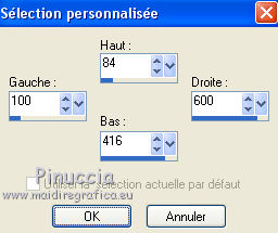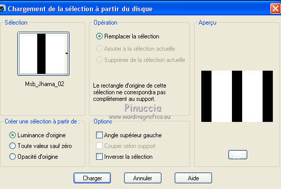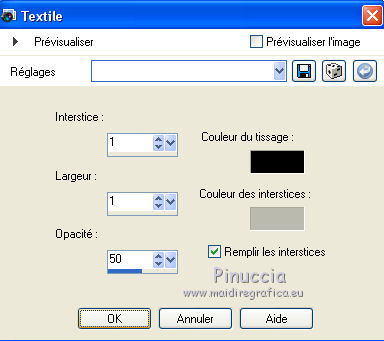 qui puoi trovare qualche risposta ai tuoi dubbi. Se l'argomento che ti interessa non è presente, ti prego di segnalarmelo. Pour traduire ce tutoriel j'ai utilisé Corel X2, mais il peut également être exécuté avec les autres versions. Suivant la version utilisée, vous pouvez obtenir des résultats différents. Depuis la version X4, la fonction Image>Miroir a été remplacée par Image>Renverser horizontalement, et Image>Renverser avec Image>Renverser verticalement. Dans les versions X5 et X6, les fonctions ont été améliorées par la mise à disposition du menu Objets. Avec la nouvelle version X7, nous avons à nouveau Miroir/Retourner, mais avec nouvelles différences. Consulter, si vouz voulez, mes notes ici Certaines dénominations ont changées entre les versions de PSP. Les plus frequentes dénominations utilisées: ![]() traduction italienne ici vos versions iciNécessaire pour réalise le tutoriel: Matériel ici Pour le tube merci iPatries. (les liens des sites des tubeuses ici) Modules Externes. consulter, si nécessaire, ma section de filtre ici Filters Unlimited 2.0 ici Kiwi Oelfilter - Augenspiegel ici Unplugged Tools - Interlace ici Toadies - What are you, Ommadawn ici Alien Skin Eye Candy 5 Impact - Glass ici Mura's Meister - Copies ici Transparency - Eliminate Black ici Simple - Half Wrap ici Filtres Kiwi, Unplugged Tools, Toadies, Transparency et Simple peuvent être utilisés seuls ou importés dans Filters Unlimited. voir comment le faire ici). Si un filtre est fourni avec cette icône, ![]() N'hésitez pas à changer le mode mélange des calques et leur opacité selon les couleurs que vous utiliserez Dans les plus récentes versions de PSP, vous ne trouvez pas le dégradé d'avant plan/arrière plan ou Corel_06_029. Vous pouvez utiliser le dégradé des versions antérieures. Ici le dossier Dégradés de CorelX. Ouvrez la police et la minimiser. Vous la trouverez dans la liste des polices disponibles lorsque vous en avez besoin. Avec les nouveaux s.o. ce n'est plus possible. Pour utiliser une police, vous devez la copier dans le dossier Fonts de Windows. Placer le pinceau dans le dossier Pinceaux. Attention, le pinceau se compose de deux files qui on ne doit séparer. Consulter, si vous voulez, les notes sur les pinceaux ici Placer les sélections dans le dossier Sélections. Placer en avant plan la couleur #000000, et en arrière plan la couleur #bdbaae. ![]() Préparer en avant plan un dégradé de premier plan/arrière plan, style Linéaire. ![]() 1. Ouvrir une nouvelle image transparente 700 x 500 pixels. Remplir l'image transparente du dégradé.Calques>Dupliquer. Effets>Modules Externes>Filters Unlimited 2.0 - [v] Kiwi’s Oelfilter – Augenspiegel, par défaut. ![]() Effets>Modules Externes>Transparency – Eliminate Black. Effets>Effets de bords>Accentuer davantage. Effets>Modules Externes>Simple – Half Wrap. L'effet travaille sans fenêtre. Résultat ![]() Effets>Effets de textures>Textile couleur du tissage: couleur d'avant plan couleur des interstices: couleur d'arrière plan. ![]() 2. Calques>Nouveau calque raster. Sélections>Charger/Enregistrer une sélection>Charger à partir du disque. Chercher et charger la sélection Msb_ Jharna_01. ![]() Placer en avant plan la Couleur. Remplir la sélection avec la couleur d'avant plan.Sélections>Désélectionner tout. Calques>Dupliquer. Vous positionner sur le calque de dessous de l'original. Effets>Effets de distorsion>Vent - vers la gauche, intensité 100. ![]() Vous positionner sur le calque du haut. Effets>Effets de distorsion>Vent - vers la droite, intensité 100. ![]() Calques>Fusionner>Fusionner le calque de dessous. Placer le calque en mode Lumière douce. ![]() 3. Changer les réglages du dégradé, Angle 90. ![]() Calques>Nouveau calque raster. Sélections>Charger/Enregistrer une sélection>Charger à partir du disque. Chercher et charger la sélection Msb_ Jharna_02. ![]() Remplir la sélection du dégradé.Sélections>Désélectionner tout. Effets>Modules Externes>Filters Unlimited 2.0 - Unplugged Tools – Interlace, par défaut. ![]() Effets>Modules Externes>Toadies – What are you? ![]() Calques>Agencer>Déplacer vers le bas. Réduire l'opacité de ce calque à 68%. ![]() Vous positionner sur le calque du haut de la pile. 4. Calques>Nouveau calque raster. Sélections>Charger/Enregistrer une sélection>Charger à partir du disque. Chercher et charger la sélection Msb_ Jharna_03. ![]() Placer en avant plan la Couleur. Remplir la sélection avec la couleur d'avant plan.Sélections>Modifier>Contracter - 2 pixels. Presser CANC sur le clavier ![]() Sélections>Modifier>Agrandir - 1 pixels. Calques>Nouveau calque raster. Changer à nouveau les réglages du dégradé, style Halo. ![]() Remplir la sélection du dégradé.Calques>Agencer>Déplacer vers le bas. Vous positionner sur le calque du haut de la pile. Calques>Fusionner>Fusionner le calque de dessous. Sélections>Désélectionner tout. Effets>Modules Externes>Toadies – Ommadawn, par défaut. ![]() Image>Redimensioner, à 105%, redimensionner tous les calques décoché. Effets>Effets d'image>Décalage. ![]() Calques>Dupliquer. Image>Renverser. Calques>Fusionner>Fusionner le calque de dessous. Placer le calque en mode Multiplier et réduire l'opacité à 62%. ![]() 5. Calques>Nouveau calque raster. Activer l'outil Sélection ![]() (peu importe le type de sélection, parce que avec la sélection personnalisée vous obtenez toujours un rectangle), cliquer sur Sélection personnalisée ![]() et setter ces paramètres. ![]() Placer en avant plan la Couleur. Remplir la sélection avec la couleur d'avant plan.Sélections>Désélectionner tout. Calques>Dupliquer. Fermer ce calque et vous positionner sur le calque de dessous de l'original. Effets>Effets de textures>Gaufrage. Placer le calque en mode Écran et réduire l'opacité à 48%. ![]() Sélection personnalisée ![]() ![]() Effets>Effets de textures>Stores, couleur noire. ![]() Effets>Effets