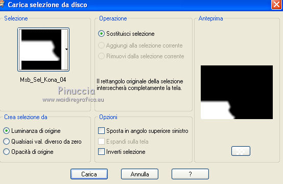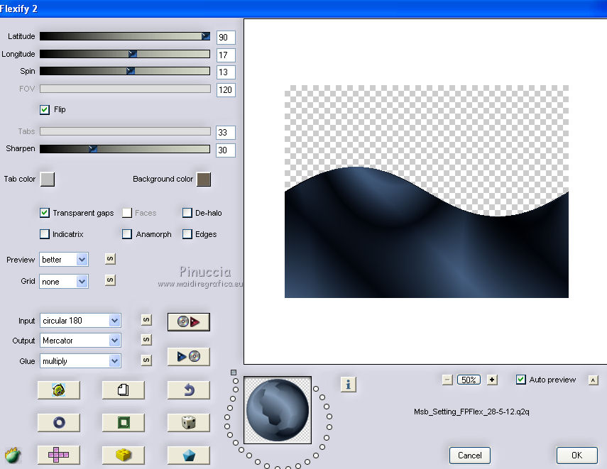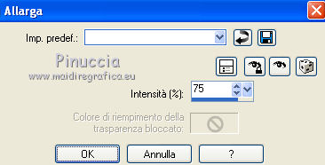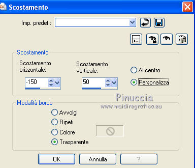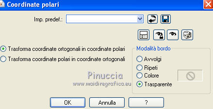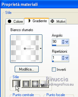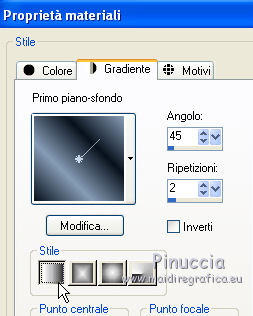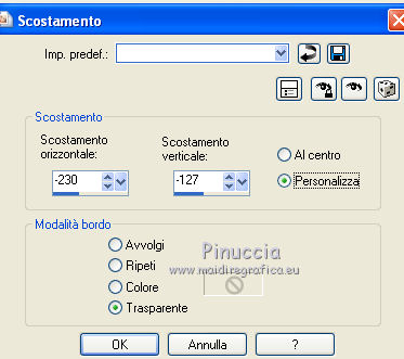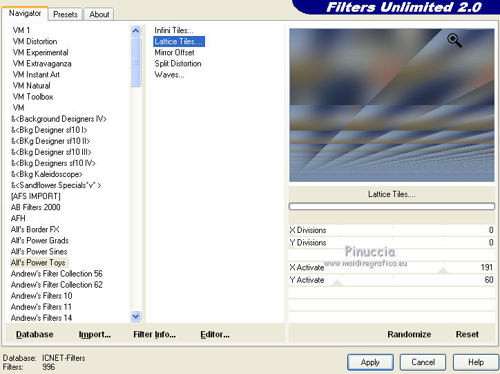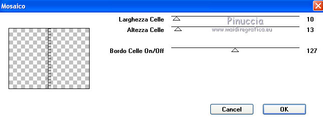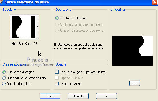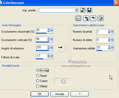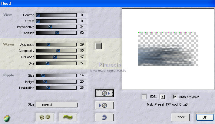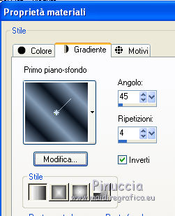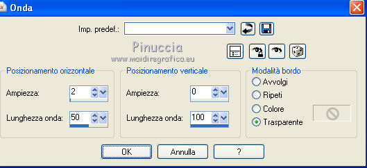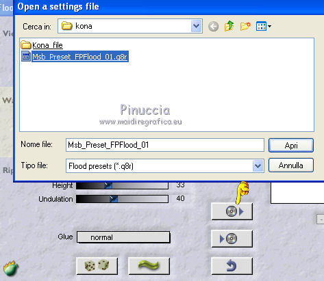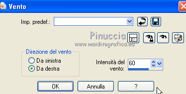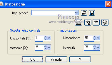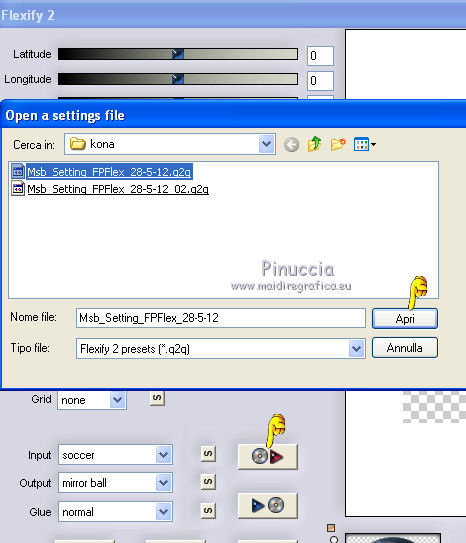 qui puoi trovare qualche risposta ai tuoi dubbi. Se l'argomento che ti interessa non è presente, ti prego di segnalarmelo. Per tradurre questo tutorial ho usato PSP X. Questo tutorial è una creazione ©Meetjesplekje e non può essere copiato su altri siti nè essere offerto per il download. Lo stesso vale per la mia traduzione. Il materiale viene da vari gruppi di condivisione. Il copyright appartiene ai rispettivi autori. Grazie ai creatori dei tubes che mettono a disposizione il loro lavoro in vari gruppi di condivisione. Occorrente: Materiale qui I tubes della donna e della farfalla sono di Maxyran. Il tube del vaso è di Crealine Il tube dell'uccello è di Patries La maschera è di Vix I tubes accessori sono di Stephanie, IvoChile, Nurso e MJR. Grazie a tutti gli autori per i loro bellissimi tubes. Filtri: consulta, se necessario, la mia sezione filtri qui Filters Unlimited 2.0 qui Alf's Power Toys - Lattice Tiles (da importare in Unlimited) qui &<Background Designer IV> - @Night Shadow qui Filter Factory Gallery D - Beta Ball qui Transparency - Eliminate Black qui It@lian Editors Effect - Mosaico qui Flaming Pear - Flexify 2 qui Flaming Pear - Flood qui Johann's Filters - Simmetric Pattern 1 qui Alien Skin Eye Candy 5 Impact qui Texture - Texturizer qui ![]() Metti le selezioni nella cartella Selezioni. Imposta il colore di primo piano con #09111c, e il colore di sfondo con #869db7. 1. Apri una nuova immagine trasparente 800 x 600 pixels. Selezione>Seleziona tutto. Apri l'immagine di sfondo Msb_BG_5-6-12 e vai a Modifica>Copia. Torna al tuo lavoro e vai a Modifica>Incolla nella selezione. Selezione>Deseleziona. 2. Livelli>Duplica - 2 volte. Effetti>Plugins>Filters Unlimited 2.0 - Alf’s Power Toys – Lattice Tiles, con i settaggi standard. ![]() Immagine>Capovolgi. Se non visualizzi i righelli, vai a Visualizza>Righelli. Premi il tasto K per attivare lo strumento Puntatore ![]() se stai usando PSP 9 il tasto D (valido per tutte le versioni), per attivare lo strumento deformazione ,e - in modalità Scala - spingi in basso il nodo superiore al centro, fino al 400 pixels. ![]() Cambia la modalità di miscelatura di questo livello in Luce diffusa. 3. Livelli>Nuovo livello raster. Selezione>Carica/Salva selezione>Carica selezione da disco. Cerca e carica la selezione Msb_Kona_01. ![]() Riempi la selezione con il colore di primo piano.Effetti>Plugins>Unlimited 2.0 – Render – Clouds(fore-/background color), con i settaggi standard. ![]() Selezione>Deseleziona. Di nuovo Effetti>Plugins>Filters Unlimited 2.0 – Render – Clouds(fore-/background color), con i settaggi standard. Abbassa l'opacità di questo livello al 47%. 4. Livelli>Nuovo livello raster. Selezione>Carica/Salva selezione>Carica selezione da disco. Cerca e carica la selezione Msb_Kona_02. ![]() Apri l'immagine !cid_5EDDC44CF4074B24ACOC6D9888FED9C6@pchpPC e vai a Modifica>Copia. Torna al tuo lavoro e vai a Modifica>Incolla nella selezione. Selezione>Deseleziona. Cambia la modalità di miscelatura di questo livello in Luminanza (Esistente), e abbassa l'opacità al 15%. Livelli>Disponi>Sposta giù. 5. Attiva il livello inferiore. Livelli>Duplica. Livelli>Disponi>Porta in alto. Effetti>Plugins>Filters Unlimited 2.0 – Filter Factory D – Beta Ball, con i settaggi standard. ![]() Effetti>Plugins>Transparency - Eliminate Black. Cambia la modalità di miscelatura di questo livello in Sovrapponi, e abbassa l'opacità al 70%. Chiudi il livello inferiore. ![]() Livelli>Unisci>Unisci visibile. Riapri il livello inferiore. 6. Passa il colore di primo piano a Gradiente, stile Lineare. ![]() Livelli>Nuovo livello raster. Riempi con il gradiente.Effetti>Plugins>Flaming Pear - Flexify 2. Clicca sull'icona con la freccia a destra, e cerca il preset Msb_Setting_FPFlex_28_5_12, nella cartella in cui hai salvato il materiale. Clicca su Apri ![]() e avrai i settaggi corrispondenti al preset. ricorda che i preset sono salvataggi di impostazioni; se hai problemi con l'importazione di questi preset, puoi sempre impostare manualmente i settaggi che vedi nella schermata ![]() Immagine>Ridimensiona, 600 x 450 pixels, bicubica, tutti i livelli non selezionato. ![]() Immagine>Ruota per gradi - 90 gradi a destra. ![]() Sposta l'immagine a sinistra, contro il bordo.Livelli>Duplica. Immagine>Rifletti. Immagine>Capovolgi. Chiudi il livello sottostante dell'originale. Strumento Puntatore/Deformazione (K/D), spingilo in alto contro il bordo. ![]() Cambia la modalità di miscelatura di questo livello in Filtra, e abbassa l'opacità al 50%. Effetti>Effetti di trama>Veneziana - con il colore di primo piano (#09111c). ![]() Effetti>Effetti di distorsione>Vento - da destra, intensità 50. ![]() 7. Apri il tube Msb_Deco_29-5-12tube e vai a Modifica>Copia. Torna al tuo lavoro e vai a Modifica>Incolla come nuovo livello. Spostalo a sinistra, contro il bordo.Lascia la modalità di miscelatura in Luce diffusa e l'opacità a 26. 8. Apri il tube gorgeousbluefacetransparant_t_litubetube e vai a Modifica>Copia. Torna al tuo lavoro e vai a Modifica>Incolla come nuovo livello. Immagine>Ridimensiona, all'80%, tutti i livelli non selezionato. Spostalo nell'angolo in alto a sinistra.![]() Cambia la modalità di miscelatura di questo livello in Luce diffusa, e abbassa l'opacità al 24%. 9. Apri e attiva il terzo livello dal basso. ![]() Livelli>Disponi>Porta in alto. Effetti>Plugins>Flaming Pear - Flexify 2. Clicca sull'icona con la freccia a destra e cerca il preset Msb_Setting_FPFlex_28-5-12_02. ![]() Effetti>Effetti di immagine>Scostamento. ![]() Cambia la modalità di miscelatura di questo livello in Luce diffusa, e abbassa l'opacità al 14%. Effetti>Effetti di distorsione>Vento - da destra, intensità 60. ![]() 10. Cambia Gradiente e seleziona il Gradiente Bianco sfumato, con i seguenti settaggi. ![]() Livelli>Nuovo livello raster. Attiva lo strumento Selezione ,clicca sull'icona Selezione personalizzata ![]() e imposta i seguenti settaggi: ![]() Riempi la selezion