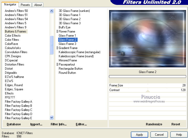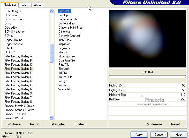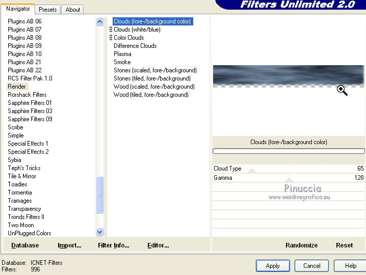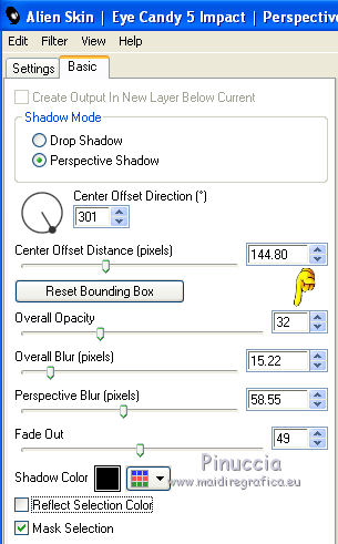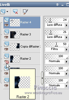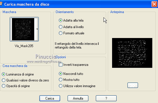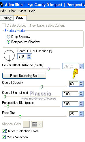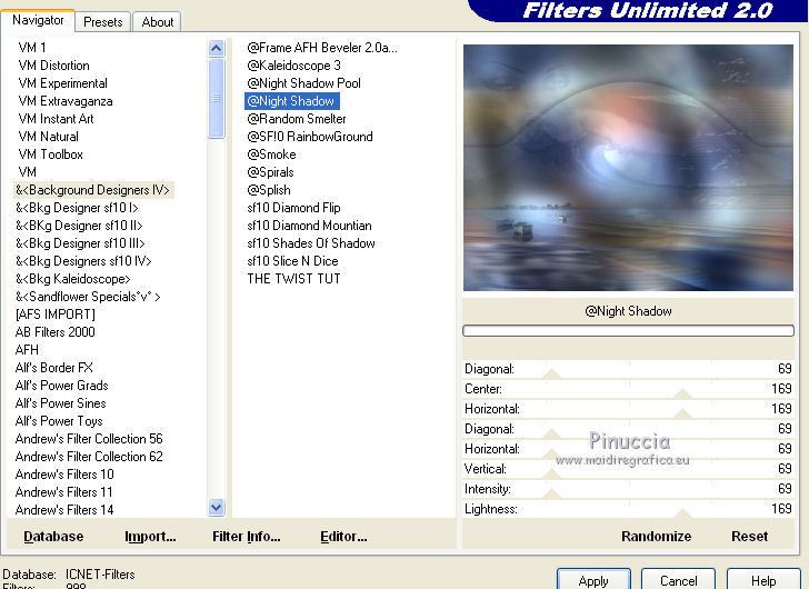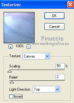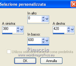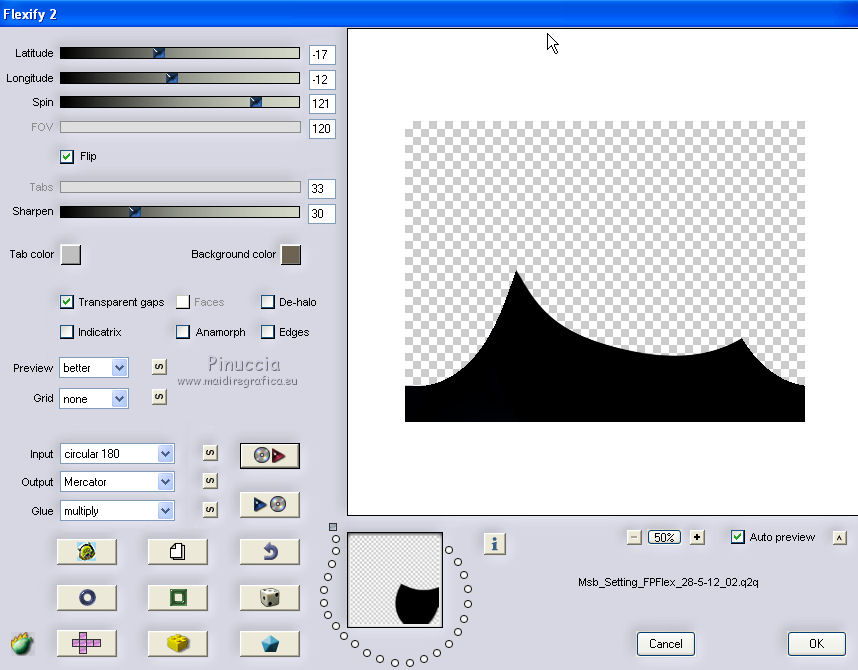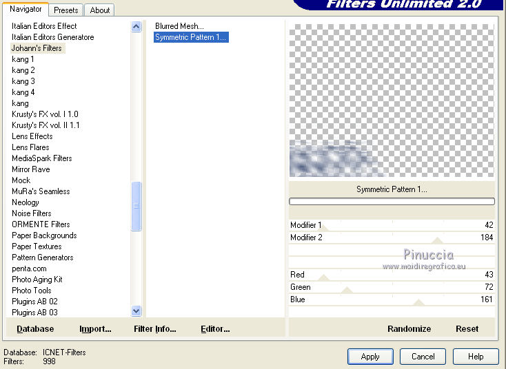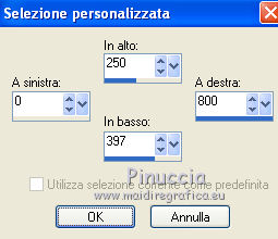qui puoi trovare qualche risposta ai tuoi dubbi. Se l'argomento che ti interessa non è presente, ti prego di segnalarmelo. Per tradurre questo tutorial ho usato PSP X. Questo tutorial è una creazione ©Meetjesplekje e non può essere copiato su altri siti nè essere offerto per il download. Lo stesso vale per la mia traduzione. Il materiale viene da vari gruppi di condivisione. Il copyright appartiene ai rispettivi autori. Grazie ai creatori dei tubes che mettono a disposizione il loro lavoro in vari gruppi di condivisione. Occorrente: Materiale qui I tubes della donna e della farfalla sono di Maxyran. Il tube del vaso è di Crealine Il tube dell'uccello è di Patries La maschera è di Vix I tubes accessori sono di Stephanie, IvoChile, Nurso e MJR. Grazie a tutti gli autori per i loro bellissimi tubes. Filtri: consulta, se necessario, la mia sezione filtri qui Filters Unlimited 2.0 qui Alf's Power Toys - Lattice Tiles (da importare in Unlimited) qui &<Background Designer IV> - @Night Shadow qui Filter Factory Gallery D - Beta Ball qui Transparency - Eliminate Black qui It@lian Editors Effect - Mosaico qui Flaming Pear - Flexify 2 qui Flaming Pear - Flood qui Johann's Filters - Simmetric Pattern 1 qui Alien Skin Eye Candy 5 Impact qui Texture - Texturizer qui ![]() Metti le selezioni nella cartella Selezioni. Imposta il colore di primo piano con #09111c, e il colore di sfondo con #869db7. 1. Apri una nuova immagine trasparente 800 x 600 pixels. Selezione>Seleziona tutto. Apri l'immagine di sfondo Msb_BG_5-6-12 e vai a Modifica>Copia. Torna al tuo lavoro e vai a Modifica>Incolla nella selezione. Selezione>Deseleziona. 2. Livelli>Duplica - 2 volte. Effetti>Plugins>Filters Unlimited 2.0 - Alf’s Power Toys – Lattice Tiles, con i settaggi standard. ![]() Immagine>Capovolgi. Se non visualizzi i righelli, vai a Visualizza>Righelli. Premi il tasto K per attivare lo strumento Puntatore ![]() se stai usando PSP 9 il tasto D (valido per tutte le versioni), per attivare lo strumento deformazione ,e - in modalità Scala - spingi in basso il nodo superiore al centro, fino al 400 pixels. ![]() Cambia la modalità di miscelatura di questo livello in Luce diffusa. 3. Livelli>Nuovo livello raster. Selezione>Carica/Salva selezione>Carica selezione da disco. Cerca e carica la selezione Msb_Kona_01. ![]() Riempi la selezione con il colore di primo piano.Effetti>Plugins>Unlimited 2.0 – Render – Clouds(fore-/background color), con i settaggi standard. ![]() Selezione>Deseleziona. Di nuovo Effetti>Plugins>Filters Unlimited 2.0 – Render – Clouds(fore-/background color), con i settaggi standard. Abbassa l'opacità di questo livello al 47%. 4. Livelli>Nuovo livello raster. Selezione>Carica/Salva selezione>Carica selezione da disco. Cerca e carica la selezione Msb_Kona_02. ![]() Apri l'immagine !cid_5EDDC44CF4074B24ACOC6D9888FED9C6@pchpPC e vai a Modifica>Copia. Torna al tuo lavoro e vai a Modifica>Incolla nella selezione. Selezione>Deseleziona. Cambia la modalità di miscelatura di questo livello in Luminanza (Esistente), e abbassa l'opacità al 15%. Livelli>Disponi>Sposta giù. 5. Attiva il livello inferiore. Livelli>Duplica. Livelli>Disponi>Porta in alto. Effetti>Plugins>Filters Unlimited 2.0 – Filter Factory D – Beta Ball, con i settaggi standard. ![]() Effetti>Plugins>Transparency - Eliminate Black. Cambia la modalità di miscelatura di questo livello in Sovrapponi, e abbassa l'opacità al 70%. Chiudi il livello inferiore. ![]() Livelli>Unisci>Unisci visibile. Riapri il livello inferiore. 6. Passa il colore di primo piano a Gradiente, stile Lineare. ![]() Livelli>Nuovo livello raster. Riempi con il gradiente.Effetti>Plugins>Flaming Pear - Flexify 2. Clicca sull'icona con la freccia a destra, e cerca il preset Msb_Setting_FPFlex_28_5_12, nella cartella in cui hai salvato il materiale. Clicca su Apri ![]() e avrai i settaggi corrispondenti al preset. ricorda che i preset sono salvataggi di impostazioni; se hai problemi con l'importazione di questi preset, puoi sempre impostare manualmente i settaggi che vedi nella schermata ![]() Immagine>Ridimensiona, 600 x 450 pixels, bicubica, tutti i livelli non selezionato. ![]() Immagine>Ruota per gradi - 90 gradi a destra. ![]() Sposta l'immagine a sinistra, contro il bordo.Livelli>Duplica. Immagine>Rifletti. Immagine>Capovolgi. Chiudi il livello sottostante dell'originale. Strumento Puntatore/Deformazione (K/D), spingilo in alto contro il bordo. ![]() Cambia la modalità di miscelatura di questo livello in Filtra, e abbassa l'opacità al 50%. Effetti>Effetti di trama>Veneziana - con il colore di primo piano (#09111c). ![]() Effetti>Effetti di distorsione>Vento - da destra, intensità 50. ![]() 7. Apri il tube Msb_Deco_29-5-12tube e vai a Modifica>Copia. Torna al tuo lavoro e vai a Modifica>Incolla come nuovo livello. Spostalo a sinistra, contro il bordo.Lascia la modalità di miscelatura in Luce diffusa e l'opacità a 26. 8. Apri il tube gorgeousbluefacetransparant_t_litubetube e vai a Modifica>Copia. Torna al tuo lavoro e vai a Modifica>Incolla come nuovo livello. Immagine>Ridimensiona, all'80%, tutti i livelli non selezionato. Spostalo nell'angolo in alto a sinistra.![]() Cambia la modalità di miscelatura di questo livello in Luce diffusa, e abbassa l'opacità al 24%. 9. Apri e attiva il terzo livello dal basso. ![]() Livelli>Disponi>Porta in alto. Effetti>Plugins>Flaming Pear - Flexify 2. Clicca sull'icona con la freccia a destra e cerca il preset Msb_Setting_FPFlex_28-5-12_02. ![]() Effetti>Effetti di immagine>Scostamento. ![]() Cambia la modalità di miscelatura di questo livello in Luce diffusa, e abbassa l'opacità al 14%. Effetti>Effetti di distorsione>Vento - da destra, intensità 60. ![]() 10. Cambia Gradiente e seleziona il Gradiente Bianco sfumato, con i seguenti settaggi. ![]() Livelli>Nuovo livello raster. Attiva lo strumento Selezione ,clicca sull'icona Selezione personalizzata ![]() e imposta i seguenti settaggi: ![]() Riempi la selezion