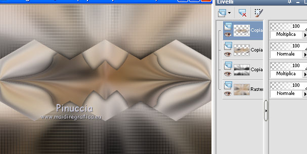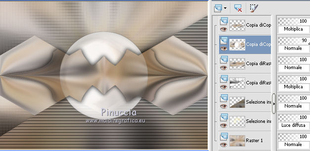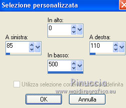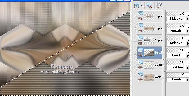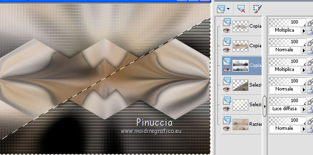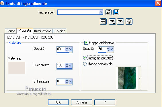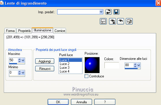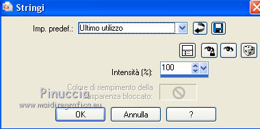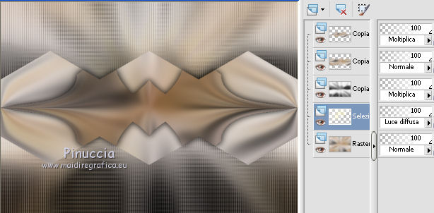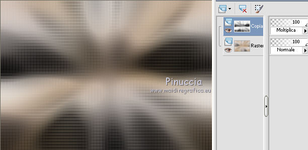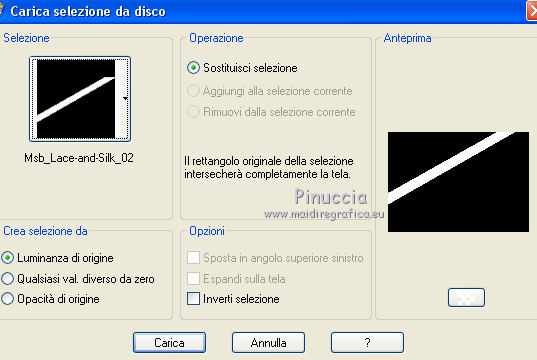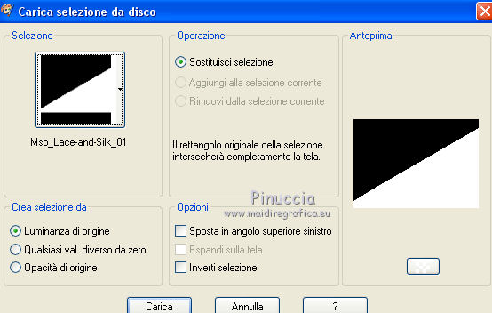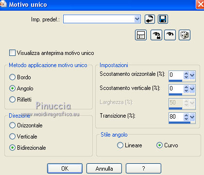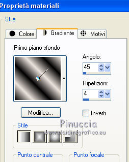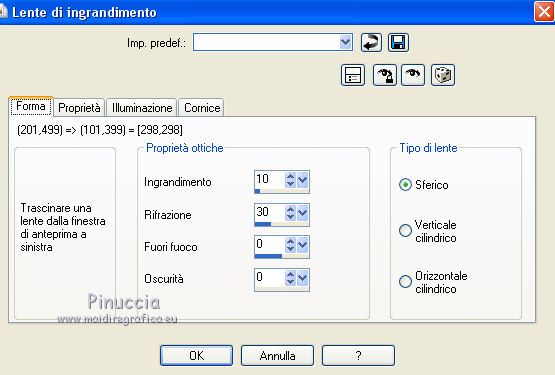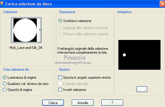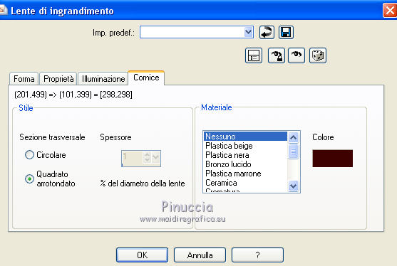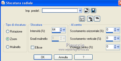 qui puoi trovare qualche risposta ai tuoi dubbi. Se l'argomento che ti interessa non è presente, ti prego di segnalarmelo. Questo tutorial è una creazione ©Meetjesplekje e non può essere copiato su altri siti nè essere offerto per il download. Lo stesso vale per la mia traduzione. Il materiale viene da vari gruppi di condivisione. Il copyright appartiene ai rispettivi autori. Grazie ai creatori dei tubes che mettono a disposizione il loro lavoro in vari gruppi di condivisione. Per tradurre questo tutorial ho usato CorelX, ma può essere realizzato anche con le altre versioni di PSP. Dalla versione X4, il comando Immagine>Rifletti è stato sostituito con Immagine>Capovolgi in orizzontale, e il comando Immagine>Capovolgi con Immagine>Capovolgi in verticale. Nelle versioni X5 e X6, le funzioni sono state migliorate rendendo disponibile il menu Oggetti. Con la nuova versione X7, sono tornati Rifletti>Capovolgi, ma con nuove varianti. Vedi la scheda sull'argomento qui traduzione francese/traduction française qui/ici le vostre versioni/vos versions qui/ici Occorrente: Materiale qui Per il tube della donna grazie Annelies Filtri: consulta, se necessario, la mia sezione filtri qui Filters Unlimited 2.0 qui Plugins AB21 - Cheap Video Trick qui Transparency - Eliminate White qui &<Bkg Kaleidoscope> - Radial Replicate (da importare in Unlimited) qui It@lian Editors - Effetto Fantasma qui Dragonfly - Sinedots II qui Flaming Pear - Flexify 2 qui I filtri Plugins AB, Italian Editors e Transparency si possono usare da soli o importati in Filters Unlimited (come fare vedi qui) Se un filtro fornito appare con questa icona ![]() Se stai usando altri colori puoi sperimentare le modalità di miscelatura e le opacità più adatte ai tuoi colori. Apri il font e minimizzalo. Lo troverai nella lista dei font disponibili quando ti servirà. Con i nuovi sistemi operativi questo non è più possibile. Per usare un font, occorre copiarlo nella cartella Font di Windows. Metti le selezioni nella cartella Selezioni. Imposta il colore di primo piano con il colore nero #000000, e il colore di sfondo con #ebe2db. ![]() Passa il colore di primo piano a Gradiente di primo piano/sfondo, stile Lineare. ![]() 1. Apri una nuova immagine trasparente 700 x 500 pixels, e riempila con il gradiente.Selezione>Seleziona tutto. Apri il tube Alies 362-vrouwen-02122010, e vai a Modifica>Copia. non chiuderlo perchè ti servirà ancora Torna al tuo lavoro e vai a Modifica>Incolla nella selezione. Selezione>Deseleziona. Effetti>Effetti di immagine>Motivo unico, con i settaggi standard. ![]() Regola>Sfocatura>Sfocatura radiale. ![]() Regola>Sfocatura>Sfocatura gaussiana - raggio 20. ![]() Livelli>Duplica. 2. Effetti>Plugins>Filters Unlimited 2.0 – Plugins AB21 - Cheap Video Trick, con i settaggi standard. ![]() Regola>Tonalità e Saturazione>Viraggio. ![]() Cambia la modalità di miscelatura di questo livello in Moltiplica. ![]() Attiva il livello inferiore. 3. Livelli>Duplica. Livelli>Disponi>Porta in alto. Effetti>Plugins>Flaming Pear - Flexify 2. ![]() Livelli>Duplica. Effetti>Effetti di distorsione>Stringi (nelle versioni più recenti è diventato Compressione). ![]() Effetti>Plugins>Flaming Pear - Flexify 2, con i settaggi precedenti. ![]() Effetti>Effetti 3D>Sfalsa ombra, colore nero. ![]() Ripeti l'Effetto Sfalsa ombra, cambiando verticale e orizzontale con -2. Cambia la modalità di miscelatura di questo livello in Moltiplica. ![]() 4. Attiva il livello inferiore. Selezione>Carica/Salva selezione>Carica selezione da disco. Cerca e carica la selezione Msb_Lace-and-Silk_01. ![]() Selezione>Innalza selezione a livello. Effetti>Plugins>Filters Unlimited 2.0 - &<Bkg Kaleidoscope> - Radial Replicate. ![]() Effetti>Plugins>Transparency - Eliminate White. Selezione>Deseleziona. Immagine>Rifletti. Immagine>Capovolgi. Effetti>Effetti 3D>Sfalsa ombra, colore nero. ![]() Effetti>Effetti di distorsione>Vento - da sinistra - intensità 80. ![]() Cambia la modalità di miscelatura di questo livello in Luce diffusa. ![]() Attiva nuovamente il livello inferiore. 5. Selezione>Carica/Salva selezione>Carica selezione da disco. Carica nuovamente la selezione Msb_Lace-and-Silk_01. ![]() Selezione>Innalza selezione a livello. Livelli>Disponi>Sposta su. Effetti>Plugins>Filters Unlimited 2.0 – Video – Interlace, con i settaggi standard. ![]() Attiva il livello soprastante ![]() e premi sulla tastiera il tasto CANC ![]() Attiva il terzo livello dal basso. ![]() Selezione>Deseleziona. Effetti>Effetti 3D>Sfalsa ombra, colore nero. ![]() 6. Attiva il secondo livello dall'alto. ![]() Livelli>Duplica. Effetti>Effetti artistici>Lente di ingrandimento. Forma: ![]() Proprietà - materiale: colore di sfondo ![]() Illuminazione: ![]() Cornice: ![]() Abbassa l'opacità di questo livello al 90%. ![]() Attiva il livello sottostante. 7. Livelli>Nuovo livello raster. Selezione>Carica/Salva selezione>Carica selezione da disco. Cerca e carica la selezione Msb_Lace-and-Silk_02. ![]() Riempi la selezione con il gradiente.Selezione>Deseleziona. Effetti>Plugins>It@lian Editors Effect - Effetto Fantasma. ![]() Livelli>Duplica. Immagine>Rifletti. Livelli>Unisci>Unisci giù. Livelli>Duplica. Immagine>Capovolgi. Livelli>Unisci>Unisci giù. Effetti>Effetti 3D>Sfalsa ombra, colore nero. ![]() Abbassa l'opacità di questo livello al 63%. 8. Livelli>Nuovo livello raster. Effetti>Plugins>Dragonfly - Sinedots II. ![]() Selezione>Carica/Salva selezione>Carica selezione da disco. Cerca e carica la selezione Msb_Lace-and-Silk_03. ![]() Premi sulla tastiera il tasto CANC. 9. Attiva il livello superiore. Livelli>Nuovo livello raster. Attiva nuovamente il tube Alies 362-vrouwen-021222010. Immagine>Rifletti. Attiva lo strumento Selezione , cerchio,e traccia un cerchio pressappoco come nell'esempio. ![]() Modifica>Copia. Selezione>Deseleziona. Immagine>Rifletti, e minimizza il tube che ti servirà ancora. Torna al tuo lavoro e vai a Modifica>Incolla nella selezione. Selezione>Deselezi