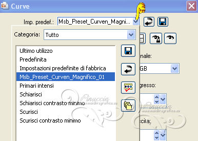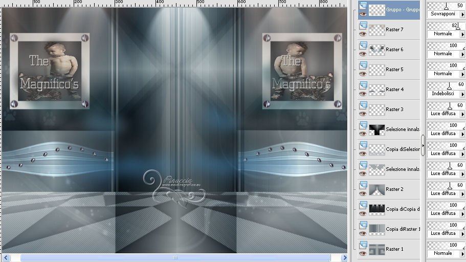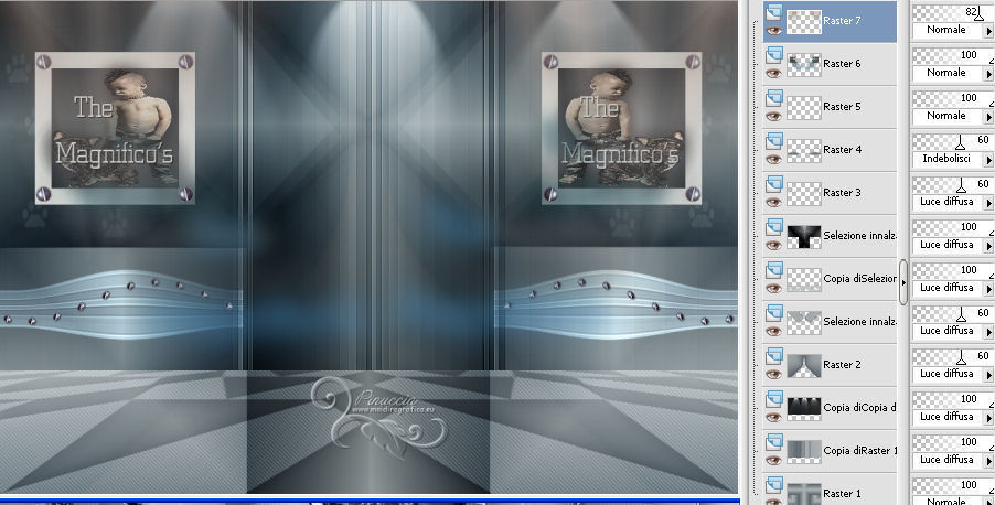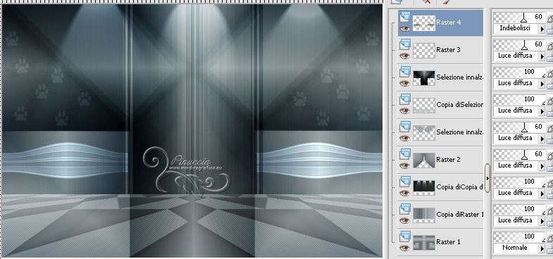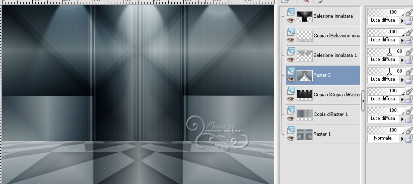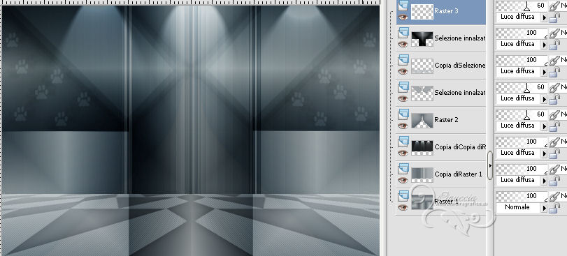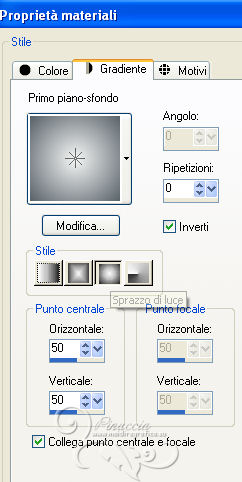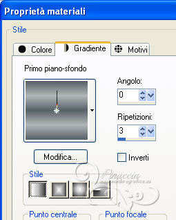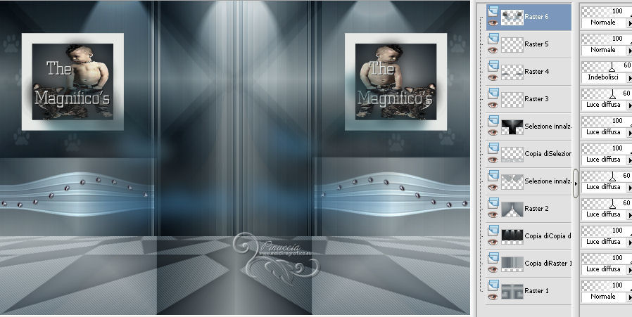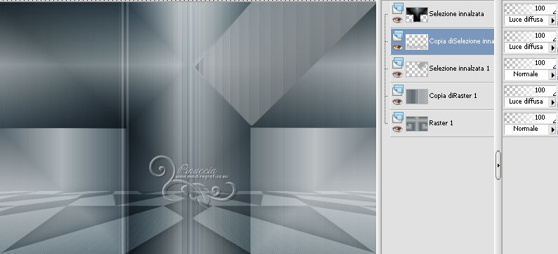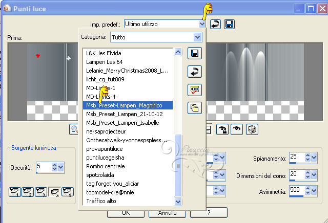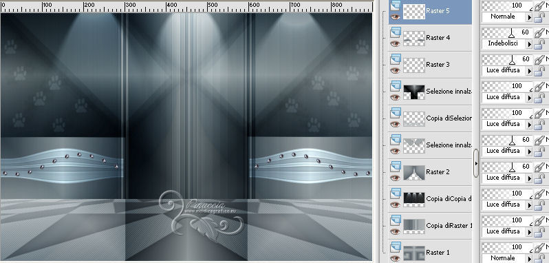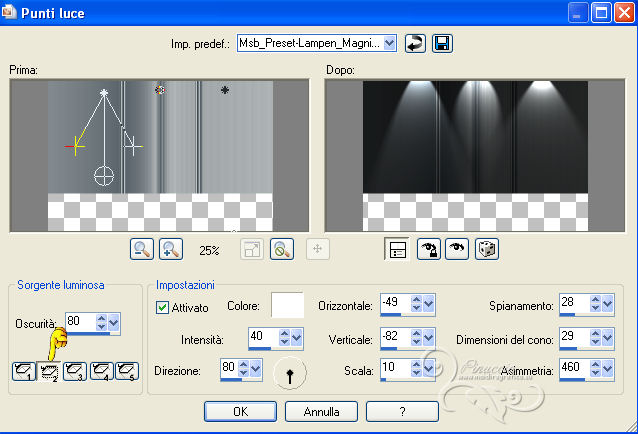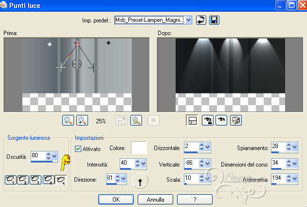 qui puoi trovare qualche risposta ai tuoi dubbi. Se l'argomento che ti interessa non è presente, ti prego di segnalarmelo. Questo tutorial è una creazione ©Meetjesplekje e non può essere copiato su altri siti nè essere offerto per il download. Lo stesso vale per la mia traduzione. Il materiale viene da vari gruppi di condivisione. Il copyright appartiene ai rispettivi autori. Grazie ai creatori dei tubes che mettono a disposizione il loro lavoro in vari gruppi di condivisione. Per tradurre questo tutorial ho usato PSP X, ma può essere eseguito anche con le altre versioni di PSP, con alcuni aggiustamenti per le versioni più recenti X14 e X15. Una differenza con queste versioni riguarda le funzioni Rifletti/Capovolgi Vedi la mia scheda qui Occorrente: Materiale qui Per il tube grazie Alies Filtri: consulta, se necessario, la mia sezione filtri qui Filters Unlimited 2.0 qui Simple - Blintz, Half Wrap qui Tramages - Glass Pyramids qui Carolaine and Sensibility - CS_Halloween 2 qui Mura's Meister - Perspective Tiling qui L&K landsiteofwonders - L & K's Raisa qui Alien Skin Eye Candy 5 Impact - Perspective Shadow, Backlight qui Flaming Pear - Flexify 2 qui Toadies - What are you qui Graphics Plus - Cross Shadow qui I filtri Tramages, Toadies, Graphics Plus e Simple si possono usare da soli o importati in Filters Unlimited. (come fare vedi qui). Se un filtro fornito appare con questa icona ![]() Se stai usando altri colori puoi sperimentare le modalità di miscelatura e le opacità più adatte ai tuoi colori. Metti i preset nelle rispettive cartelle del filtro Alien Skin Eye Candy 5 Impact>Settings>Shadow/Backlight. Cliccando sul file una o due volte (a seconda delle tue impostazioni), automaticamente il preset si installerà nella cartella corretta. perchè uno o due clic vedi qui Metti i preset "Preset_ColorAdjustCurves_Msb Preset Curven Magnifico 01", "Preset_Lights_Msb Preset-Lampen Magnifico" e "Preset Pick Msb Magnifico 01" nella cartella Impostazioni predefinite. Metti le selezioni nella cartella Selezioni. La forma predefinita Corel_11_090 è standard nelle versioni più recenti di PSP. Se non la trovi nel tuo PSP, metti quella fornita nella cartella Forme predefinite. Apri le maschere in PSP e minimizzale con il resto del materiale. Imposta il colore di primo piano con #576168, e il colore di sfondo con #b1b6b7. ![]() Passa il colore di primo piano a Gradiente, stile Lineare, ![]() 1. Apri una nuova immagine trasparente 900 x 600 pixels, e riempila con il gradiente.Effetti>Plugins>Filters Unlimited 2.0 - Simple - Blintz. ![]() Effetti>Plugins>Filters Unlimited 2.0 - Simple - Half Wrap. ![]() Selezione>Carica/Salva selezione>Carica selezione da disco. Cerca e carica la selezione Msb_Sel_Magnificos_01. ![]() Selezione>Innalza selezione a livello. Selezione>Deseleziona. Effetti>Plugins>Filters Unlimited 2.0 – Tramages – Glass Pyramids: ![]() Cambia la modalità di miscelatura di questo livello in Luce diffusa. 2. Attiva il livello inferiore. Livelli>Duplica. Effetti>Plugins>L&K's - Raisa. ![]() Cambia la modalità di miscelatura di questo livello in Luce diffusa. Effetti>Effetti di bordo>Aumenta. 3. Selezione>Carica/Salva selezione>Carica selezione da disco. Cerca e carica la selezione Msb_Sel_Magnificos_02. ![]() Selezione>Innalza selezione a livello. Livelli>Duplica. Di nuovo Livelli>Duplica. Selezione>Deseleziona. Immagine>Rifletti. Livelli>Unisci>Unisci giù. Immagine>Capovolgi. Effetti>Plugins>Mura's Meister - Perspective Tiling. ![]() Effetti>Plugins>Carolaine and Sensibility – CS-DLines. ![]() Effetti 3D>Sfalsa ombra, con il colore nero. ![]() Cambia la modalità di miscelatura di questo livello in Luce diffusa. ![]() 4. Attiva il livello sottostante (selezione innalzata 1). ![]() Livelli>Duplica. Immagine>Rifletti. Livelli>Unisci>Unisci giù. Effetti>Effetti 3D>Sfalsa ombra, con il colore nero. ![]() Cambia la modalità di miscelatura di questo livello in Luce diffusa, e abbassa l'opacità al 60%. Effetti>Plugins>Toadies - What are you. ![]() Dovresti avere questo. ![]() 6. Apri Msb_Strip e vai a Modifica>Copia. Torna al tuo lavoro e vai a Modifica>Incolla come nuovo livello. Immagine>Rifletti. Effetti>Effetti di immagine>Scostamento. ![]() Livelli>Disponi>Sposta giù. Livelli>Unisci>Unisci giù. Attiva lo strumento Selezione ,clicca sull'icona Selezione personalizzata ![]() e imposta i seguenti settaggi: ![]() Premi sulla tastiera il tasto CANC ![]() Selezione>Deseleziona. 6. Livelli>Duplica. Effetti>Effetti di illuminazione>Punti luce. Seleziona il preset Msb_Preset-Lampen_Magnifico e ok. ![]() Questi i settaggi che, in caso di problemi con il preset, puoi impostare manualmente. I punti luce utilizzati sono 1, 2 e 5. ![]() ![]() ![]() Se stai usando PSP 9, questo preset ti darà un messaggio di errore. Usa il preset che ho creato con questa versione e che trovi qui 7. Apri Msb_Template_Magnifico e vai a Modifica>Copia. Torna al tuo lavoro e vai a Modifica>Incolla come nuovo livello. Effetti>Effetti di immagine>Scostamento. ![]() Livelli>Duplica. Immagine>Rifletti. Livelli>Unisci>Unisci giù. Effetti>Effetti 3D>Sfalsa ombra, con il colore nero. ![]() Cambia la modalità di miscelatura di questo livello in Luce diffusa, e abbassa l'opacità al 60%. ![]() 8. Attiva lo strumento Forme predefinite ![]() e seleziona la forma Corel_11_90: ![]() Traccia una piccola orma nella sezione inclinata, come nell'esempio. ![]() Livelli>Converti in livello raster. Livelli>Disponi>Porta in alto. Modifica>Copia. Modifica>Incolla come nuova selezione. Ripeti Modifica>Incolla come nuova selezione per ogni nuova orma. Dovresti avere questo. ![]() Selezione>Deseleziona. Effetti>Effetti 3D>Sfalsa ombra, con il colore nero. ![]() Ripeti l'Effetto Sfalsa cambiando verticale e orizzontale con -10/20. ![]() Livelli>Duplica. Immagine>Rifletti. Livelli>Unisci>Unisci giù. Cambia la modalità di miscelatura di questo livello in Luce diffusa, e abbassa l'opacità al 60%. Dovresti avere questo. ![](