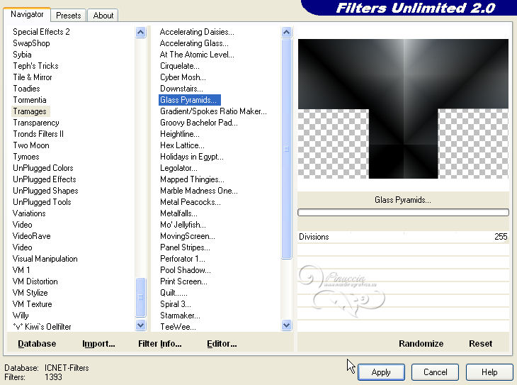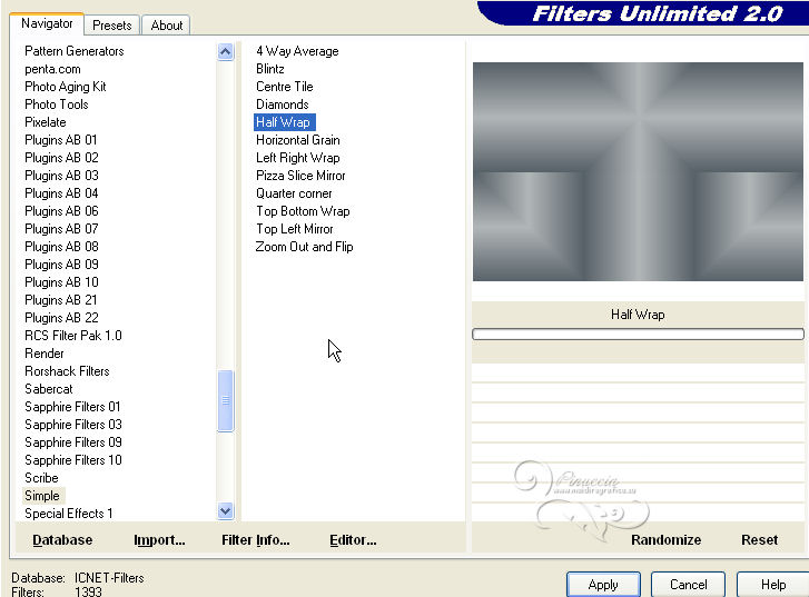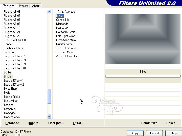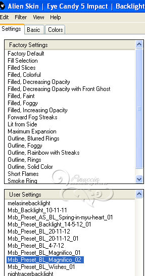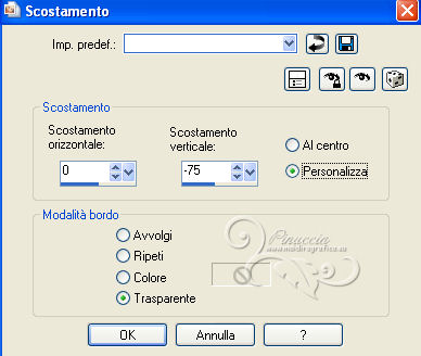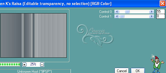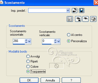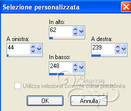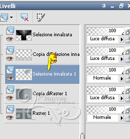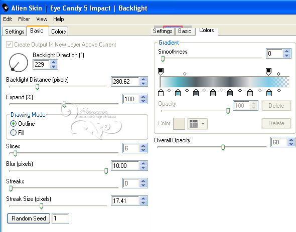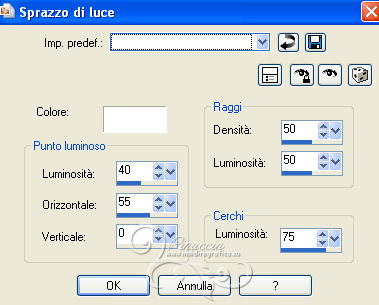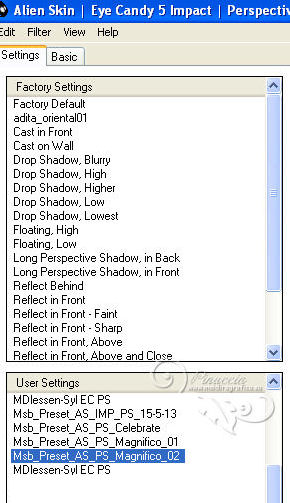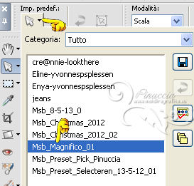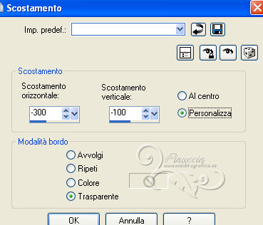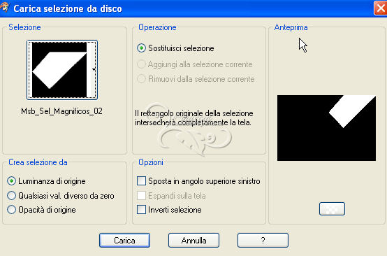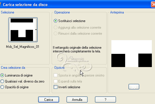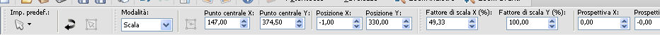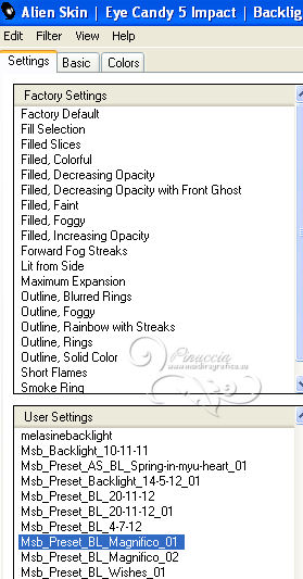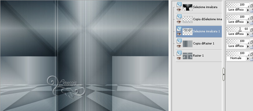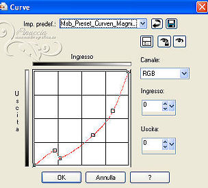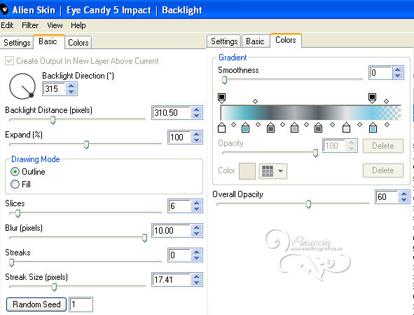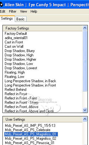 qui puoi trovare qualche risposta ai tuoi dubbi. Se l'argomento che ti interessa non è presente, ti prego di segnalarmelo. Questo tutorial è una creazione ©Meetjesplekje e non può essere copiato su altri siti nè essere offerto per il download. Lo stesso vale per la mia traduzione. Il materiale viene da vari gruppi di condivisione. Il copyright appartiene ai rispettivi autori. Grazie ai creatori dei tubes che mettono a disposizione il loro lavoro in vari gruppi di condivisione. Per tradurre questo tutorial ho usato PSP X, ma può essere eseguito anche con le altre versioni di PSP, con alcuni aggiustamenti per le versioni più recenti X14 e X15. Una differenza con queste versioni riguarda le funzioni Rifletti/Capovolgi Vedi la mia scheda qui Occorrente: Materiale qui Per il tube grazie Alies Filtri: consulta, se necessario, la mia sezione filtri qui Filters Unlimited 2.0 qui Simple - Blintz, Half Wrap qui Tramages - Glass Pyramids qui Carolaine and Sensibility - CS_Halloween 2 qui Mura's Meister - Perspective Tiling qui L&K landsiteofwonders - L & K's Raisa qui Alien Skin Eye Candy 5 Impact - Perspective Shadow, Backlight qui Flaming Pear - Flexify 2 qui Toadies - What are you qui Graphics Plus - Cross Shadow qui I filtri Tramages, Toadies, Graphics Plus e Simple si possono usare da soli o importati in Filters Unlimited. (come fare vedi qui). Se un filtro fornito appare con questa icona ![]() Se stai usando altri colori puoi sperimentare le modalità di miscelatura e le opacità più adatte ai tuoi colori. Metti i preset nelle rispettive cartelle del filtro Alien Skin Eye Candy 5 Impact>Settings>Shadow/Backlight. Cliccando sul file una o due volte (a seconda delle tue impostazioni), automaticamente il preset si installerà nella cartella corretta. perchè uno o due clic vedi qui Metti i preset "Preset_ColorAdjustCurves_Msb Preset Curven Magnifico 01", "Preset_Lights_Msb Preset-Lampen Magnifico" e "Preset Pick Msb Magnifico 01" nella cartella Impostazioni predefinite. Metti le selezioni nella cartella Selezioni. La forma predefinita Corel_11_090 è standard nelle versioni più recenti di PSP. Se non la trovi nel tuo PSP, metti quella fornita nella cartella Forme predefinite. Apri le maschere in PSP e minimizzale con il resto del materiale. Imposta il colore di primo piano con #576168, e il colore di sfondo con #b1b6b7. ![]() Passa il colore di primo piano a Gradiente, stile Lineare, ![]() 1. Apri una nuova immagine trasparente 900 x 600 pixels, e riempila con il gradiente.Effetti>Plugins>Filters Unlimited 2.0 - Simple - Blintz. ![]() Effetti>Plugins>Filters Unlimited 2.0 - Simple - Half Wrap. ![]() Selezione>Carica/Salva selezione>Carica selezione da disco. Cerca e carica la selezione Msb_Sel_Magnificos_01. ![]() Selezione>Innalza selezione a livello. Selezione>Deseleziona. Effetti>Plugins>Filters Unlimited 2.0 – Tramages – Glass Pyramids: ![]() Cambia la modalità di miscelatura di questo livello in Luce diffusa. 2. Attiva il livello inferiore. Livelli>Duplica. Effetti>Plugins>L&K's - Raisa. ![]() Cambia la modalità di miscelatura di questo livello in Luce diffusa. Effetti>Effetti di bordo>Aumenta. 3. Selezione>Carica/Salva selezione>Carica selezione da disco. Cerca e carica la selezione Msb_Sel_Magnificos_02. ![]() Selezione>Innalza selezione a livello. Livelli>Duplica. Di nuovo Livelli>Duplica. Selezione>Deseleziona. Immagine>Rifletti. Livelli>Unisci>Unisci giù. Immagine>Capovolgi. Effetti>Plugins>Mura's Meister - Perspective Tiling. ![]() Effetti>Plugins>Carolaine and Sensibility – CS-DLines. ![]() Effetti 3D>Sfalsa ombra, con il colore nero. ![]() Cambia la modalità di miscelatura di questo livello in Luce diffusa. ![]() 4. Attiva il livello sottostante (selezione innalzata 1). ![]() Livelli>Duplica. Immagine>Rifletti. Livelli>Unisci>Unisci giù. Effetti>Effetti 3D>Sfalsa ombra, con il colore nero. ![]() Cambia la modalità di miscelatura di questo livello in Luce diffusa, e abbassa l'opacità al 60%. Effetti>Plugins>Toadies - What are you. ![]() Dovresti avere questo. ![]() 6. Apri Msb_Strip e vai a Modifica>Copia. Torna al tuo lavoro e vai a Modifica>Incolla come nuovo livello. Immagine>Rifletti. Effetti>Effetti di immagine>Scostamento. ![]() Livelli>Disponi>Sposta giù. Livelli>Unisci>Unisci giù. Attiva lo strumento Selezione ,clicca sull'icona Selezione personalizzata ![]() e imposta i seguenti settaggi: ![]() Premi sulla tastiera il tasto CANC ![]() Selezione>Deseleziona. 6. Livelli>Duplica. Effetti>Effetti di illuminazione>Punti luce. Seleziona il preset Msb_Preset-Lampen_Magnifico e ok. ![]() Questi i settaggi che, in caso di problemi con il preset, puoi impostare manualmente. I punti luce utilizzati sono 1, 2 e 5. ![]() ![]() ![]() Se stai usando PSP 9, questo preset ti darà un messaggio di errore. Usa il preset che ho creato con questa versione e che trovi qui 7. Apri Msb_Template_Magnifico e vai a Modifica>Copia. Torna al tuo lavoro e vai a Modifica>Incolla come nuovo livello. Effetti>Effetti di immagine>Scostamento. ![]() Livelli>Duplica. Immagine>Rifletti. Livelli>Unisci>Unisci giù. Effetti>Effetti 3D>Sfalsa ombra, con il colore nero. ![]() Cambia la modalità di miscelatura di questo livello in Luce diffusa, e abbassa l'opacità al 60%. ![]() 8. Attiva lo strumento Forme predefinite ![]() e seleziona la forma Corel_11_90: ![]() Traccia una piccola orma nella sezione inclinata, come nell'esempio. ![]() Livelli>Converti in livello raster. Livelli>Disponi>Porta in alto. Modifica>Copia. Modifica>Incolla come nuova selezione. Ripeti Modifica>Incolla come nuova selezione per ogni nuova orma. Dovresti avere questo. ![]() Selezione>Deseleziona. Effetti>Effetti 3D>Sfalsa ombra, con il colore nero. ![]() Ripeti l'Effetto Sfalsa cambiando verticale e orizzontale con -10/20. ![]() Livelli>Duplica. Immagine>Rifletti. Livelli>Unisci>Unisci giù. Cambia la modalità di miscelatura di questo livello in Luce diffusa, e abbassa l'opacità al 60%. Dovresti avere questo. ![](