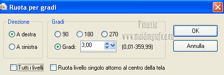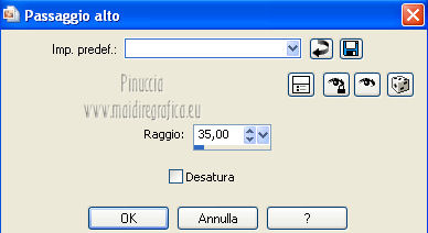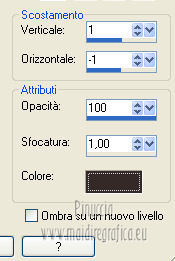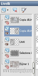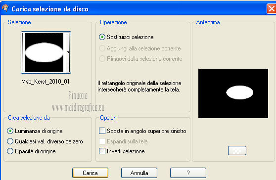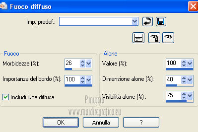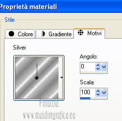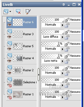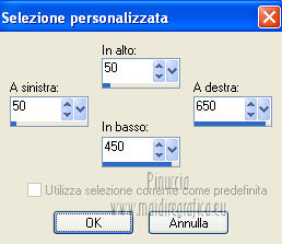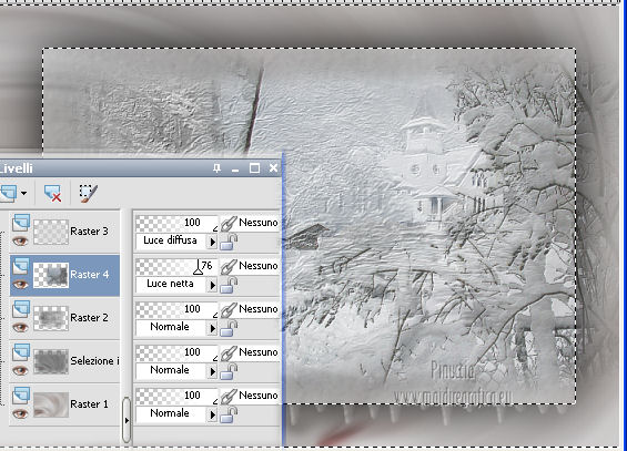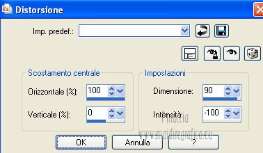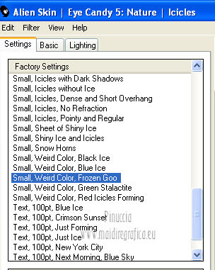 qui puoi trovare qualche risposta ai tuoi dubbi. Se l'argomento che ti interessa non è presente, ti prego di segnalarmelo. Questo tutorial è una creazione ©Meetjesplekje e non può essere copiato su altri siti nè essere offerto per il download. Lo stesso vale per la mia traduzione. Il materiale viene da vari gruppi di condivisione. Il copyright appartiene ai rispettivi autori. Grazie ai creatori dei tubes che mettono a disposizione il loro lavoro in vari gruppi di condivisione. Per tradurre questo tutorial ho usato PSP X. Occorrente: Materiale qui Il tube della donna è di Liza Il tube del paesaggio è di Pascale. Il tube dei rami è di Dragonblu. Il tube dell'albero è di Bärbel. Liza, Pascale, Dragonblu e Bärbel grazie. Filtri: consulta, se necessario, la mia sezione filtri qui FM Tile Tools - Blend Emboss qui Alien Skin Eye Candy 5 Nature - Icicles qui Flaming Pear - Flexify 2 qui ![]() Imposta il colore di primo piano con #a9a19e, e il colore di sfondo con #eaeaea. Passa il colore di primo piano a Gradiente, stile Sprazzo di luce, con i seguenti settaggi. ![]() 1. Apri una nuova immagine trasparente 700 x 500 pixels, e riempila con il gradiente.Livelli>Nuovo livello raster. Selezione>Seleziona tutto. Apri il tube liza tube lady in with winter-outfit 14-10-2010 e vai a Modifica>Copia. non chiuderlo perchè ti servirà ancora Torna al tuo lavoro e vai a Modifica>Incolla nella selezione. Selezione>Deseleziona. Effetti>Effetti di immagine>Motivo unico, con i settaggi standard. ![]() Regola>Sfocatura>Sfocatura radiale. ![]() Livelli>Unisci>Unisci giù. 2. Attiva lo strumento Selezione ,clicca sull'icona Selezione personalizzata ![]() e imposta i seguenti settaggi: ![]() Selezione>Innalza selezione a livello. Selezione>Deseleziona. Effetti>Effetti di bordo>Passaggio alto. ![]() Di nuovo Selezione personalizzata ![]() con i settaggi precedenti. ![]() 3. Livelli>Nuovo livello raster. Apri il tube PPT_Snow_Landscape e vai a Modifica>Copia. Torna al tuo lavoro e vai a Modifica>Incolla nella selezione. Effetti>Plugins>FM Tile Tools – Blend Emboss, con i settaggi standard. ![]() Regola>Tonalità e saturazione>Viraggio. ![]() Livelli>Nuovo livello raster. Effetti>Plugins>Alien Skin Eye Candy 5 – Natures – Icicles: Settings: op Small,Weird Color,Frozen Goo. Basic: ![]() Lighting rimane come sta. Cambia la modalità di miscelatura di questo livello in Luce diffusa. Mantieni selezionato. 4. Apri il tube foto-etaner-misted-bd—21-10-08. Immagine>Rifletti. Modifica>Copia. Torna al tuo lavoro e vai a Modifica>Incolla come nuovo livello. Effetti>Plugins>FM Tile Tools – Blend Emboss, con i settaggi standard. Sposta il tube a destra,come nel mio esempio. Cambia la modalità di miscelatura di questo livello in Luce netta, e abbassa l'opacità al 76%. Livelli>Disponi>Sposta giù. ![]() Selezione>Inverti. Attiva lo strumento Gomma , con i seguenti settaggi:![]() Sfuma il tube a destra, pressappoco come nell'esempio. ![]() Di nuovo Selezione>Inverti. Mantieni selezionato, eventualmente chiudi il livello superiore per vedere meglio quello che stai facendo. e rimani su questo livello, che è il secondo livello dall'alto. 5. Apri il tube RaduCarp(3)Iceart-tubed-bij-dragonblu231107. Immagine>Rifletti. Modifica>Copia. Torna al tuo lavoro e vai a Modifica>Incolla come nuovo livello. Regola>Tonalità e saturazione>Viraggio. ![]() Effetti>Plugins>FM Tile Tools – Blend Emboss, 2 volte, con i settaggi standard. Selezione>Deseleziona. Effetti>Effetti di immagine>Scostamento. ![]() Abbassa l'opacità di questo livello al 76%. Selezione personalizzata , con i settaggi precedenti.![]() Selezione>Inverti. Attiva nuovamente lo strumento Gomma ![]() ![]() Sfuma il tube a sinistra e in alto tra le linee della selezione. Selezione>Inverti. Effetti>Effetti 3D>Sfalsa ombra, con il colore #362a28. ![]() Ripeti l'Effetto Sfalsa ombra, cambiando verticale e orizzontale con -15. Selezione>Inverti. Effetti>Effetti 3D>Sfalsa ombra, conferma i settaggi precedenti a -15. Ripeti l'Effetto Sfalsa ombra, cambiando verticale e orizzontale con 15. Selezione>Inverti. 6. Livelli>Nuovo livello raster. Livelli>Disponi>Porta in alto. Imposta il colore di primo piano con #5f5755 e riempi la selezione con questo colore.Selezione>Modifica>Contrai - 5 pixels. Premi sulla tastiera il tasto CANC. Selezione>Deseleziona. Chiudi i due livelli inferiori. ![]() Livelli>Unisci>Unisci visibile. Livelli>Duplica. Effetti>Plugins>Flaming Pear – Flexify 2, con i seguenti settaggi. ![]() Immagine>Ridimensiona, al 25%, tutti i livelli non selezionato. Modifica>Copia. Modifica>Incolla come nuova immagine. Salva in formato psp e minimizza l'immagine che userai più tardi. Torna al tuo lavoro originale. Livelli>Elimina. Riapri i due livelli inferiori, e rimani posizionato sul livello Uniti. 7. Livelli>Duplica. Chiudi questo livello e attiva il livello sottostante dell'originale. Effetti>Effetti di distorsione>Distorsione. ![]() Effetti>Effetti di immagine>Scostamento. ![]() Livelli>Duplica. Immagine>Rifletti. Chiudi nuovamente i due livelli inferiori (il livello superiore è ancora chiuso). ![]() Livelli>Unisci>Unisci visibile. Livelli>Visualizza>Tutto. Rimani posizionato sul secondo livello dall'alto. Regola>Morbidezza>Fuoco diffuso. ![]() Modifica>Ripeti Fuoco diffuso. 8. Livelli>Duplica. Livelli>Disponi>Porta in alto. Effetti>Plugins>Flaming Pear – Flexify 2, con i settaggi precedenti. Immagine>Ridimensiona, al 25%, tutti i livelli non selezionato. Apri il tube kersthanger e vai a Modifica>Copia. Torna al tuo lavoro e vai a Modifica>Incolla come nuovo livello. Immagine>Ridimensiona, all'80%, tutti i livelli non selezionato. Regola>Tonalità e saturazione>Viraggio. ![]() Regola>Messa a fuoco>Metti a fuoco. Posiziona il gancio sulla pallina.Effetti>Effetti 3D>Sfalsa ombra, con il colore #362a28. ![]() Modifica>Copia. Livelli>Unisci>Unisci giù. Livelli>Duplica. Immagine>Ridimensiona, all'80%, tutti i livelli non selezionato. Lascia così per il mo