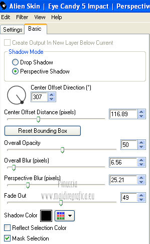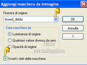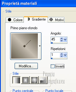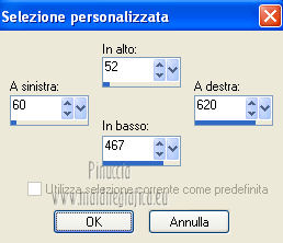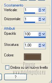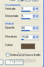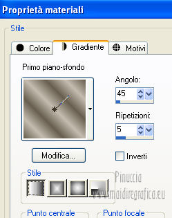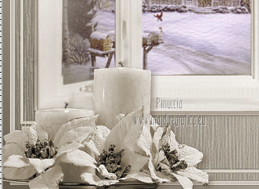qui puoi trovare qualche risposta ai tuoi dubbi. Se l'argomento che ti interessa non è presente, ti prego di segnalarmelo. Questo tutorial è una creazione ©Meetjesplekje e non può essere copiato su altri siti nè essere offerto per il download. Lo stesso vale per la mia traduzione. Il materiale viene da vari gruppi di condivisione. Il copyright appartiene ai rispettivi autori. Grazie ai creatori dei tubes che mettono a disposizione il loro lavoro in vari gruppi di condivisione. Per tradurre questo tutorial ho usato PSP X. Occorrente: Materiale qui Per il tube della donna grazie Grace Per il tube delle candele grazie Suzi Sgai. Filtri: consulta, se necessario, la mia sezione filtri qui Graphics Plus - Cross Shadow qui Alien Skin Eye Candy 5 Impact - Perspective Shadow qui Animation Shop qui ![]() Se stai usando altri colori puoi sperimentare le modalità di miscelatura e le opacità più adatte ai tuoi colori. Apri i font e minimizzali. Li troverai nella lista dei font disponibili, quando ti serviranno. Metti la selezione nella cartella Selezioni. Apri la maschera in PSP e minimizzala con il resto del materiale, tranne la gif "flame" che aprirai in Animation Shop. Imposta il colore di primo piano con #675e4f, e il colore di sfondo con #c4bcaf. Passa il colore di primo piano a Gradiente, stile Lineare, con i seguenti settaggi. ![]() 1. Apri una nuova immagine trasparente 800 x 600 pixels, e riempila con il gradiente.Livelli>Nuovo livello raster. Riempi con il colore di sfondo.2. Livelli>Nuovo livello maschera>Da immagine. Apri il menu sotto la finestra di origine e vedrai la lista dei files aperti. Seleziona la maschera boxed_didda, con i seguenti settaggi. ![]() Livelli>Unisci>Unisci gruppo. Effetti>Effetti di bordo>Aumenta. Attiva lo strumento Selezione ![]() clicca sull'icona Selezione personalizzata ![]() e imposta i seguenti settaggi. ![]() Premi sulla tastiera il tasto CANC. Mantieni selezionato. 3. Livelli>Nuovo livello raster. Apri il tube adb@bay-window e vai a Modifica>Copia. Torna al tuo lavoro e vai a Modifica>Incolla nella selezione. Mantieni ancora selezionato. Regola>Tonalità e saturazione>Viraggio. ![]() Effetti>Effetti 3D>Sfalsa ombra, con il colore #614d3b. ![]() Ripeti l'Effetto Sfalsa ombra, cambiando verticale e orizzontale con -5. 4. Livelli>Nuovo livello raster. Apri l'immagine xmasscan4_ice e vai a Modifica>Copia. Torna al tuo lavoro e vai a Modifica>Incolla nella selezione. Livelli>Disponi>Sposta giù. Selezione>Deseleziona. Sposta l'immagine un po' più a sinistra.Attiva il livello superiore. Livelli>Unisci>Unisci giù. 5. Apri il tube SS_Nathal_01 e vai a Modifica>Copia. Torna al tuo lavoro e vai a Modifica>Incolla come nuovo livello. Immagine>Ridimensiona, 3 volte all'80%, tutti i livelli non selezionato. Immagine>Rifletti. Regola>Tonalità e saturazione>Viraggio. ![]() Effetti>Effetti 3D>Sfalsa ombra, con il colore #614d3b. ![]() Regola>Messa a fuoco>Metti a fuoco. se decidi di realizzare l'animazione finale, un piccolo trucco per rendere l'animazione più "pulita". Attiva lo strumento Gomma ![]() e cancella le fiammelle. ![]() 6. Apri il tube Msb_Christmasbell1 e vai a Modifica>Copia. Torna al tuo lavoro e vai a Modifica>Incolla come nuovo livello. Spostalo sul bordo superiore.![]() Effetti>Effetti 3D>Sfalsa ombra, con i settaggi precedenti. 7. Apri il tube ccd-xmas-orn14 e vai a Modifica>Copia. Torna al tuo lavoro e vai a Modifica>Incolla come nuovo livello. Immagine>Ridimensiona, 2 volte all'80%, tutti i livelli non selezionato. Regola>Tonalità e saturazione>Viraggio, con i settaggi precedenti. Spostalo in alto a destra.Effetti>Effetti 3D>Sfalsa ombra, con i settaggi precedenti. 8. Apri il tube Holly 3 e vai a Modifica>Copia. Torna al tuo lavoro e vai a Modifica>Incolla come nuovo livello. Regola>Tonalità e saturazione>Viraggio, con i settaggi precedenti. Spostalo nell'angolo in alto a destra.Effetti>Effetti 3D>Sfalsa ombra, con i settaggi precedenti. Livelli>Unisci>Unisci giù. Regola>Messa a fuoco>Metti a fuoco. ![]() 9. Apri il tube WinterHeat- Grace’s TLC e vai a Modifica>Copia. Torna al tuo lavoro e vai a Modifica>Incolla come nuovo livello. Immagine>Rifletti. Immagine>Ridimensiona, all'80%, tutti i livelli non selezionato. Regola>Tonalità e saturazione>Viraggio, con i settaggi precedenti. Spostalo nell'angolo in basso a destra.Regola>Messa a fuoco>Metti a fuoco. Effetti>Plugins>Alien Skin Eye Candy 5 Impact - Perspective Shadow. Settings: Wide Perspective Shadow,in Back. Basic, con il colore #2b1d00. ![]() Effetti>Effetti 3D>Sfalsa ombra, con i settaggi precedenti. 10. Aggiungi il tuo nome e/o il tuo watermark su un nuovo livello. Livelli>Unisci>Unisci tutto. 11. Immagine>Aggiungi bordatura, 2 pixels, simmetriche, con il colore di primo piano. Immagine>Aggiungi bordatura, simmetriche non selezionato, con il colore chiaro di sfondo. ![]() Seleziona il bordo chiaro con la bacchetta magica ![]() Passa il colore di primo piano a Gradiente, stile Lineare, con i seguenti settaggi. ![]() Riempi la selezione con il gradiente.Regola>Sfocatura>Sfocatura gaussiana - raggio 25. ![]() Effetti>Plugins>Graphics Plus - Cross Shadow. ![]() Selezione>Deseleziona. 12. Attiva lo strumento Testo font Bickham Script.dovrai regolare la dimensione in base al testo e alla versione di PSP che stai usando ![]() Scrivi la lettera M maiuscola. Livelli>Converti in livello Raster. Scrivi la lettera C maiuscola. Livelli>Converti in livello raster. 13. Cambia il font e seleziona il font Beatrice, con gli stessi settaggi. Scrivi in minuscolo erry. Converti in livello raster. Scrivi in minuscolo hristmas. Livelli>Converti in livello raster. Posiziona correttamente i testi.14. Chiudi il livello inferiore. Livelli>Unisci>Unisci visibile. Riapri il livello inferiore, e rimani posizionato sul livello del testo. Effetti>Effetti 3D>Sfalsa ombra, con il colore già impostato. ![]() Immagine>Aggiungi bordatura, 2 pixels, simmetriche, con il colore di primo piano. 15. Immagine>Ridimens