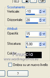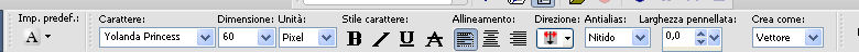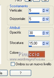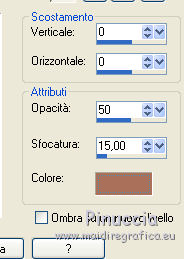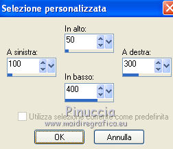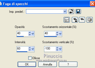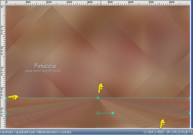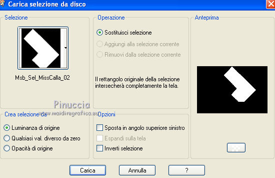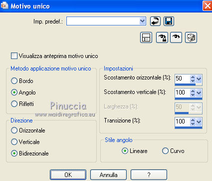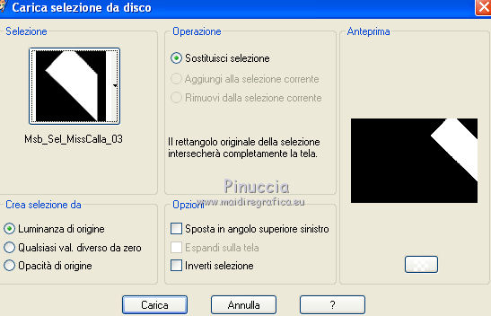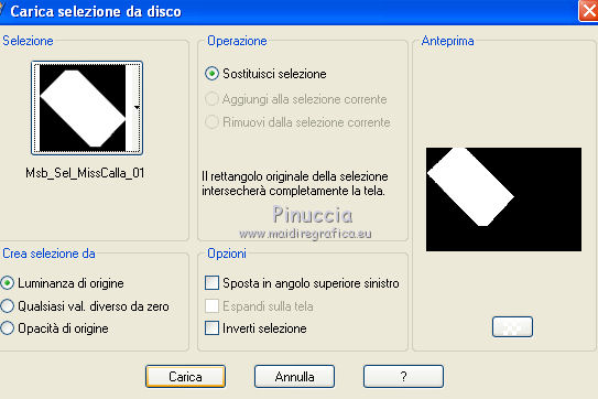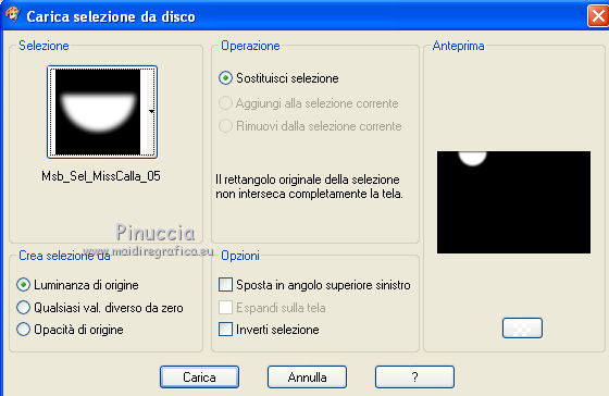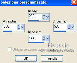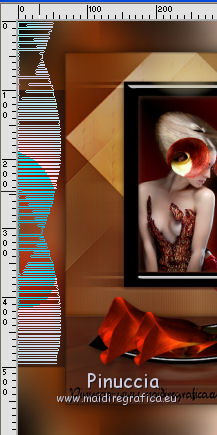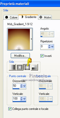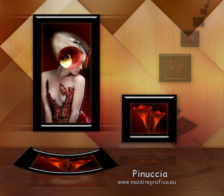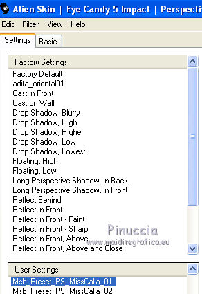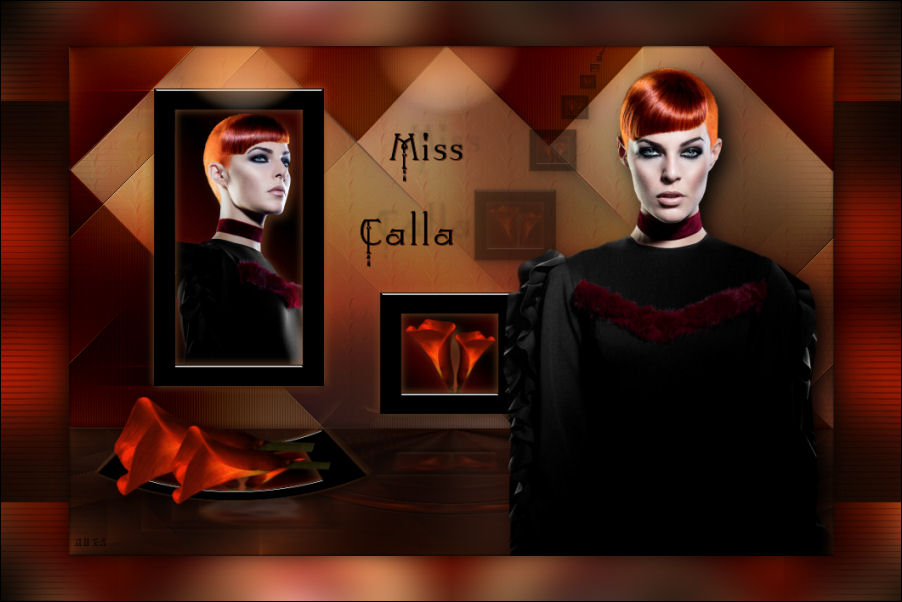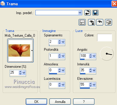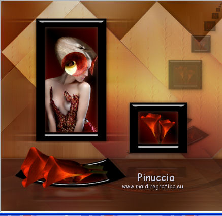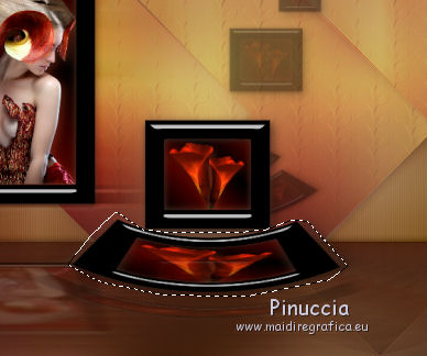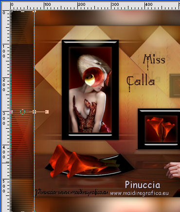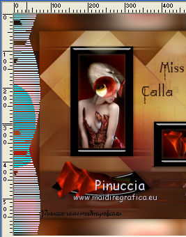 qui puoi trovare qualche risposta ai tuoi dubbi. Se l'argomento che ti interessa non è presente, ti prego di segnalarmelo. Questo tutorial è una creazione ©Meetjesplekje e non può essere copiato su altri siti nè essere offerto per il download. Lo stesso vale per la mia traduzione. Il materiale viene da vari gruppi di condivisione. Il copyright appartiene ai rispettivi autori. Grazie ai creatori dei tubes che mettono a disposizione il loro lavoro in vari gruppi di condivisione. Questo tutorial è stato creato con PSP X3. Per tradurlo usato PSP X. Occorrente: Materiale qui Per i bei tubes delle donne grazie Mary Per il tube della calla grazie Guismo . Il resto del materiale è di Meta. Filtri: consulta, se necessario, la mia sezione filtri qui Graphics Plus - Cross Shadow qui Simple - Blintz qui Alien Skin Eye Candy 5 Impact - Perspective Shadow, Glass qui ![]() Se stai usando altri colori puoi sperimentare le modalità di miscelatura e le opacità più adatte ai tuoi colori. Apri il font e minimizzalo. Lo troverai nella lista dei font disponibili, quando ti servirà. Metti il pennello nella cartella Pennelli. Attenzione, il pennello è composto da due files che non devono essere separati. Vedi gli appunti sui pennelli qui Metti il gradiente Msb Gradient 1-9-12 nella cartella Gradienti. Metti la trama Msb_Texture_Calla_01 nella cartella trame. Metti le selezioni nella cartella Selezioni. Imposta il colore di primo piano con #4f0400, e il colore di sfondo con #c8a954. Passa il colore di primo piano a Gradiente, e seleziona il gradiente Msb_Gradient_1-9-12, con i seguenti settaggi. ![]() 1. Apri una nuova immagine trasparente 900 x 600 pixels, e riempila con il gradiente.Selezione>Seleziona tutto. Apri il tube Mary 0812-37 e vai a Modifica>Copia. minimizza il tube perchè ti servirà ancora Torna al tuo lavoro e vai a Modifica>Incolla nella selezione. Selezione>Deseleziona. Effetti>Effetti di immagine>Motivo unico. ![]() Regola>Sfocatura>Sfocatura gaussiana - raggio 50. ![]() 2. Livelli>Duplica. Effetti>Plugins>Simple - Blintz. Effetti>Effetti di immagine>Motivo unico. ![]() Livelli>Duplica. Immagine>Rifletti. Immagine>Capovolgi. Abbassa l'opacità di questo livello al 50%. Livelli>Unisci>Unisci visibile. Effetti>Effetti di bordo>Aumenta. 3. Livelli>Duplica. Effetti>Effetti di riflesso>Fuga di specchi. ![]() Se non visualizzi i righelli, vai a Visualizza>Righelli. Premi il tasto K per attivare lo strumento Puntatore ![]() se stai usando PSP 9 il tasto D (valido per tutte le versioni) per attivare lo strumento Deformazione ![]() In modalità Scala spingi il nodo centrale superiore verso il basso fino a 450 pixels, (puoi controllare la posizione nella barra inferiore). ![]() Cambia la modalità di miscelatura di questo livello in Moltiplica. Effetti>Effetti 3D>Sfalsa ombra, con il colore nero. ![]() 4. Livelli>Nuovo livello raster. Selezione>Carica/Salva selezione>Carica selezione da disco. Cerca e carica la selezione Msb_Sel_MissCalla_01. ![]() Cambia i settaggi del gradiente, togliendo la selezione a Inverti. ![]() Riempi la selezione con il gradiente.Effetti>Effetti di trama>Trama. Seleziona la trama Msb_Texture_Calla1 con i seguenti settaggi. ![]() Effetti>Plugins>Graphics Plus - Cross Shadow. ![]() Selezione>Deseleziona. Effetti>Effetti 3D>Sfalsa ombra, con il colore nero. ![]() 5. Livelli>Nuovo livello raster. Selezione>Carica/Salva selezione>Carica selezione da disco. Cerca e carica la selezione Msb_Sel_MissCalla_02. ![]() Riempi la selezione con il gradiente.Effetti>Effetti di trama>Trama, con i settaggi precedenti. Effetti>Plugins>Graphics Plus - Cross Shadow, con i settaggi precedenti. Selezione>Deseleziona. Effetti>Effetti 3D>Sfalsa ombra, con il colore nero. ![]() 6. Livelli>Nuovo livello raster. Selezione>Carica/Salva selezione>Carica selezione da disco. Cerca e carica la selezione Msb_Sel_MissCalla_03. ![]() Riempi la selezione con il gradiente.Effetti>Effetti di trama>Trama, con i settaggi precedenti. Effetti>Plugins>Graphics Plus - Cross Shadow, con i settaggi precedenti. Selezione>Deseleziona. Effetti>Effetti 3D>Sfalsa ombra, con il colore nero. ![]() Attiva il livello superiore. Livelli>Unisci>Unisci giù - 2 volte. Cambia la modalità di miscelatura di questo livello in Sovrapponi, e abbassa l'opacità al 40%. Livelli>Duplica. Cambia la modalità di miscelatura di questo livello in Sovrapponi, e abbassa l'opacità al 10%. 7. Livelli>Nuovo livello raster. Selezione>Carica/Salva selezione>Carica selezione da disco. Cerca e carica la selezione Msb_Sel_MissCalla_04. ![]() Cambia nuovamente i settaggi del gradiente selezionand Inverti. ![]() Riempi la selezione con il gradiente.Effetti>Effetti di trama>Veneziana, con il colore #572711. ![]() Effetti>Plugins>Graphics Plus - Cross Shadow, con i settaggi precedenti. Selezione>Deseleziona. Effetti>Effetti 3D>Sfalsa ombra, con il colore nero. ![]() Livelli>Disponi>Sposta giù - 2 volte. Cambia la modalità di miscelatura di questo livello in Rafforza, e abbassa l'opacità al 28%. Attiva nuovamente il livello superiore. Effetti>Effetti 3D>Sfalsa ombra, con il colore nero. ![]() Livelli>Duplica. Effetti>Effetti di bordo>Aumenta. 8. Imposta il colore di primo piano con il colore nero #000000, e il colore di sfondo con #4f0400. Livelli>Nuovo livello raster. Attiva lo strumento Selezione ,clicca sull'icona Selezione personalizzata ![]() e imposta i seguenti settaggi: ![]() Riempi la selezione con il colore nero di primo piano.Selezione>Modifica>Contrai - 25 pixels. Premi sulla tastiera il tasto CANC. Livelli>Nuovo livello raster. Passa il colore di primo piano a Gradiente di primo piano/sfondo, stile Lineare. ![]() Riempi la selezione con il gradiente.Livelli>Disponi>Sposta giù. Attiva nuovamente il tube Mary 0812-37 e vai a Modifica>Copia. Torna al tuo lavoro e vai a Modifica>Incolla come nuovo livello. Immagine>Ridimensiona,al 35%, tutti i livelli non selezionato, Posiziona correttamente il tube nella selezione.Selezione>Inverti. P