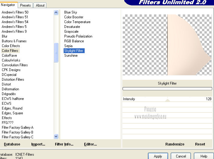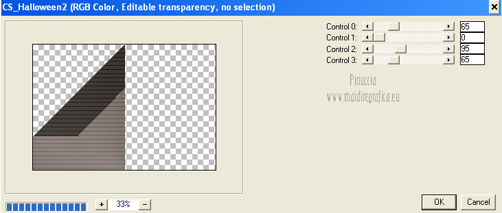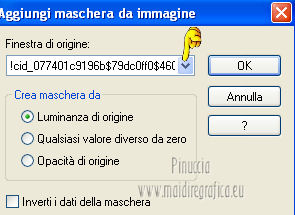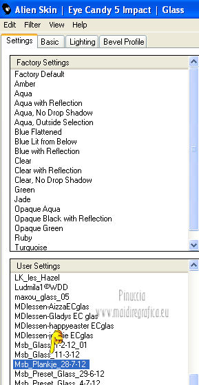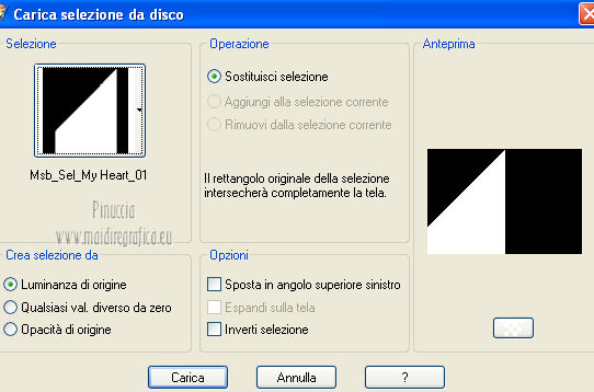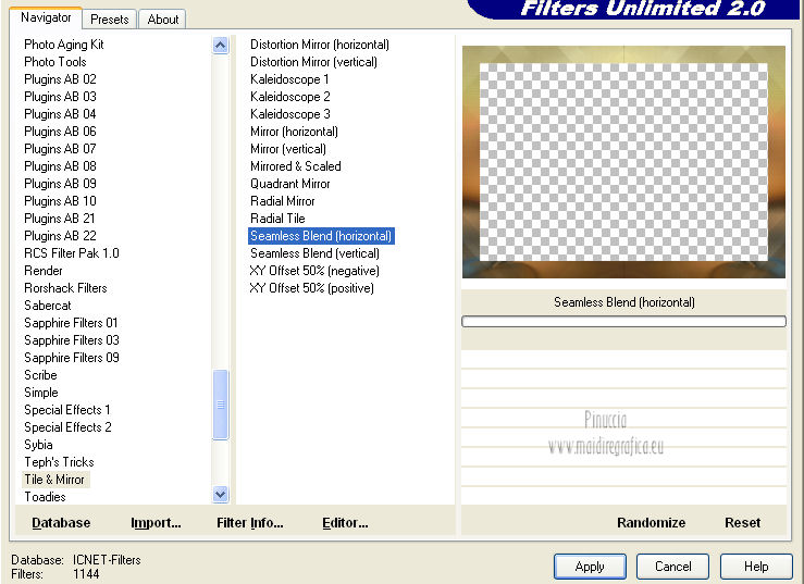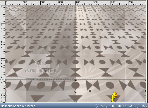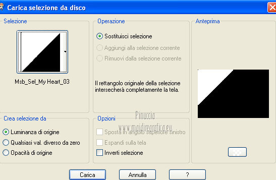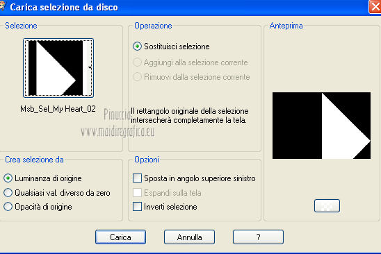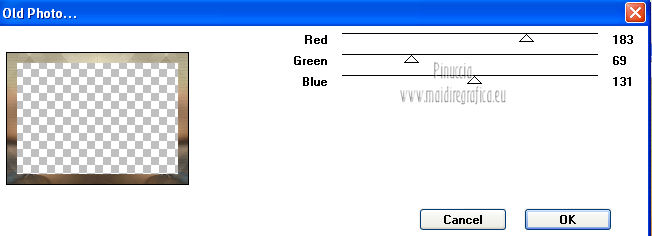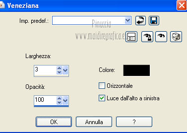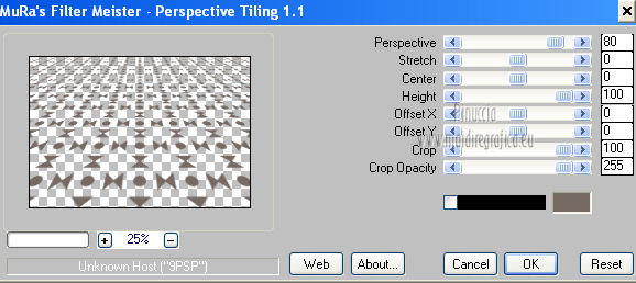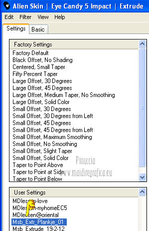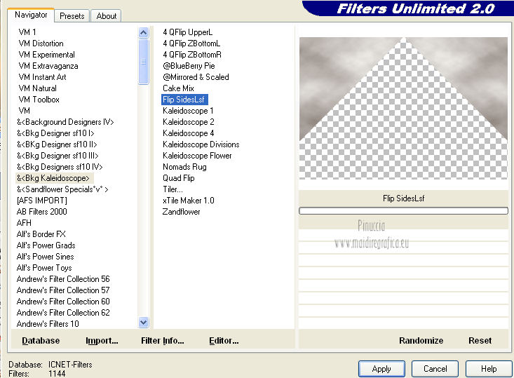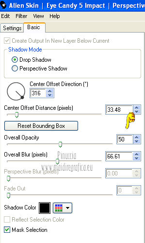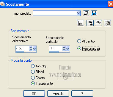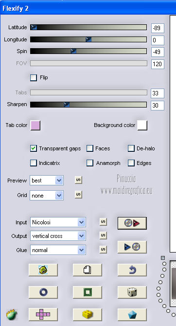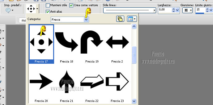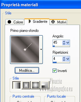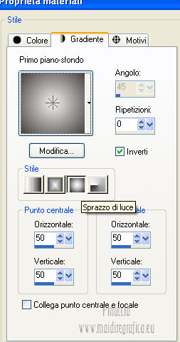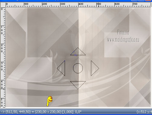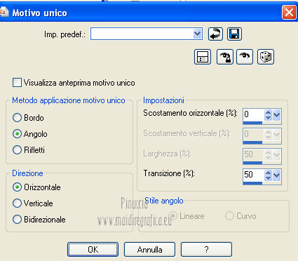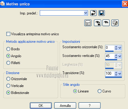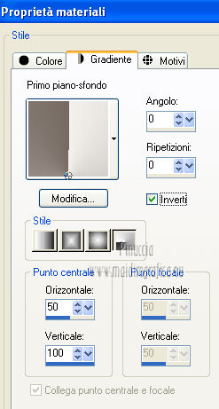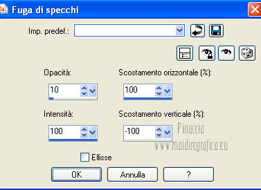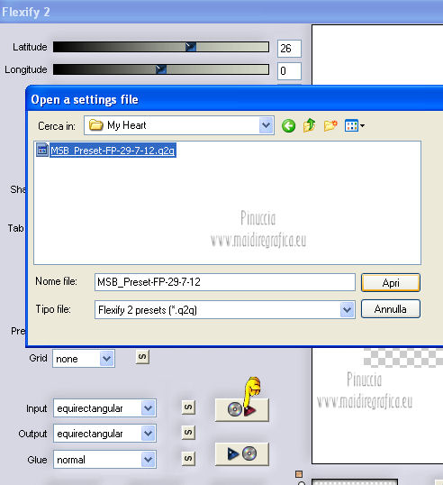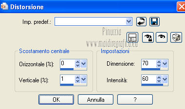 qui puoi trovare qualche risposta ai tuoi dubbi. Se l'argomento che ti interessa non è presente, ti prego di segnalarmelo. Questo tutorial è una creazione ©Meetjesplekje e non può essere copiato su altri siti nè essere offerto per il download. Lo stesso vale per la mia traduzione. Il materiale viene da vari gruppi di condivisione. Il copyright appartiene ai rispettivi autori. Grazie ai creatori dei tubes che mettono a disposizione il loro lavoro in vari gruppi di condivisione. Per tradurre questo tutorial ho usato PSP X. Occorrente: Materiale qui Il tube della donna è di Annelies I deco tubes sono di Mary, Crealine e LaManouche. Grazie Annalies, Mary, LaManouche e Crealine per i vostri bellissimi tubes. Filtri: consulta, se necessario, la mia sezione filtri qui Filters Unlimited 2.0 qui &<Bgk Kaleidoscope> - Flip Side Lsf (da importare in Unlimited) qui Flaming Pear - Flexify 2 qui Simple - Blintz qui Graphics Plus - Cross Shadow qui Alien Skin Eye Candy 5 Impact qui Mura's Meister - Perspective Tiling qui Carolaine and Sensibility - CS_Halloween 2 qui Toadies - Old Photo qui ![]() Se stai usando altri colori puoi sperimentare le modalità di miscelatura e le opacità più adatte ai tuoi colori. Metti il preset per Flaming in una cartella a tua scelta. Lo importerai da questa cartella quando ti servirà. Metti i preset "Msb Extr Plankje 01" e "Msb Plankje 28-7-12" nelle rispettive cartelle del filtro Alien Skin Eye Candy 5 Impact. Con un doppio clic sul file, il preset sarà automaticamente installato nella cartella corretta. La "Freccia 17" (Arrow 17) è standard in PSP. Se non la trovi nel tuo PSP, metti "Arrows.jsl" nella cartella Forme predefinite. Metti le selezioni nella cartella Selezioni. Apri la maschera !cid_077401c9196bS79dc0ff0S4601a8c0@nuriabf7499d95 in PSP e minimizzala con il resto del materiale. Imposta il colore di primo piano con #766a62, e il colore di sfondo con #f3f1ee. Passa il colore di primo piano a Gradiente, stile Radiale, con i seguenti settaggi. ![]() 1. Apri una nuova immagine trasparente 800 x 550 pixels, e riempila con il gradiente.Effetti>Plugins>Simple - Blintz. Regola>Messa a fuoco>Metti a fuoco. Selezione>Carica/Salva selezione>Carica selezione da disco. Cerca e carica la selezione Msb_ Sel_My Heart_01. ![]() Selezione>Innalza selezione a livello. Selezione>Deseleziona. Effetti>Plugins>Carolaine and Sensibility - CS_Halloween2, con i settaggi standard. ![]() Effetti>Effetti di immagine>Motivo unico. ![]() 2. Attiva il livello inferiore. Selezione>Carica/Salva selezione>Carica selezione da disco. Cerca e carica la selezione Msb_ Sel_My Heart_02. ![]() Selezione>Innalza selezione a livello. Selezione>Deseleziona. Effetti>Effetti di distorsione>Distorsione. ![]() Livelli>Duplica. Effetti>Effetti di distorsione>Vento - da sinistra, intensità 100. ![]() Livelli>Disponi>Sposta giù. Attiva il livello superiore. Effetti>Plugins>Filters Unlimited 2.0 - Color Filters - Skylight Filter, con i settaggi standard. ![]() Effetti>Effetti di riflesso>Fuga di specchi. ![]() Regola>Messa a fuoco>Metti a fuoco. 3. Attiva il livello inferiore. Selezione>Carica/Salva selezione>Carica selezione da disco. Cerca e carica la selezione Msb_ Sel_My Heart_03. ![]() Selezione>Innalza selezione a livello. Selezione>Deseleziona. Livelli>Disponi>Porta in alto. Effetti>Plugins>Filters Unlimited 2.0 Render – Clouds – Clouds (fore-/background color), con i settaggi standard. ![]() Effetti>Plugins>Filters Unlimited 2.0 - &<Bkg Kaleidoscope> - Flip SidesLsf. ![]() Cambia la modalità di miscelatura di questo livello in Luce diffusa. Livelli>Unisci>Unisci visibile. Livelli>Duplica. Effetti>Effetti di riflesso>Caleidoscopio. ![]() Abbassa l'opacità di questo livello al 40%. Livelli>Unisci>Unisci visibile. Duplica l'immagine usando la combinazione di tasti maiuscola+D e minimizza la copia, che ti servirà più tardi. 4. Continua sull'originale. Colore di primo piano #45403d, colore di sfondo #928a8a. Passa il colore di primo piano a Gradiente, stile Lineare. ![]() Livelli>Nuovo livello raster. Riempi con il gradiente.Effetti>Plugins>Flaming Pear - Flexify 2. Clicca sulla freccia rossa e cerca, nella cartella in cui lo hai copiato, il preset Msb_Preset_FP-29-7-12; clicca su Apri ![]() e avrai questo. se hai problemi con il preset, puoi copiare manualmente i settaggi che vedi nella schermata ![]() Effetti>Effetti di immagine>Scostamento. ![]() Livelli>Duplica. Immagine>Rifletti. Immagine>Capovolgi. Livelli>Unisci>Unisci giù. Cambia la modalità di miscelatura di questo livello in Filtra. Livelli>Unisci>Unisci visibile. 5. Livelli>Nuovo livello raster. Imposta il colore di primo piano con #f3f1ee. Riempi il livello con il colore di primo piano.Livelli>Nuovo livello maschera>Da immagine. Apri il menu sotto la finestra di origine e vedrai la lista dei files aperti. Seleziona la maschera !cid_077401c9196bS79dc0ff0S4601a8c0@nuriabf7499d95. ![]() Livelli>Unisci>Unisci gruppo. Effetti>Plugins>Alien Skin Eye Candy 5 Impact - Perspective Shadow. Seleziona il preset Drop Shadow,Blurry sotto Basic cambia Opacity con 50 e ok. ![]() ![]() Regola>Messa a fuoco>Metti a fuoco. Abbassa l'opacità di questo livello al 60%. 6. Imposta il colore di sfondo con #766a62, e chiudi il colore di primo piano. Attiva lo strumento Forme predefinite ![]() Seleziona la forma "Freccia 17" con i seguenti settaggi: ![]() Traccia una forma al centro dell'immagine di circa 230x230 mentre tracci la forma puoi controllare la dimensione nella barra inferiore degli strumenti ![]() Oggetti>Allinea>Centra nella tela. Livelli>Converti in livello raster. Effetti>Plugins>Mura's Meister - Perspective Tiling, con i settaggi standard. ![]() Se non visualizzi i righelli vai a Visualizza>Righelli. Premi il tasto K per attivare lo strumento Puntatore ![]() se stai usando PSP 9, il tasto D (valido per tutte le versioni) per attivare lo strumento Deformazione ![]() e - in modalità Scala - spingi il nodo centrale in alto, fino a 420 