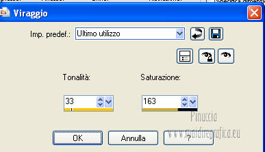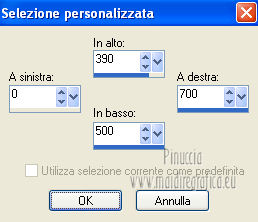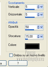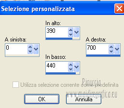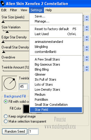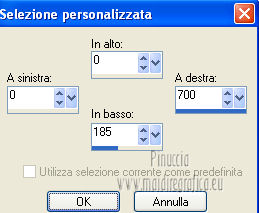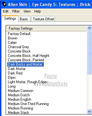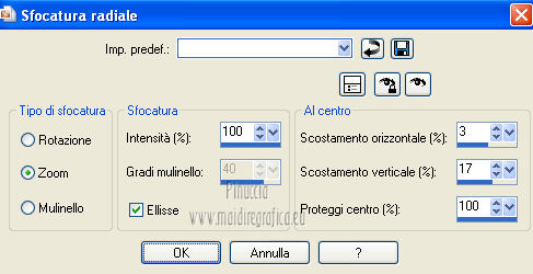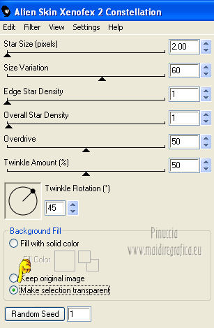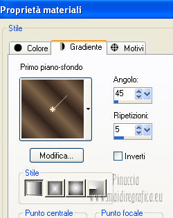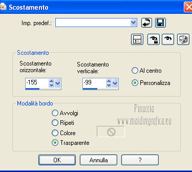 qui puoi trovare qualche risposta ai tuoi dubbi. Se l'argomento che ti interessa non è presente, ti prego di segnalarmelo. Questo tutorial è una creazione ©Meetjesplekje e non può essere copiato su altri siti nè essere offerto per il download. Lo stesso vale per la mia traduzione. Il materiale viene da vari gruppi di condivisione. Il copyright appartiene ai rispettivi autori. Grazie ai creatori dei tubes che mettono a disposizione il loro lavoro in vari gruppi di condivisione. Questo tutorial è stato creato con PSP X3. Per tradurlo ho usato PSP X. Occorrente: Materiale qui Per i tubes grazie Kitty, Jet, MTM Brigitte e Guismo. Filtri: consulta, se necessario, la mia sezione filtri qui Graphics Plus - Cross Shadow qui Alien Skin Eye Candy 5 Impact - Extrude qui Alien Skin Eye Candy 5 Textures - Brick Wall qui Mura's Meister - Perspective Tiling qui Alien Skin Xenofex 2.0 - Constellation qui Animation Shop qui ![]() Imposta il colore di primo piano con #33241d0, e il colore di sfondo con #7d634a. Passa il colore di primo piano a Gradiente, stile Sprazzo di luce, con i seguenti settaggi. ![]() 1. Apri una nuova immagine trasparente 700 x 500 pixels, e riempila con il gradiente.Livelli>Nuovo livello raster. Selezione>Seleziona tutto. Apri il tube kittys-model Ferdi e vai a Modifica>Copia. non chiudere il tube perchè ti servirà ancora Torna al tuo lavoro e vai a Modifica>Incolla nella selezione. Selezione>Deseleziona. Effetti>Effetti di immagine>Motivo unico, con i settaggi standard. ![]() Livelli>Unisci>Unisci visibile. Regola>Sfocatura>Sfocatura radiale. ![]() Livelli>Duplica. 2. Attiva lo strumento Selezione ,clicca sull'icona Selezione personalizzata ![]() e imposta i seguenti settaggi: ![]() Selezione>Innalza selezione a livello. Effetti>Plugins>Alien Skin Xenofex 2.0 - Constellation. Settings: Star Field, con i seguenti settaggi. ![]() Selezione>Deseleziona. Cambia la modalità di miscelatura di questo livello in Indebolisci. 3. Attiva il livello inferiore. Selezione personalizzata ![]() ![]() Selezione>Innalza selezione a livello. Effetti>Plugins>Mura's Meister - Perspective Tiling. ![]() Selezione>Deseleziona. 4. Apri il tube calguismistxmas10129 e vai a Modifica>Copia. Torna al tuo lavoro e vai a Modifica>Incolla come nuovo livello. Immagine>Ridimensiona, al 60%, tutti i livelli non selezionato. Attiva lo strumento Puntatore ![]() se stai usando PSP 9 lo strumento Deformazione ![]() in modalità Scala tira il nodo centrale a destra fino al bordo. ![]() Effetti>Effetti di immagine>Scostamento. ![]() Regola>Messa a fuoco>Metti a fuoco. Livelli>Disponi>Porta in alto. Attiva il livello sottostante. Attiva lo strumento Gomma ![]() e cancella le stelline visibili sul tube. Attiva nuovamente il livello superiore. 5. Apri il tube calguismistfontaine1249 e vai a Modifica>Copia. Torna al tuo lavoro e vai a Modifica>Incolla come nuovo livello. Immagine>Ridimensiona, al 50%, tutti i livelli non selezionato. Effetti>Effetti di immagine>Scostamento. ![]() 6. Selezione personalizzata ![]() ![]() Selezione>Innalza selezione a livello. Effetti>Plugins>Alien Skin Eye Candy 5 Texture - Brick Wall. Seleziona il preset Dark Bricks and Mortar e ok. ![]() Selezione>Deseleziona. Effetti>Effetti geometrici>Sfera. ![]() Sposta l'immagine un po' più in alto contro l'acqua.Attiva lo strumento Puntatore ![]() se stai usando PSP 9 lo strumento Deformazione ![]() in modalità Scala tira il nodo centrale a destra e a sinistra, un po' fuori dai bordi. ![]() Effetti>Plugins>Alien Skin Eye Candy 5 Impact - Extrude. Settings: Small Offset,No Smoothing. Basic: ![]() Regola>Tonalità e saturazione>Viraggio. ![]() Livelli>Duplica. Cambia la modalità di miscelatura di questo livello in Moltiplica. Livelli>Unisci>Unisci giù. Abbassa l'opacità di questo livello al 75%. Effetti>Effetti 3D>Sfalsa ombra, con il colore nero. ![]() 7. Apri il tube Misted_Christmas Tree illuminated_@el e vai a Modifica>Copia. Torna al tuo lavoro e vai a Modifica>Incolla come nuovo livello. Immagine>Ridimensiona, 2 volte all'80%, tutti i livelli non selezionato. Spostalo a sinistra, vicino al bordo.Livelli>Duplica. Immagine>Rifletti. Livelli>Unisci>Unisci giù. 8. Attiva nuovamente il tube kittys-model Ferdi e vai a Modifica>Copia. Torna al tuo lavoro e vai a Modifica>Incolla come nuovo livello. Immagine>Ridimensiona, 2 volte al 70%, tutti i livelli non selezionato. Effetti>Effetti di immagine>Scostamento. ![]() Effetti>Effetti 3D>Sfalsa ombra, con il colore nero. ![]() Regola>Messa a fuoco>Metti a fuoco. 9. Apri il tube Mtm-Mannen185-Ed Westwick-27sept 2008 e vai a Modifica>Copia. Torna al tuo lavoro e vai a Modifica>Incolla come nuovo livello. Immagine>Ridimensiona, 2 volte al 70%, tutti i livelli non selezionato. Effetti>Effetti di immagine>Scostamento. ![]() Effetti>Effetti 3D>Sfalsa ombra, con il colore nero. ![]() Regola>Messa a fuoco>Metti a fuoco. 10. Apri il tube am_glasses. Attiva lo strumento Selezione , rettangolo,e seleziona uno dei due bicchieri. Modifica>Copia, e chiudi il tube senza salvare le modifiche. Torna al tuo lavoro e vai a Modifica>Incolla come nuovo livello. Immagine>Ridimensiona, al 20%, tutti i livelli non selezionato. Regola>Messa a fuoco>Metti a fuoco. Effetti>Effetti di immagine>Scostamento. ![]() Effetti>Effetti 3D>Sfalsa ombra, con il colore nero. ![]() Livelli>Duplica. Effetti>Effetti di immagine>Scostamento. ![]() 11. Apri il tube am_bottle e vai a Modifica>Copia. Torna al tuo lavoro e vai a Modifica>Incolla come nuovo livello. Immagine>Ridimensiona, al 30%, tutti i livelli non selezionato. Regola>Messa a fuoco>Metti a fuoco. Livelli>Disponi>Sposta giù - 2 volte. Effetti>Effetti di immagine>Scostamento. ![]() Effetti>Effetti 3D>Sfalsa ombra, con il colore nero. ![]() 12. Aggiungi il tuo nome e/o il tuo watermark su un nuovo livello. Livelli>Unisci>Unisci tutto. 13. Colore di primo piano #33241d. Colore di sfondo #7d634a. Passa il colore di primo piano a Gradiente, stile Lineare. ![]() Immagine>Aggiungi