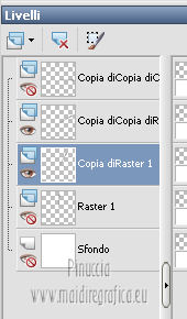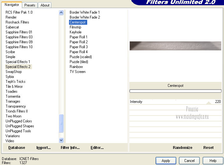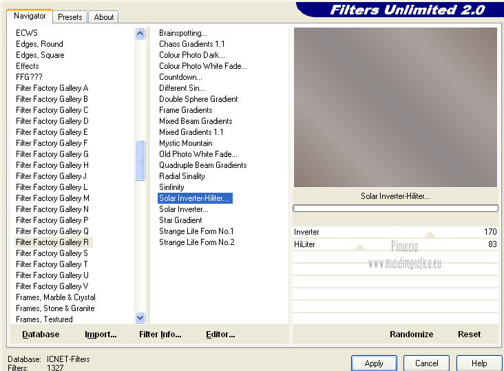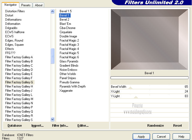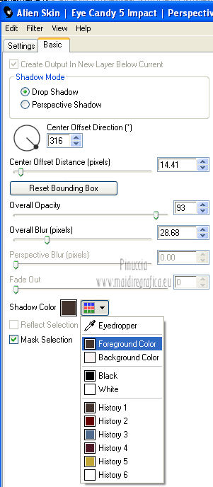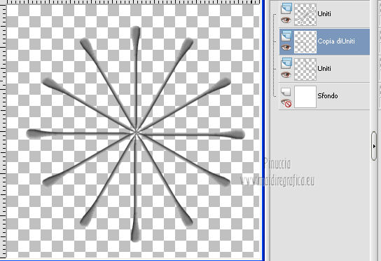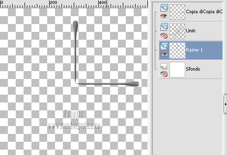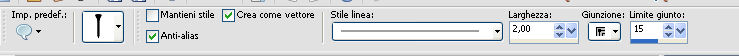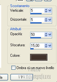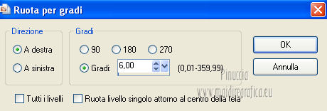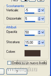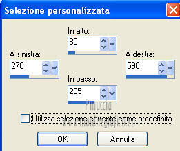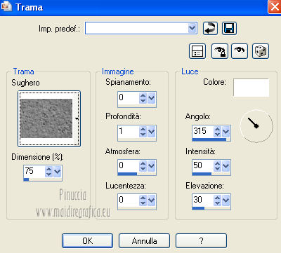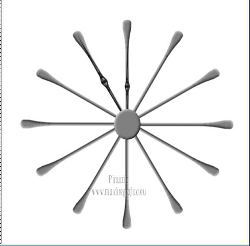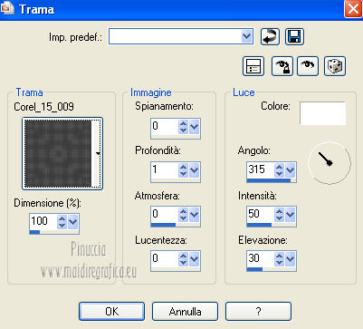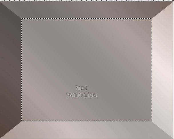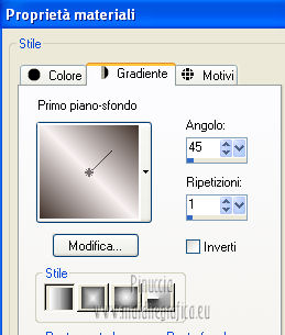 qui puoi trovare qualche risposta ai tuoi dubbi. Se l'argomento che ti interessa non è presente, ti prego di segnalarmelo. Questo tutorial è una creazione ©Meetjesplekje e non può essere copiato su altri siti nè essere offerto per il download. Lo stesso vale per la mia traduzione. Il materiale viene da vari gruppi di condivisione. Il copyright appartiene ai rispettivi autori. Grazie ai creatori dei tubes che mettono a disposizione il loro lavoro in vari gruppi di condivisione. Questo tutorial è stato creato con PSP X3. Per tradurlo ho usato PSP X. Occorrente: Materiale qui Per i tubes grazie Patries, Alejandra Rosales e Kts. Filtri: consulta, se necessario, la mia sezione filtri qui Filter Unlimited 2.0 qui Filter Factory Gallery G - Bevel 1.0 qui Filter Factory Gallery R - Solar Inverter-Hiliter qui Alien Skin Eye Candy 5 Impact - Perspective Shadow qui I filtri Factory Gallery si possono usare da soli o importati in Filters Unlimited Animation Shop qui ![]() Apri i font e minimizzali. Li troverai nella lista dei font disponibili quando ti servirà. Le trame fornite Beton, Corel_15_009 e Kurk sono standard in PSP, e corrispondono alle trame Calcestruzzo (Corel_15_036), Scozzese e Sughero (Corel_15_037). Se non le trovi nel tuo PSP, metti quelle fornite nella cartella Trame. Metti le forme basicvormen2 e objecten.jsl nella cartella Forme predefinite. Prima di iniziare, dobbiamo creare l'orologio. Chiudi il colore di primo piano. Imposta il colore di sfondo con #808080. 1. Apri una nuova immagine bianca 600 x 600 pixels. 2. Attiva lo strumento Forme predefinite ![]() seleziona la forma "Tee" con i seguenti settaggi. ![]() Partendo dall'alto al centro, traccia una piccola forma come nell'esempio. ![]() Livelli>Converti in livello raster. Effetti>Effetti 3D>Smusso a incasso. ![]() Livelli>Duplica. Immagine>Ruota per gradi - 30 gradi a destra. ![]() Di nuovo: Livelli>Duplica. Immagine>Ruota per gradi - 30 gradi a destra. Ancora Livelli>Duplica. Immagine>Ruota per gradi - 30 gradi a destra. Posiziona correttamente le lancette,con la punta al centro. ![]() Chiudi il livello superiore e i due livelli inferiori. ![]() Livelli>Unisci>Unisci visibile. Livelli>Duplica. Immagine>Rifletti. Livelli>Duplica. Immagine>Capovolgi. Livelli>Duplica. Immagine>Rifletti. Posiziona correttamente le lancette.Il livello superiore e i due livelli inferiori sono sempre chiusi. ![]() Livelli>Unisci>Unisci visibile. Chiudi questo livello Uniti. Riapri il livello superiore e il secondo livello dal basso. E' sempre chiuso il livello bianco di sfondo. Attiva uno dei livelli visibili. ![]() Livelli>Unisci>Unisci visibile. Livelli>Duplica. Immagine>Rifletti. Immagine>Capovolgi. Apri il livello Uniti (il livello inferiore è sempre chiuso). Assicurati che le lancette siano correttamente posizionate. ![]() Livelli>Unisci>Unisci visibile. Riapri il livello inferiore. 3. Attiva lo strumento Forme predefinite ![]() seleziona la forma Ellisse, con i settaggi precedenti. Traccia un cerchio al centro delle lancette, pressappoco come nel mio esempio. Livelli>Converti in livello raster. Effetti>Effetti 3D>Smusso a incasso, con i settaggi precedenti. Imposta il colore di sfondo con #202020. Il colore di primo piano è sempre chiuso. Attiva lo strumento Forme predefinite ![]() seleziona la forma all12, con i settaggi precedenti. ![]() Traccia una selezione da sinistra al centro, pressappoco all'altezza della lancetta ore 9. ![]() Livelli>Converti in livello raster. Regola>Messa a fuoco>Metti a fuoco. Effetti>Effetti 3D>Smusso a incasso, con i settaggi precedenti. Immagine>Ruota per gradi - 90 gradi a destra. ![]() Livelli>Duplica. Attiva il livello sottostante. Immagine>Ridimensiona, all'80%, tutti i livelli non selezionato. Attiva il livello soprastante della copia. Immagine>Ruota per gradi - 30 gradi a sinistra. ![]() Posiziona correttamente le lancette.Attiva il livello dell'ellisse. Livelli>Disponi>Porta in alto. ![]() Apri il tube a-dozi’s-metal-round-015 e vai a Modifica>Copia. Torna al tuo lavoro e vai a Modifica>Incolla come nuovo livello. Immagine>Ridimensiona, 2 volte al 50%, tutti i livelli non selezionato. Regola>Messa a fuoco>Metti a fuoco. Posiziona il tube al centro dell'ovale.![]() Attiva lo strumento Testo ,font Grixel Acme 5 Wide, dimensione da regolare a seconda del testo, e della versione di PSP che stai usando. ![]() Colore di primo piano chiuso, colore di sfondo #404040. Scrivi il numero 3. Livelli>Converti in livello raster. Ripeti con i numeri 6, 9 e 12, e posiziona i numeri a fianco delle rispettive lancette.Attiva il livello superiore dei 4 numeri. Livelli>Unisci>Unisci giù e ripeti due volte. Salva l'immagine in formato PSP e minimizzala. Iniziamo ora il tutorial. 1. Apri una nuova immagine trasparente 700 x 550 pixels. Imposta il colore di primo piano con #42332c, e il colore di sfondo con #f8f2f2. Passa il colore di primo piano a Gradiente, stile Lineare. ![]() Riempi l'immagine trasparente con il gradiente.Regola>Sfocatura>Sfocatura gaussiana - raggio 25. ![]() Effetti>Plugins>Filters Unlimited 2.0 - Filter Factory Gallery R - Solar Inverter-Hiliter. ![]() Effetti>Plugins>Filters Unlimited 2.0 - Filter Factory Gallery G - Bevel 1.0. ![]() Attiva lo strumento Selezione , rettangolo,e traccia una selezione come nell'esempio. ![]() Effetti>Effetti di trama>Trama - seleziona la trama Scozzese (nelle versioni più recenti di PSP corrisponde alla trama Corel_15_009) ![]() Effetti>Effetti di bordo>Aumenta. 2. Livelli>Nuovo livello raster. Attiva lo strumento Selezione ,clicca sull'icona Selezione personalizzata ![]() e imposta i seguenti settaggi: ![]() Apri il tube Window Double-LJ e vai a Modifica>Copia. Torna al tuo lavoro e vai a Modifica>Incolla nella selezione. Regola>Tonalità e saturazione>Viraggio. ![]() Mantieni selezionato. 3. Livelli>Nuovo livello raster. Apri il tube landschap1646 winterscenery 30 AR 395 e vai a Modifica>Copia. Torna al tuo lavoro e vai a Modifica>Incolla nella selezione. 