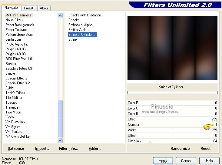 2. Effetti>Plugins>Filters Unlimited 2.0 - MuRa’s Seamless – Stripe of Cilinder.