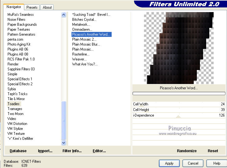 Effetti>Plugins>Filters Unlimited 2.0 - Toadies – Picasso’s Another World, con i settaggi standard.