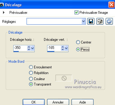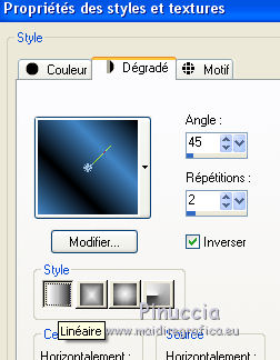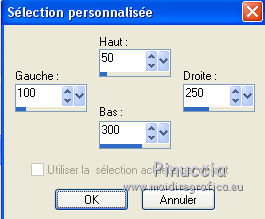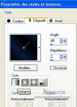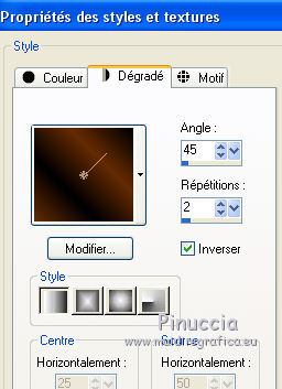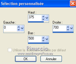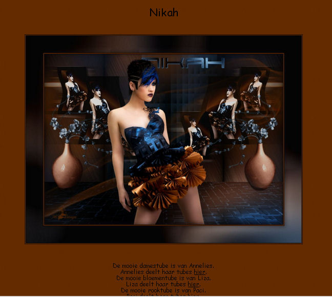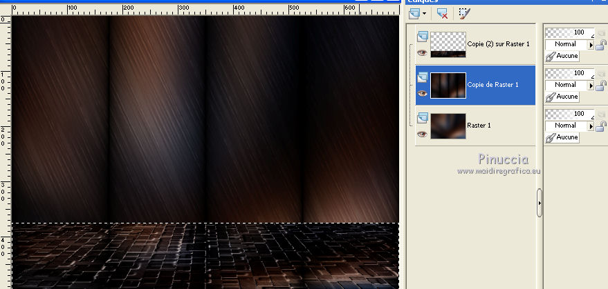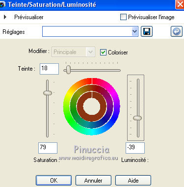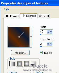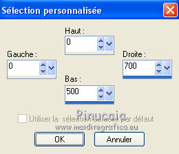 qui puoi trovare qualche risposta ai tuoi dubbi. Se l'argomento che ti interessa non è presente, ti prego di segnalarmelo. Pour traduire ce tutoriel j'ai utilisé Corel X2, mais il peut également être exécuté avec les autres versions. Suivant la version utilisée, vous pouvez obtenir des résultats différents. Depuis la version X4, la fonction Image>Miroir a été remplacée par Image>Renverser horizontalement, et Image>Renverser avec Image>Renverser verticalement. Dans les versions X5 et X6, les fonctions ont été améliorées par la mise à disposition du menu Objets. Avec la nouvelle version X7, nous avons à nouveau Miroir/Retourner, mais avec nouvelles différences. Consulter, si vouz voulez, mes notes ici Certaines dénominations ont changées entre les versions de PSP. Les plus frequentes dénominations utilisées: ![]() traduction italienne ici vos versions iciNécessaire pour réalise le tutoriel: Matériel ici Pour les tubes merci Alies, Liza et Paci. (les liens des sites des tubeuses ici) Modules Externes. consulter, si nécessaire, ma section de filtre ici Filters Unlimited 2.0 ici certains filtres donnent des résultats différents selon la version d'Unlimited utilisée. Version de Unlimited composée de files en 8bf: ici Mura's Seamless - Stripe of Cilinder ici Redfield - Plasteroid, Craquelure 3D ici Nik Software - Colore Efex Pro ici Filtres Mura's Seamless peuvent être utilisés seuls ou importés dans Filters Unlimited. voir comment le faire ici). Si un filtre est fourni avec cette icône, ![]() N'hésitez pas à changer le mode mélange des calques et leur opacité selon les couleurs que vous utiliserez Dans les plus récentes versions de PSP, vous ne trouvez pas le dégradé d'avant plan/arrière plan ou Corel_06_029. Vous pouvez utiliser le dégradé des versions antérieures. Ici le dossier Dégradés de CorelX. Ouvrez la police et la minimiser. Vous la trouverez dans la liste des polices disponibles lorsque vous en avez besoin. Avec les nouveaux s.o. ce n'est plus possible. Pour utiliser une police, vous devez la copier dans le dossier Fonts de Windows. Placer les sélections dans le dossier Sélections. Placer en avant plan la couleur #000000, et en arrière plan la couleur #0c1c35. ![]() Préparer en avant plan un dégradé de premier plan/arrière plan, style Linéaire. ![]() 1. Ouvrir une nouvelle image transparente 700 x 500 pixels. Remplir du dégradé.Sélections>Sélectionner tout. Ouvrir le tube Alies 519-vrouw-03062011 - Édition>Copier. ne pas fermer le tube; on va s'en servir plus tard Revenir sur votre travail et Édition>Coller dans la sélection. Sélections>Désélectionner tout. Effets>Effets d'image>Mosaïque sans jointures, par défaut. ![]() Réglage>Flou>Flou radial: ![]() Réglage>Flou>Flou gaussien - rayon 35. ![]() 2. Calques>Dupliquer. Effets>Modules Externes>Filters Unlimited 2.0 - MuRa’s Seamless – Stripe of Cilinder. ![]() Calques>Dupliquer. Effets>Modules Externes>Redfield – Plasteroid. ![]() Image>Redimensionner, à 110%, redimensionner tous les calques décoché. Activer l'outil Sélection ![]() (peu importe le type de sélection, parce que avec la sélection personnalisée vous obtenez toujours un rectangle), cliquer sur Sélection personnalisée ![]() et setter ces paramètres. ![]() Sélections>Inverser. Presser CANC sur le clavier ![]() Sélections>Désélectionner tout. Effets>Effets de bords>Accentuer. Placer le calque en mode Lumière douce et réduire l'opacité à 28%. Calques>Fusionner>Fusionner le calque de dessous. 3. Calques>Dupliquer. Effets>Modules Externes>Redfield - Craquelure 3D, Sélectionner le preset Track, cliquer sur la main jaune et sélectionner le n.5. ![]() Touche K sur le clavier pour activer l'outil Sélecteur ![]() en mode Échelle ![]() pousser le noeud central supérieur vers le bas jusqu'à 375 pixels, (vous pouvez contrôler la position sur la barre inférieur) Si vous ne visualisez pas les règles: Affichage>Règles ![]() Sélection personnalisée ![]() ![]() Vous positionner sur le calque de dessous ![]() Presser CANC sur le clavier ![]() Sélections>Désélectionner tout. Vous positionner à nouveau sur le calque du haut de la pile. Réglage>Teinte et Saturation>Coloriser. ![]() Placer le calque en mode Lumière douce. 4. Vous positionner sur le deuxième calque du bas. Sélections>Charger/Enregistrer une sélection>Charger à partir du disque. Chercher et charger la sélection Msb_Nikah_01. ![]() Sélections>Transformer la sélection en calque. Effets>Modules Externes>Filters Unlimited 2.0 - Toadies – Picasso’s Another World, par défaut. ![]() Sélections>Modifier>Contracter - 1 pixel. Sélections>Inverser. Presser CANC sur le clavier .Sélections>Désélectionner tout. Réglage>Teinte et Saturation>Coloriser, comme précédemment. ![]() 5. Placer en avant plan la couleur #652b00. et en arrière plan garder la couleur #0c1c35. ![]() Préparer en avant plan un dégradé de premier plan/arrière plan, style Linéaire. ![]() Calques>Nouveau calque raster. Sélections>Charger/Enregistrer une sélection>Charger à partir du disque. Chercher et charger la sélection Msb_Nikah_02. ![]() Remplir la sélection du dégradé.Sélections>Désélectionner tout. Réglage>Flou>Flou gaussien - rayon 35. ![]() Réduire l'opacité de ce calque à 85%. Calques>Dupliquer. Image>Miroir. Calques>Fusionner>Fusionner le calque de dessous. Sélection personnalisée ![]() comme précédemment. ![]() Presser CANC sur le clavier .Sélections>Désélectionner tout. 6. Calques>Nouveau calque raster. Sélection personnalisée ![]() ![]() Placer en avant plan la couleur noire, et remplir la sélection avec la couleur noire.Sélections>Modifier>Contracter - 20 pixels. Presser CANC sur le clavier .Calques>Nouveau calque raster. Garder en avant plan la couleur noire. Placer en arrière plan la couleur #652b00. ![]() Préparer en avant plan un dégradé de premier plan/arrière plan, comme précédemment. ![]() Re