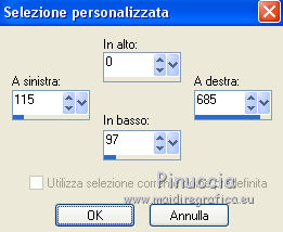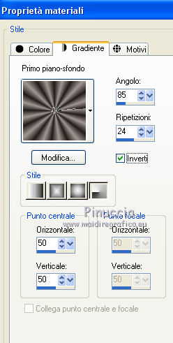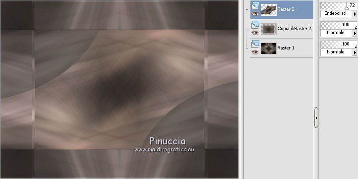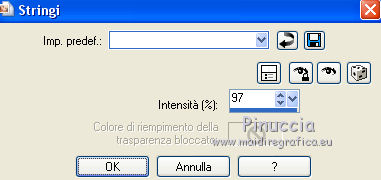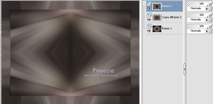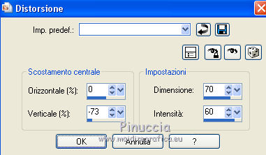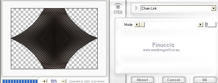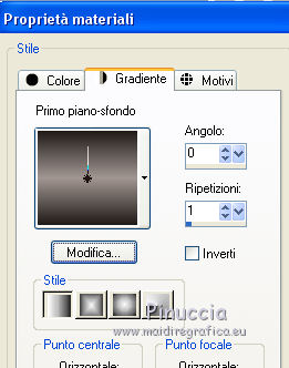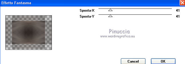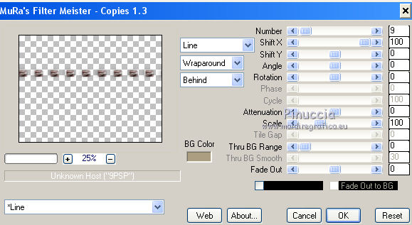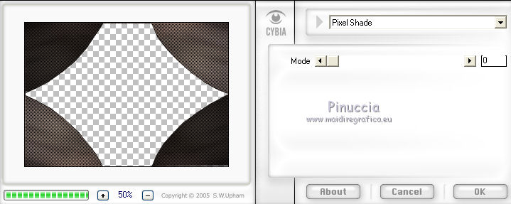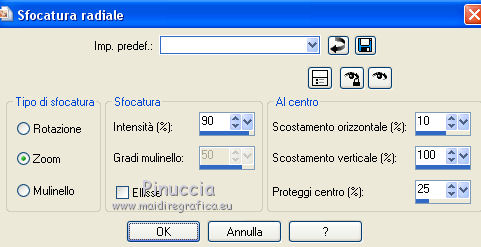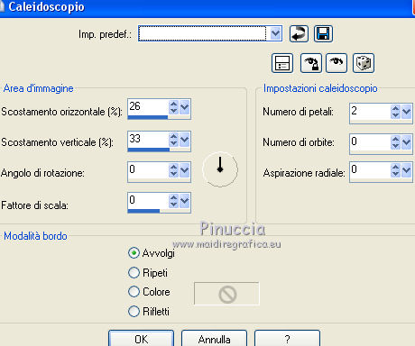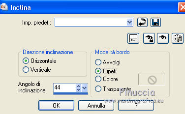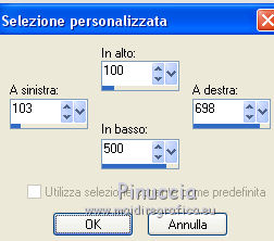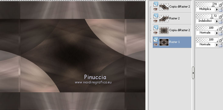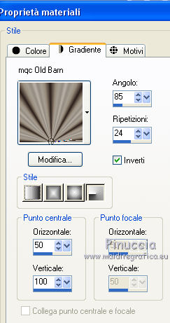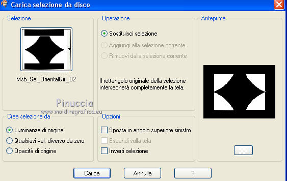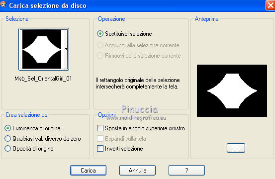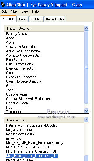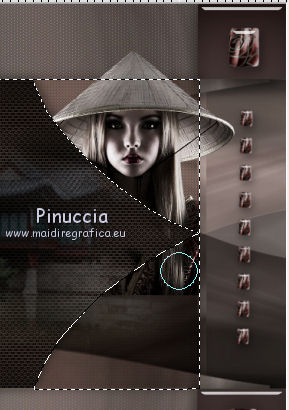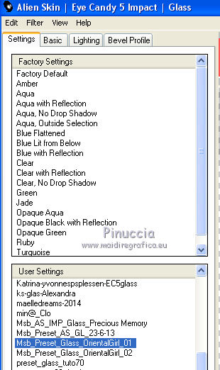qui puoi trovare qualche risposta ai tuoi dubbi. Se l'argomento che ti interessa non è presente, ti prego di segnalarmelo. Questo tutorial è una creazione ©Meetjesplekje e non può essere copiato su altri siti nè essere offerto per il download. Lo stesso vale per la mia traduzione. Il materiale viene da vari gruppi di condivisione. Il copyright appartiene ai rispettivi autori. Grazie ai creatori dei tubes che mettono a disposizione il loro lavoro in vari gruppi di condivisione. Per tradurre questo tutorial ho usato PSP X3 per l'immagine in alto e PSP X per l'immagine in fondo al tutorial. Occorrente: Materiale qui Per il tube della donna grazi e Athenais Per il misted grazie Dieter & Marion Filtri: consulta, se necessario, la mia sezione filtri qui Filters Unlimited 2.0 qui It@lian Editors Effect - Effetto Fantasma qui Cybia Screenworks qui Mura's Meister - Copies qui Alien Skin Eye Candy 5 Impact - Glass qui Graphics Plus - Cross Shadow qui I filtri Italian Editors e Graphics Plus si possono usare da soli o importati in Filters Unlimited (come fare vedi qui) Se un filtro fornito appare con questa icona ![]() Se stai usando altri colori puoi sperimentare le modalità di miscelatura e le opacità più adatte ai tuoi colori. Apri il font e minimizzalo. Lo troverai nella lista dei font disponibili quando ti servirà. Con i nuovi sistemi operativi questo non è più possibile. Per usare un font occorre copiarlo nella cartella Fonts di Windows. Metti i preset Cliccando sul file una o due volte (a seconda delle tue impostazioni), automaticamente il preset si installerà nella cartella corretta. perchè uno o due clic vedi qui Metti il gradiente nella cartella Gradienti. Metti le selezioni nella cartella Selezioni. Imposta il colore di primo piano con #211c18, Imposta il colore di sfondo con # a19692. ![]() Passa il colore di primo piano a Gradiente. e imposta il gradiente mqc Old Barn, stile Radiale. ![]() 1. Apri una nuova immagine trasparente 800 x 600 pixels, e riempila con il gradiente.Selezione>Seleziona tutto. Apri il tubeAthe-femme-19 e vai a Modifica>Copia. non chiuderlo perchè ti servirà ancora Torna al tuo lavoro e vai a Modifica>Incolla nella selezione. Selezione>Deseleziona. Effetti>Effetti di immagine>Motivo unico, con i settaggi standard. ![]() Regola>Sfocatura>Sfocatura radiale. ![]() Effetti>Effetti di riflesso>Caleidoscopio. ![]() 2. Attiva lo strumento Selezione ![]() clicca sull'icona Selezione personalizzata ![]() e imposta i seguenti settaggi. ![]() Modifica>Copia. Selezione personalizzata ![]() (la nuova selezione sostituirà la precedente). ![]() Livelli>Nuovo livello raster. Modifica>Incolla nella selezione. Selezione>Deseleziona. Livelli>Duplica. Effetti>Plugins>It@lian Editors Effect - Effetto Fantasma. ![]() Effetti>Effetti di bordo>Aumenta. Livelli>Disponi>Sposta giù. 3. Attiva il livello superiore. ![]() Effetti>Effetti geometrici>Inclina. ![]() 4. Effetti>Effetti di distorsione>Stringi (nelle versioni più recenti di PSP è diventato Compressione) ![]() Cambia la modalità di miscelatura di questo livello in Indebolisci, e abbassa l'opacità al 72%. ![]() Livelli>Duplica. Immagine>Rifletti. Cambia la modalità di miscelatura di questo livello in Moltiplica, e abbassa l'opacità al 78%. Attiva il livello inferiore. ![]() Livelli>Duplica. Chiudi il livello inferiore. Livelli>Unisci>Unisci visibile. Riapri il livello inferiore e rimani posizionato sul livello Uniti. Abbassa l'opacità di questo livello al 75%. 4. Selezione>Carica/Salva selezione>Carica selezione da disco. Cerca e carica la selezione Msb_OrientalGirl_01. ![]() Selezione>Innalza selezione a livello. Effetti>Plugins>Screenworks – Chain Link. ![]() Selezione>Deseleziona. Effetti>Effetti 3D>Sfalsa ombra, colore nero. ![]() Effetti>Effetti 3D>Sfalsa ombra, colore nero. ![]() 5. Attiva il livello centrale. Selezione>Carica/Salva selezione>Carica selezione da disco. Cerca e carica la selezione Msb_OrientalGirl_02. ![]() Selezione>Innalza selezione a livello. Effetti>Plugins>Screenworks – Pixel Shade. Selezione>Deseleziona. Effetti>Effetti 3D>Sfalsa ombra, colore nero. ![]() Effetti>Effetti 3D>Sfalsa ombra, colore nero. ![]() Cambia la modalità di miscelatura di questo livello in Luce diffusa. 6. Attiva il secondo livello dal basso. Selezione personalizzata ![]() ![]() Selezione>Innalza selezione a livello. Selezione>Deseleziona. Effetti>Effetti di distorsione>Distorsione. ![]() Livelli>Duplica. Immagine>Capovolgi. Livelli>Unisci>Unisci giù. Di nuovo Selezione personalizzata con i settaggi precedenti.![]() Selezione>Innalza selezione a livello. Effetti>Plugins>Screenworks – Pin Hole. ![]() Abbassa l'opacità di questo livello al 46%. Selezione>Deseleziona. Livelli>Duplica. Immagine>Capovolgi. Livelli>Unisci>Unisci giù. Di nuovo Livelli>Unisci>Unisci giù. Effetti>Effetti 3D>Sfalsa ombra, colore nero. ![]() Ripeti l'Effetto Sfalsa ombra, cambiando verticale e orizzontale con -5. Selezione>Carica/Salva selezione>Carica selezione da disco. Cerca e carica la selezione Msb_OrientalGirl_03. ![]() Premi sulla tastiera il tasto CANC ![]() Mantieni selezionato. 7. Con i colori iniziali: primo piano #211c18 e sfondo #a19692, passa il colore di primo piano a Gradiente di primo piano/sfondo, stile Lineare: ![]() Livelli>Nuovo livello raster. Riempi la selezione con il gradiente.Effetti>Effetti di trama>Veneziana, colore #710e29. ![]() Livelli>Nuovo livello raster. Effetti>Plugins>Alien Skin Eye Candy Impact - Glass. Seleziona il preset Msb_Preset_Glass_OrientalGirl_01 e ok. ![]() Questi i settaggi che, in caso di problemi con il preset, puoi impostare manualmente. ![]() Selezione>Deseleziona. Livelli>Unisci>Unisci giù. Effetti>Effetti 3D>Sfalsa ombra, colore nero. ![]() Ripeti l'Effetto Sfalsa ombra, cambiando verticale e orizzontale con -5. 8. Apri il tube Athe-femme-19 e rimani sul tube. Attiva lo strumento Selezione , rettangolo,e traccia un piccolo rettangolo su un punto chiaro del vestito della donn