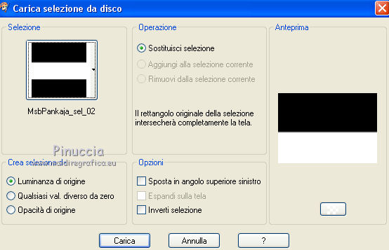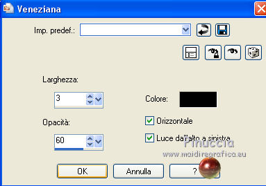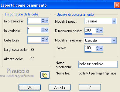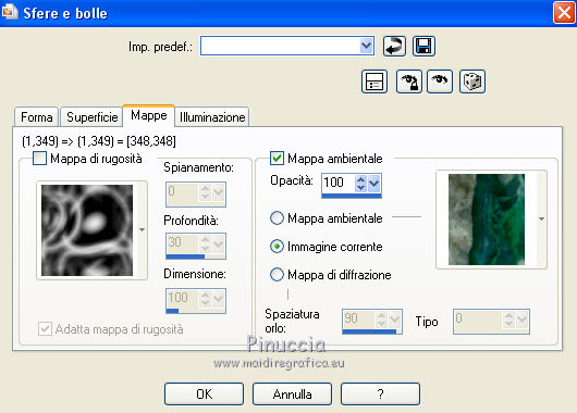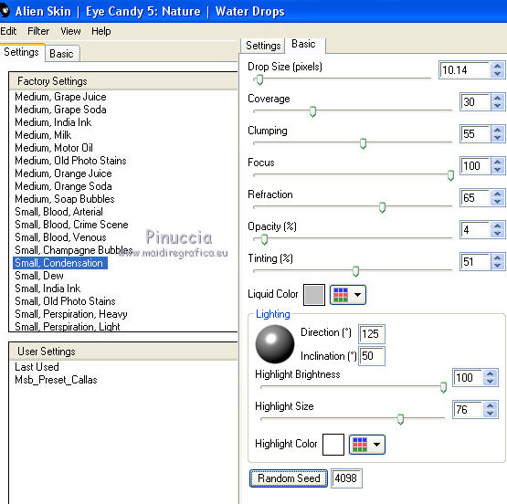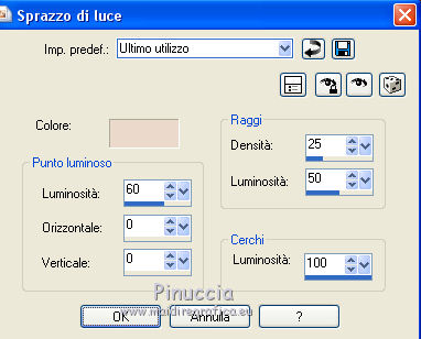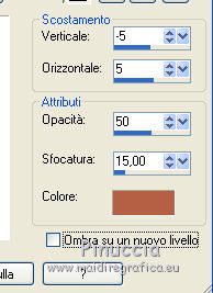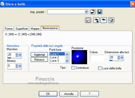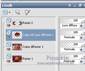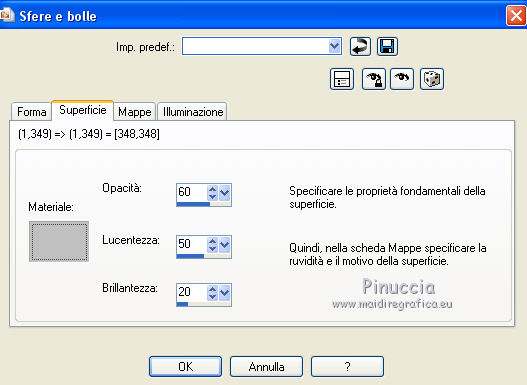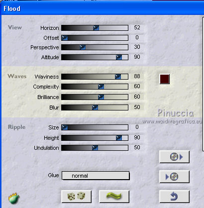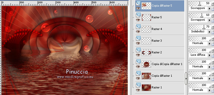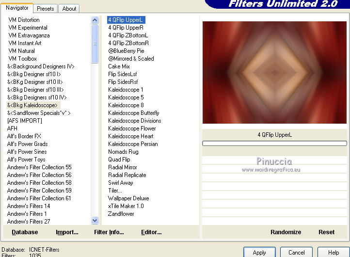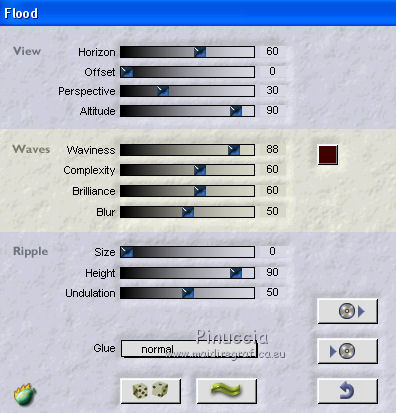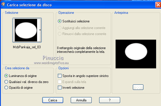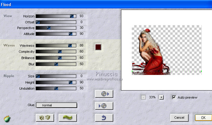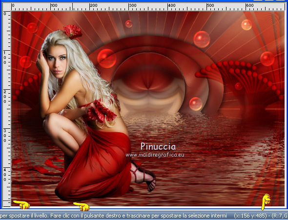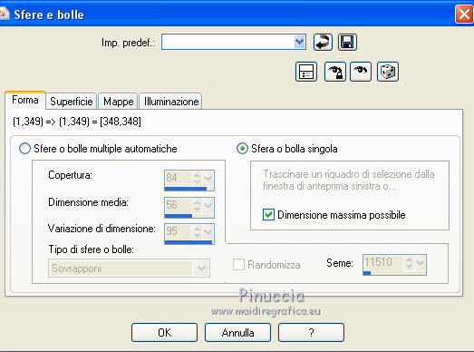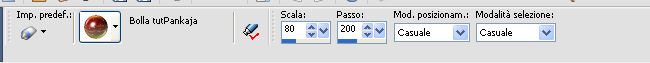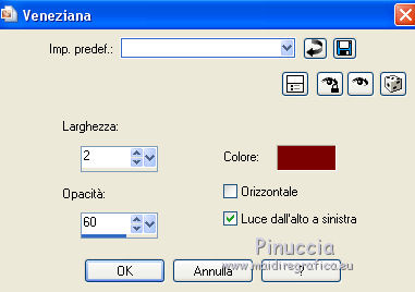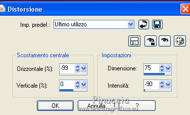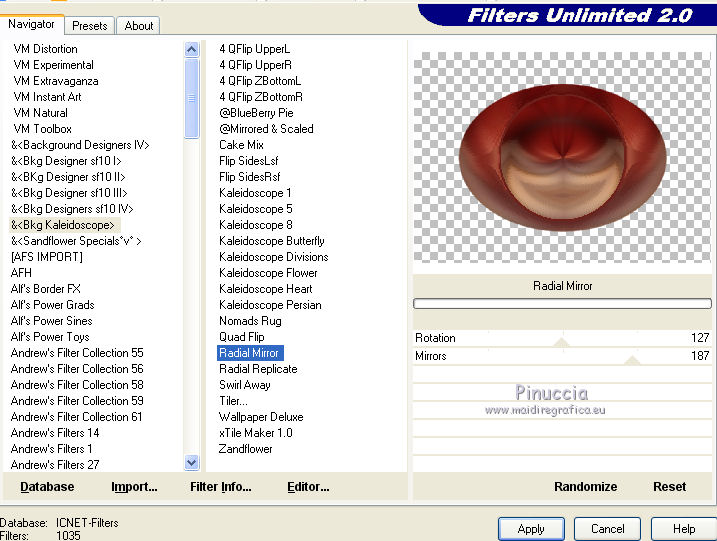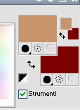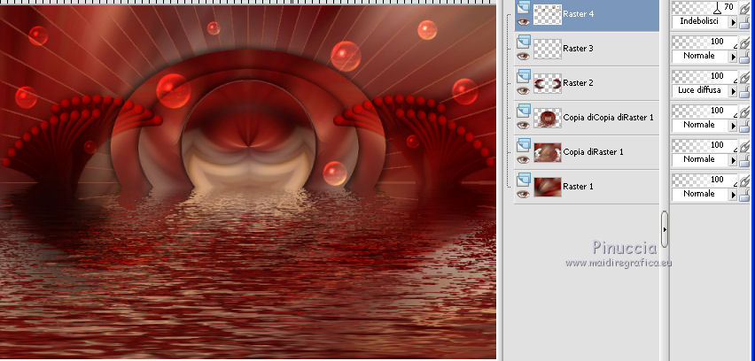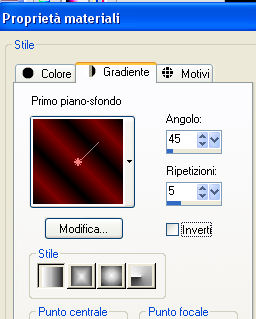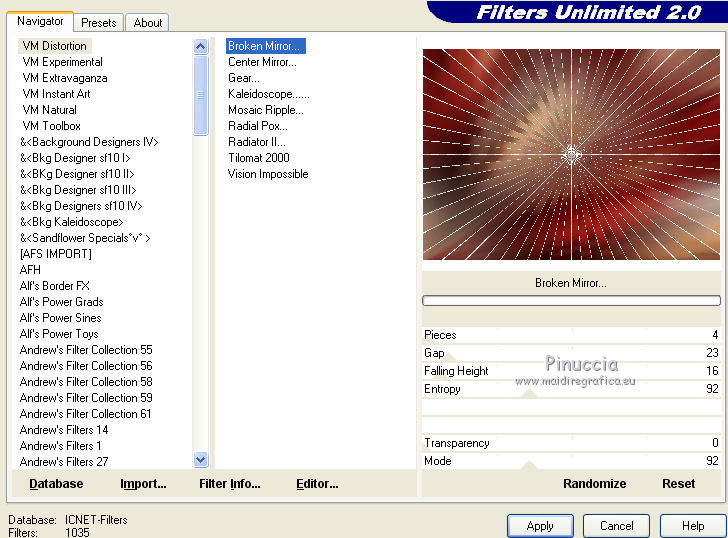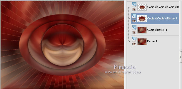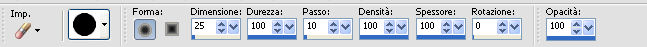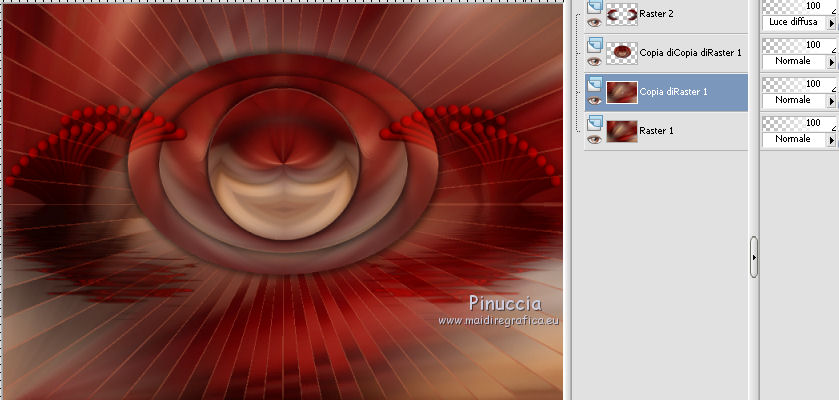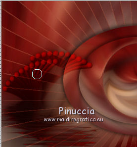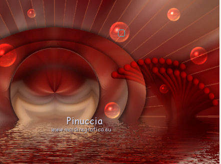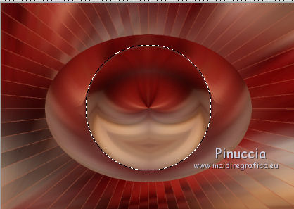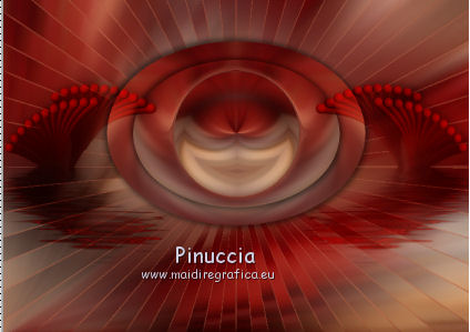qui puoi trovare qualche risposta ai tuoi dubbi. Se l'argomento che ti interessa non è presente, ti prego di segnalarmelo. Questo tutorial è una creazione ©Meetjesplekje e non può essere copiato su altri siti nè essere offerto per il download. Lo stesso vale per la mia traduzione. Il materiale viene da vari gruppi di condivisione. Il copyright appartiene ai rispettivi autori. Grazie ai creatori dei tubes che mettono a disposizione il loro lavoro in vari gruppi di condivisione. Per tradurre questo tutorial ho usato CorelX, ma può essere realizzato anche con le altre versioni di PSP. Dalla versione X4, il comando Immagine>Rifletti è stato sostituito con Immagine>Capovolgi in orizzontale, e il comando Immagine>Capovolgi con Immagine>Capovolgi in verticale. Nelle versioni X5 e X6, le funzioni sono state migliorate rendendo disponibile il menu Oggetti. Vedi la scheda sull'argomento qui Occorrente: Materiale qui Per il tube della donna grazie Guismo. Filtri: consulta, se necessario, la mia sezione filtri qui Filters Unlimited 2.0 qui &<Bkg Kaleidoscope> - 4 QFlip UpperL, Radial Mirror (da importare in Unlimited) qui VM Distortion - Broken Mirror qui Flaming Pear - Flood qui Alien Skin Eye Candy 5 Nature - Waterdrops qui Graphics Plus - Cross Shadow qui I filtri VM Distortion e Graphics Plus, si possono usare da soli o importati in Filters Unlimited (come fare vedi qui) Se un filtro fornito appare con questa icona ![]() Se stai usando altri colori puoi sperimentare le modalità di miscelatura e le opacità più adatte ai tuoi colori. Apri il font e minimizzalo. Lo troverai nella lista dei font disponibili quando ti servirà. Con i nuovi sistemi operativi questo non è più possibile. Per usare un font, occorre copiarlo nella cartella Font di Windows. Metti le selezioni nella cartella Selezioni. Imposta il colore di primo piano con il colore nero #000000, e il colore di sfondo con #7c0001. ![]() Passa il colore di primo piano a Gradiente di primo piano/sfondo, stile Sprazzo di luce. ![]() 2. Apri una nuova immagine trasparente 700 x 500 pixels, e riempila con il gradiente.Livelli>Nuovo livello raster. Selezione>Seleziona tutto. Apri il tube cal-guis-beauty-8112008, e vai a Modifica>Copia. non chiuderlo perchè ti servirà ancora Torna al tuo lavoro e vai a Modifica>Incolla nella selezione. Selezione>Deseleziona. Effetti>Effetti di immagine>Motivo unico, con i settaggi standard. ![]() Regola>Sfocatura>Sfocatura radiale. ![]() Livelli>Unisci>Unisci giù. Livelli>Duplica - 2 volte. 2. Chiudi il livello superiore e attiva il livello centrale. Effetti>Plugins>Filters Unlimited 2.0 – VM Distortion – Broken Mirror. ![]() Selezione>Seleziona tutto. Selezione>Mobile. Selezione>Immobilizza. Effetti>Effetti 3D>Sfalsa ombra, colore #b55f44. ![]() Selezione>Deseleziona. Riapri e attiva il livello superiore. Effetti>Plugins>Filters Unlimited 2.0 - &&lr;Bkg Kaleidoscope> - 4 QFlip UpperL. ![]() Effetti>Effetti di distorsione>Coordinate polari. ![]() Immagine>Ridimensiona, al 70%, tutti i livelli non selezionato. 3. Livelli>Duplica. Effetti>Plugins>Filters Unlimited 2.0 - &&lr;Bkg Kaleidoscope> - Radial Mirror. ![]() Attiva lo strumento Selezione , cerchio,e traccia una selezione intorno al cerchio. ![]() Modifica>Copia. Modifica>Incolla come nuova immagine. Salva l'immagine per precauzione e minimizzala. Ti servirà più tardi. Torna al tuo lavoro. Effetti>Effetti 3D>Sfalsa ombra, colore nero. ![]() Ripeti l'Effetto Sfalsa ombra, cambiando verticale e orizzontale con -5. Selezione>Seleziona tutto. Selezione>Mobile. Selezione>Immobilizza. Selezione>Modifica>Contrai - 2 pixels. Selezione>Inverti. Premi sulla tastiera il tasto CANC ![]() Selezione>Deseleziona. Immagine>Ridimensiona, all'80%, tutti i livelli non selezionato. Effetti>Effetti 3D>Sfalsa ombra, colore nero. ![]() Ripeti l'Effetto Sfalsa ombra, cambiando verticale e orizzontale con -5. Attiva il livello sottostante. ![]() Selezione>Seleziona tutto. Selezione>Mobile. Selezione>Immobilizza. Selezione>Modifica>Contrai - 2 pixels. Selezione>Inverti. Premi sulla tastiera il tasto CANC ![]() Selezione>Deseleziona. Attiva il livello superiore. Livelli>Unisci>Unisci giù. Effetti>Effetti 3D>Sfalsa ombra, colore nero. ![]() Ripeti l'Effetto Sfalsa ombra, cambiando verticale e orizzontale con -5. Immagine>Ridimensiona, all'80%, tutti i livelli non selezionato. Effetti>Effetti di immagine>Scostamento. ![]() 4. Apri il tube MT056–LT, e vai a Modifica>Copia. Torna al tuo lavoro e vai a Modifica>Incolla come nuovo livello. Immagine>Ridimensiona, all'80%, tutti i livelli non selezionato. Effetti>Effetti di immagine>Scostamento. ![]() Livelli>Duplica. Immagine>Rifletti. Livelli>Unisci>Unisci giù. Effetti>Effetti 3D>Sfalsa ombra, colore nero. ![]() Cambia la modalità di miscelatura di questo livello in Luce diffusa. Attiva il secondo livello dal basso. ![]() Attiva lo strumento Gomma con i seguenti settaggi.![]() Cancella le linee visibili sotto il tube ![]() ![]() 5. Effetti>Plugins>Flaming Pear - Flood - colore #400000. ![]() Attiva il livello soprastante dell'ovale. ![]() Ripeti Effetti>Plugins>Flaming Pear - Flood, cambiando soltanto Horizon con 52. ![]() Lascia il lavoro in attesa. 6. Apri una nuova immagine trasparente 350 x 350 pixels. Selezione>Seleziona tutto. Apri il cerchio che hai minimizzato al punto 3 e vai a Modifica>Copia. Torna alla piccola immagine e vai a Modifica>Incolla nella selezione. Selezione>Deseleziona. Effetti>Effetti artistici>Sfere e bolle ![]() Superficie - colore #c0c0c0. ![]() Mappe ![]() Illuminazione ![]() Immagine>Ridimensiona, al 30%, tutti i livelli non selezionato. Effetti>Plugins>Alien Skin Eyecandy 5 Nature – Waterdrops. Settings: Small,Condensation Basic - colore #c0c0c0. ![]() Immagine>Ridimensiona, al 60%, tutti i livelli non selezionato. Modifica>Copia. Modifica>Incolla come nuova immagine. File>Esporta>Ornamento, assegna un nome all'ornamento e ok. ![]() Torna al tuo lavoro principale. 7. Attiva il livello 