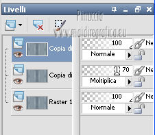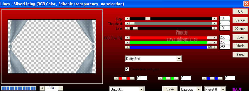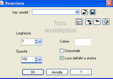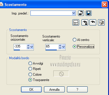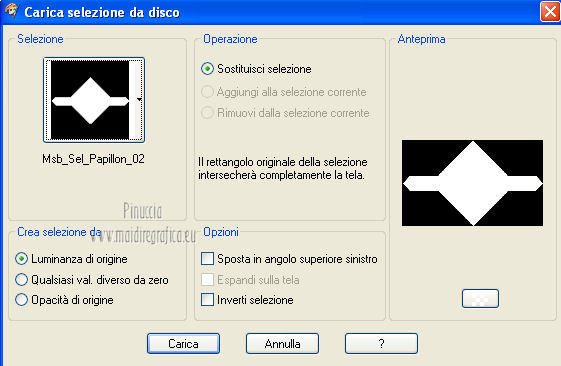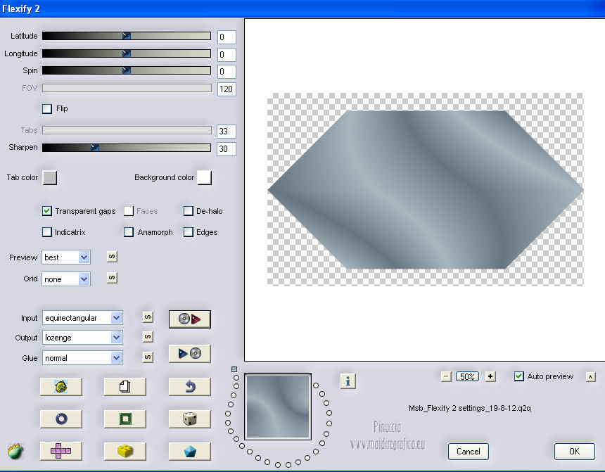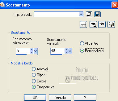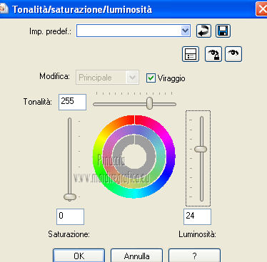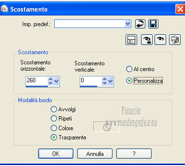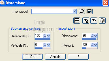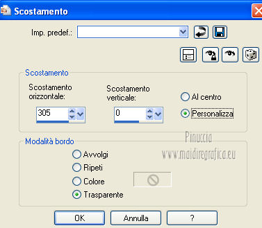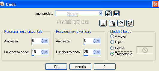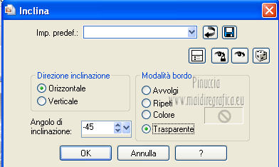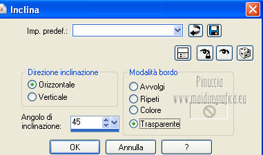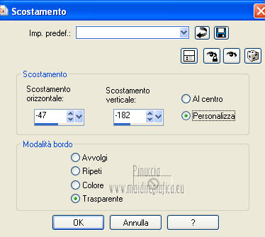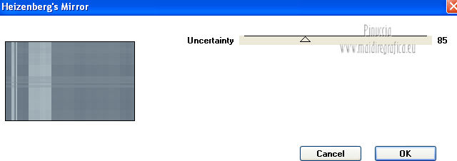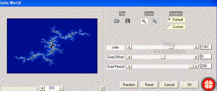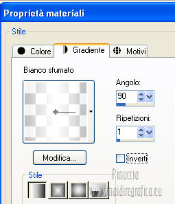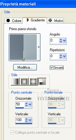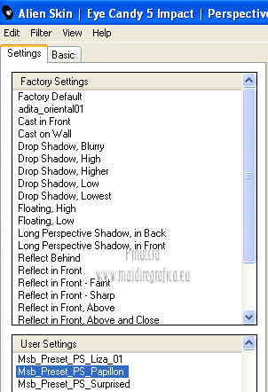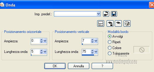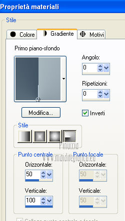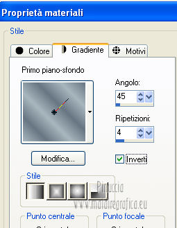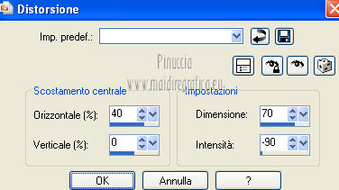 qui puoi trovare qualche risposta ai tuoi dubbi. Se l'argomento che ti interessa non è presente, ti prego di segnalarmelo. Questo tutorial è una creazione ©Meetjesplekje e non può essere copiato su altri siti nè essere offerto per il download. Lo stesso vale per la mia traduzione. Il materiale viene da vari gruppi di condivisione. Il copyright appartiene ai rispettivi autori. Grazie ai creatori dei tubes che mettono a disposizione il loro lavoro in vari gruppi di condivisione. Questo tutorial è stato creato con PSP X3. Per tradurlo usato PSP X. Occorrente: Materiale qui Il tube della donna è di Mary Il tube del paesaggio è di Nurso. Il tube della farfalla è di CSB. Mary, Nurso e CSB grazie. Filtri: consulta, se necessario, la mia sezione filtri qui Filters Unlimited 2.0 qui Funhouse - Heizenberg's Mirror qui Funhouse - Loom qui Alien Skin Eye Candy 5 Impact qui Flaming Pear - Flexify 2.0 qui VM Extravaganza qui AP 01 Lines - Lines SilverLining qui Simple - Left Right Wrap (bonus) qui It@lian Editors Effects - Effetto Fantasma qui Mehdi - Julia World qui i filtri Funhouse, VM Extravaganza, Simple e Italian Editors si possono usare da soli o importati in Filters Unlimited. A volte si riscontrano differenze nel risultato tra i diversi usi, ma non ci sono regole codificate. Per questo si possono notare soltanto caso per caso ![]() Se stai usando altri colori puoi sperimentare le modalità di miscelatura e le opacità più adatte ai tuoi colori. Metti il preset nella cartella del filtro Alien Skin Eye Candy 5 Impact>Settings>Shadow. Cliccando sul file (una o due volte, a seconda delle tue impostazioni), il preset si installerà automaticamente nella cartella corretta. Salva il preset MSb Flexify 2 in una cartella tua scelta. Lo importerai da questa cartella quando ti servirà. Metti le selezioni nella cartella Selezioni. Imposta il colore di primo piano con #677682, e il colore di sfondo con #a8b6be. Passa il colore di primo piano a Gradiente, stile Radiale, con i seguenti settaggi. ![]() 1. Apri una nuova immagine trasparente 900 x 550 pixels, e riempila con il gradiente.Effetti>Plugins>Funhouse – Heizenberg’s Mirror. ![]() Di nuovo Effetti>Plugins>Funhouse – Heizenberg’s Mirror, con i seguenti settaggi. ![]() Livelli>Duplica. Immagine>Rifletti. Abbassa l'opacità di questo livello al 50%. Livelli>Unisci>Unisci giù. Effetti>Effetti di immagine>Motivo unico. ![]() Fai una copia usando la combinazione di tasti maiuscola+D e minimizza questa copia, che ti servirà più tardi. 2. Torna al tuo lavoro originale. Livelli>Duplica - 2 volte. Cambia la modalità di miscelatura del livello sottostante in Moltiplica, e abbassa l'opacità al 70%. Rimani posizionato sul livello superiore. ![]() Effetti>Plugins>Funhouse – Loom, con i settaggi standaard. il formato dell'effetto consente l'utilizzo soltanto con l'importazione in Unlimited ![]() Effetti>Plugins>VM VM Extravaganza – Aura Detector, con i settaggi standard. ![]() Cambia la modalità di miscelatura di questo livello in Luce diffusa, e abbassa l'opacità al 50%. 3. Cambia lo stile del Gradiente in stile Lineare, con i seguenti settaggi. ![]() Livelli>Nuovo livello raster. Riempi con il gradiente.Effetti>Plugins>Flaming Pear - Flexify 2.0. Clicca sulla freccetta a destra (in alcune versioni può evere un colore diverso) e cerca nella cartella in cui lo hai salvato il preset Msb_Flexify 2 settings_19-8-12. Clicca Apri ![]() Questi sono i settaggi del preset. Se hai problemi con il preset, copia manualmente i settaggi come nella schermata. ![]() Livelli>Duplica. Effetti>Effetti di immagine>Motivo unico: ![]() Effetti>Effetti 3D>Sfalsa ombra, con il colore nero (#000000). ![]() Effetti>Effetti di trama>Intessitura. Entrambi i colori impostati con il colore #47433e. ![]() Cambia la modalità di miscelatura di questo livello in Indebolisci, e abbassa l'opacità al 50%. Livelli>Disponi>Sposta giù. 4. Attiva il livello superiore. Immagine>Ridimensiona, al 60%, tutti i livelli non selezionato. Immagine>Ruota per gradi - 90 gradi a sinistra. ![]() Livelli>Duplica. Effetti>Effetti di distorsione>Distorsione. ![]() Effetti>Effetti di immagine>Scostamento. ![]() Livelli>Duplica. Immagine>Rifletti. Livelli>Unisci>Unisci giù. Effetti>Plugins>AP [Inovations] Lines – Silverlining. ![]() Abbassa l'opacità di questo livello al 70%. Effetti>Effetti 3D>Sfalsa ombra, con il colore nero (#000000). ![]() Chiudi questo livello. 5. Attiva il livello sottostante. Effetti>Plugins>Simple – Left Right Wrap. Selezione>Carica/Salva selezione>Carica Selezione da disco. Cerca e carica la selezione Msb_Sel_Papillon_01. ![]() Premi sulla tastiera il tasto CANC. Selezione>Deseleziona. Cambia la modalità di miscelatura di questo livello in Luce diffusa. Effetti>Effetti 3D>Sfalsa ombra, con il colore nero (#000000). ![]() 6. Livelli>Nuovo livello raster. Selezione>Carica/Salva selezione>Carica Selezione da disco. Cerca e carica la selezione Msb_Sel_Papillon_02. ![]() Riempi la selezione con il gradiente.Livelli>Nuovo livello raster. Apri il tube NS_109_0709 e vai a Modifica>Copia. Torna al tuo lavoro e vai a Modifica>Incolla nella selezione. Cambia la modalità di miscelatura di questo livello in Luce diffusa, e abbassa l'opacità al 78%. Livelli>Unisci>Unisci giù. Livelli>Nuovo livello raster. Imposta il colore di primo piano con #435564, e riempi la selezione con questo colore.Selezione>Modifica>Contrai - 1 pixel. Premi sulla tastiera il tasto CANC. Selezione>Deseleziona. Livelli>Unisci>Unisci giù. 7. Livelli>Duplica. Attiva il livello sottostante dell'originale. Effetti>Plugins>It@lian Editors Effects - Effetto Fantasma. ![]() Effetti>Effetti di trama>Veneziana, con il colore bianco #ffffff. ![]() Regola>Messa a fuoco>Metti a fuoco. Cambia la modalità di miscelatura di questo livello in Sovrapponi, e abbassa l'opacità al 72%. Attiva il livello della copia (il secondo livello dall'alto). Immagine>Ridimensiona, all'80%, tutti i livelli non selezionato