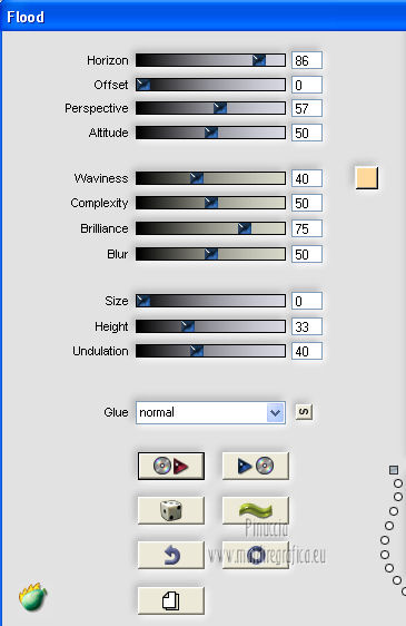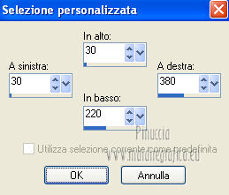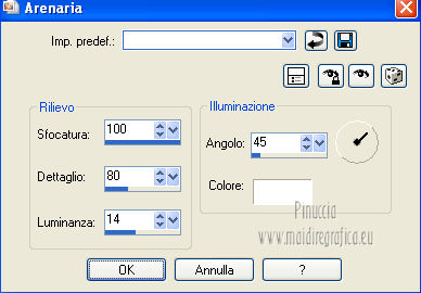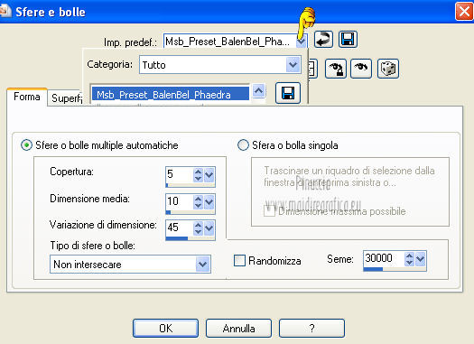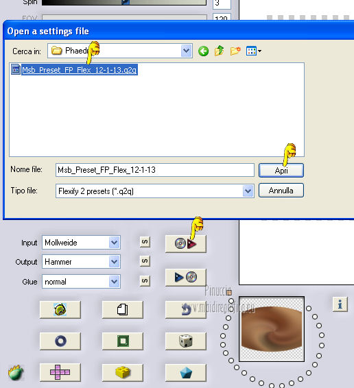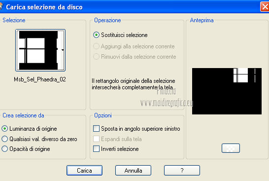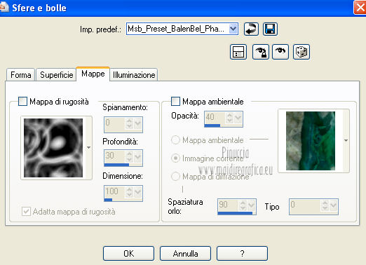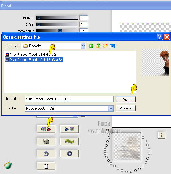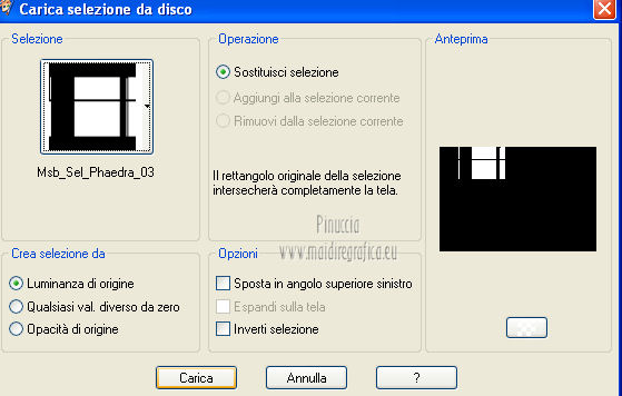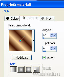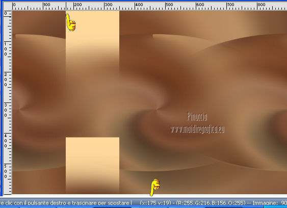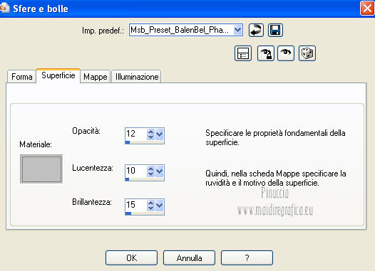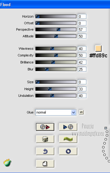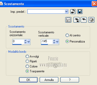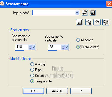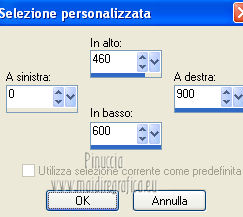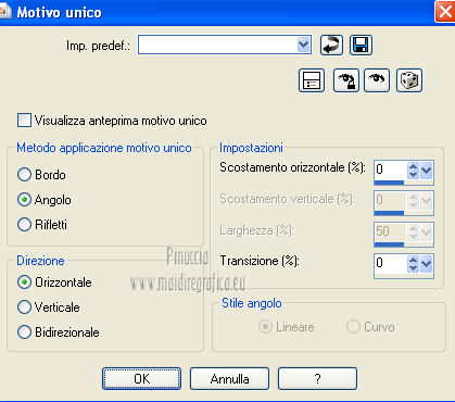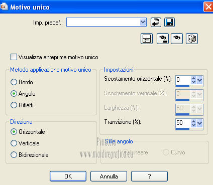 qui puoi trovare qualche risposta ai tuoi dubbi. Se l'argomento che ti interessa non è presente, ti prego di segnalarmelo. Questo tutorial è una creazione ©Meetjesplekje e non può essere copiato su altri siti nè essere offerto per il download. Lo stesso vale per la mia traduzione. Il materiale viene da vari gruppi di condivisione. Il copyright appartiene ai rispettivi autori. Grazie ai creatori dei tubes che mettono a disposizione il loro lavoro in vari gruppi di condivisione. Per tradurre questo tutorial ho usato PSP X. Occorrente: Materiale qui Per i tubes della donna grazie Gabry Per il tube dell'uomo grazie Jet. Per il tube del fiore grazie Guismo Filtri: consulta, se necessario, la mia sezione filtri qui Filters Unlimited 2.0 qui Flaming Pear - Flexify qui Flaming Pear - Flood qui AAA Frames - Foto Frame qui VanDerLee Unplugged-X qui Graphics Plus - Cross Shadow qui I filtri Graphics Plus si possono usare da soli o importati in Filters Unlimited. (come fare vedi qui) ![]() Se stai usando altri colori puoi sperimentare le modalità di miscelatura e le opacità più adatte ai tuoi colori. Metti i preset per Flexify e Flood in una cartella a scelta. Li importerai da questa cartella quando ti serviranno. Metti il preset BallAndBubbles_Msb_Preset BalenBel_Phaedra nella cartella Impostazioni predefinite. Metti la trama nella cartella Trame. Metti la maschera nella cartella Maschere. Metti le selezioni nella cartella Selezioni. Imposta il colore di primo piano con #461201, e il colore di sfondo con #ffd89c. ![]() Passa il colore di primo piano a Gradiente, stile Lineare. ![]() 1. Apri una nuova immagine trasparente 900 x 600 pixels, e riempila con il gradiente.Regola>Sfocatura>Sfocatura gaussiana - raggio 35. ![]() Apri il tube Gabry-woman 138 e vai a Modifica>Copia. non chiuderlo perchè ti servirà ancora Torna al tuo lavoro e vai a Modifica>Incolla come nuovo livello. Immagine>Ridimensiona, all'80%, tutti i livelli non selezionato. Effetti>Effetti di immagine>Motivo unico, con i settaggi standard. ![]() Regola>Sfocatura>Sfocatura gaussiana - raggio 15. ![]() Livelli>Unisci>Unisci giù. Livelli>Duplica. Regola>Sfocatura>Sfocatura radiale, con i seguenti settaggi. ![]() Livelli>Unisci>Unisci giù. 2. Livelli>Duplica. Effetti>Plugins>Flaming Pear - Flexify 2. Clicca sull'icona con la freccia rossa, e cerca - nella cartella in cui lo hai salvato il preset Msb Preset FB Flex 12-1-13 Apri per confermare. ![]() e avrai questi settaggi (che potrai eventualmente impostare manualmente, in caso di problemi con il preset). ![]() Effetti>Effetti di immagine>Motivo unico. ![]() 3. Livelli>Nuovo livello raster. Attiva lo strumento Selezione ,clicca sull'icona Selezione personalizzata ![]() e imposta i seguenti settaggi: ![]() Riempi la selezione con il colore di sfondo.Selezione>Deseleziona. Effetti>Effetti di immagine>Motivo unico. ![]() Immagine>Ridimensiona, al 92%, tutti i livelli non selezionato. Immagine>Ruota per gradi - 90 gradi a sinistra. ![]() Se non visualizzi i righelli, vai a Visualizza>Righelli. Sposta l'immagine in alto a 175 pixels in orizzontale.![]() Livelli>Duplica. Immagine>Rifletti. Immagine>Capovolgi. Livelli>Unisci>Unisci giù. Effetti>Plugins>VanDerLee – Unplugged X - Tan Deform. ![]() Livelli>Disponi>Sposta giù. Effetti>Effetti di trama>Trama - seleziona la trama Lace, con i seguenti settaggi. ![]() Cambia la modalità di miscelatura di questo livello in Indebolisci, e abbassa l'opacità al 20%. ![]() 4. Attiva nuovamente il livello superiore. Effetti>Effetti di immagine>Scostamento. ![]() Attiva lo strumento Selezione ,clicca sull'icona Selezione personalizzata ![]() e imposta i seguenti settaggi: ![]() Selezione>Innalza selezione a livello. Effetti>Plugins>Flaming Pear - Flood. Clicca sull'icona con la freccia rossa, e cerca - nella cartella in cui lo hai salvato il preset Msb_Preset_Flood_12-1-13 Apri per confermare. ![]() e avrai questi settaggi (che potrai eventualmente impostare manualmente, in caso di problemi con il preset). ![]() Selezione>Deseleziona. Effetti>Effetti 3D>Sfalsa ombra, con il colore nero. ![]() Cambia la modalità di miscelatura di questo livello in Sovrapponi, e abbassa l'opacità al 47%. ![]() Effetti>Plugins>Graphic Plus – Cross Shadow. ![]() Livelli>Unisci>Unisci giù. 5. Selezione>Carica/Salva selezione da disco. Cerca e carica la selezione Msb_Sel_Phaedra_01 e ok. ![]() Selezione>Innalza selezione a livello. Selezione>Deseleziona. Effetti>Effetti di trama>Trama - Arenaria, con i seguenti settaggi. ![]() Effetti>Effetti di immagine>Motivo unico. ![]() Effetti>Effetti 3D>Sfalsa ombra, con il colore nero. ![]() Selezione personalizzata ![]() con i settaggi precedenti: ![]() Premi sulla tastiera il tasto CANC. Selezione>Deseleziona. 6. Apri deco Msb_Template_Phaedra_01 e vai a Modifica>Copia. Torna al tuo lavoro e vai a Modifica>Incolla come nuovo livello. Effetti>Effetti di immagine>Scostamento. ![]() Cambia la modalità di miscelatura di questo livello in Luce diffusa, e abbassa l'opacità al 50%. ![]() Livelli>Disponi>Sposta giù. Effetti>Plugins>Graphic Plus – Cross Shadow, con i settaggi standard. ![]() 7. Apri Deco Msb_Deco_Phaedra_01 e vai a Modifica>Copia. Torna al tuo lavoro e vai a Modifica>Incolla come nuovo livello. Effetti>Effetti di immagine>Scostamento. ![]() Cambia la modalità di miscelatura di questo livello in Sovrapponi, e abbassa l'opacità al 36%. Regola>Messa a fuoco>Metti a fuoco. 8. Selezione>Carica/Salva selezione da disco. Cerca e carica la selezione Msb_Sel_ Phaedra_02. ![]() Apri il tube y_outdoor 63 e vai a Modifica>Copia. minimizzalo perchè ti servirà ancora Torna al tuo lavoro e vai a Modifica>Incolla come nuovo livello. Immagine>Ridimensiona, al 65 %, tutti i livelli non selezionato. Livelli>Disponi>Porta in alto. Posiziona il tube nell'area selezionata.Selezione>Inverti. Premi sulla tastiera il tasto CANC. Selezione>Deseleziona. Abbassa l'opacità di questo livello al 14%. Effetti>Effetti 3D>Sfalsa omb