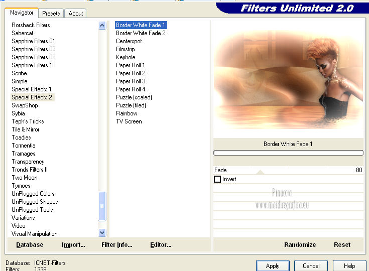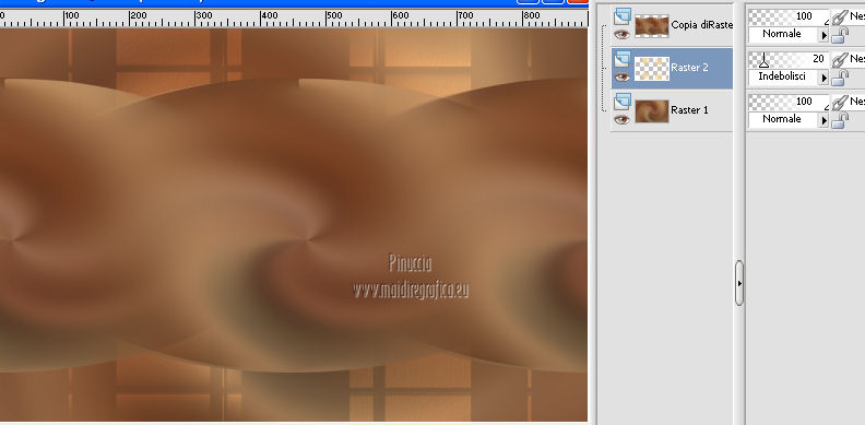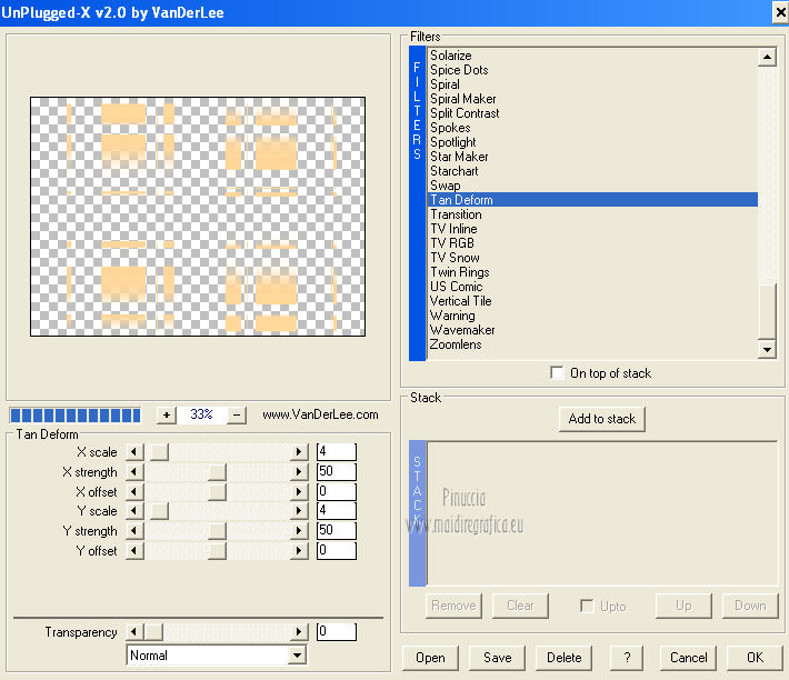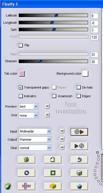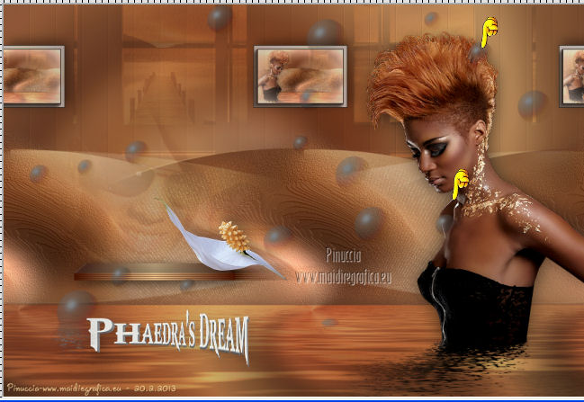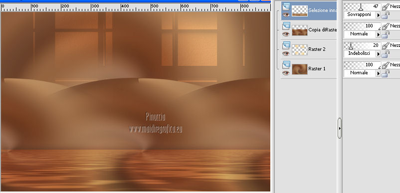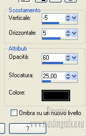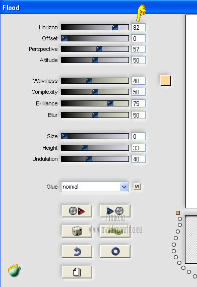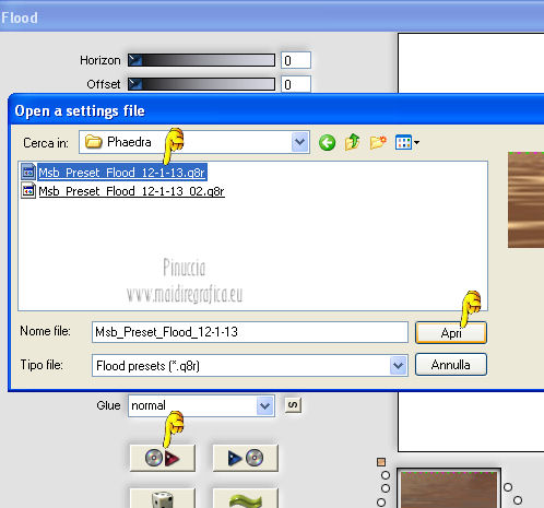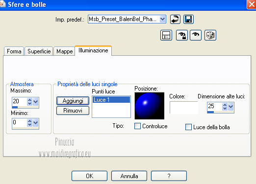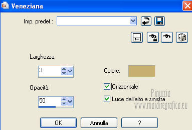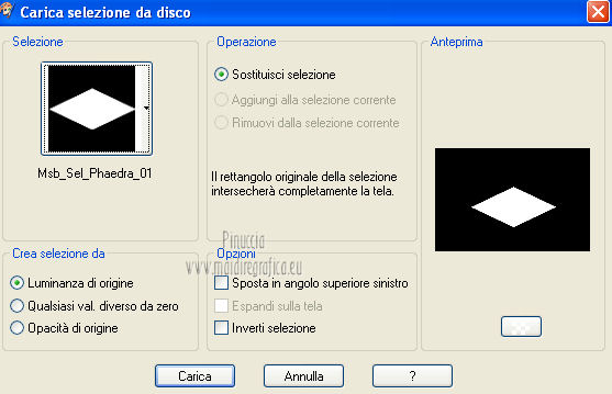 qui puoi trovare qualche risposta ai tuoi dubbi. Se l'argomento che ti interessa non è presente, ti prego di segnalarmelo. Questo tutorial è una creazione ©Meetjesplekje e non può essere copiato su altri siti nè essere offerto per il download. Lo stesso vale per la mia traduzione. Il materiale viene da vari gruppi di condivisione. Il copyright appartiene ai rispettivi autori. Grazie ai creatori dei tubes che mettono a disposizione il loro lavoro in vari gruppi di condivisione. Per tradurre questo tutorial ho usato PSP X. Occorrente: Materiale qui Per i tubes della donna grazie Gabry Per il tube dell'uomo grazie Jet. Per il tube del fiore grazie Guismo Filtri: consulta, se necessario, la mia sezione filtri qui Filters Unlimited 2.0 qui Flaming Pear - Flexify qui Flaming Pear - Flood qui AAA Frames - Foto Frame qui VanDerLee Unplugged-X qui Graphics Plus - Cross Shadow qui I filtri Graphics Plus si possono usare da soli o importati in Filters Unlimited. (come fare vedi qui) ![]() Se stai usando altri colori puoi sperimentare le modalità di miscelatura e le opacità più adatte ai tuoi colori. Metti i preset per Flexify e Flood in una cartella a scelta. Li importerai da questa cartella quando ti serviranno. Metti il preset BallAndBubbles_Msb_Preset BalenBel_Phaedra nella cartella Impostazioni predefinite. Metti la trama nella cartella Trame. Metti la maschera nella cartella Maschere. Metti le selezioni nella cartella Selezioni. Imposta il colore di primo piano con #461201, e il colore di sfondo con #ffd89c. ![]() Passa il colore di primo piano a Gradiente, stile Lineare. ![]() 1. Apri una nuova immagine trasparente 900 x 600 pixels, e riempila con il gradiente.Regola>Sfocatura>Sfocatura gaussiana - raggio 35. ![]() Apri il tube Gabry-woman 138 e vai a Modifica>Copia. non chiuderlo perchè ti servirà ancora Torna al tuo lavoro e vai a Modifica>Incolla come nuovo livello. Immagine>Ridimensiona, all'80%, tutti i livelli non selezionato. Effetti>Effetti di immagine>Motivo unico, con i settaggi standard. ![]() Regola>Sfocatura>Sfocatura gaussiana - raggio 15. ![]() Livelli>Unisci>Unisci giù. Livelli>Duplica. Regola>Sfocatura>Sfocatura radiale, con i seguenti settaggi. ![]() Livelli>Unisci>Unisci giù. 2. Livelli>Duplica. Effetti>Plugins>Flaming Pear - Flexify 2. Clicca sull'icona con la freccia rossa, e cerca - nella cartella in cui lo hai salvato il preset Msb Preset FB Flex 12-1-13 Apri per confermare. ![]() e avrai questi settaggi (che potrai eventualmente impostare manualmente, in caso di problemi con il preset). ![]() Effetti>Effetti di immagine>Motivo unico. ![]() 3. Livelli>Nuovo livello raster. Attiva lo strumento Selezione ,clicca sull'icona Selezione personalizzata ![]() e imposta i seguenti settaggi: ![]() Riempi la selezione con il colore di sfondo.Selezione>Deseleziona. Effetti>Effetti di immagine>Motivo unico. ![]() Immagine>Ridimensiona, al 92%, tutti i livelli non selezionato. Immagine>Ruota per gradi - 90 gradi a sinistra. ![]() Se non visualizzi i righelli, vai a Visualizza>Righelli. Sposta l'immagine in alto a 175 pixels in orizzontale.![]() Livelli>Duplica. Immagine>Rifletti. Immagine>Capovolgi. Livelli>Unisci>Unisci giù. Effetti>Plugins>VanDerLee – Unplugged X - Tan Deform. ![]() Livelli>Disponi>Sposta giù. Effetti>Effetti di trama>Trama - seleziona la trama Lace, con i seguenti settaggi. ![]() Cambia la modalità di miscelatura di questo livello in Indebolisci, e abbassa l'opacità al 20%. ![]() 4. Attiva nuovamente il livello superiore. Effetti>Effetti di immagine>Scostamento. ![]() Attiva lo strumento Selezione ,clicca sull'icona Selezione personalizzata ![]() e imposta i seguenti settaggi: ![]() Selezione>Innalza selezione a livello. Effetti>Plugins>Flaming Pear - Flood. Clicca sull'icona con la freccia rossa, e cerca - nella cartella in cui lo hai salvato il preset Msb_Preset_Flood_12-1-13 Apri per confermare. ![]() e avrai questi settaggi (che potrai eventualmente impostare manualmente, in caso di problemi con il preset). ![]() Selezione>Deseleziona. Effetti>Effetti 3D>Sfalsa ombra, con il colore nero. ![]() Cambia la modalità di miscelatura di questo livello in Sovrapponi, e abbassa l'opacità al 47%. ![]() Effetti>Plugins>Graphic Plus – Cross Shadow. ![]() Livelli>Unisci>Unisci giù. 5. Selezione>Carica/Salva selezione da disco. Cerca e carica la selezione Msb_Sel_Phaedra_01 e ok. ![]() Selezione>Innalza selezione a livello. Selezione>Deseleziona. Effetti>Effetti di trama>Trama - Arenaria, con i seguenti settaggi. ![]() Effetti>Effetti di immagine>Motivo unico. ![]() Effetti>Effetti 3D>Sfalsa ombra, con il colore nero. ![]() Selezione personalizzata ![]() con i settaggi precedenti: ![]() Premi sulla tastiera il tasto CANC. Selezione>Deseleziona. 6. Apri deco Msb_Template_Phaedra_01 e vai a Modifica>Copia. Torna al tuo lavoro e vai a Modifica>Incolla come nuovo livello. Effetti>Effetti di immagine>Scostamento. ![]() Cambia la modalità di miscelatura di questo livello in Luce diffusa, e abbassa l'opacità al 50%. ![]() Livelli>Disponi>Sposta giù. Effetti>Plugins>Graphic Plus – Cross Shadow, con i settaggi standard. ![]() 7. Apri Deco Msb_Deco_Phaedra_01 e vai a Modifica>Copia. Torna al tuo lavoro e vai a Modifica>Incolla come nuovo livello. Effetti>Effetti di immagine>Scostamento. ![]() Cambia la modalità di miscelatura di questo livello in Sovrapponi, e abbassa l'opacità al 36%. Regola>Messa a fuoco>Metti a fuoco. 8. Selezione>Carica/Salva selezione da disco. Cerca e carica la selezione Msb_Sel_ Phaedra_02. ![]() Apri il tube y_outdoor 63 e vai a Modifica>Copia. minimizzalo perchè ti servirà ancora Torna al tuo lavoro e vai a Modifica>Incolla come nuovo livello. Immagine>Ridimensiona, al 65 %, tutti i livelli non selezionato. Livelli>Disponi>Porta in alto. Posiziona il tube nell'area selezionata.Selezione>Inverti. Premi sulla tastiera il tasto CANC. Selezione>Deseleziona. Abbassa l'opacità di questo livello al 14%. Effetti>Effetti 3D>Sfalsa omb