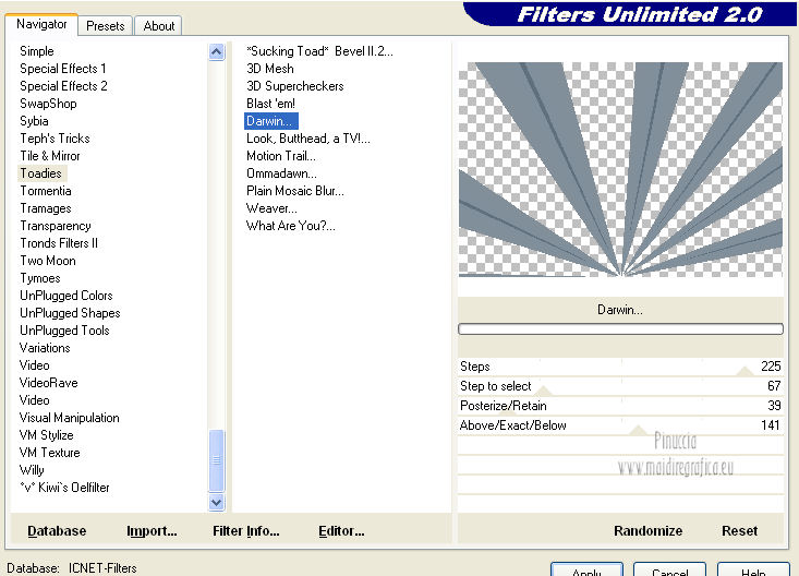 Effetti>Plugins>Filters Unlimited 2.0 – Toadies – Darwin, con i settaggi standard.