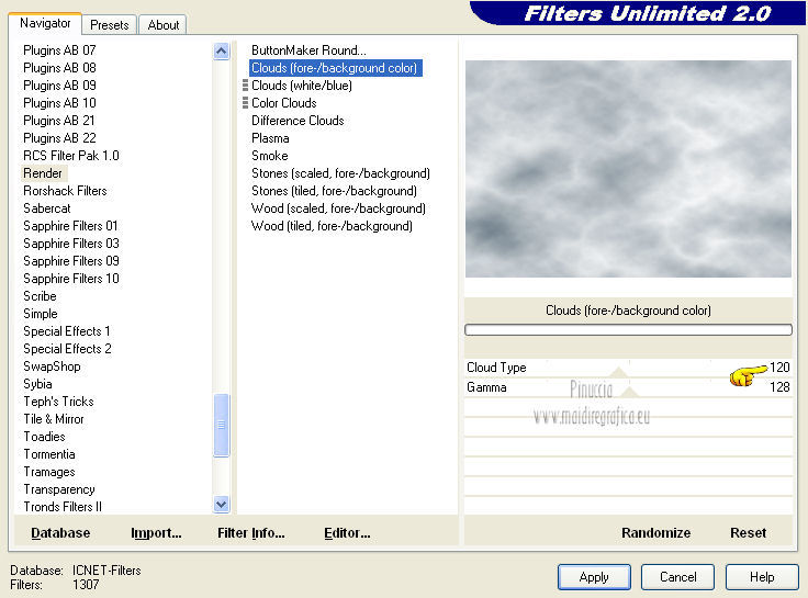 Effetti>Plugins>Filters Unlimited 2.0 – Render – Clouds (fore-/background color).