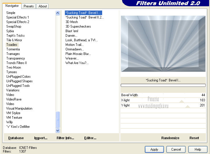 Effetti>Plugins>Filters Unlimited 2.0 – Toadies – "Sucking Toad" Bevel I, con i settaggi standard.